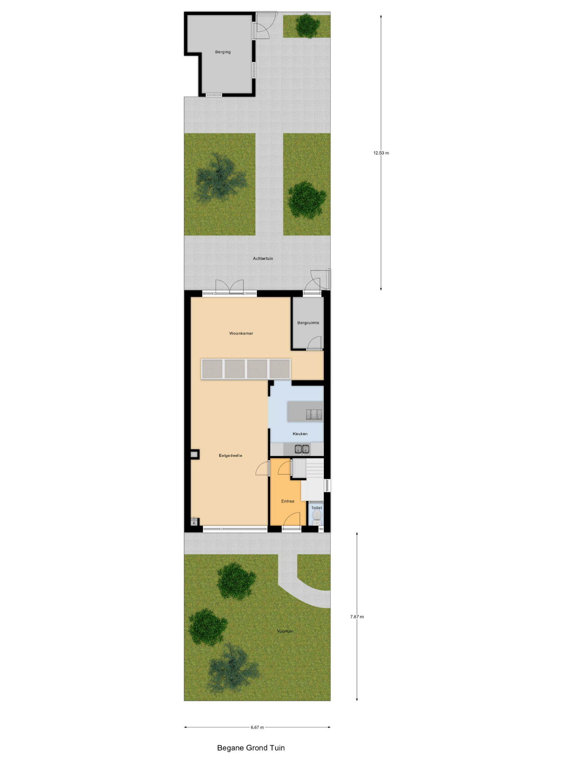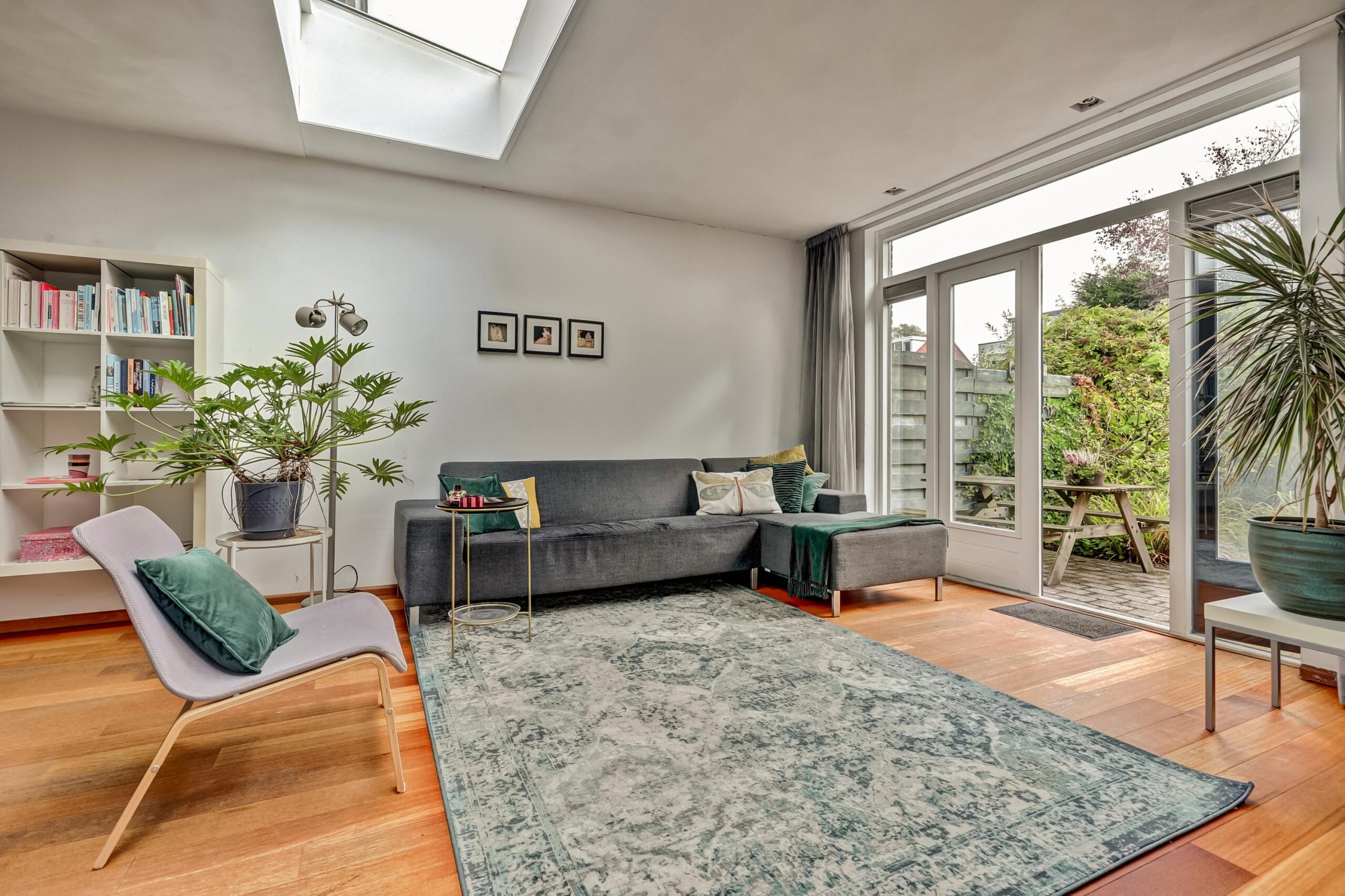 De achtertuin ligt op het oosten en is fraai aangelegd met twee terrassen en veel groen. Dankzij de diepte van 12 meter is er altijd wel een plekje in de zon of schaduw te vinden. Extra praktisch zijn de twee toegangen achterom en de vrijstaande stenen berging (met bitumen dak vernieuwd in 2015). Aan de voorzijde ligt een nette voortuin die de woning een prettige uitstraling geeft.