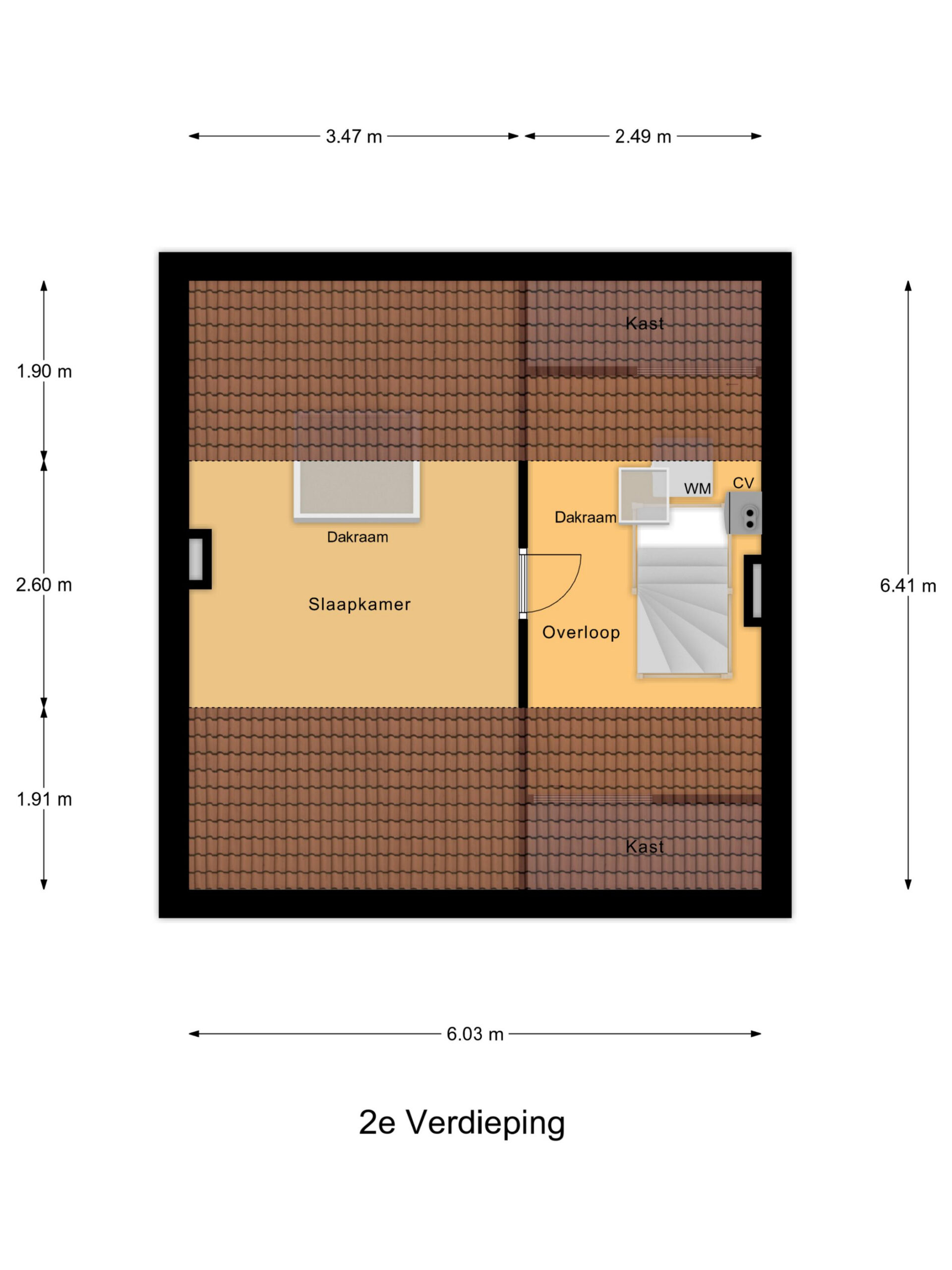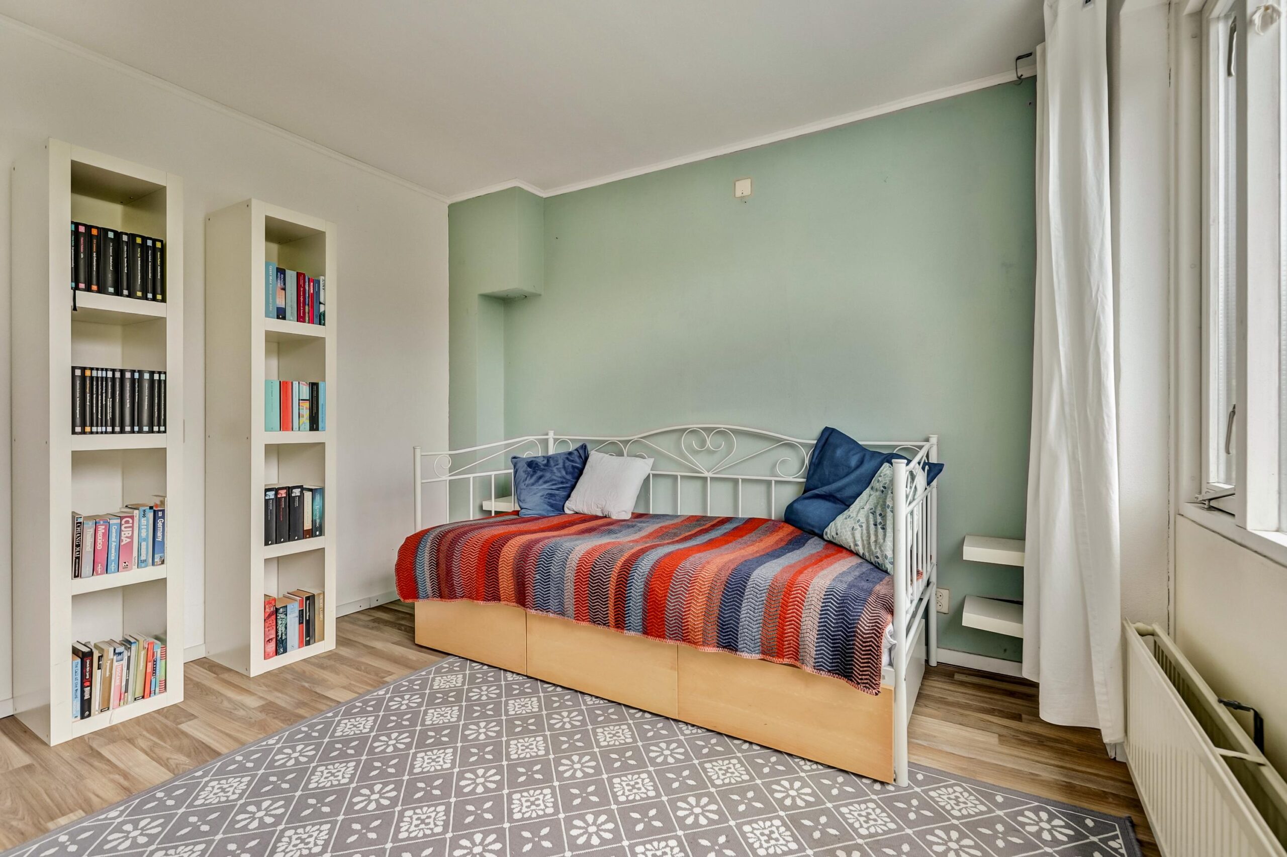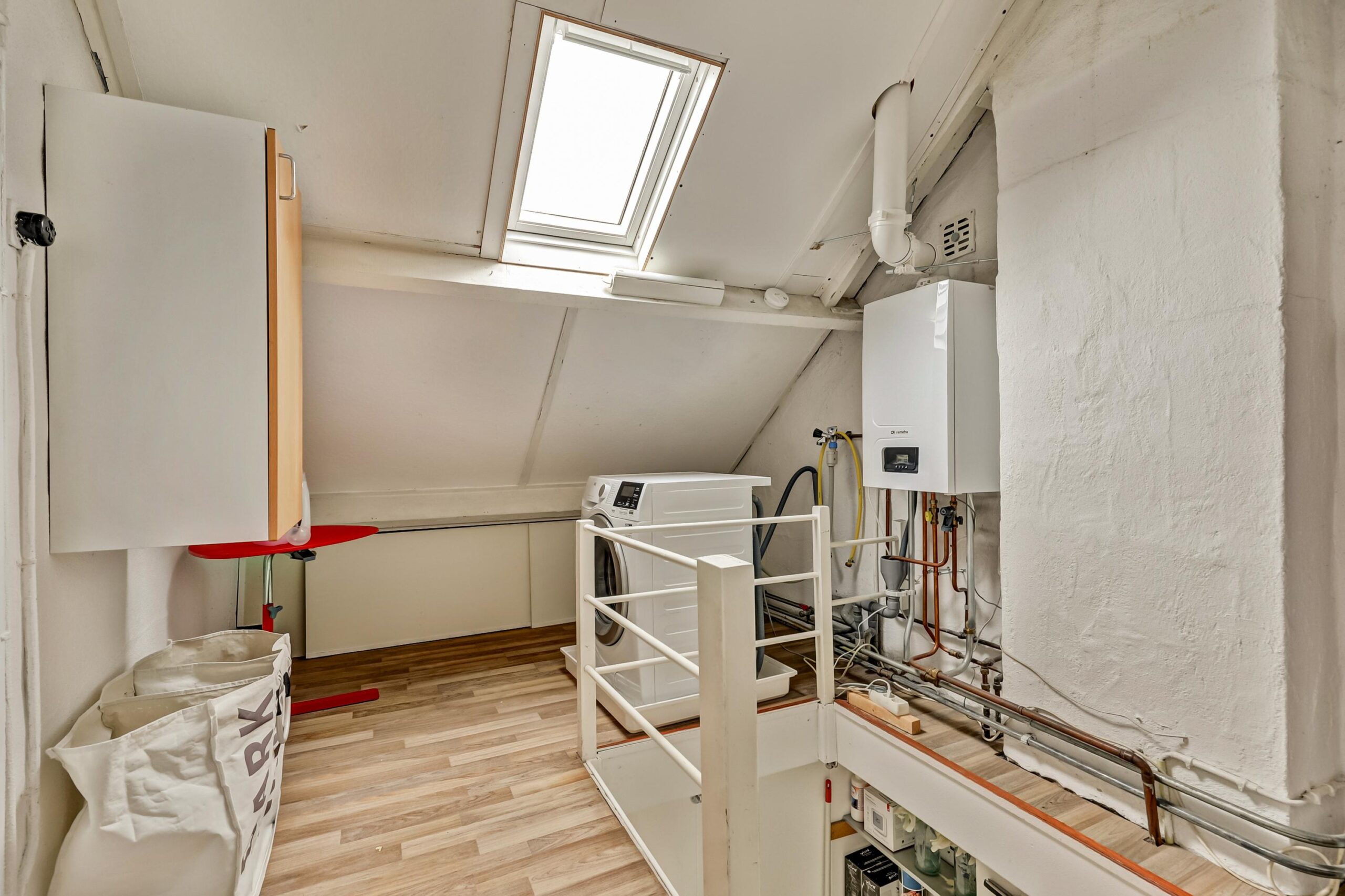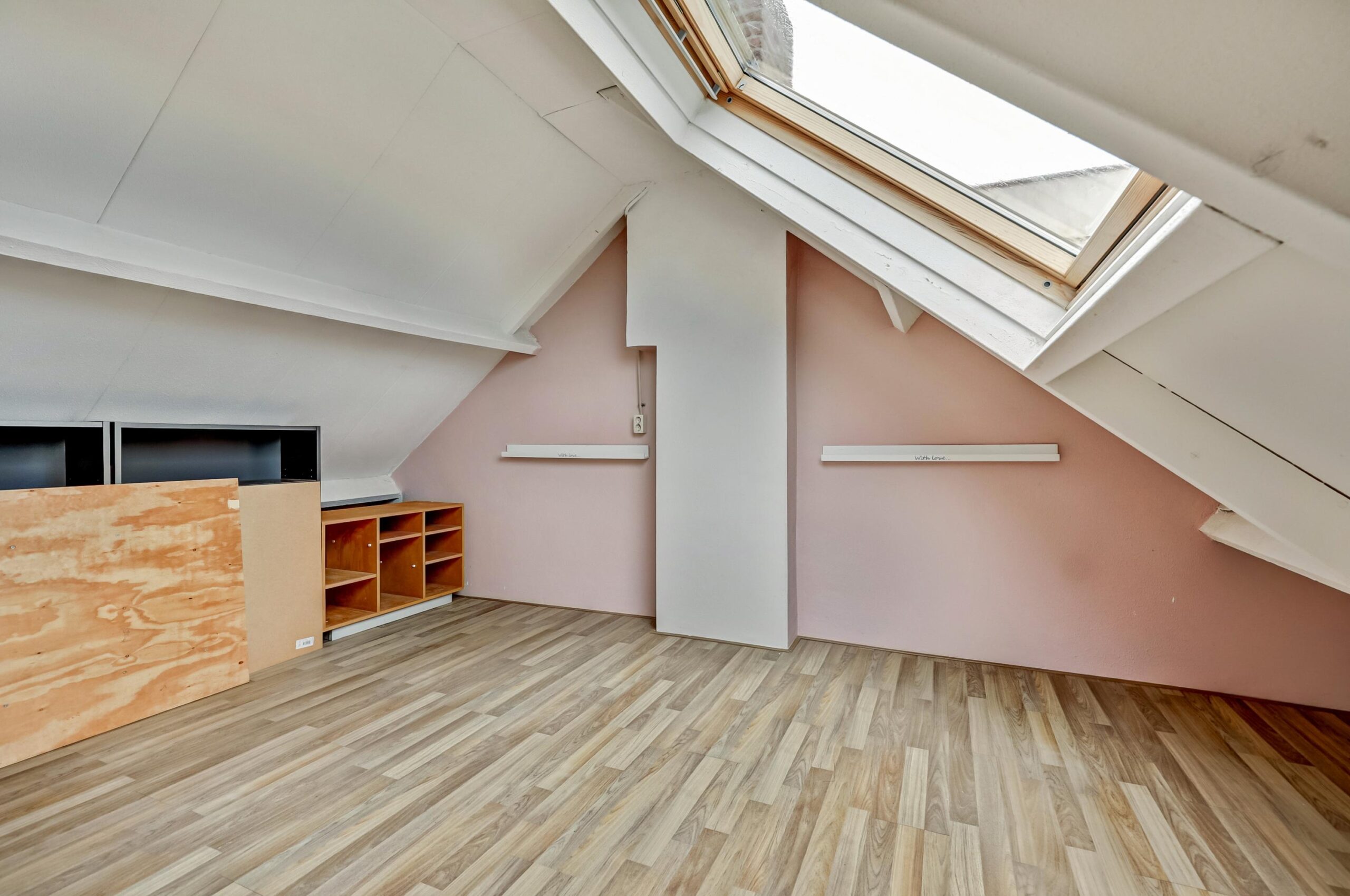 De zolderverdieping verrast met een vierde slaapkamer, uitgerust met een groot dakraam, radiator en bergruimte achter de knieschotten. Op de voorzolder zijn de cv-ketel (Remeha, 2022) en witgoedaansluitingen geplaatst.