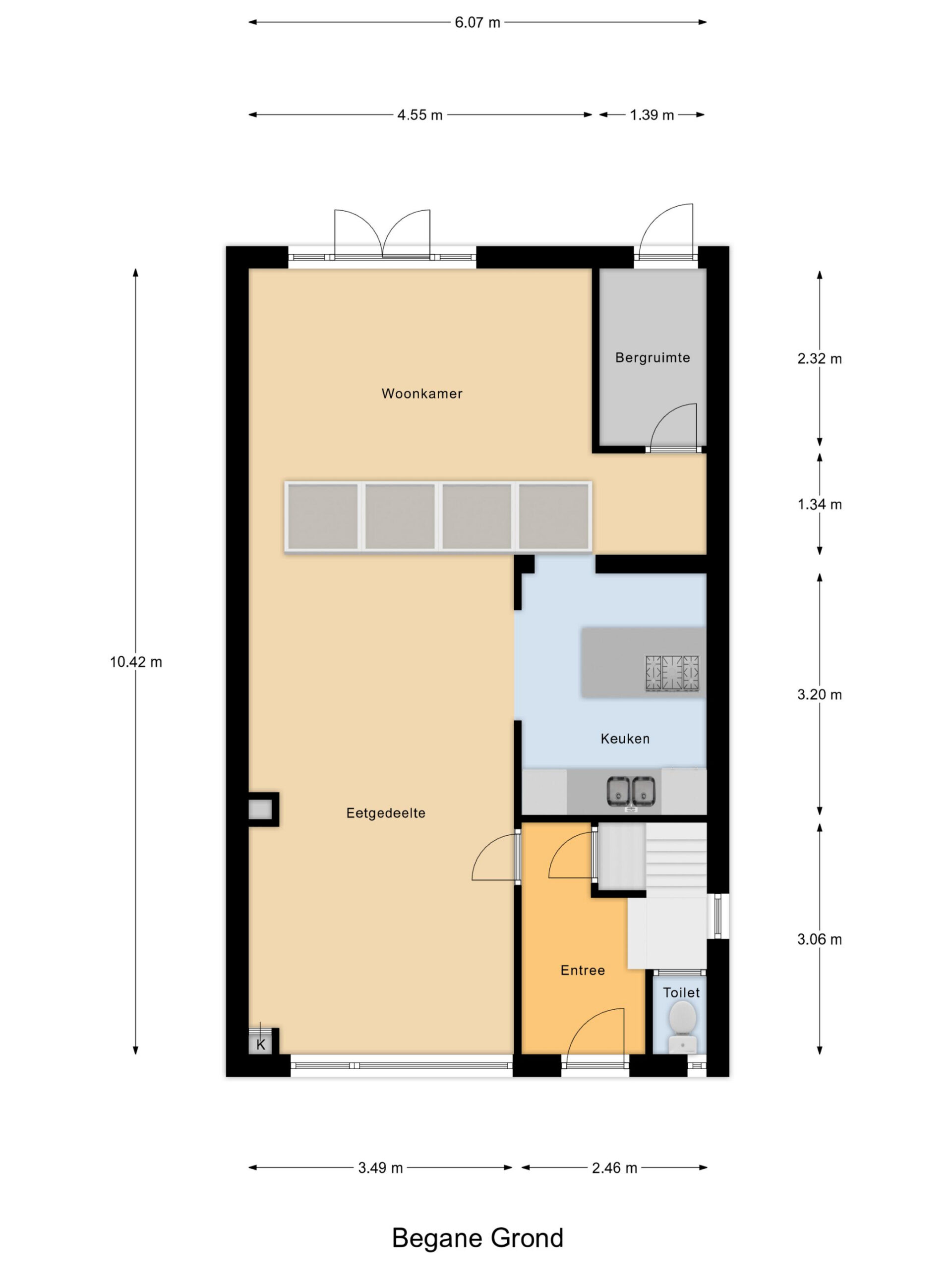De entree op de begane grond bestaat uit een hal met toegang tot toilet en een provisiekelder. De woonkamer is licht en ruim dankzij de uitbouw met lichtstraat en openslaande deuren naar de tuin. De halfopen keuken (2006) is voorzien van een kookeiland, 5-pits gasfornuis, oven, koel-/vriescombinatie, vaatwasser en dubbele spoelbak. De lichtstraat zorgt hier voor extra daglicht. Aansluitend vind je de bergruimte, welke flexibel te gebruiken is en eveneens directe toegang geeft tot de tuin.
