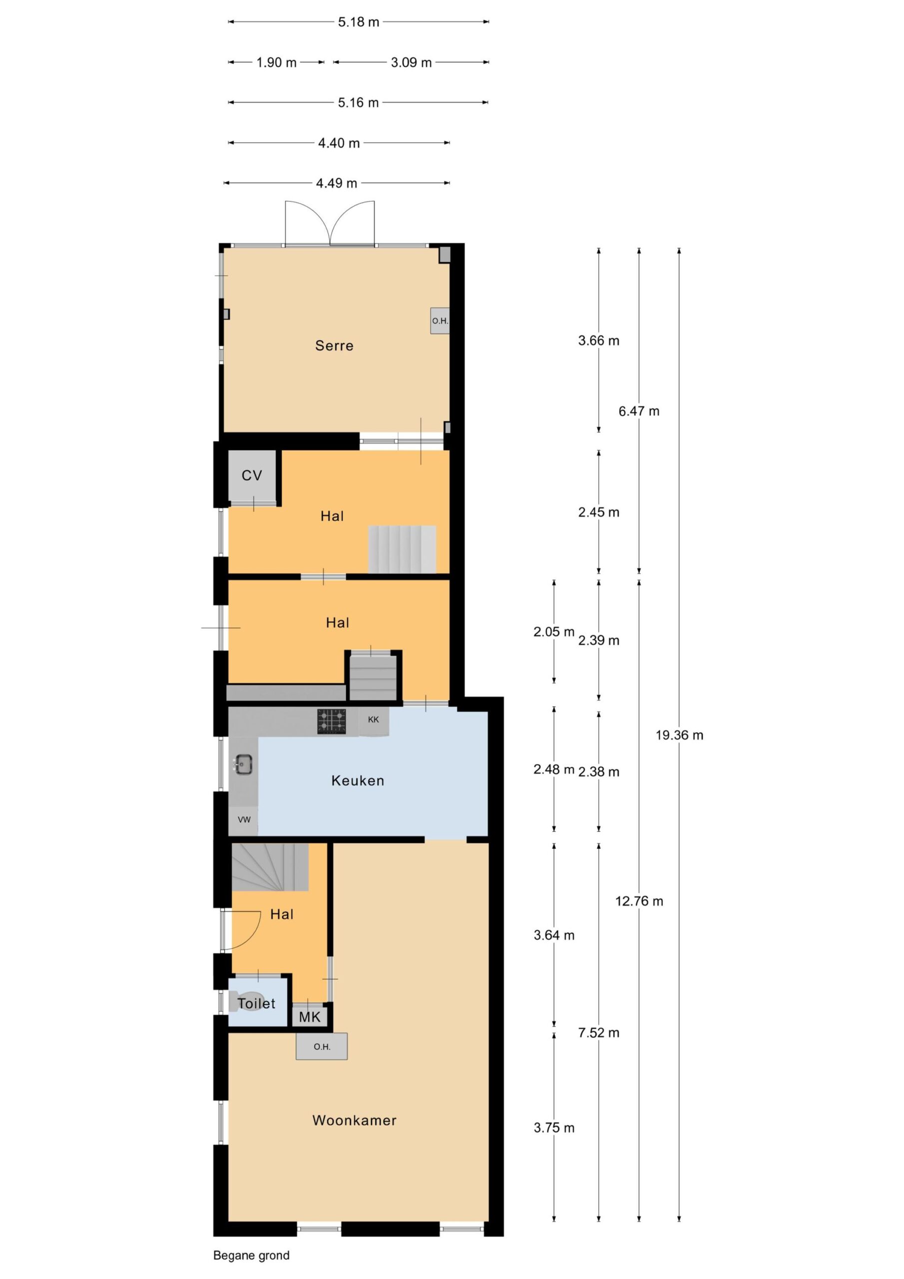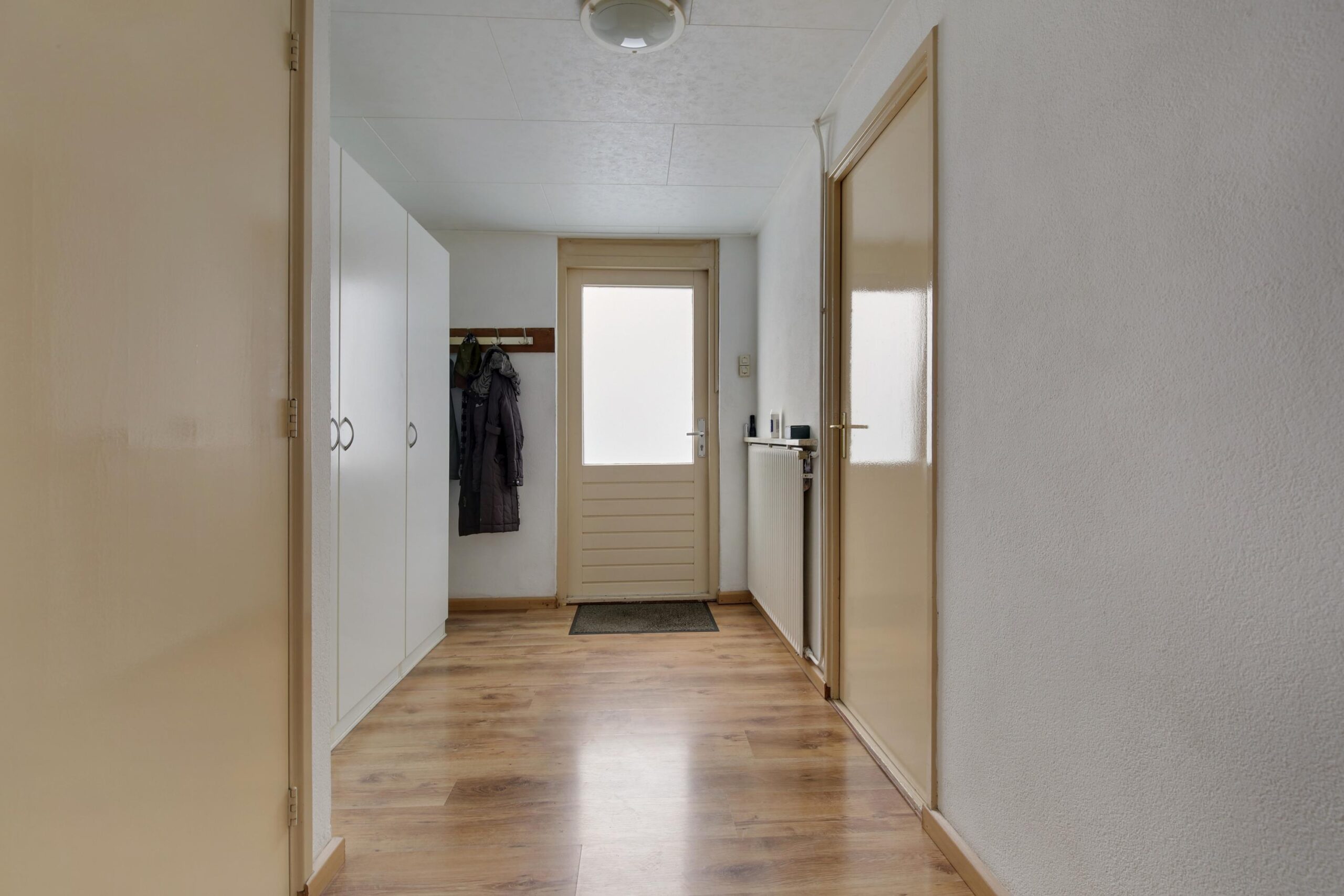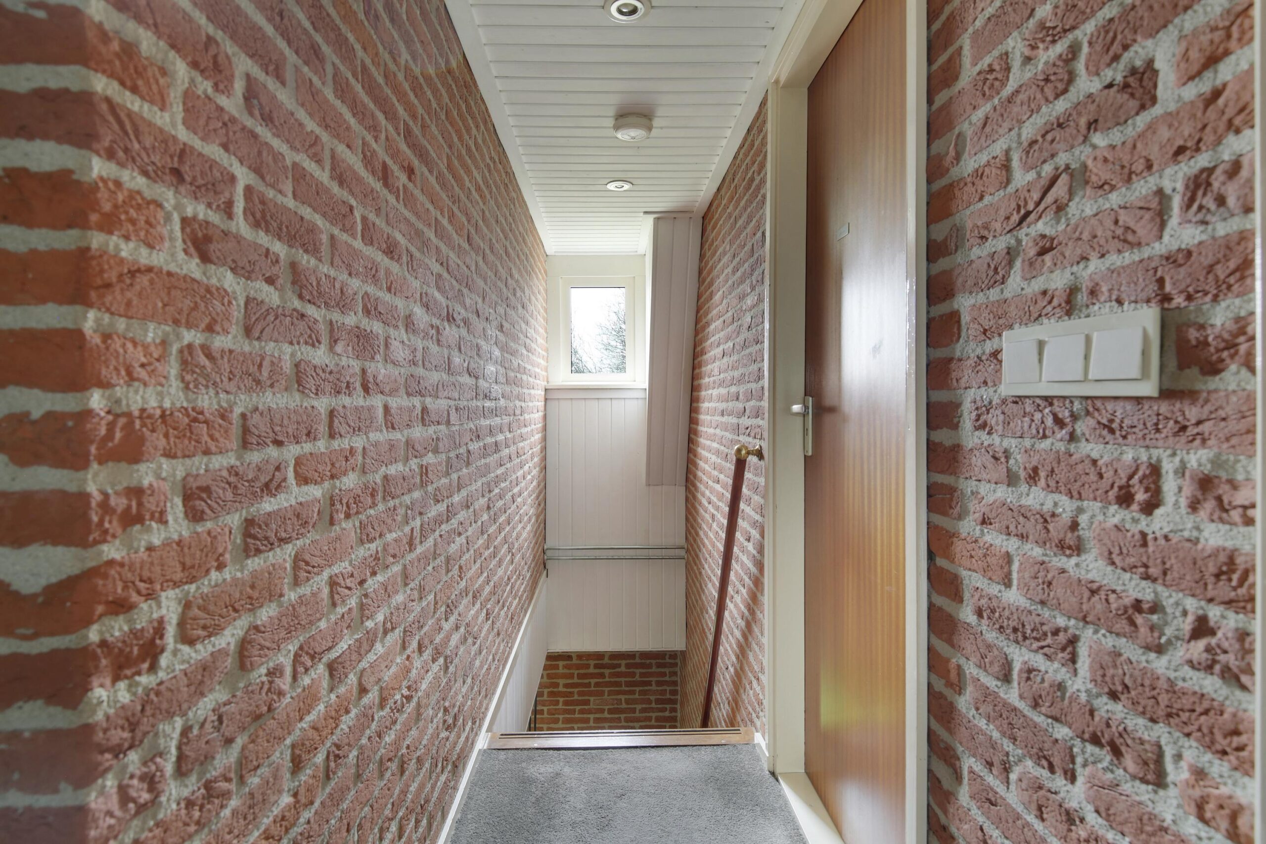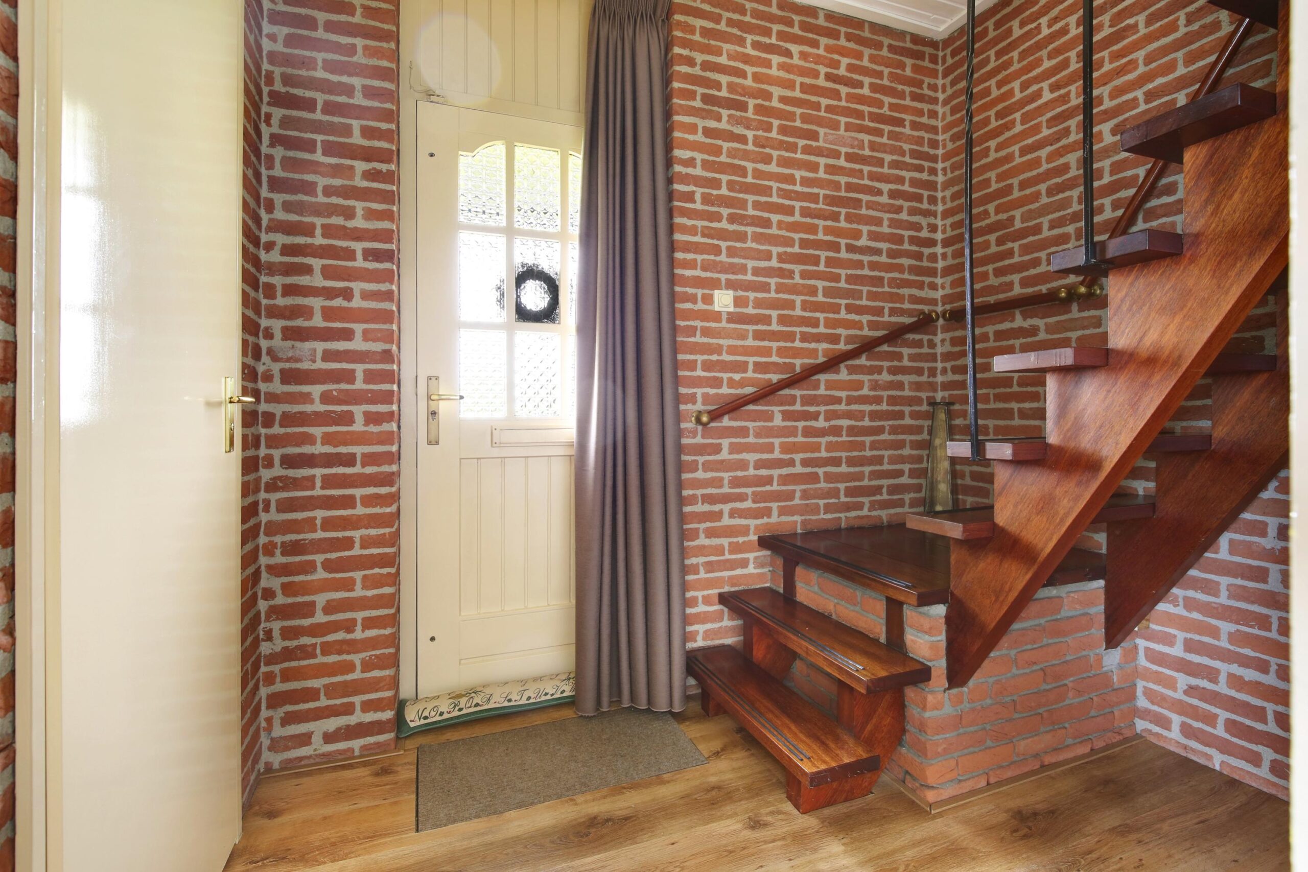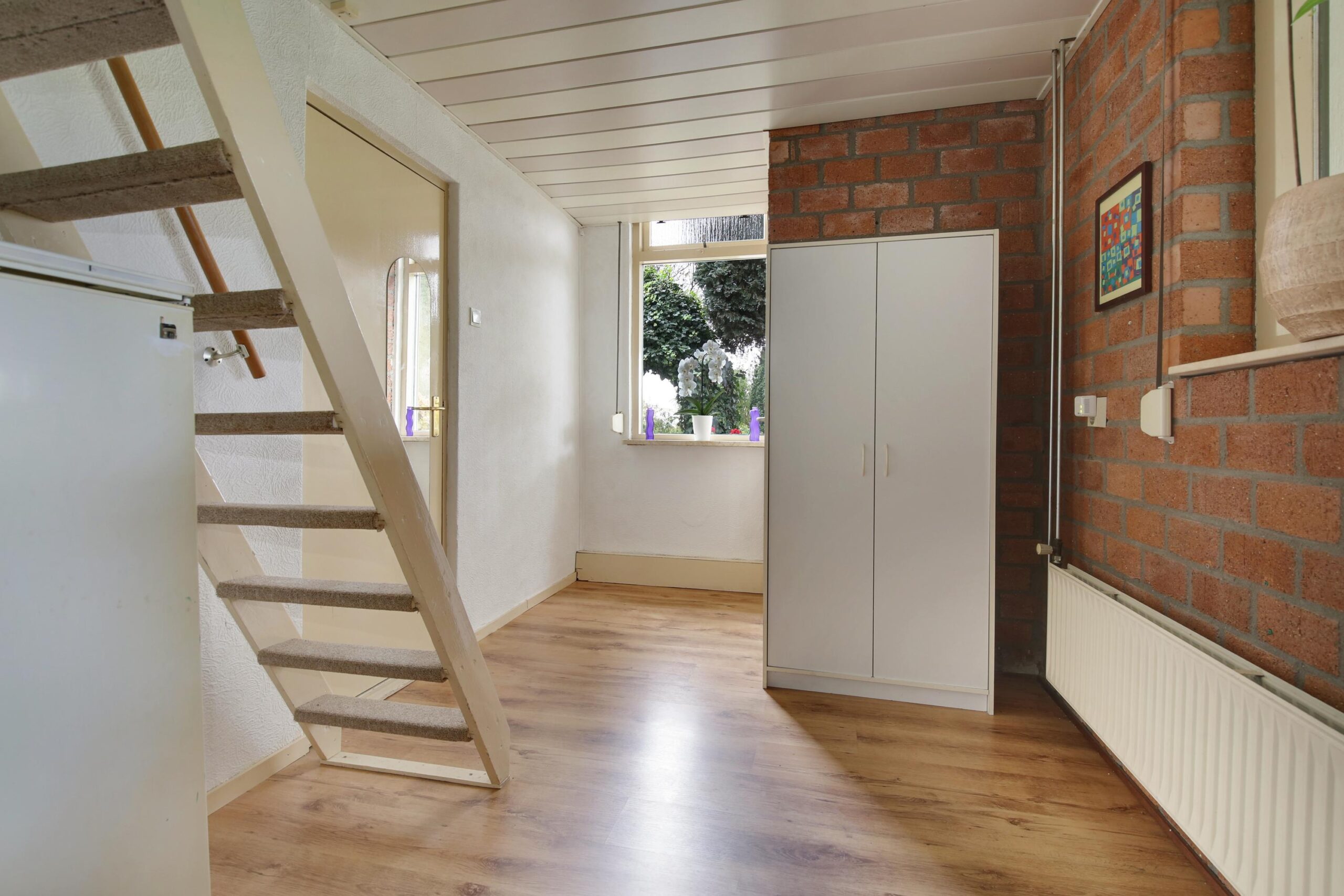 Achter de keuken in de verbinding tussen het voormalig voor- en achterhuis bereiken we een brede hal met toegang tot de provisiekelder en naar buiten. Veelal is dit de entree van de huidige bewoners. De hal geeft vervolgens toegang tot een portaal met een extra trap naar de eerste verdieping, een CV kast en aansluitend de favoriete plek van de huidige eigenaren in de woning. De tuinkamer met toegang tot de achtertuin en fraai uitzicht op het achtergelegen gebied. Een comfortabele ruimte met veel licht waar je heerlijk de dag kunt opstarten, beleven of afsluiten.