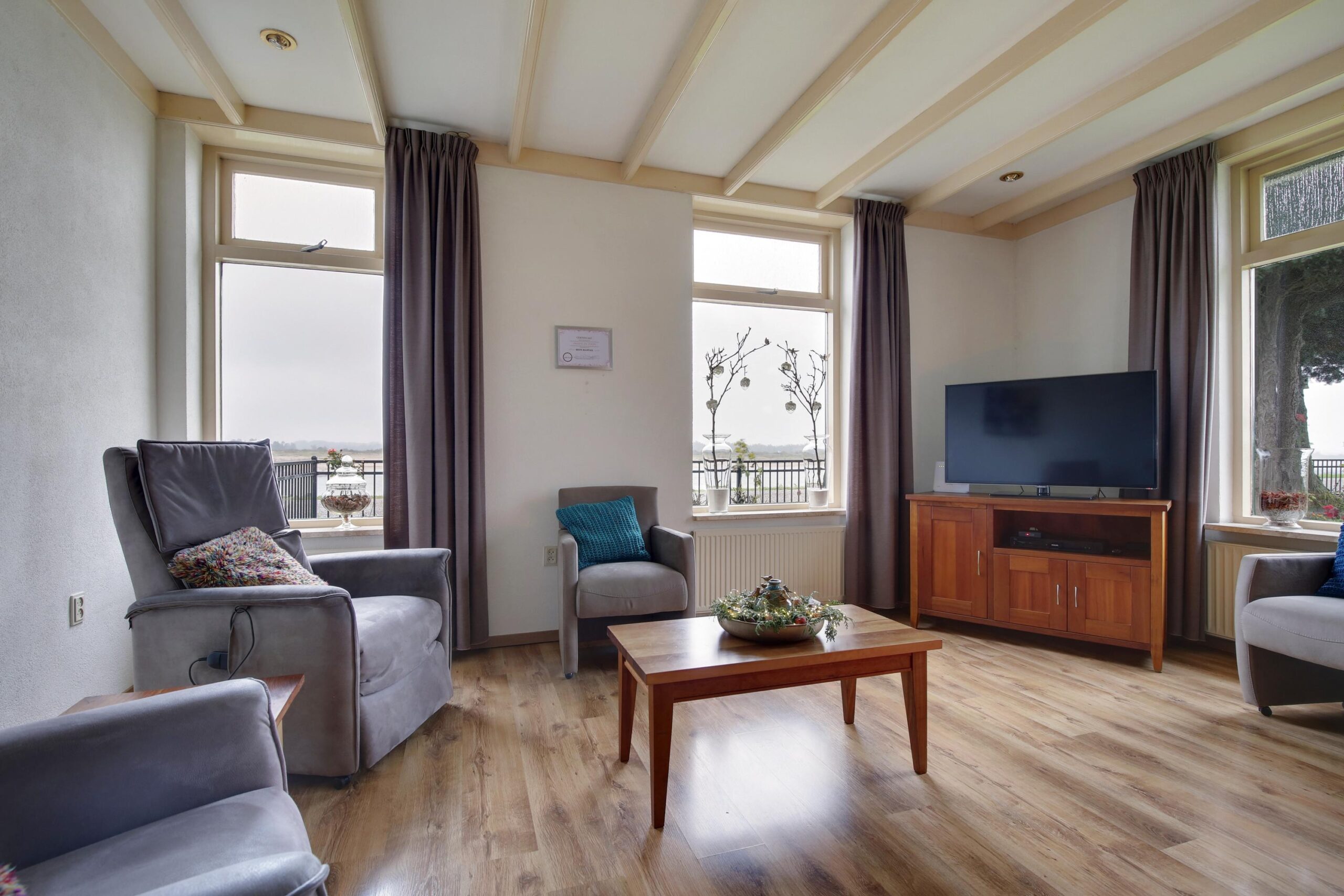 We komen (bij uitzondering) binnen via de voordeur in de hal waar aan de rechterkant de toiletruimte en de meterkast zich bevinden en links de trapopgang naar de eerste verdieping. Vervolgens lopen we door naar de woonkamer waar we direct even stilstaan bij het uitzicht op de Waal. Een fijne, gezellige ruimte met een houtkachel en volop daglicht door de grote ramen.