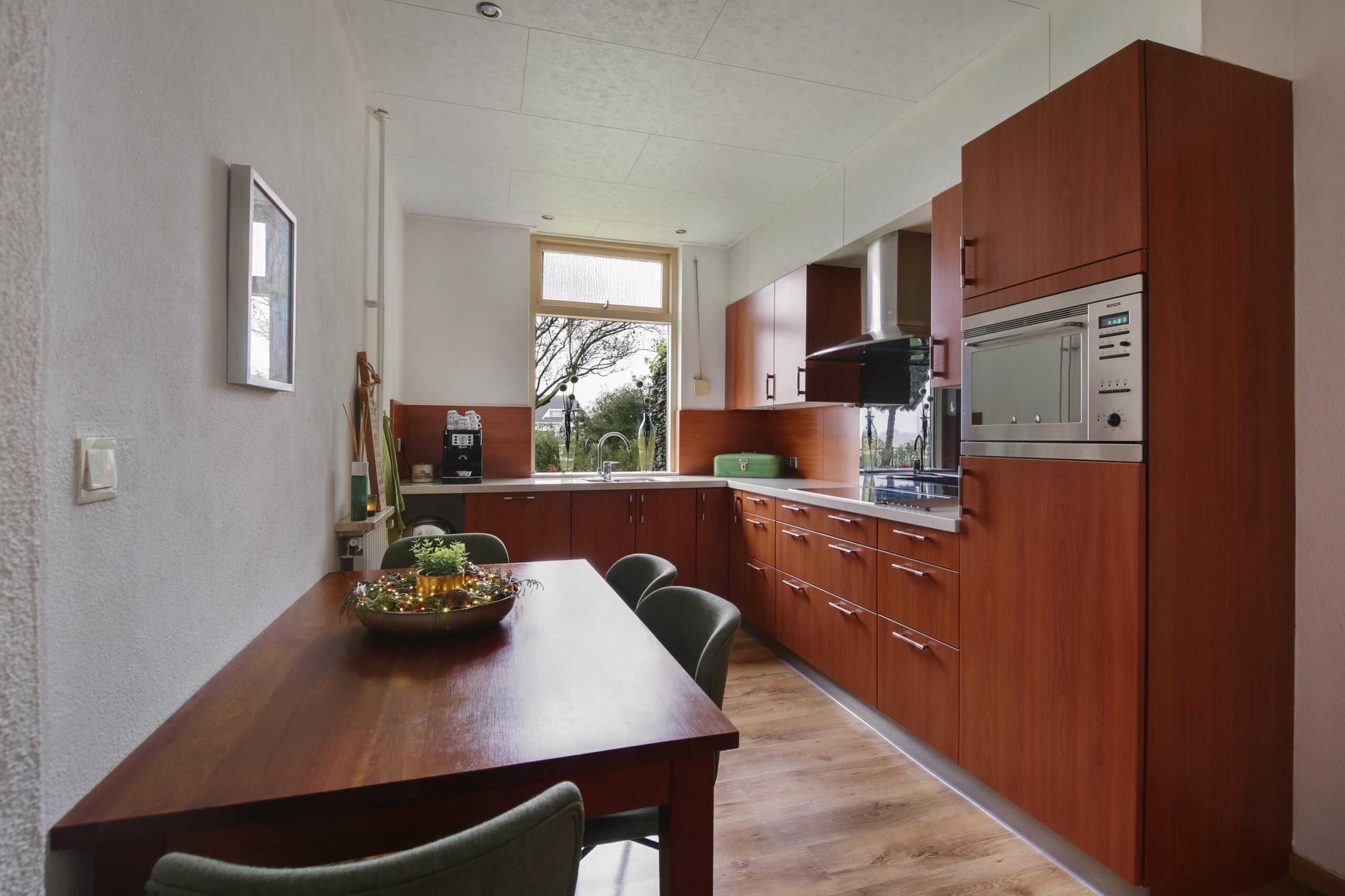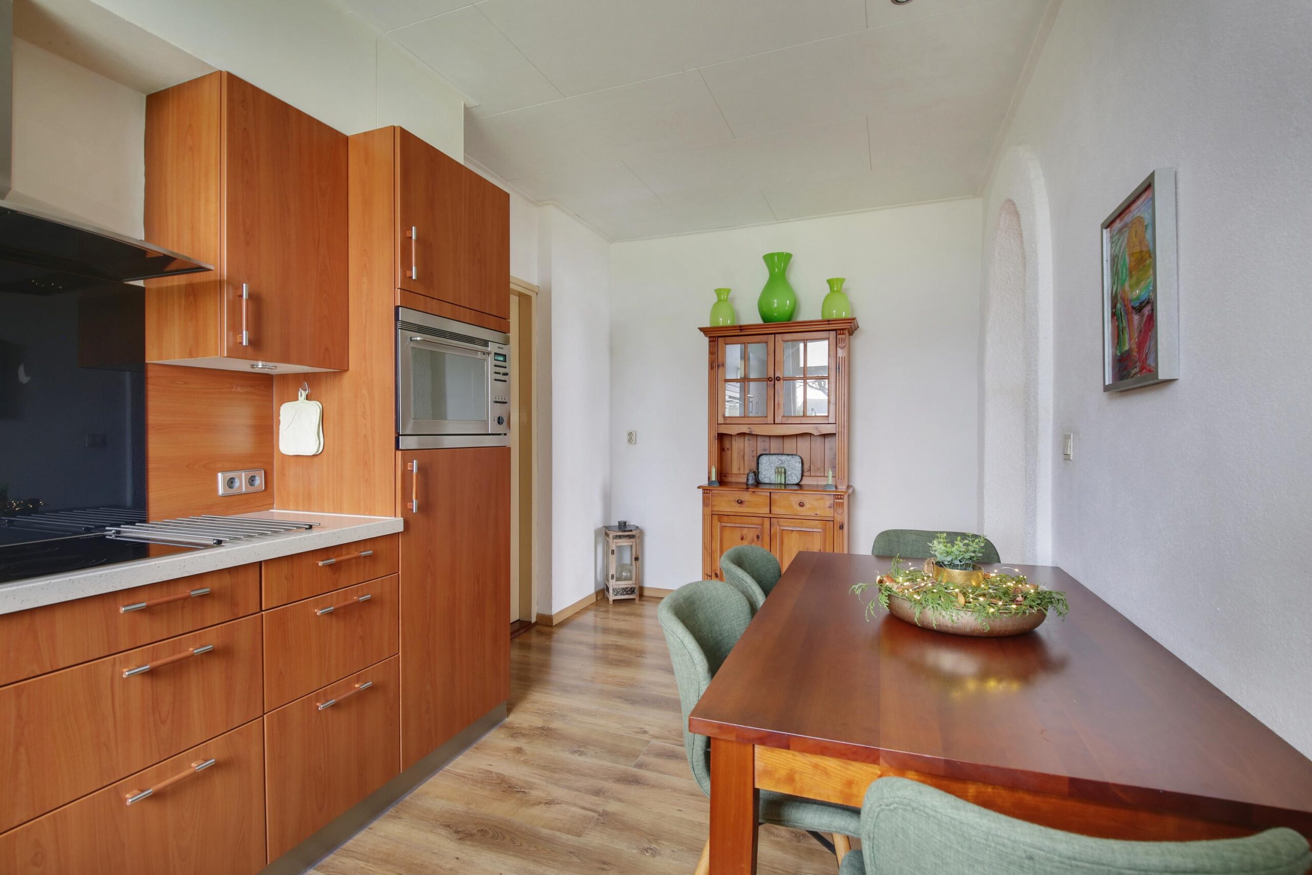 Aansluitend bereiken we de keuken die door de ligging om de hoek betrokken, maar toch voldoende besloten is van de woonkamer. In de keuken vinden we een hoekinrichting die met een inductiekookplaat, een afzuigkap, een koelkast, een combimagnetron en een vaatwasser beschikt over alle basisgemakken. De spoelbak kijkt aan de zijkant fijn weg over de naastgelegen landerijen.