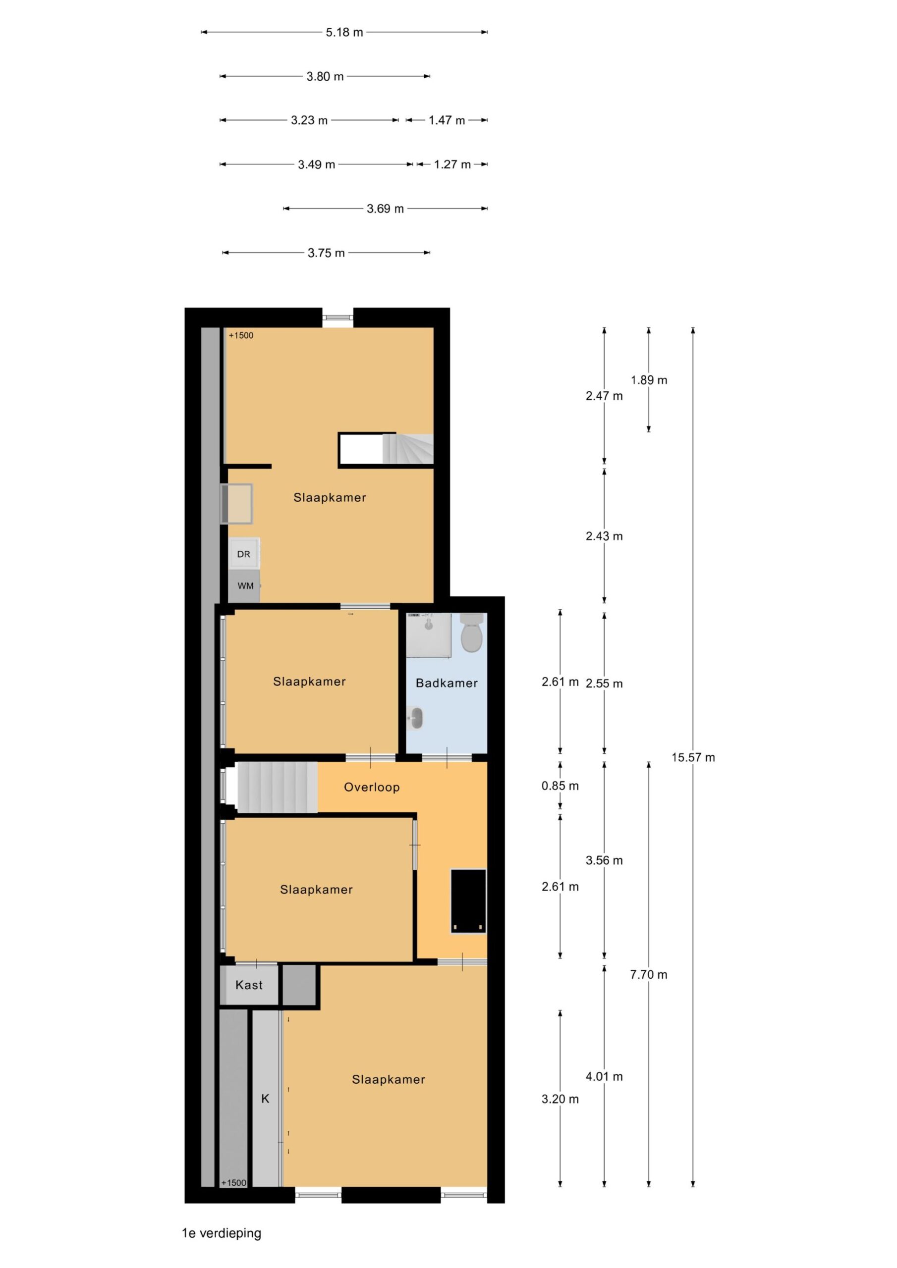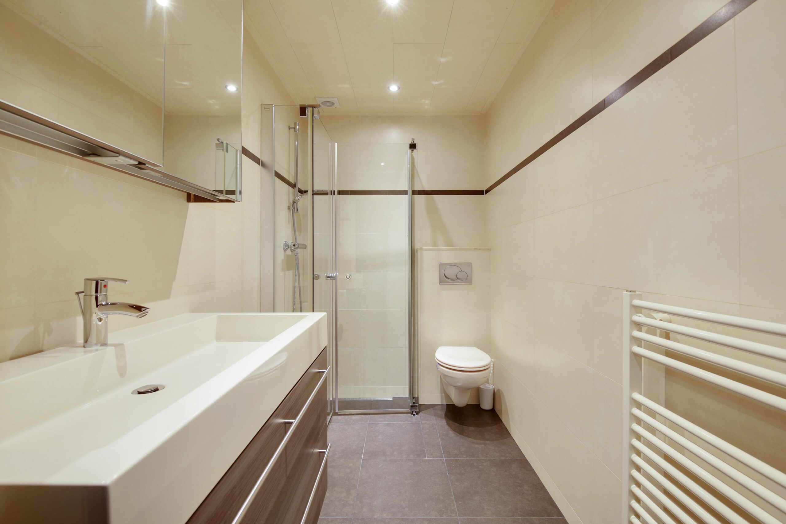 Via de trap in de hal komen we op de overloop. Vanuit hier bereiken we drie slaapkamers waaronder de grote ouderslaapkamer met vaste kasten aan de straatzijde. De badkamer is modern en tijdloos uitgevoerd in lichte kleurstellingen en beschikt over een douche, een wastafel met meubel, een elektrische designradiator en een wandcloset.