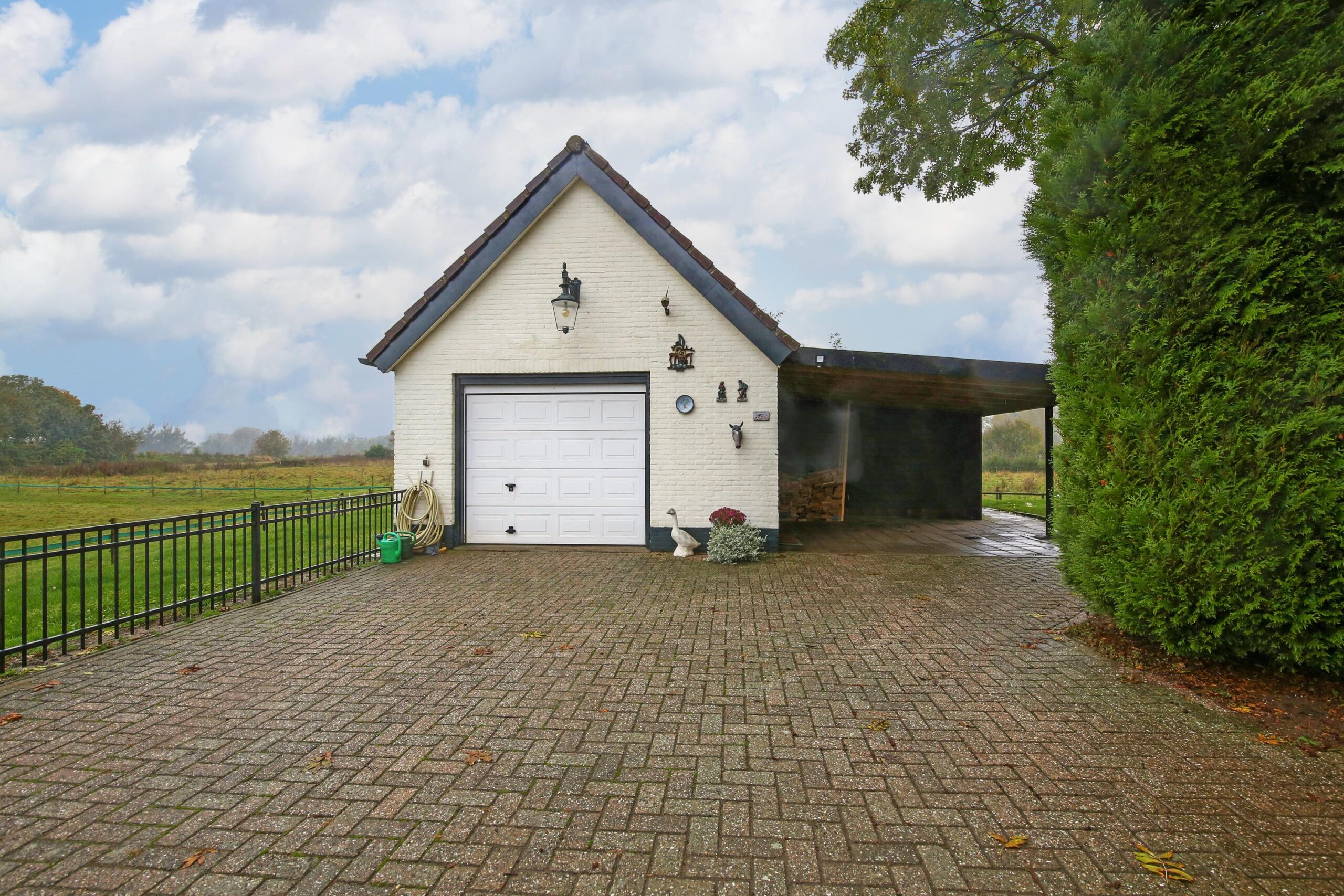 Buiten: een riant kavel met in totaal maar liefst 4560 m² perceeloppervlakte, bebouwd met een vrijstaande stenen garage (spouw), een houten berging en een eigen oprit. De verharding richting de garage is niet in eigendom, maar betreft de voormalige toegangsweg naar de oorspronkelijk aanwezige boerderij op het achtergelegen perceel. Hier is sprake van een erfdienstbaarheid.