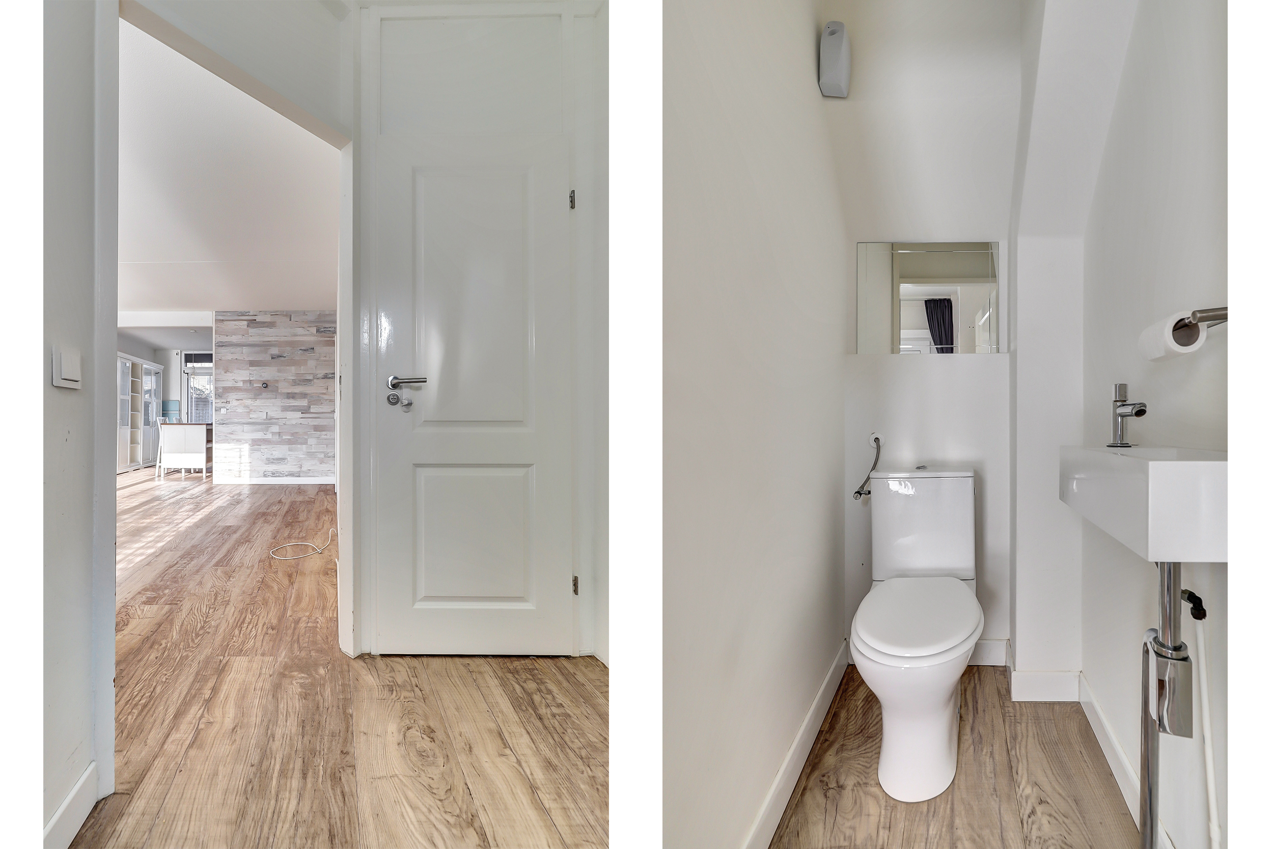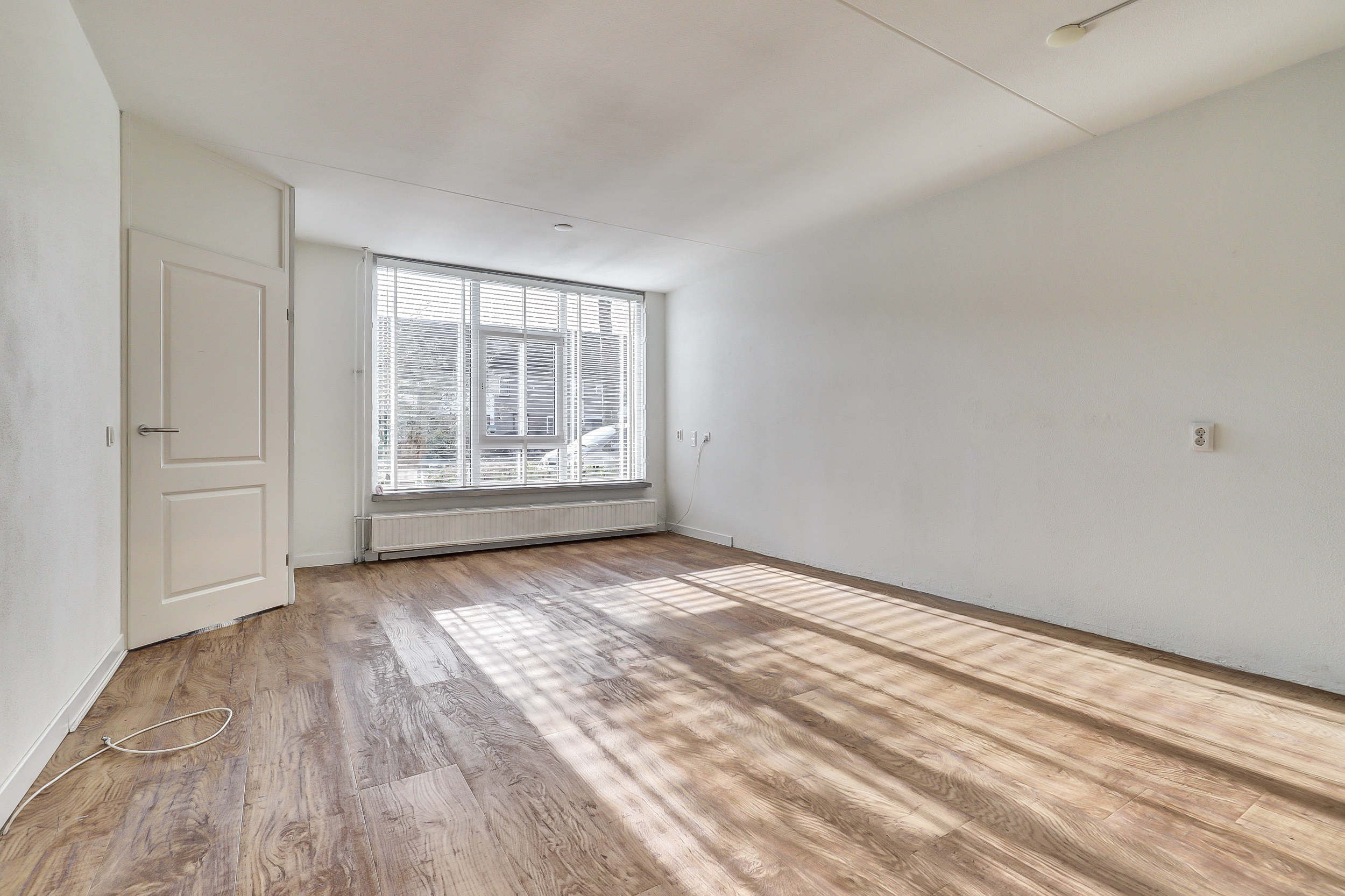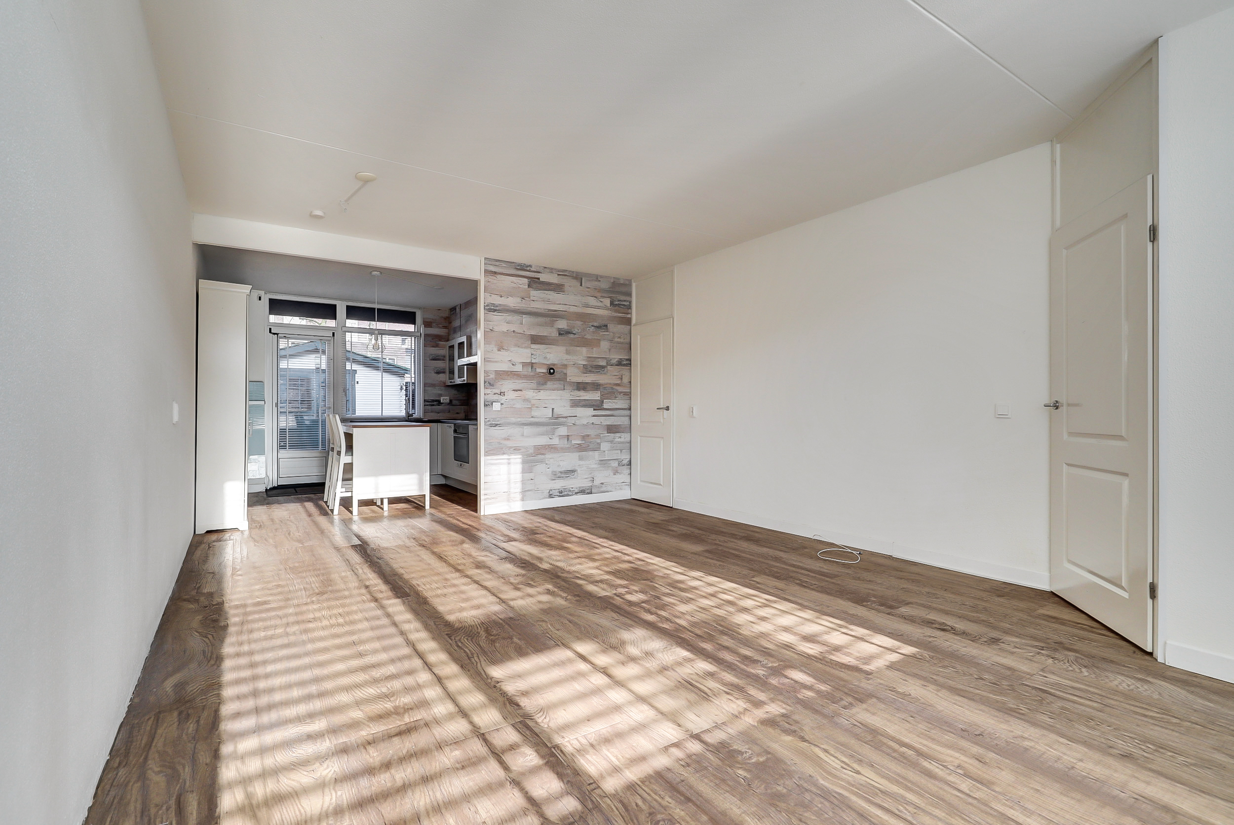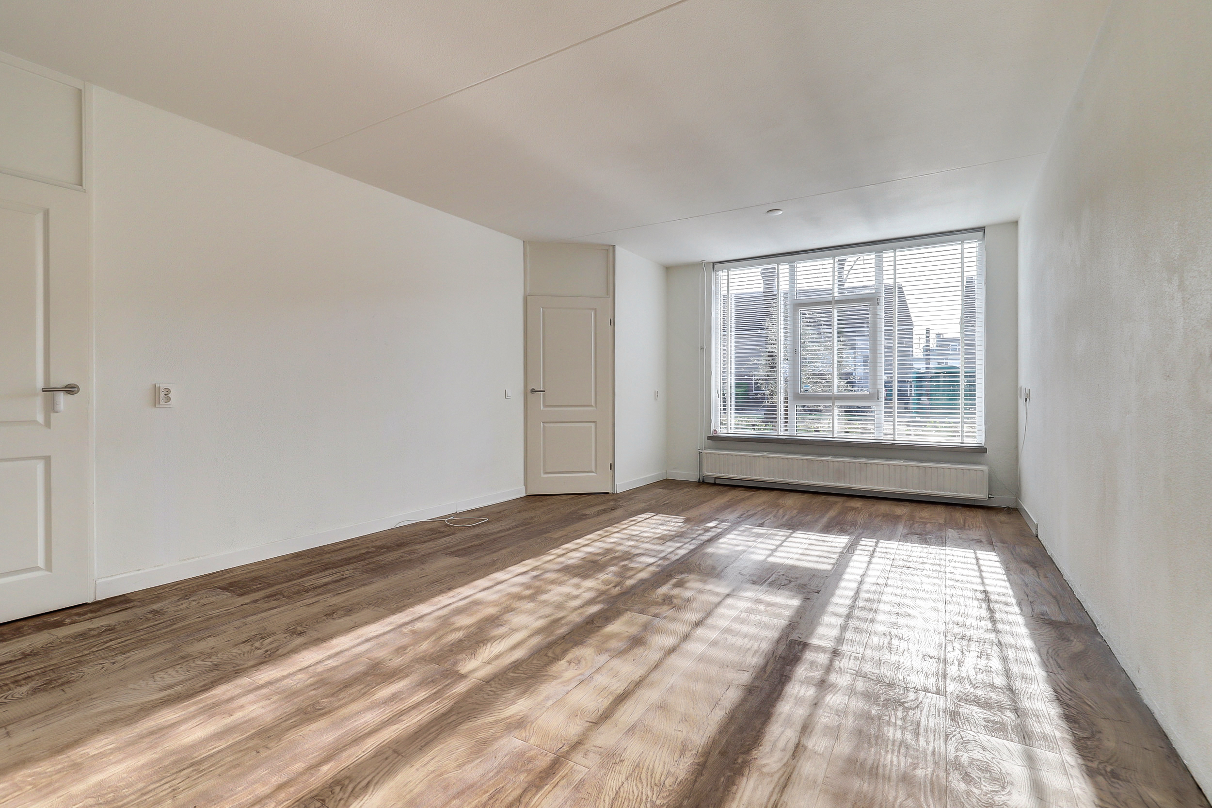 Je komt binnen in de hal met meterkast en een toiletruimte met fontein. Vanuit hier loop je door naar de woonkamer aan de voorzijde: een fijne, lichte leefruimte waar je direct kunt ontspannen.