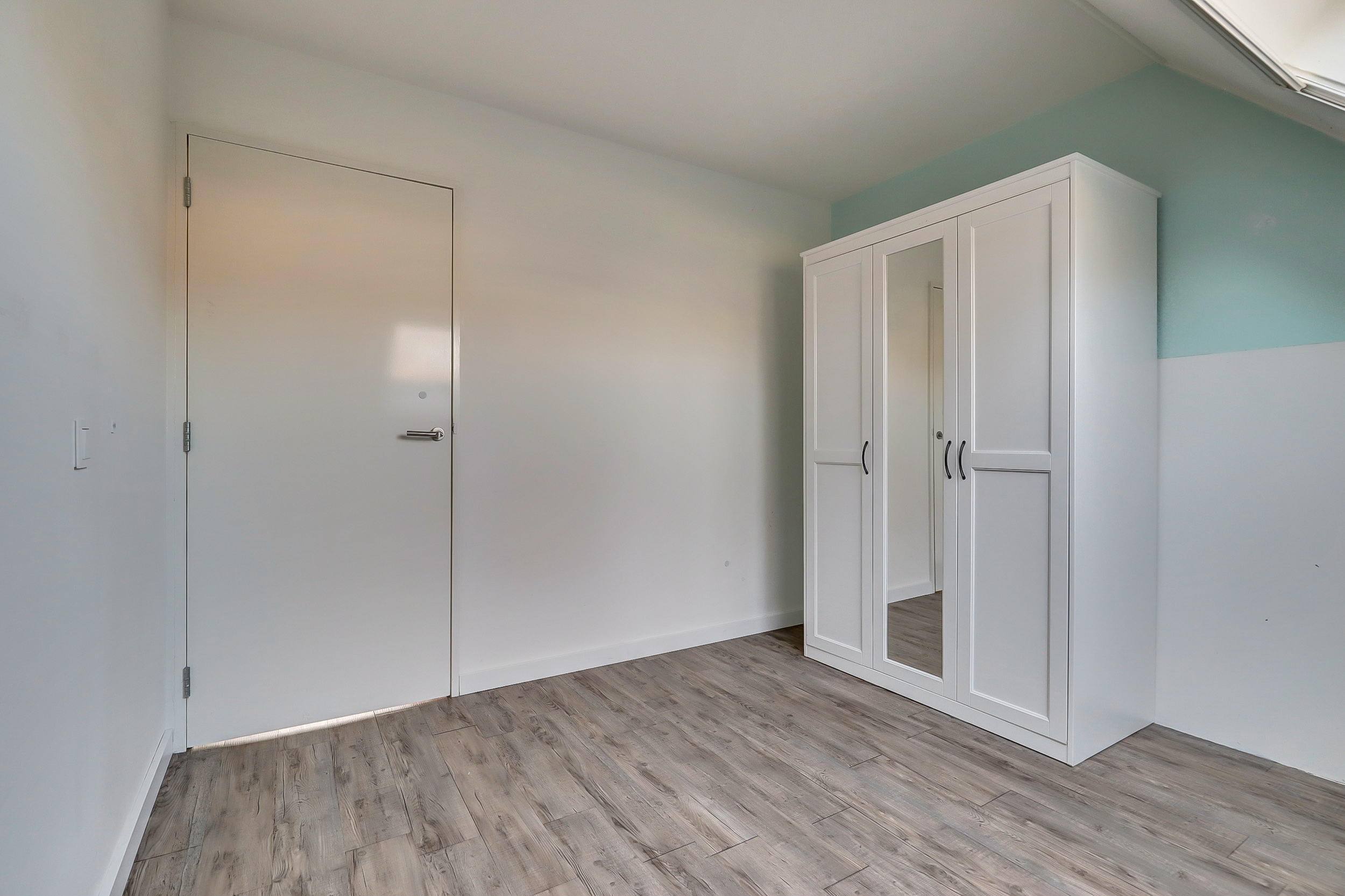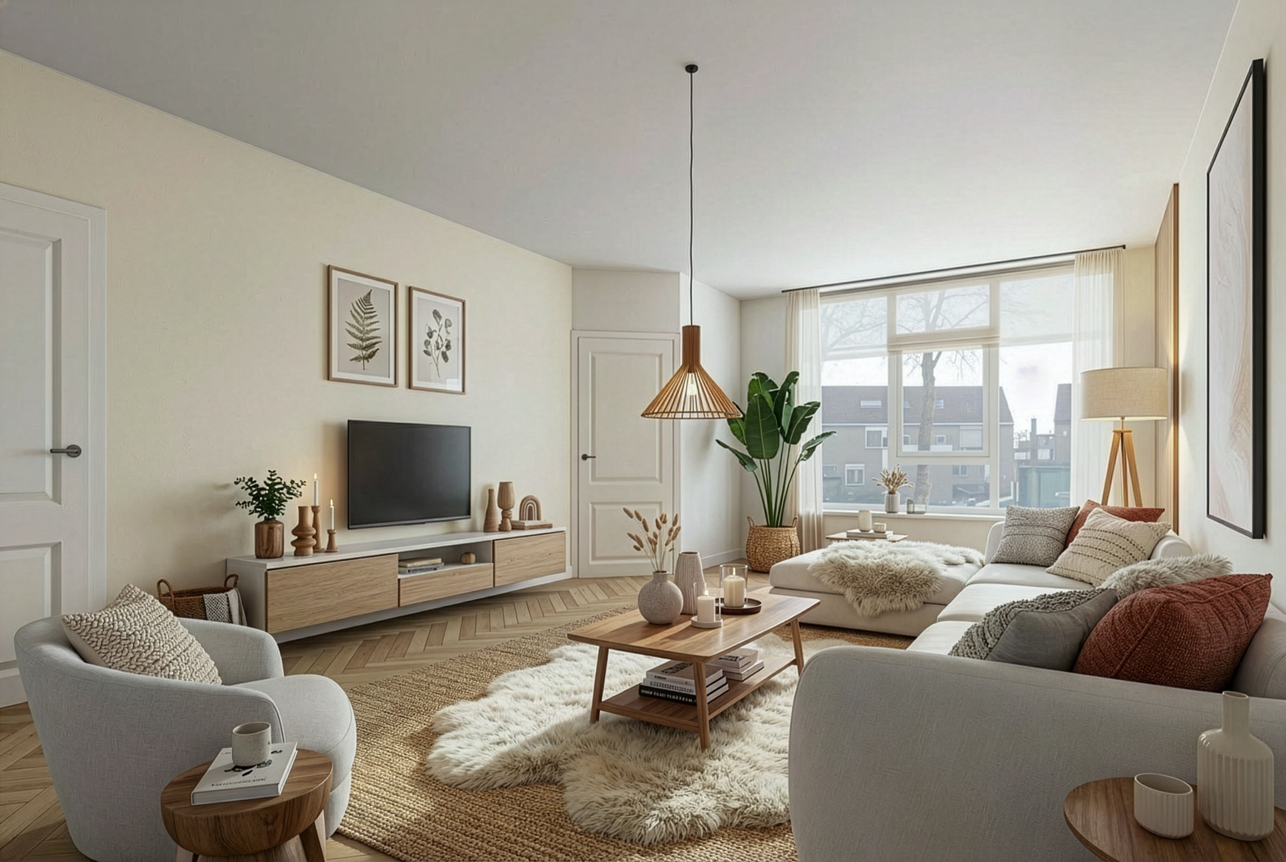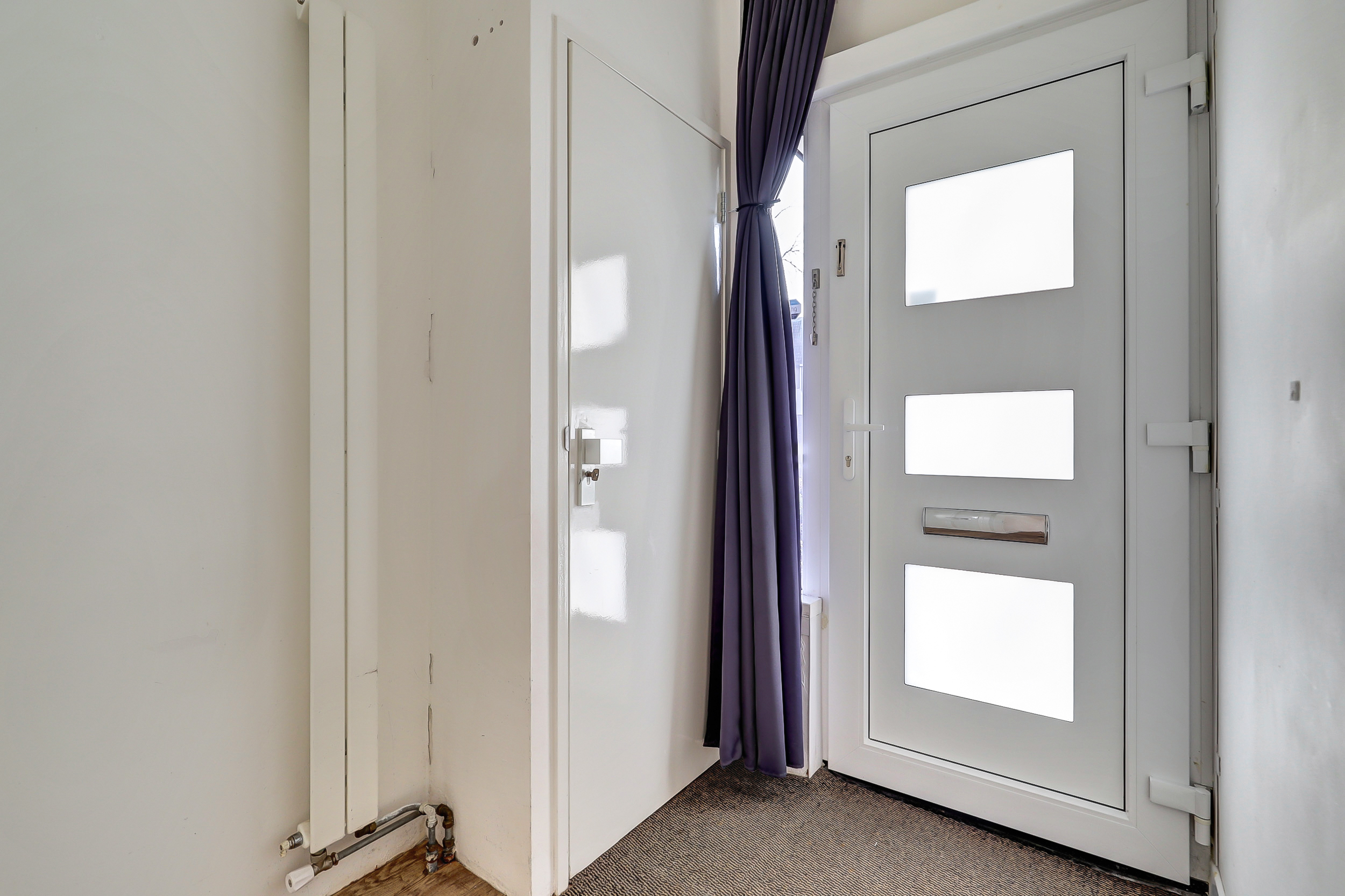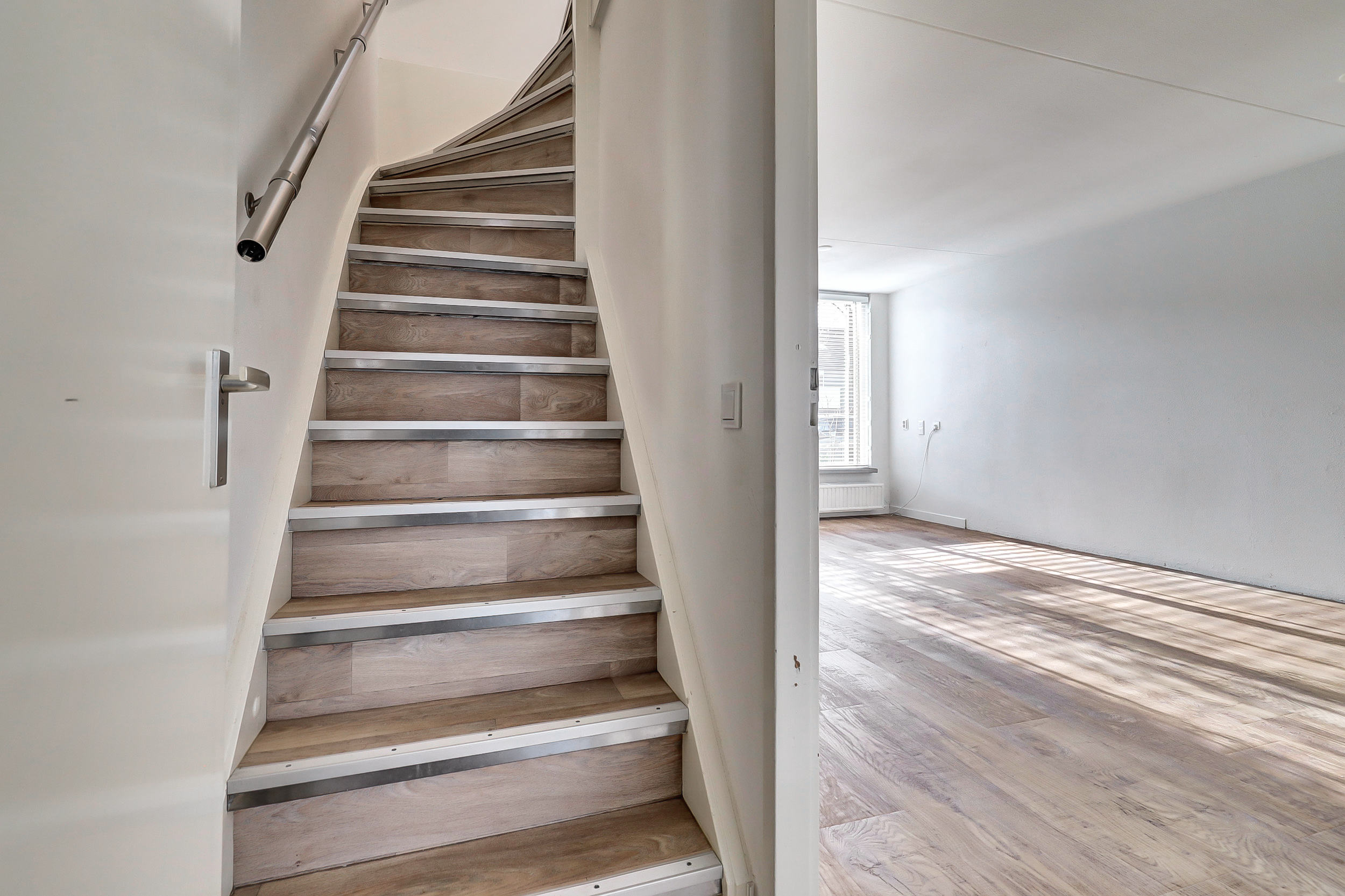 Je komt binnen in de hal met meterkast en een toiletruimte met fontein. Vanuit hier loop je door naar de woonkamer aan de voorzijde: een fijne, lichte leefruimte waar je direct kunt ontspannen.