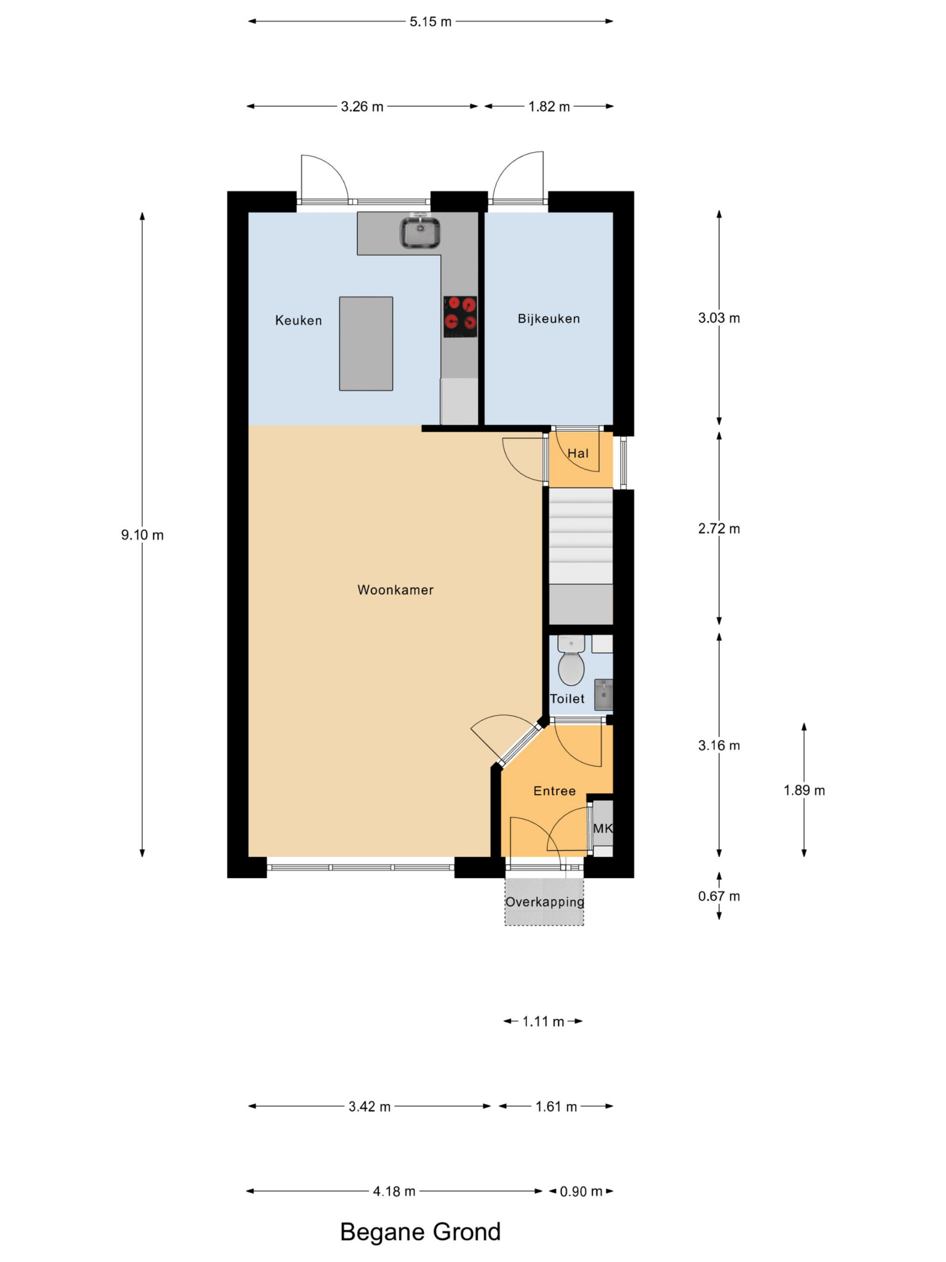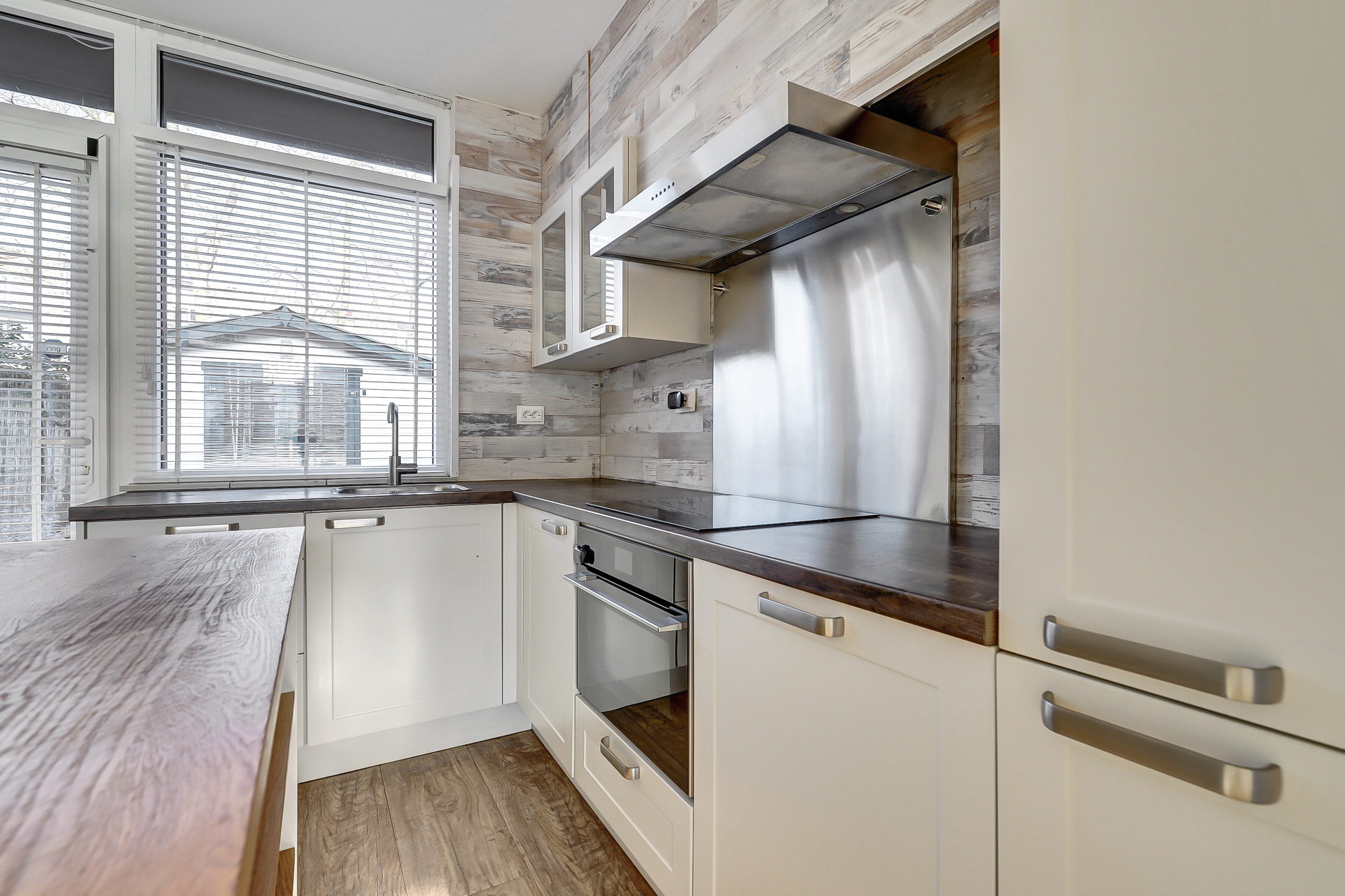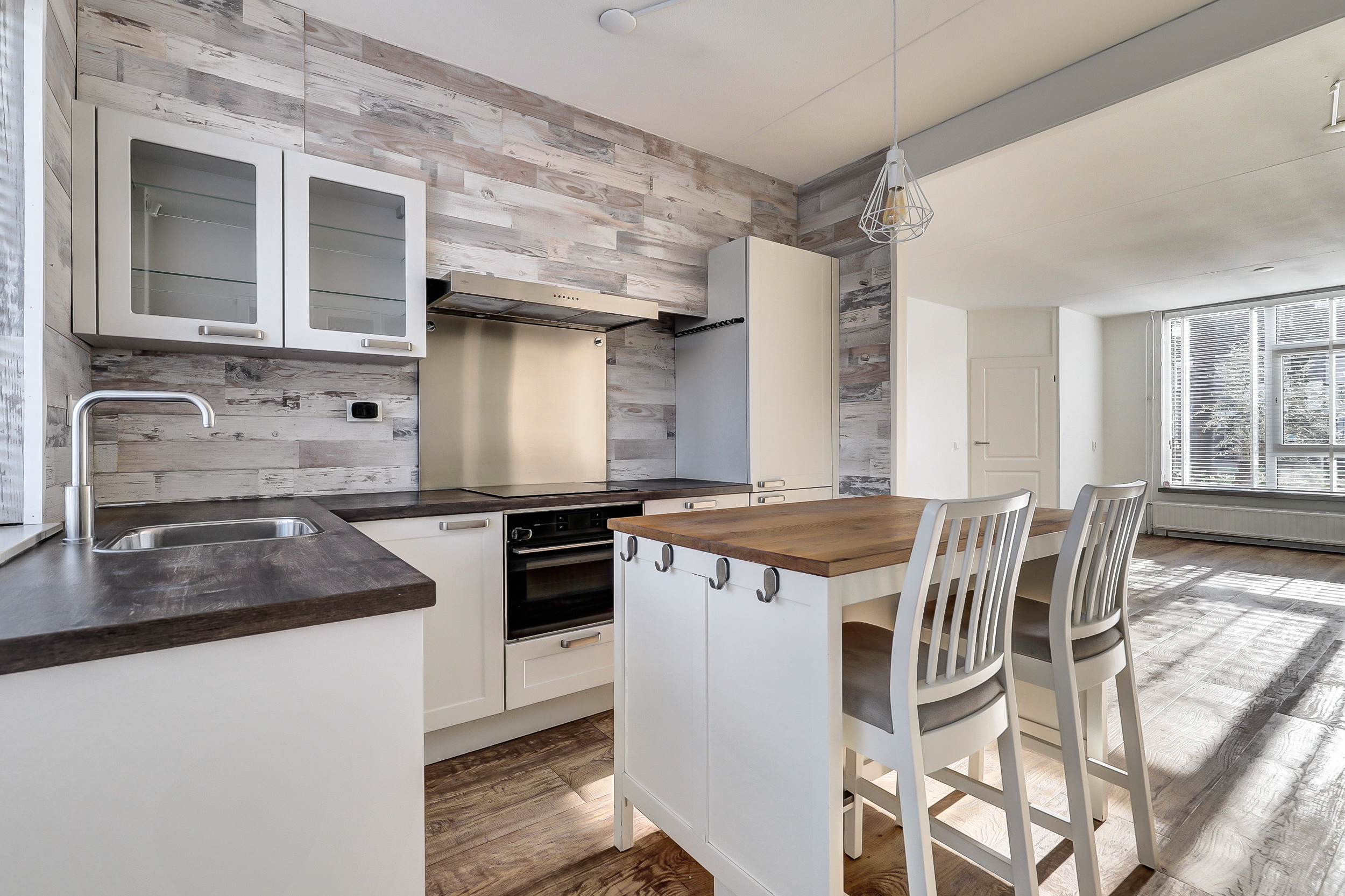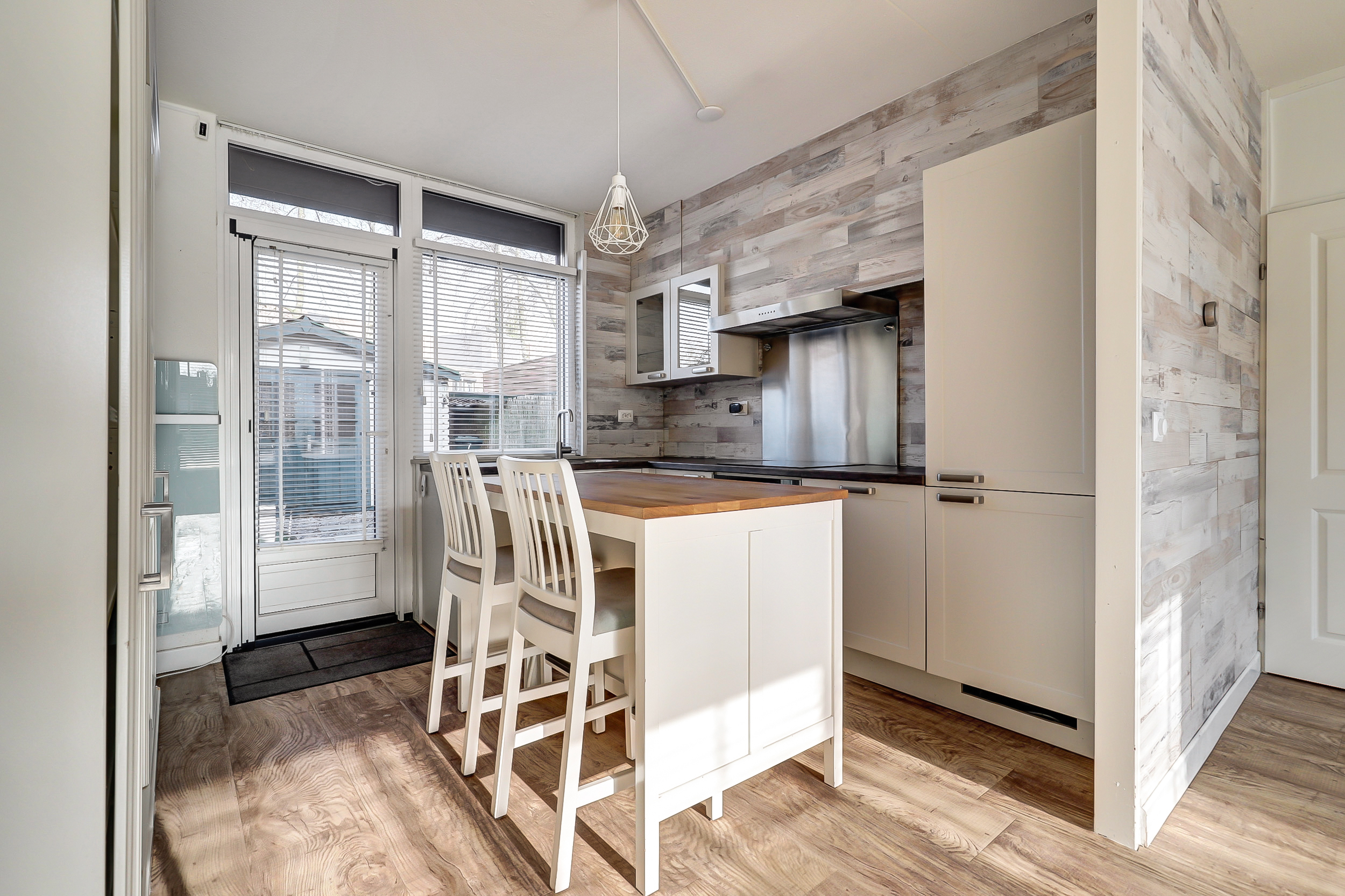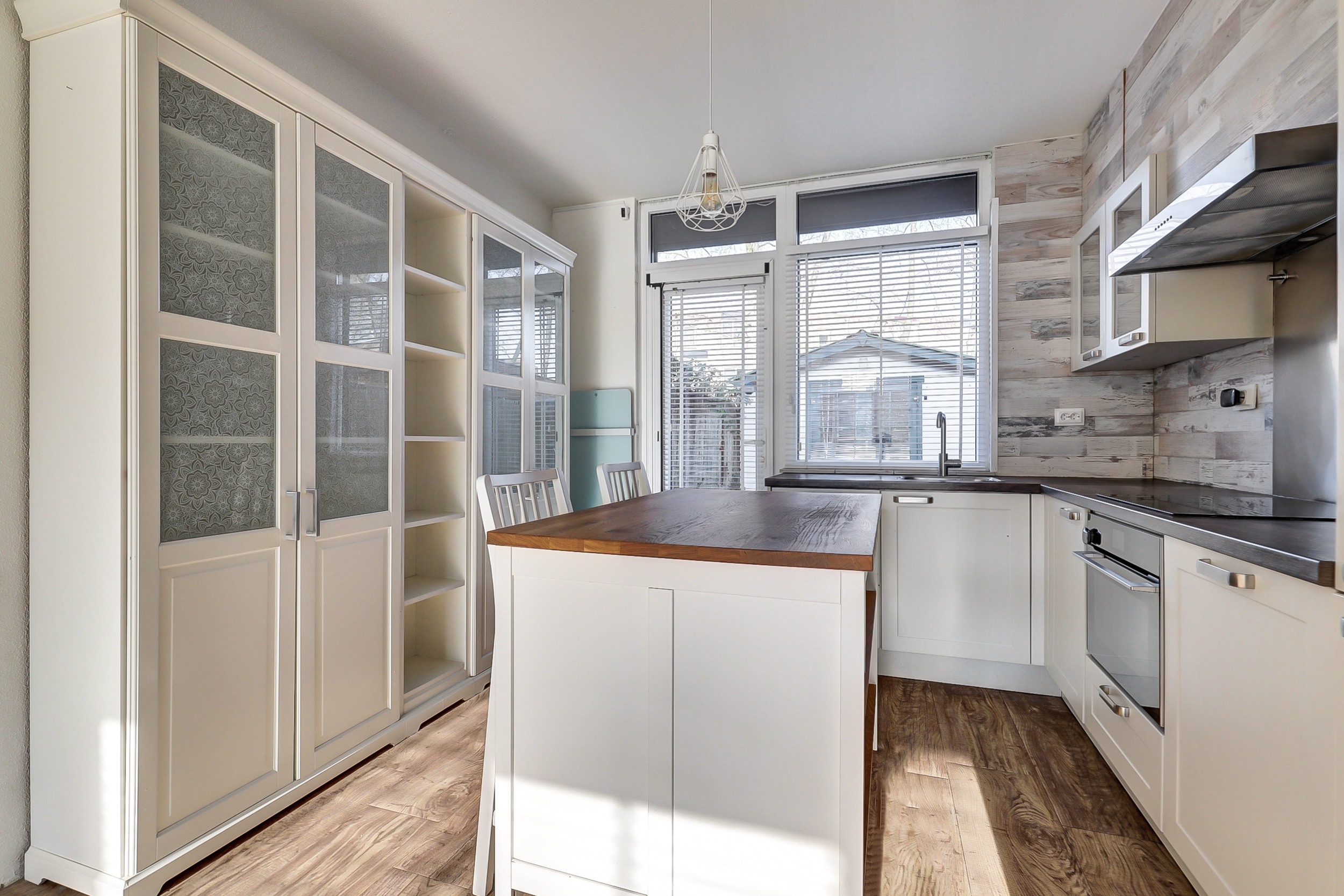 Aan de achterzijde bevindt zich de open keuken met keukeneiland en bar, een prettige plek voor ontbijt, een snelle maaltijd of een gezellig moment met familie en vrienden. De keuken is uitgerust met koelkast, diepvries, vaatwasser en een 4-pits inductiekookplaat. Op de begane grond zorgen kunststof kozijnen voor comfort en gemak; aan de achterzijde is een rolluik aanwezig.