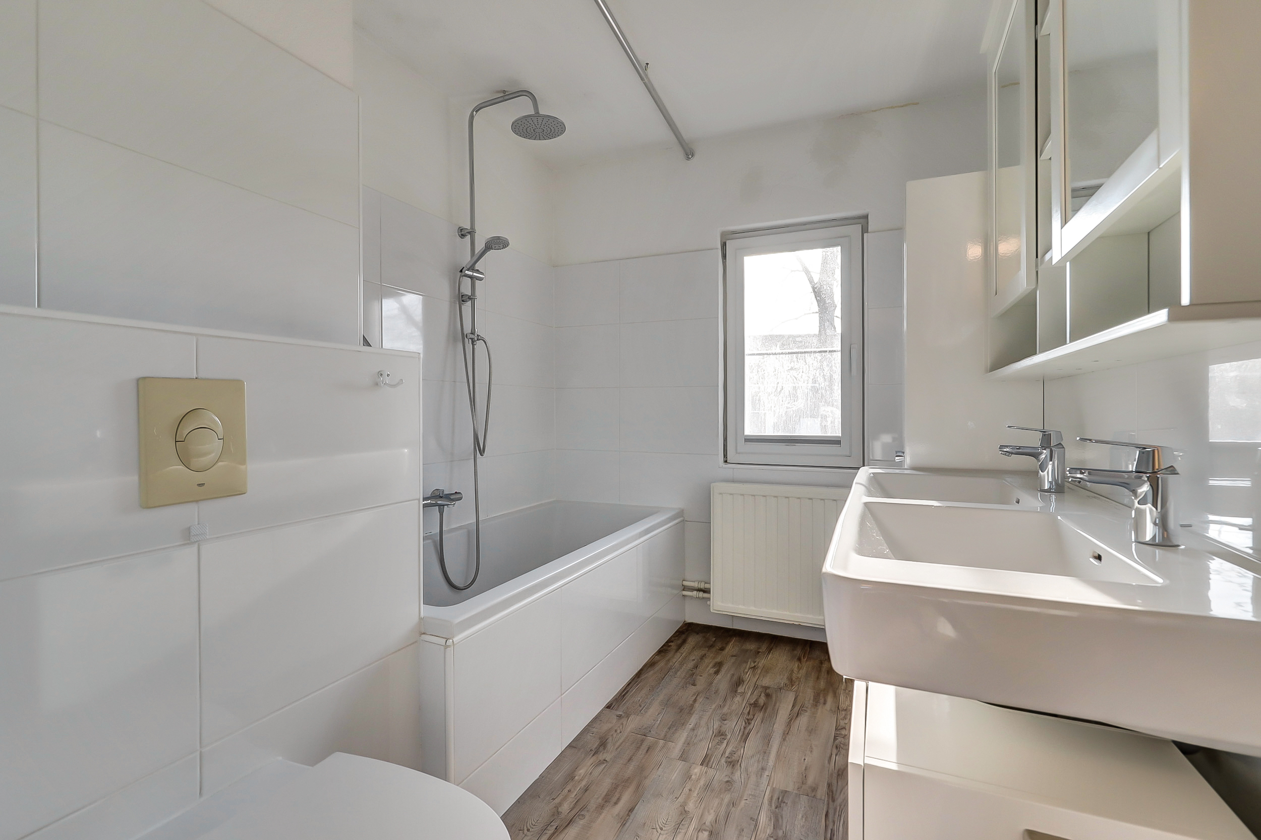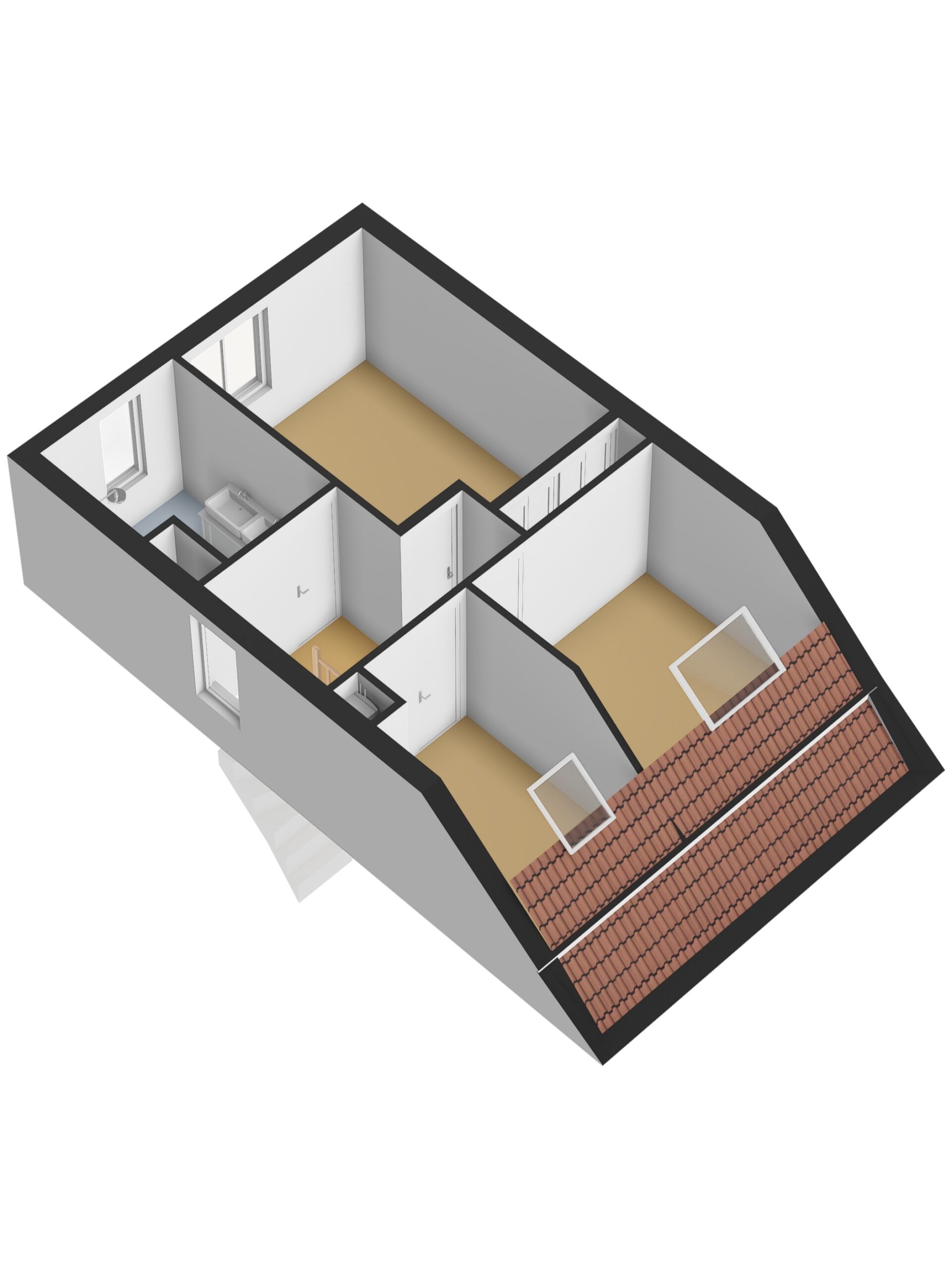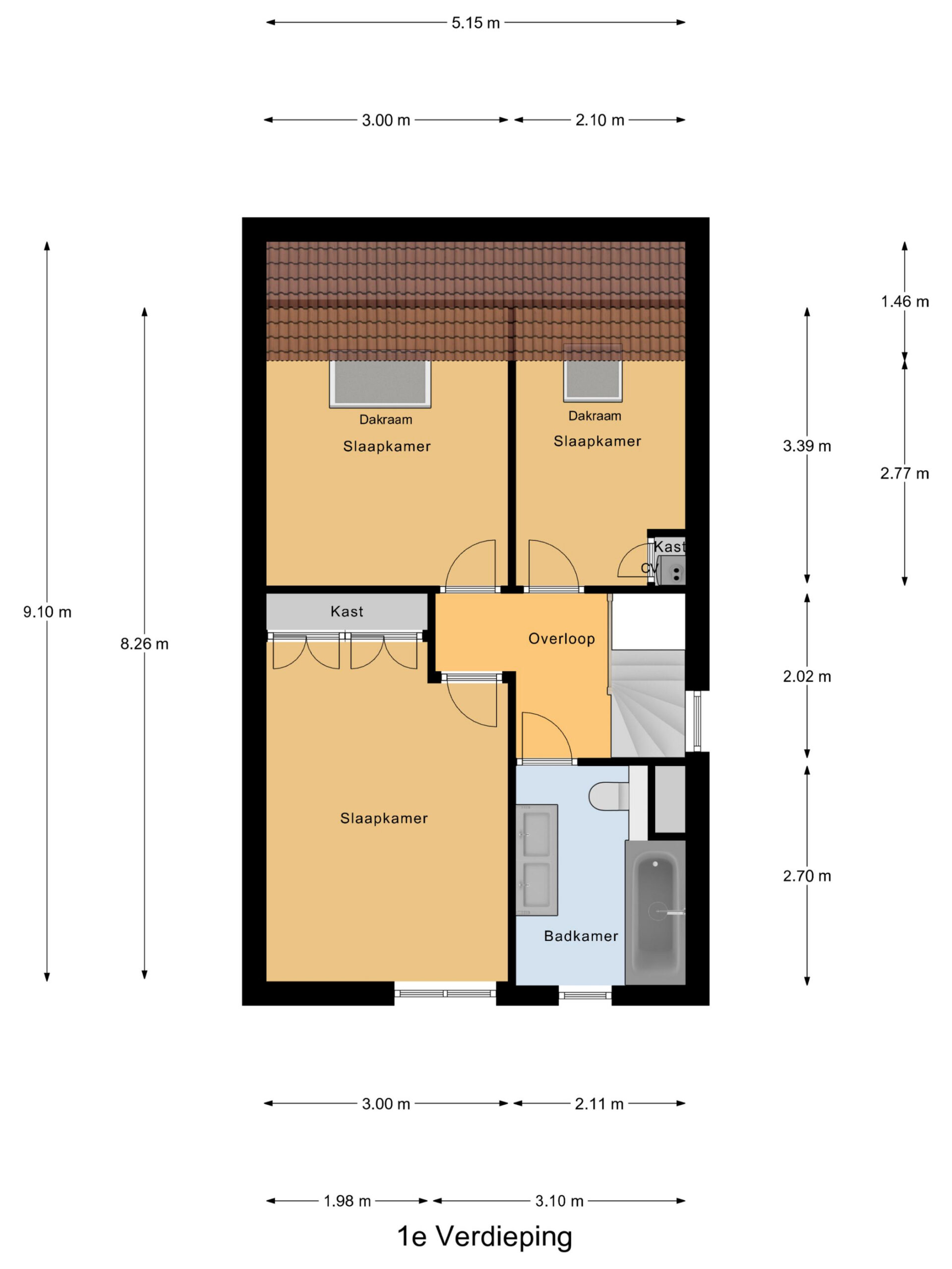 Boven vind je 3 slaapkamers, waarvan de kamers aan de achterzijde voorzien zijn van dakramen. Ook airconditioning is op deze etage aanwezig, wat voor extra comfort zorgt in de zomer. De badkamer is praktisch ingedeeld met een douche/ligbad, dubbele wastafel met meubel en een toilet.