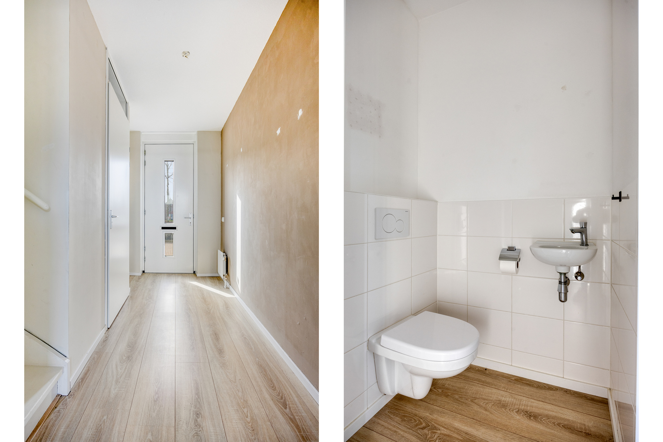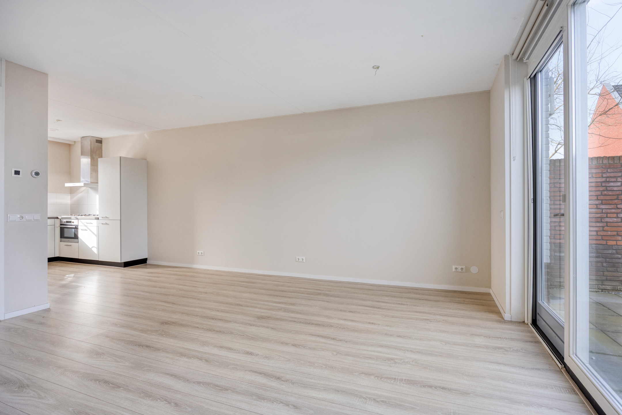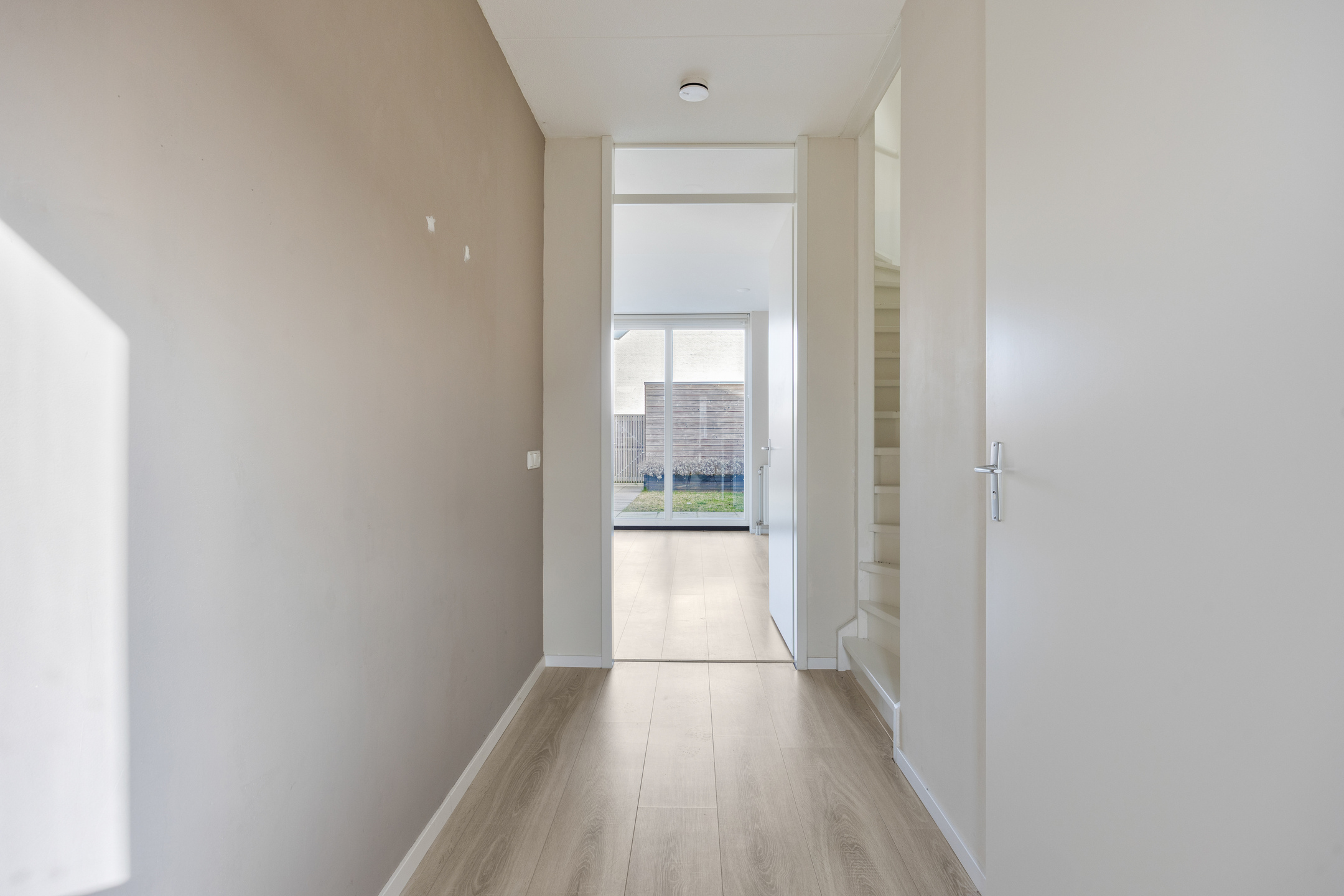 Je stapt binnen in een verzorgde hal met garderobe, meterkast en modern toilet. Vanuit hier loop je door naar de leefruimte die zich aan de achterzijde opent naar de tuin. De woonkamer richt zich op buiten en laat via grote raampartijen en een loopdeur veel daglicht binnenvallen, wat zorgt voor een prettige, lichte sfeer.