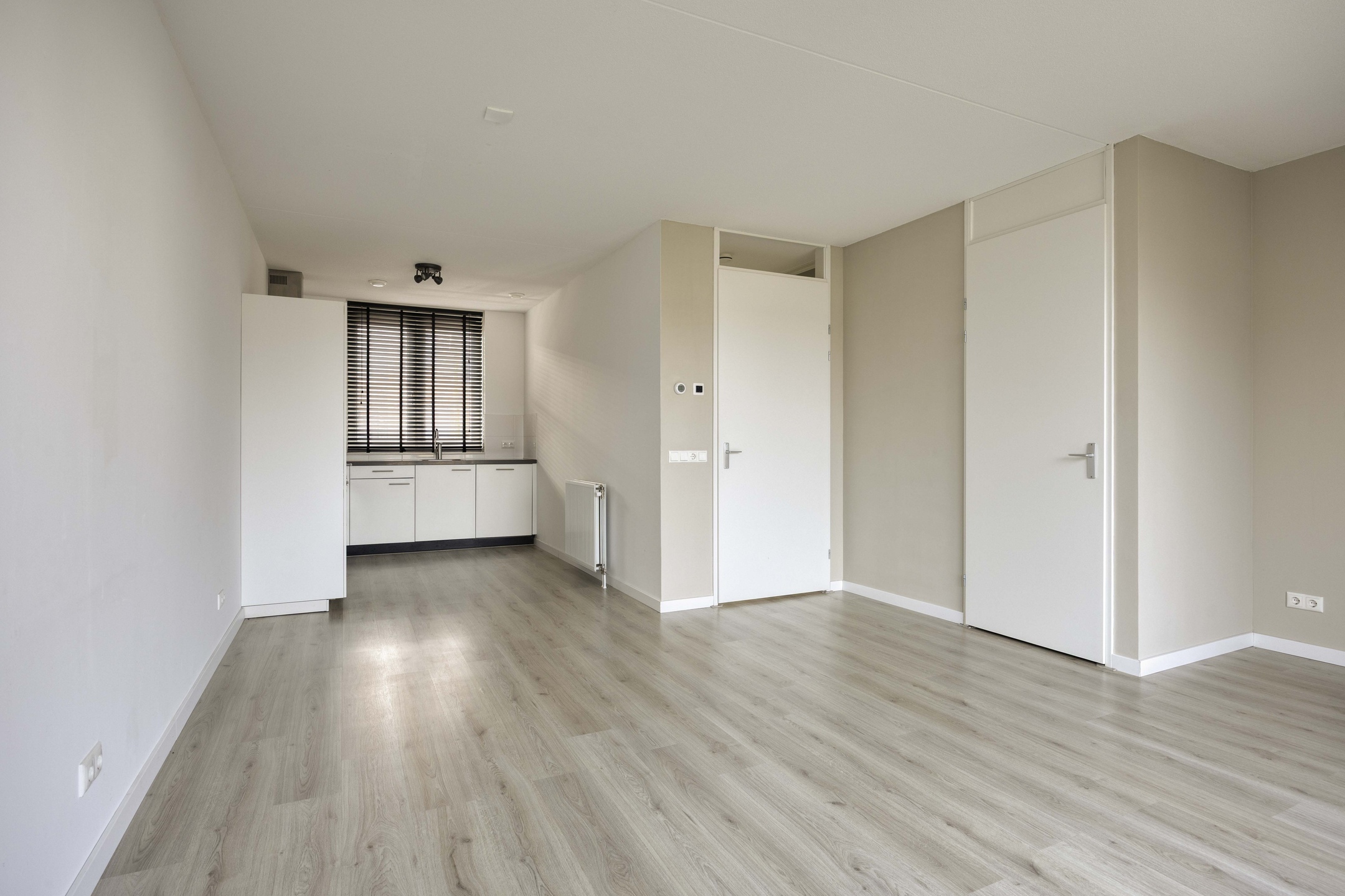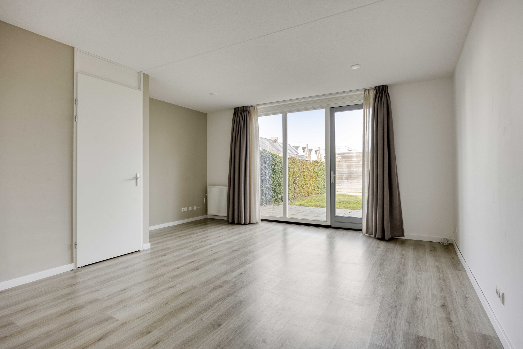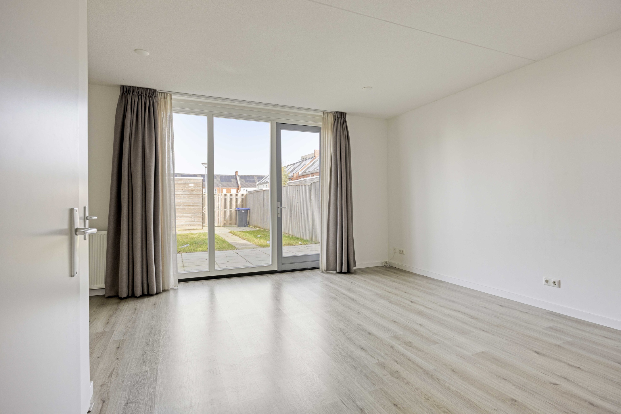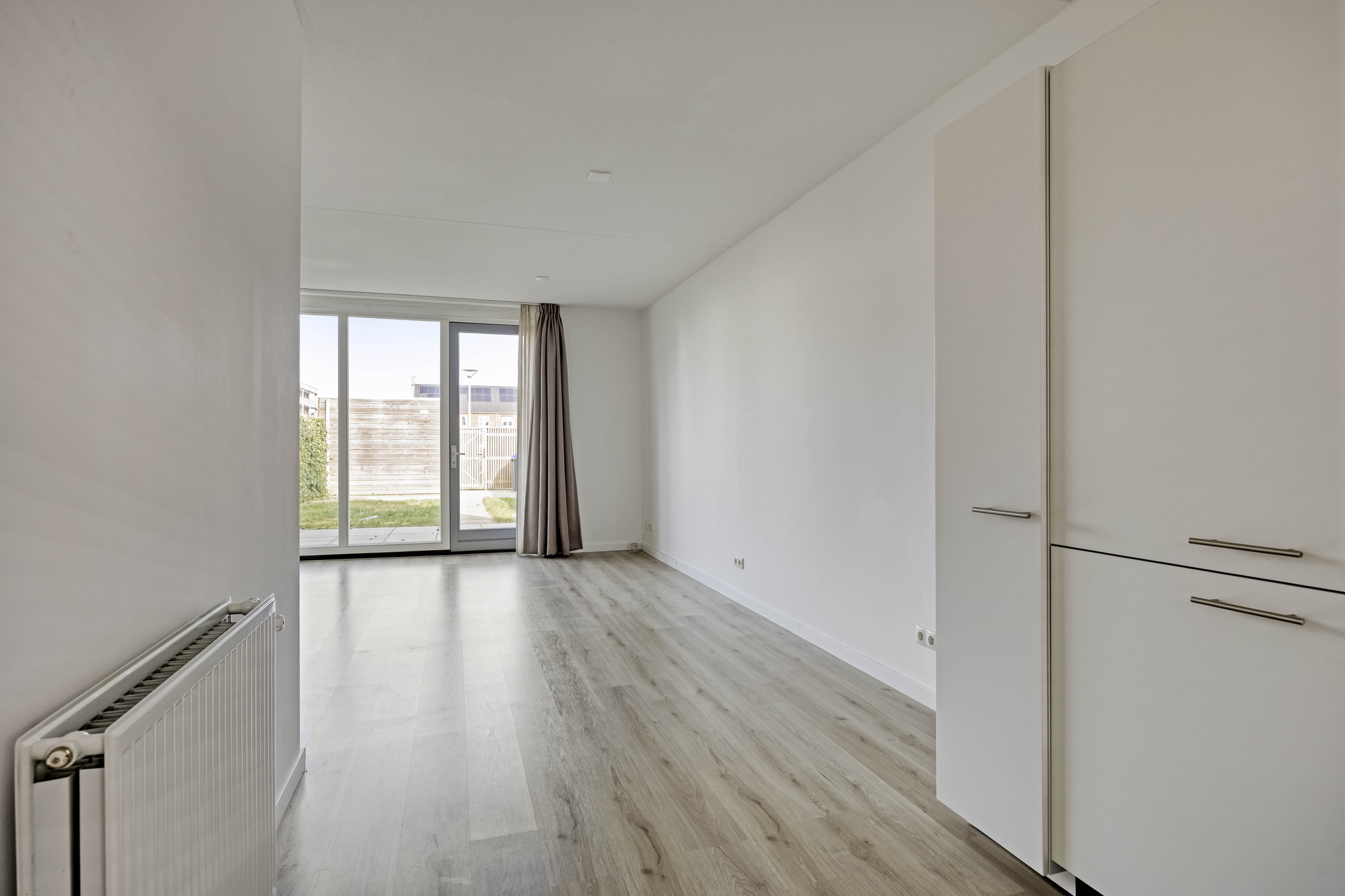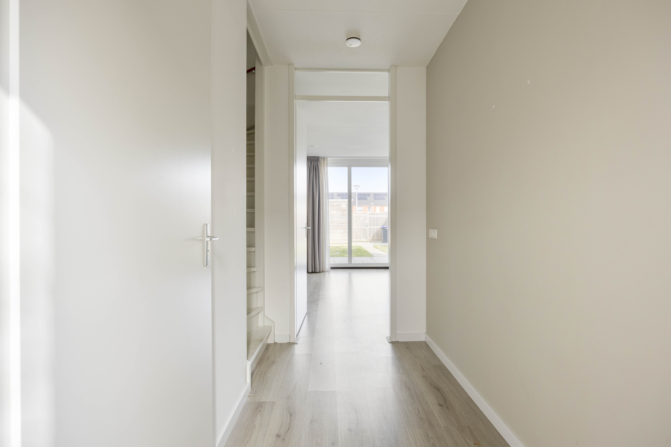 Je betreedt de woning via een nette hal met garderobe, meterkast en modern toilet. Vanuit hier stap je de leefruimte in die zich richt op de achtertuin. Grote raampartijen en een loopdeur zorgen voor een sterke verbinding met buiten en laten het daglicht rijkelijk binnenstromen. Hier leef je open, licht en comfortabel. De keuken positioneert zich aan de voorzijde en kijkt uit over de straat. De opstelling werkt praktisch, biedt voldoende werkruimte en sluit naadloos aan op het dagelijkse ritme van koken, leven en ontmoeten.