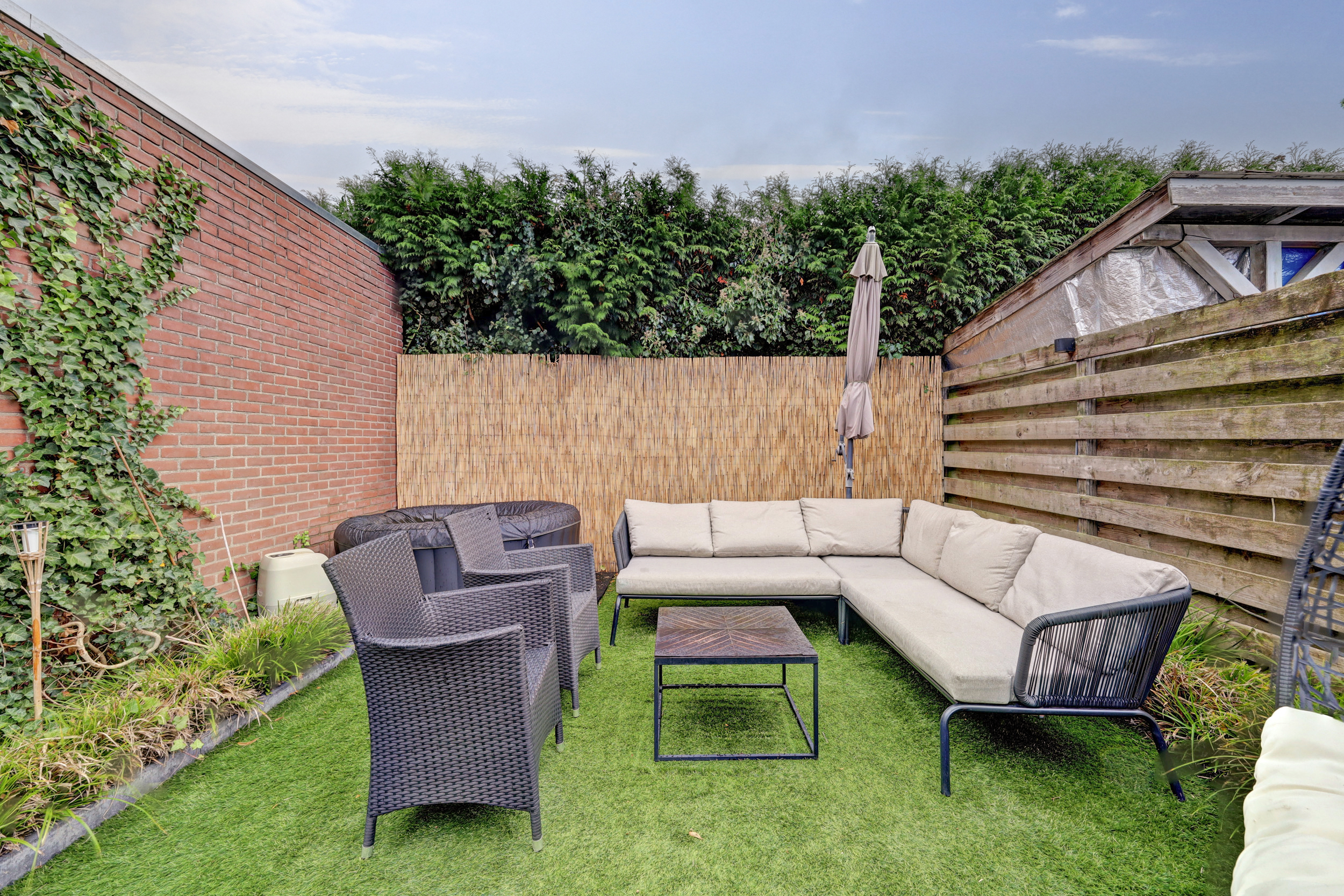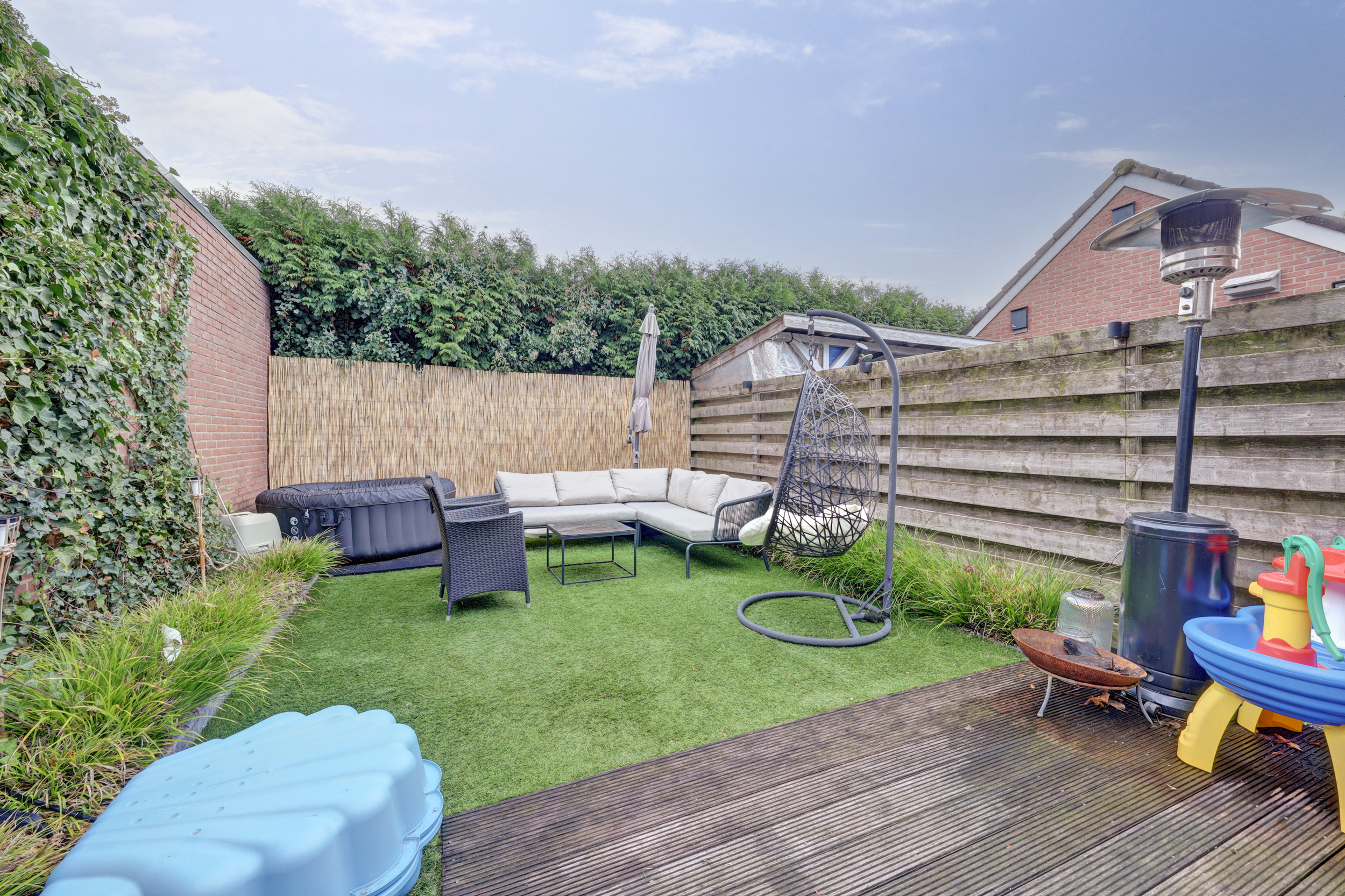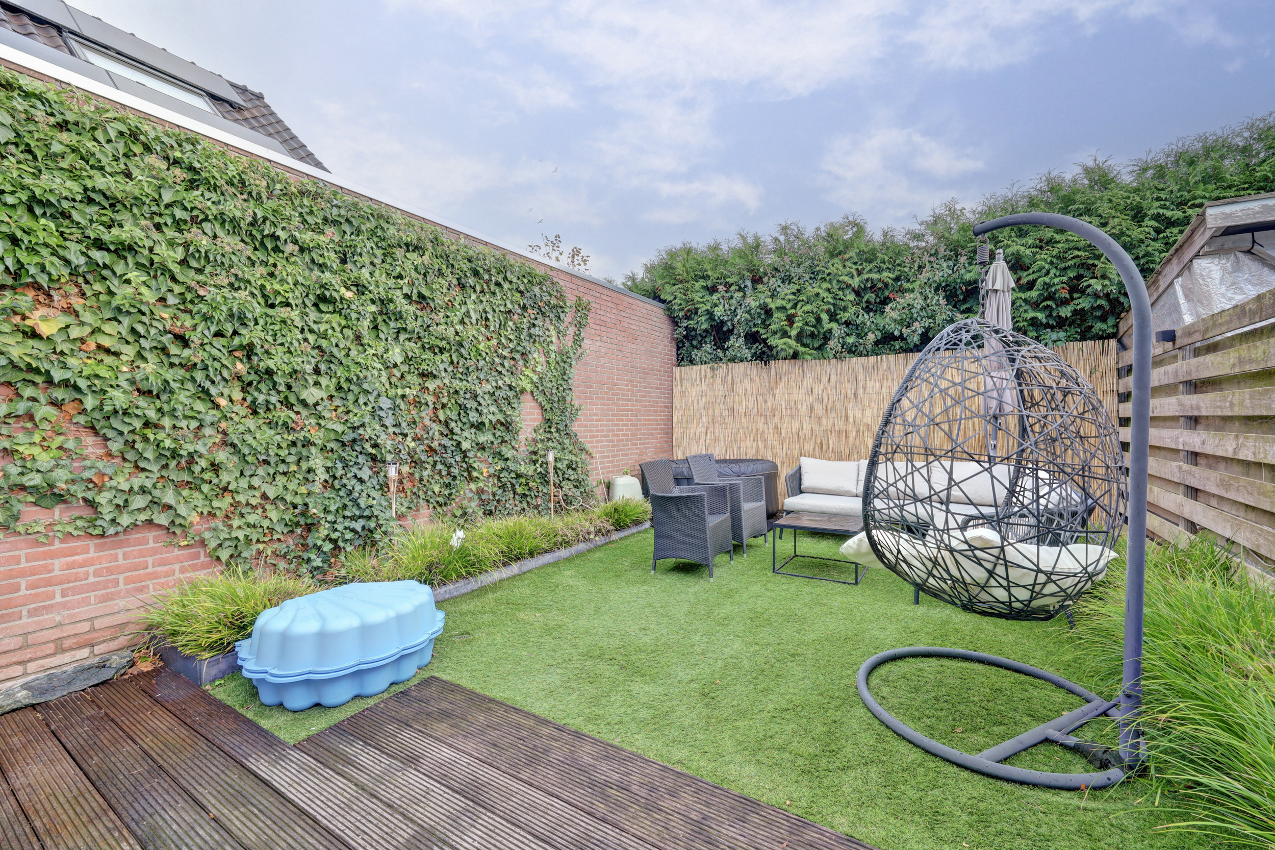 De achtertuin is net zo verzorgd, met een onderhoudsvriendelijk kunstgras en geïntegreerde tuinverlichting die uw tuin ’s avonds in een warme gloed hult. De onlangs geplaatste schutting, gemonteerd met duurzame Douglaspalen, siert de tuin en beschikt over verlichting die via een schemersensor tot leven komt.