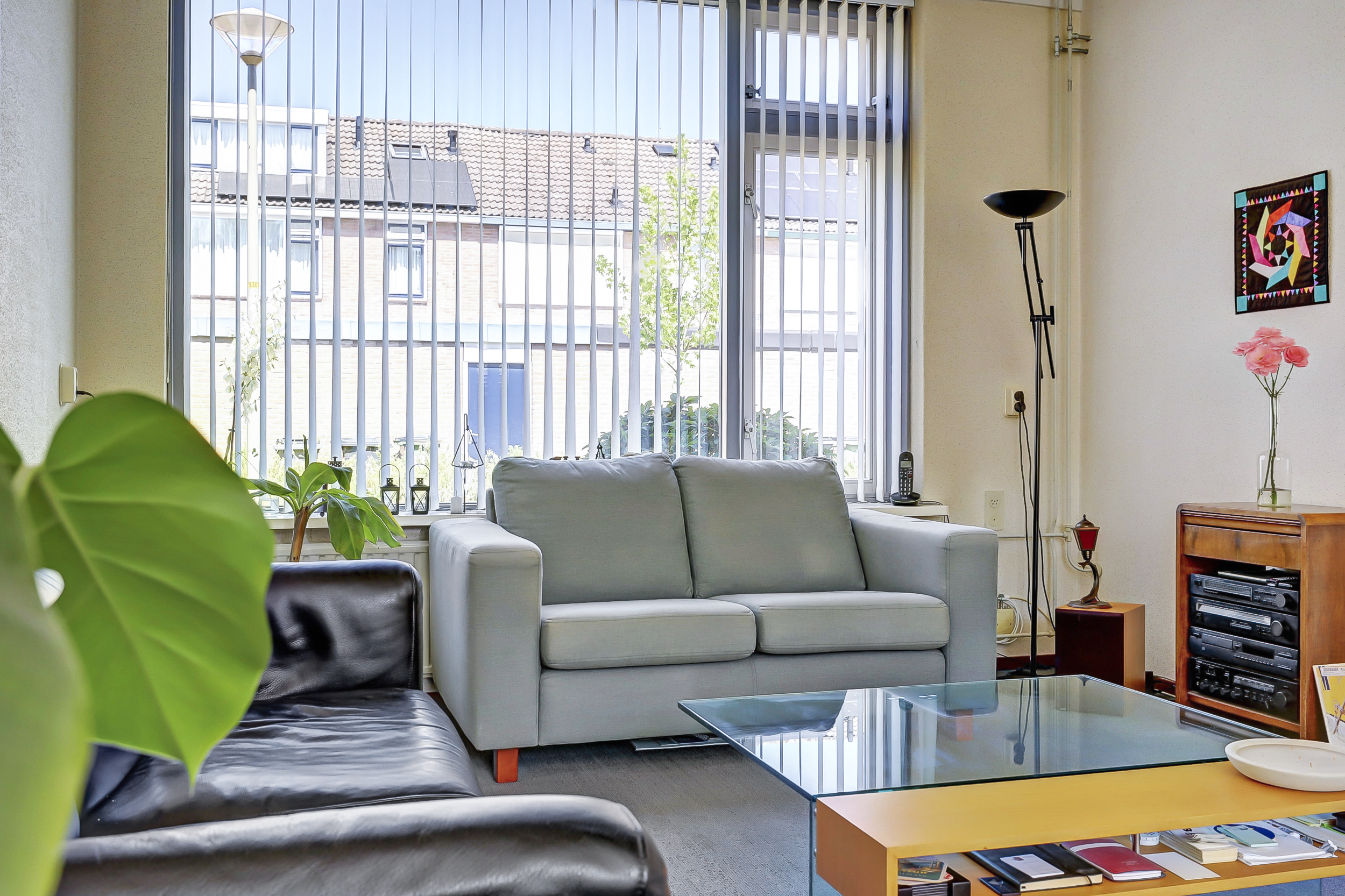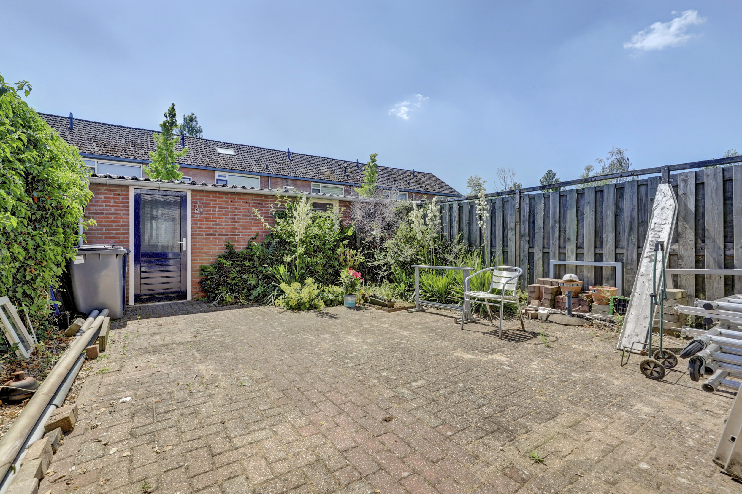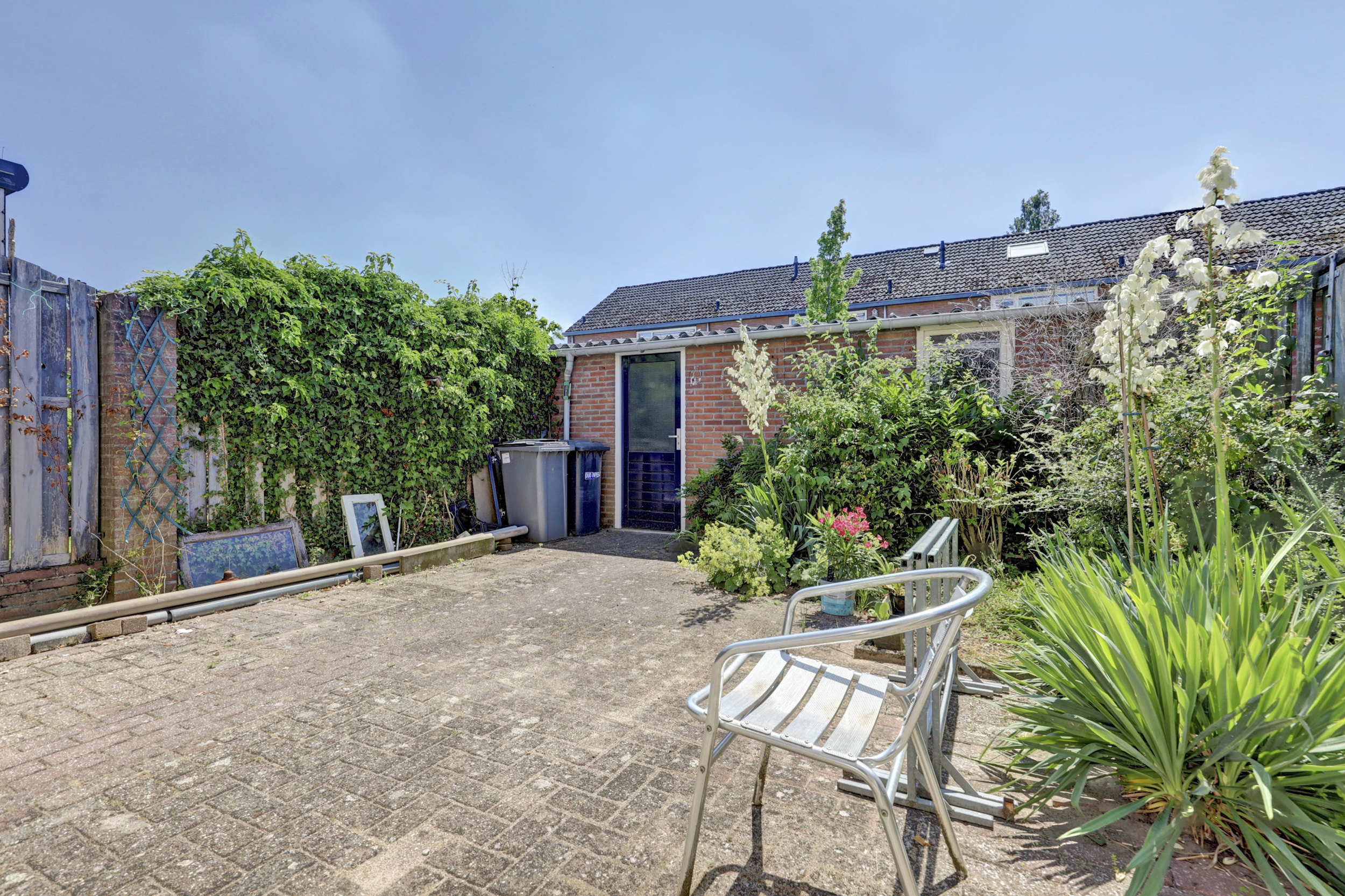 Terug beneden stap je via de keukendeur de onderhoudsvrije achtertuin in. Achterin staat een royale stenen berging over de volledige breedte van de tuin, met toegang tot de achterom. Een elektrisch zonnescherm zorgt voor schaduw op zonnige dagen dankzij de gunstige ligging op het zuiden.