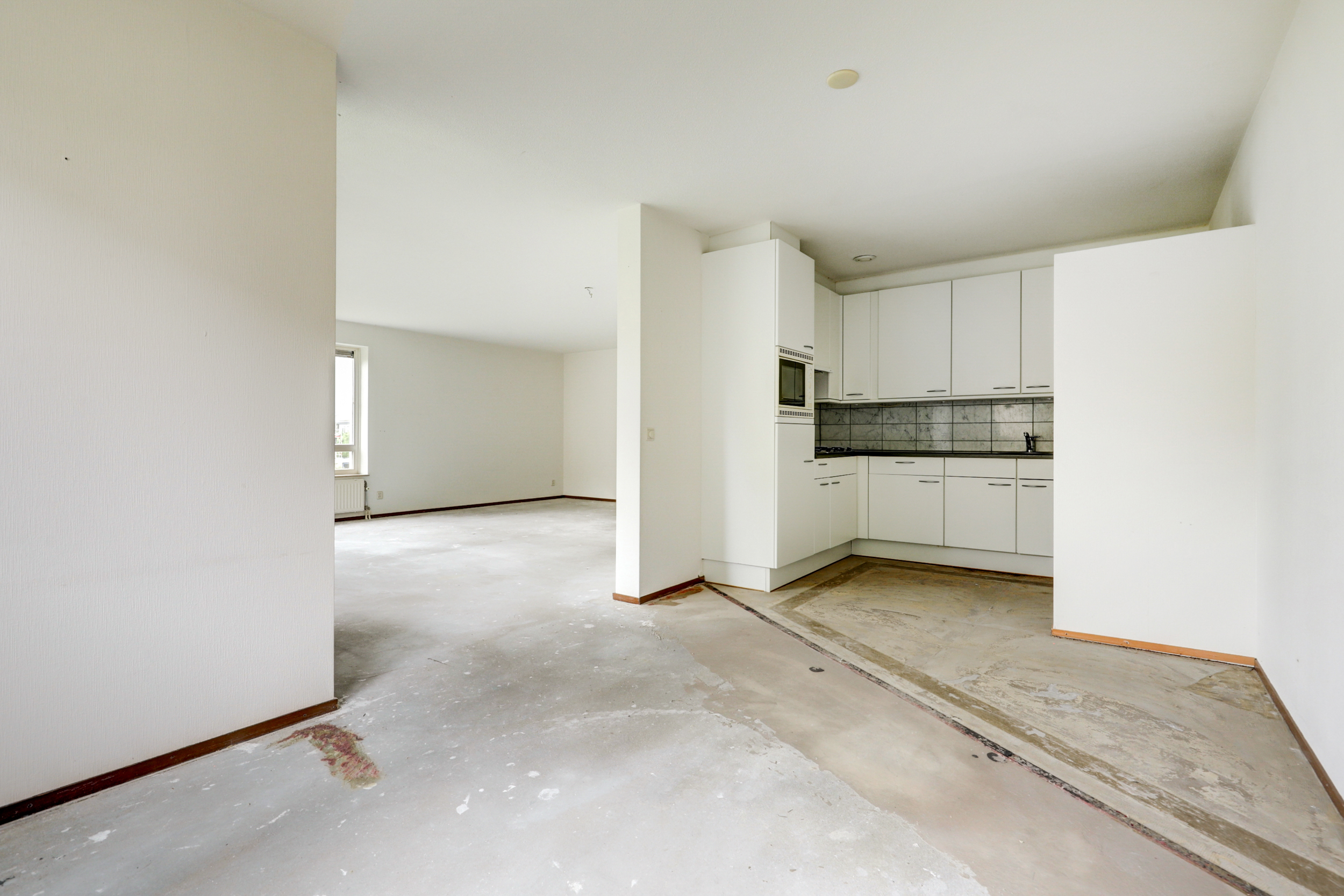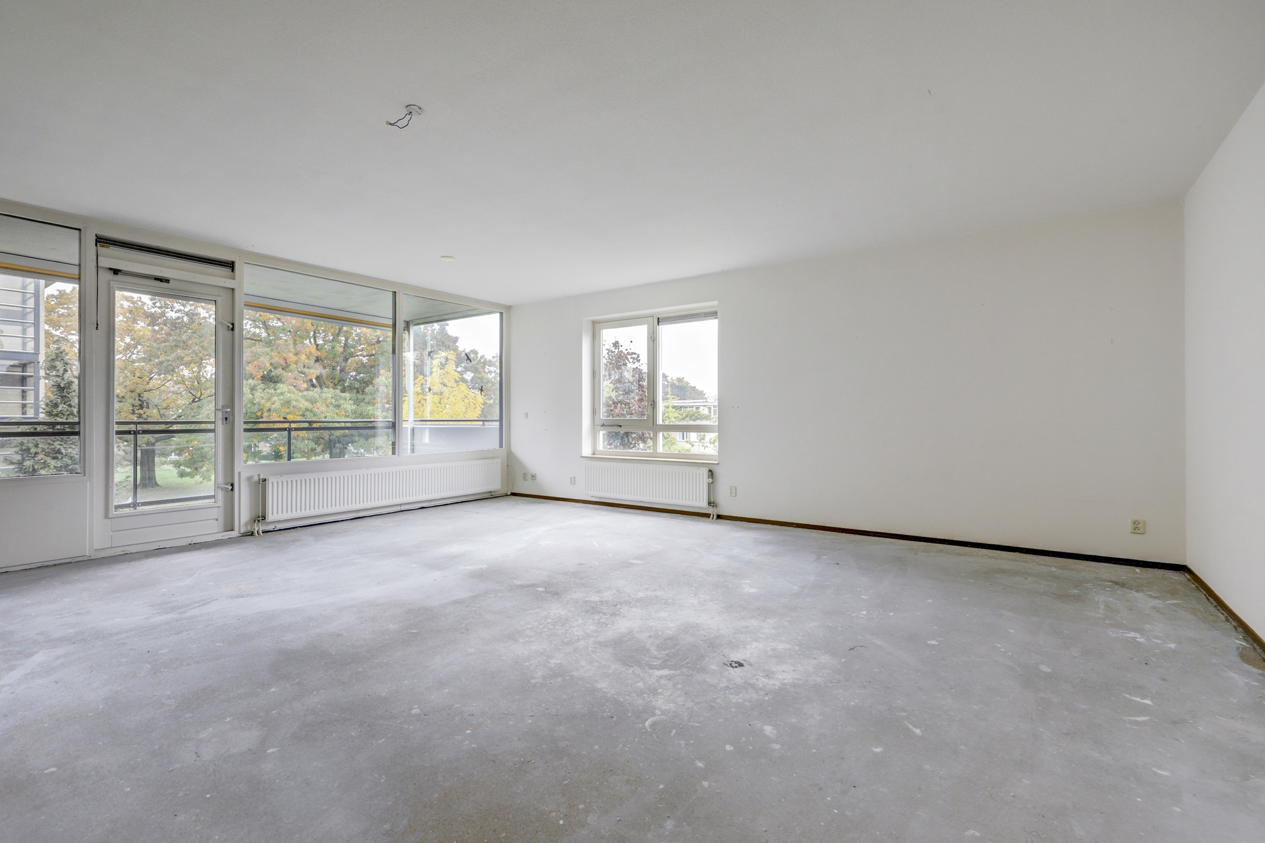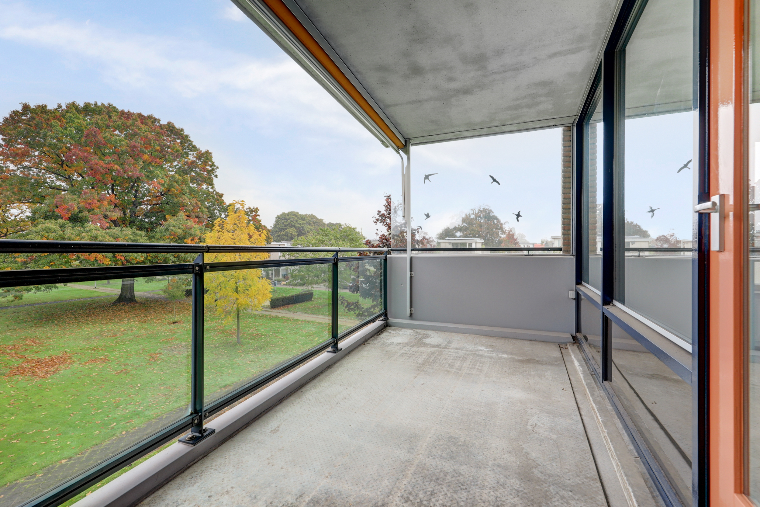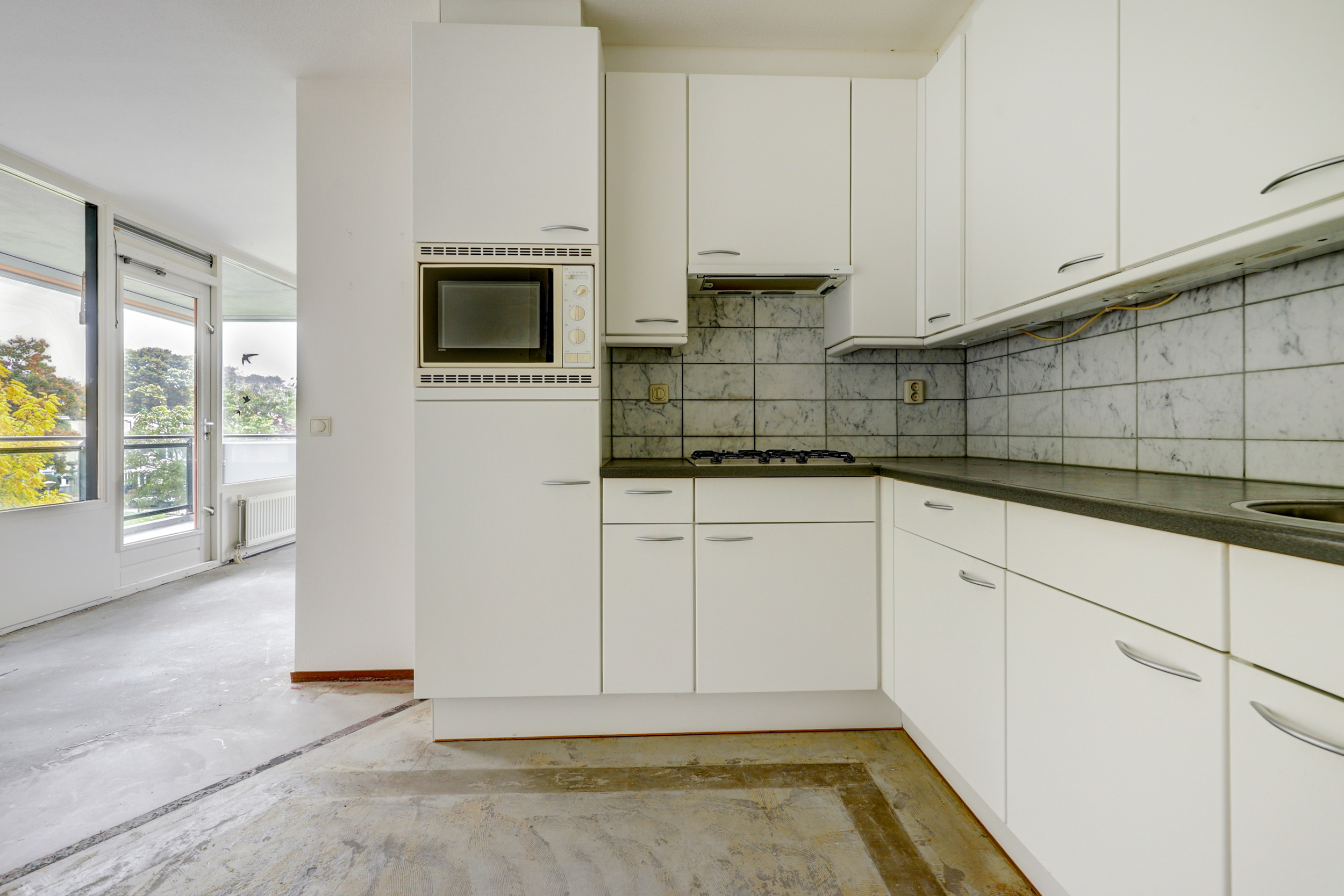 De lichte woonkamer geeft toegang tot het ruime balkon en tot de halfopen woonkeuken voorzien van diverse inbouwapparatuur. Er is plaats voor een ruime eettafel en door de grote raampartij is het ook hier weer erg licht; kortom een heerlijke plekje om gezellig te tafelen. Het vertoeven op het balkon is geen straf; je kunt genieten van een prachtig uitzicht over het park met de oude bomen.