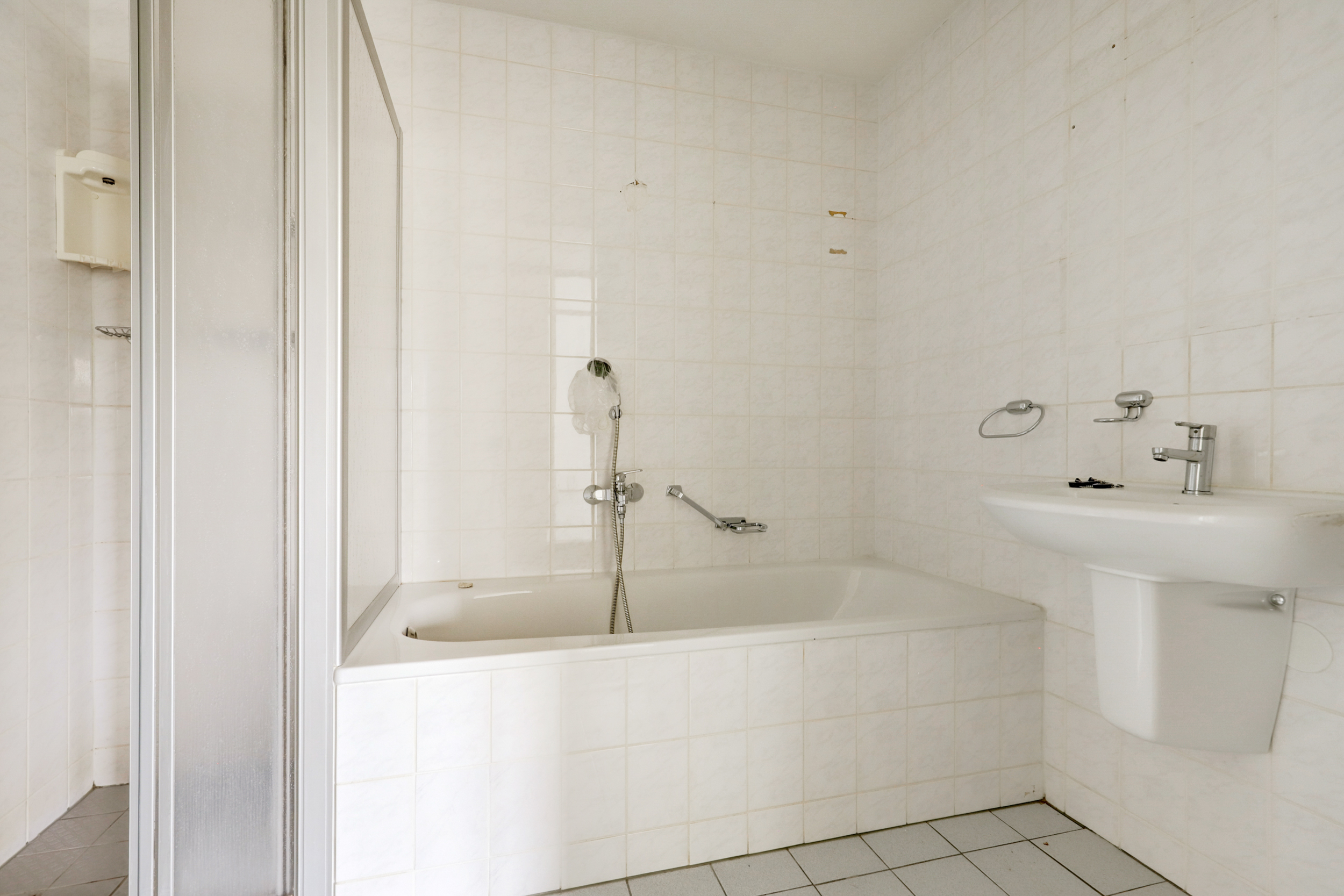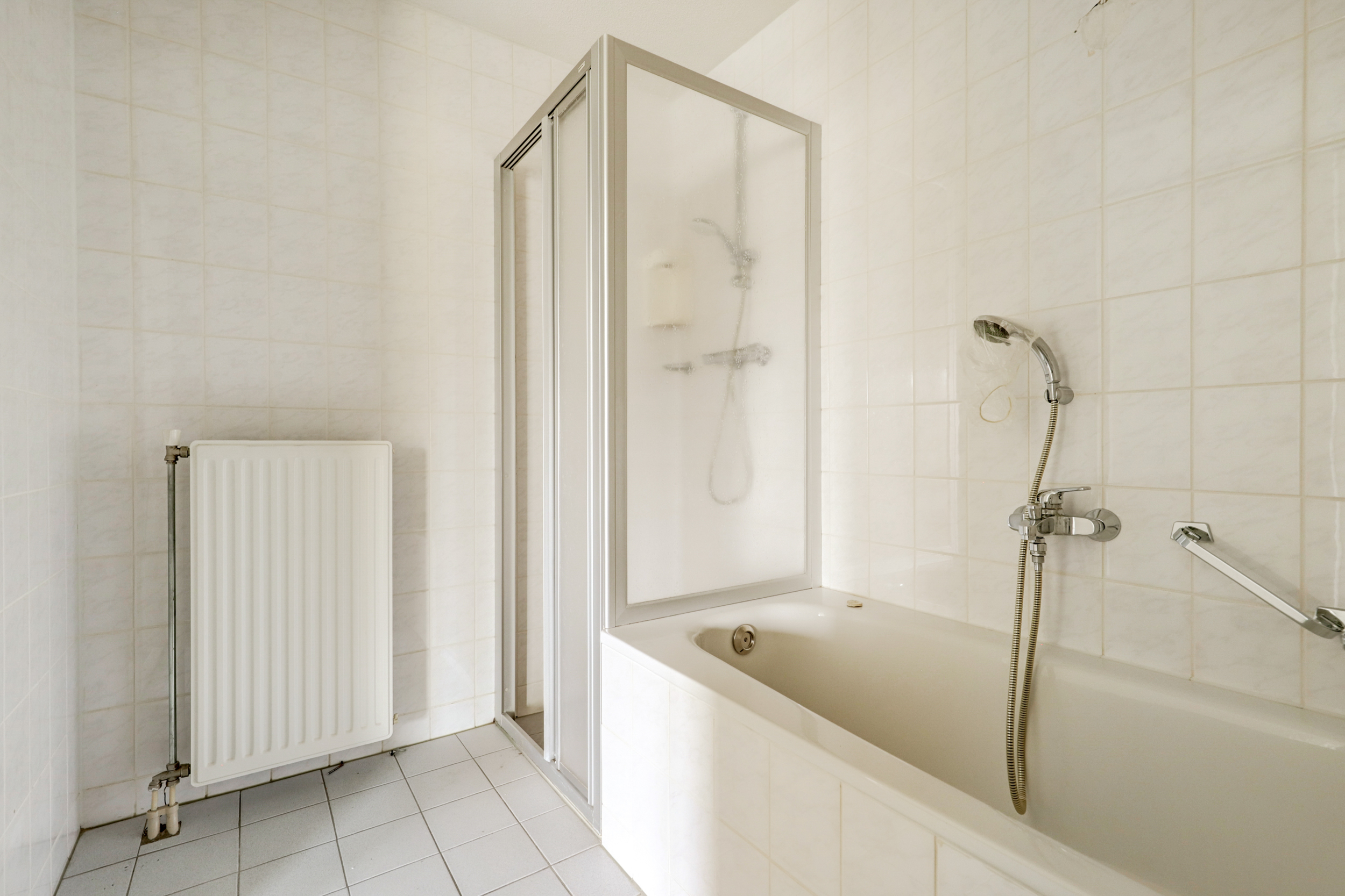 De badkamer is voorzien van een ligbad, douchecabine, wastafel met -meubel en een designradiator in een neutrale kleurstelling.