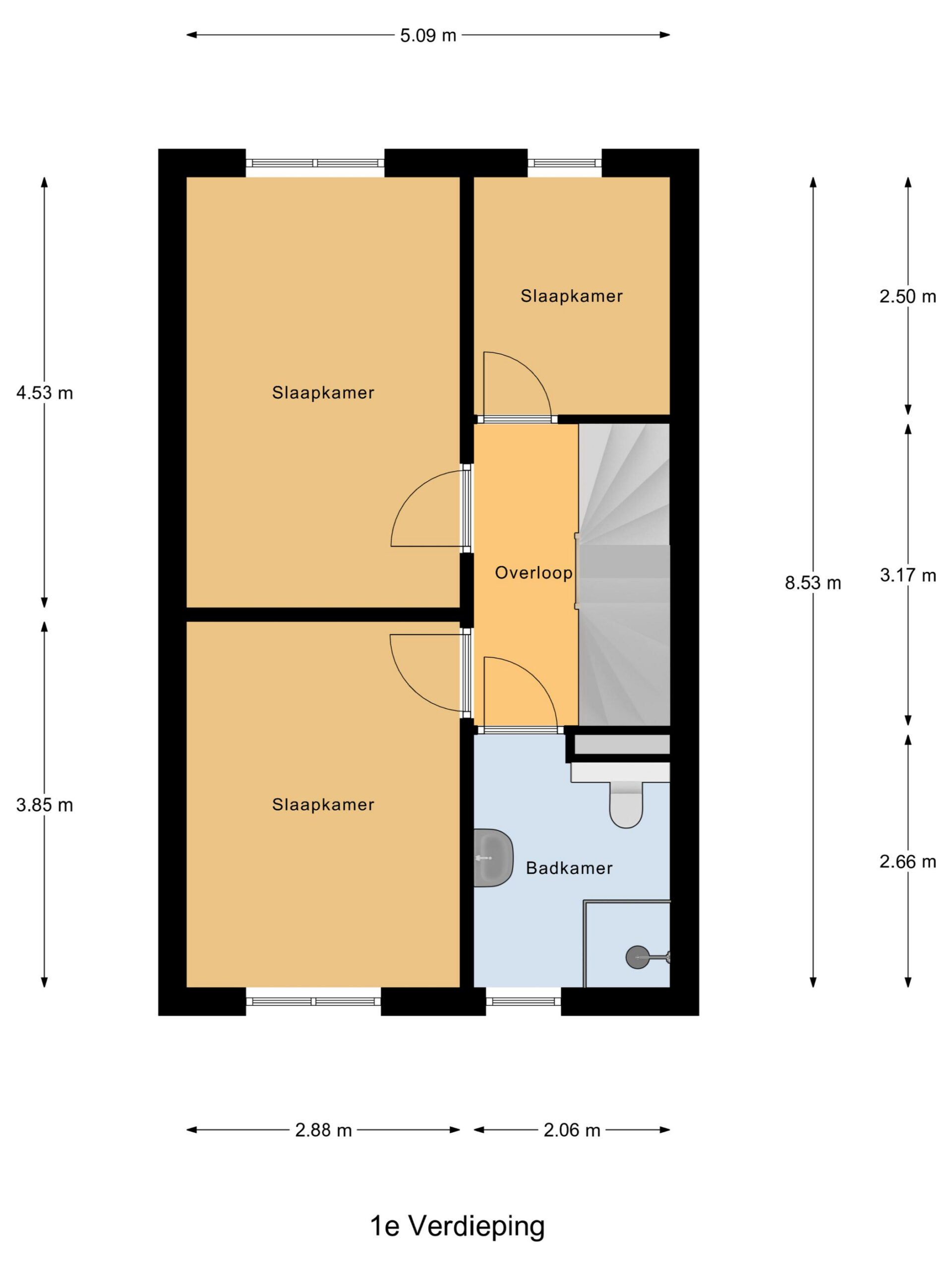 Op de eerste verdieping bevinden zich drie lichte slaapkamers en een complete badkamer met toilet, inloopdouche en een dubbele wastafel.
