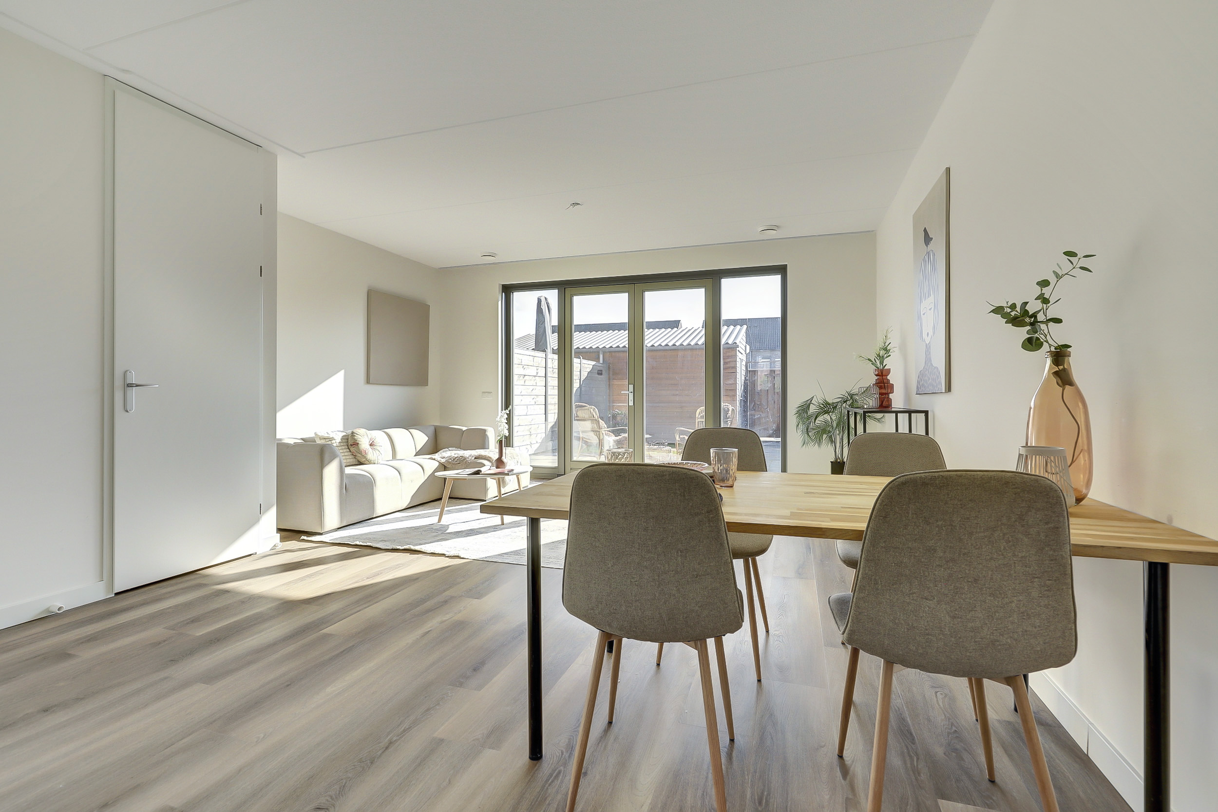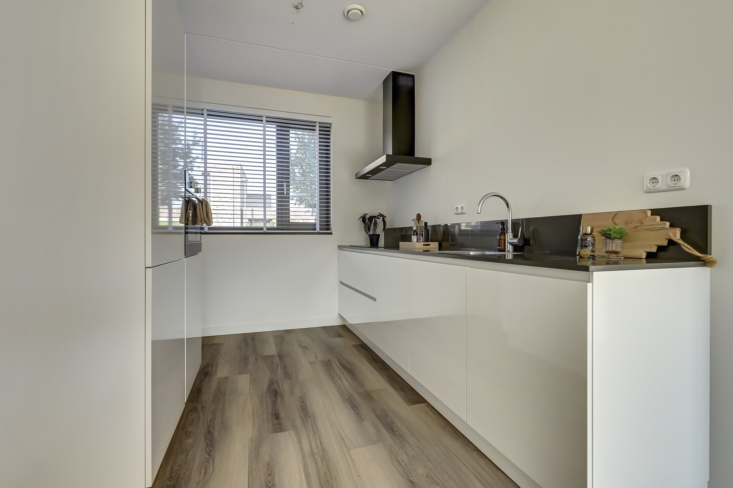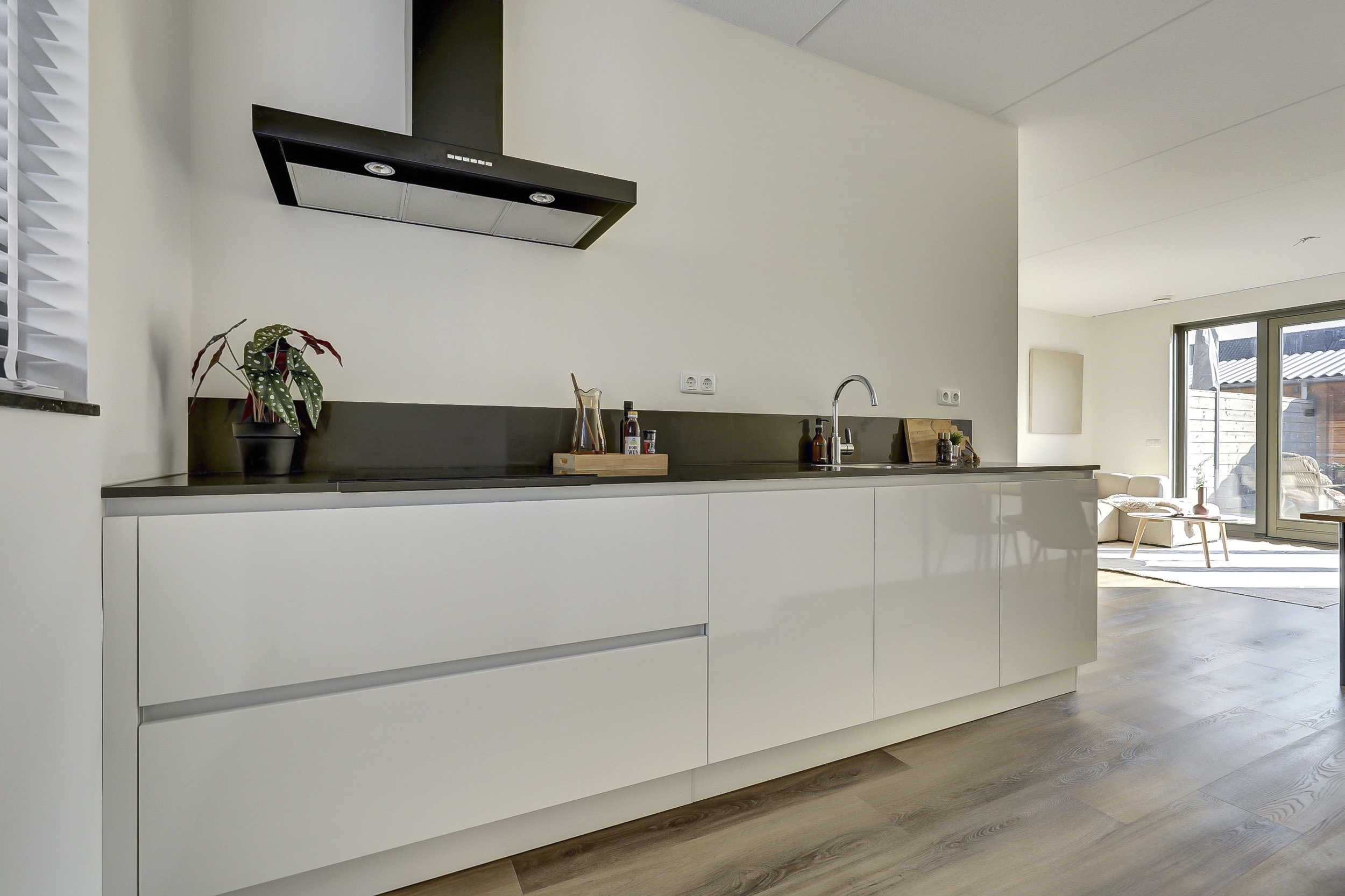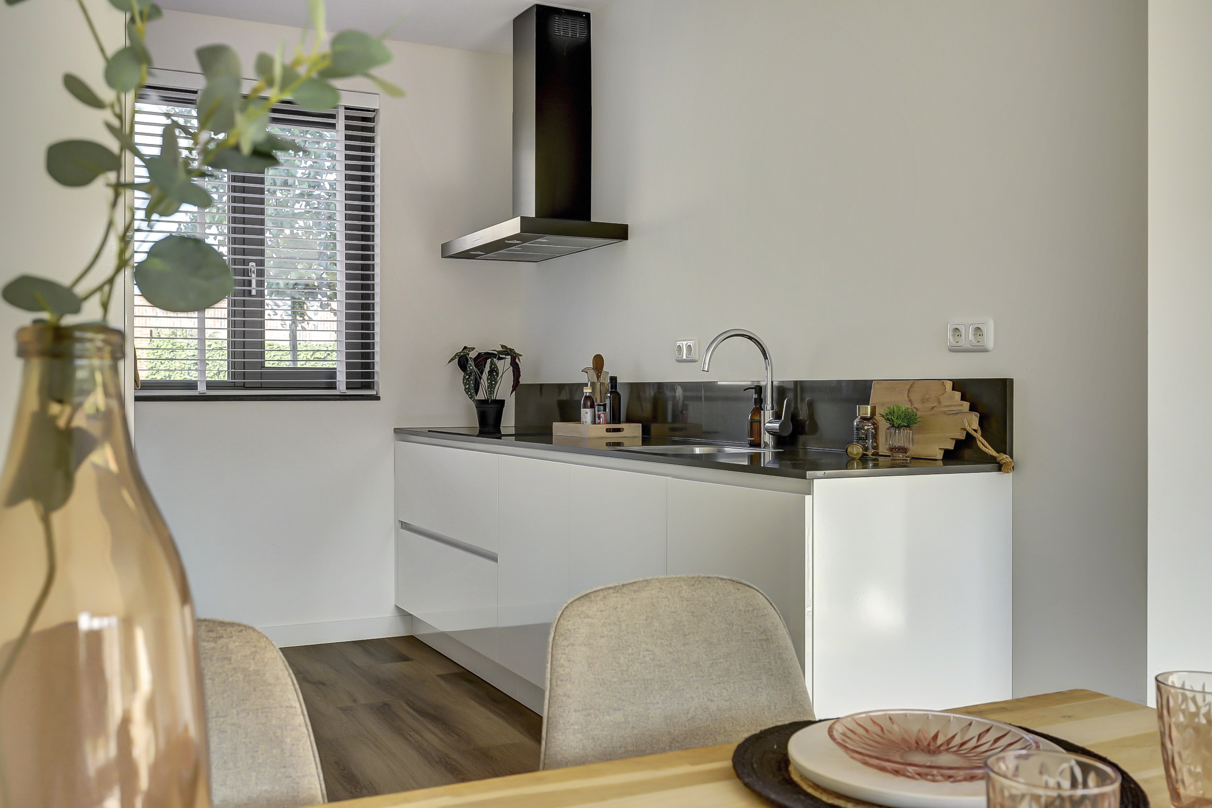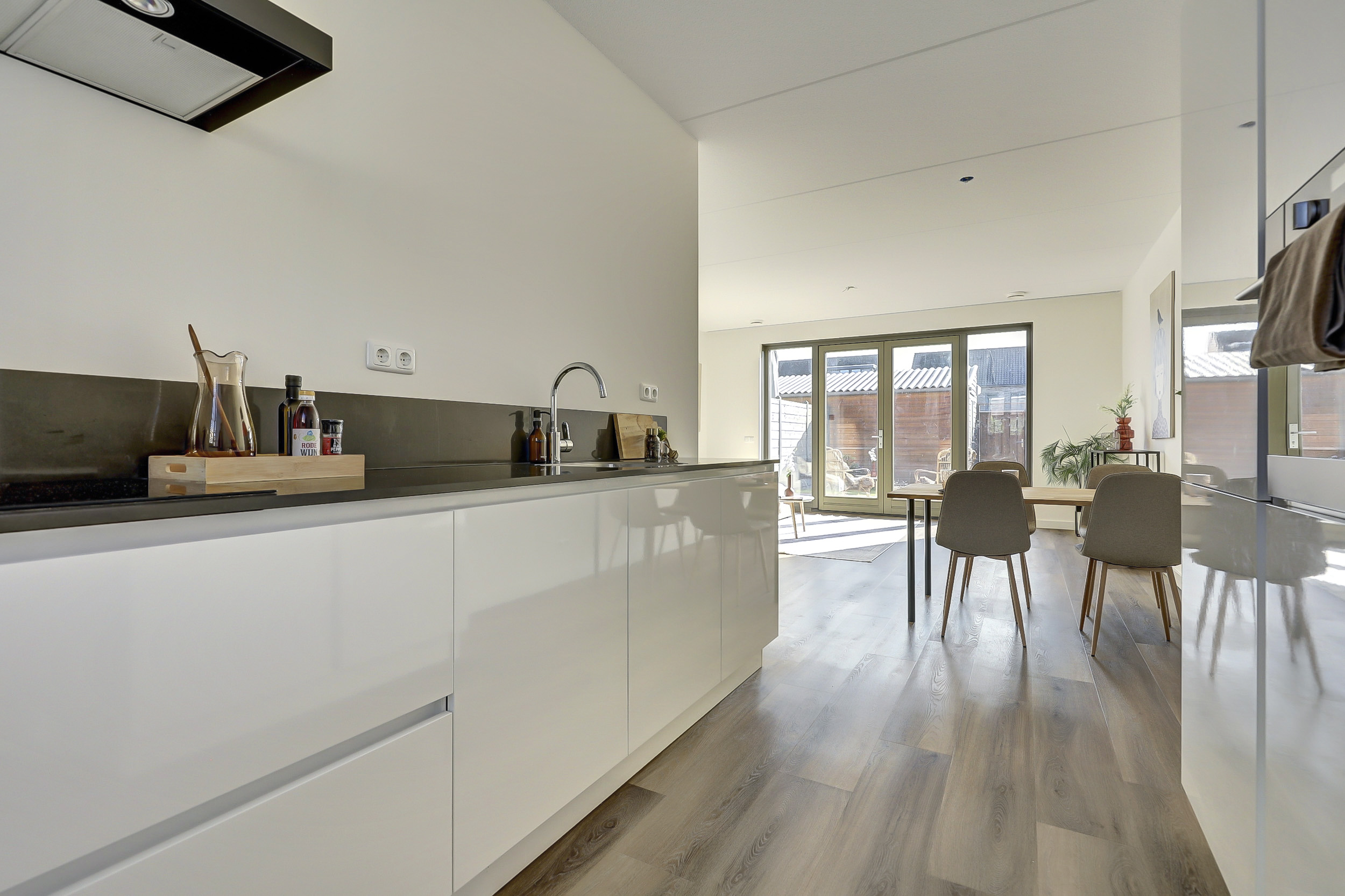 Je komt binnen in de hal met meterkast, toilet met fontein en een bergkast met de warmtepomp en elektrische boiler. De lichte woonkamer heeft openslaande deuren naar de achtertuin en een praktische trapkast met verdeler voor de vloerverwarming. De open keuken in dubbele wandopstelling is compleet uitgerust met een inductiekookplaat, combi-oven, koel-/vriescombi, vaatwasser, afzuigkap en een spoelbak – perfect voor kookliefhebbers!
