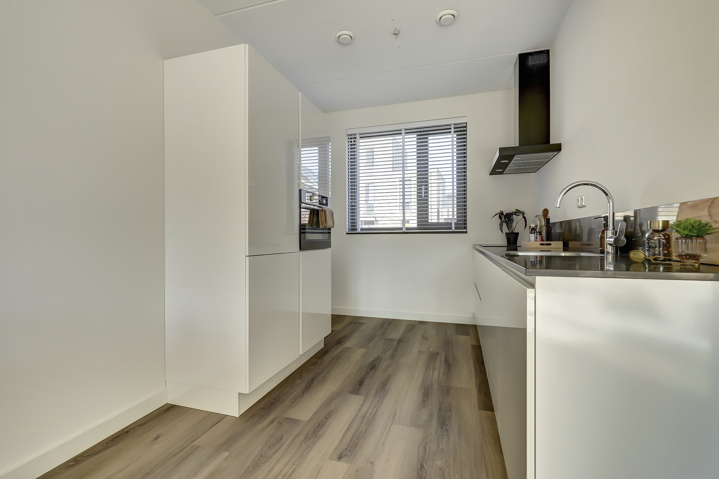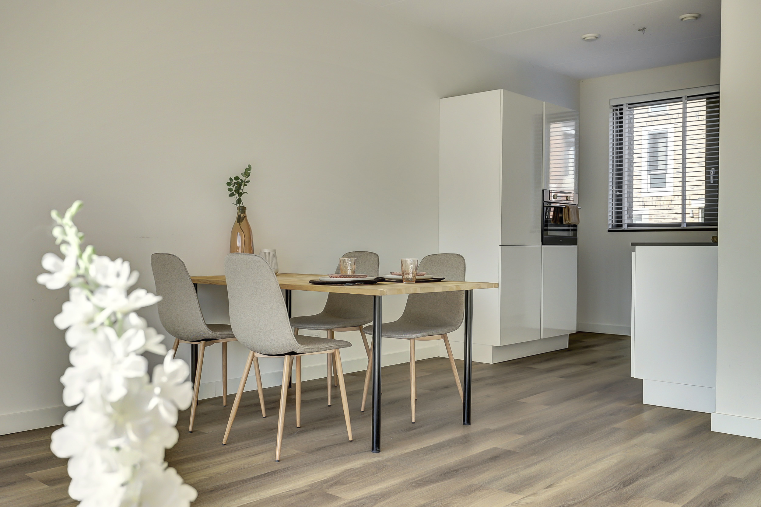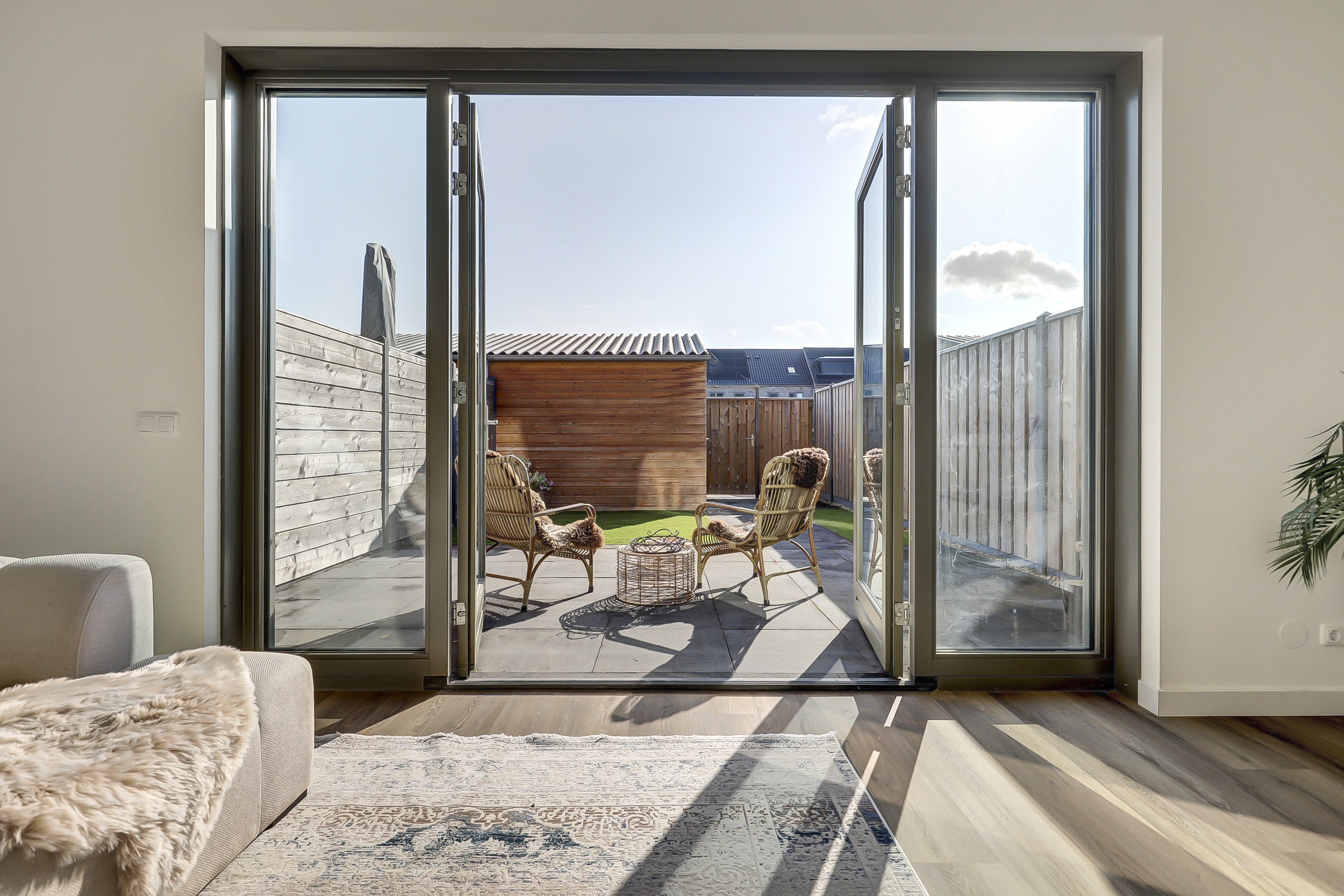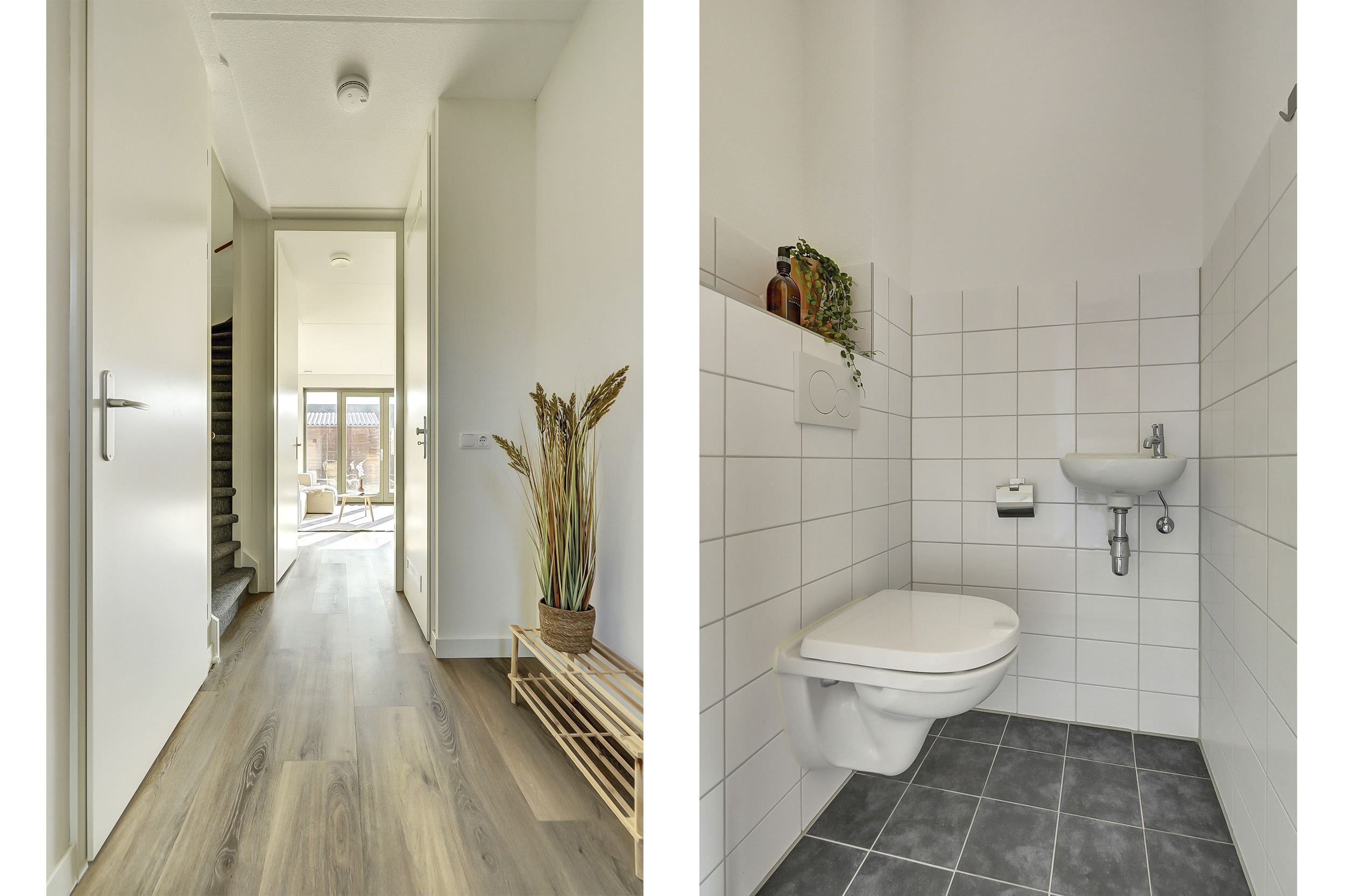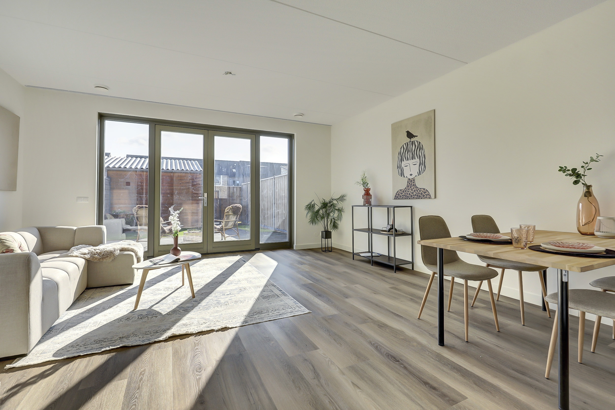 Je komt binnen in de hal met meterkast, toilet met fontein en een bergkast met de warmtepomp en elektrische boiler. De lichte woonkamer heeft openslaande deuren naar de achtertuin en een praktische trapkast met verdeler voor de vloerverwarming. De open keuken in dubbele wandopstelling is compleet uitgerust met een inductiekookplaat, combi-oven, koel-/vriescombi, vaatwasser, afzuigkap en een spoelbak – perfect voor kookliefhebbers!