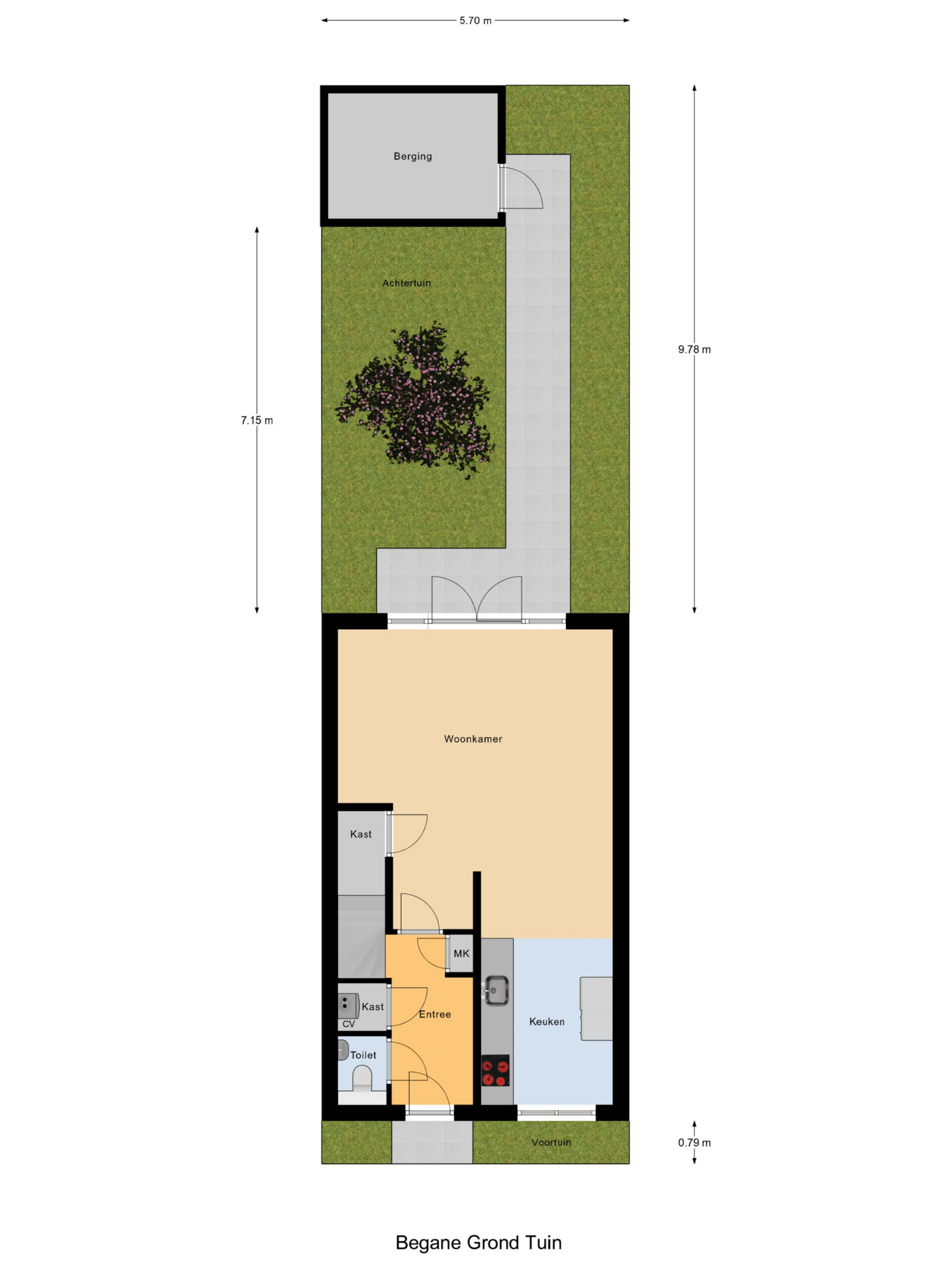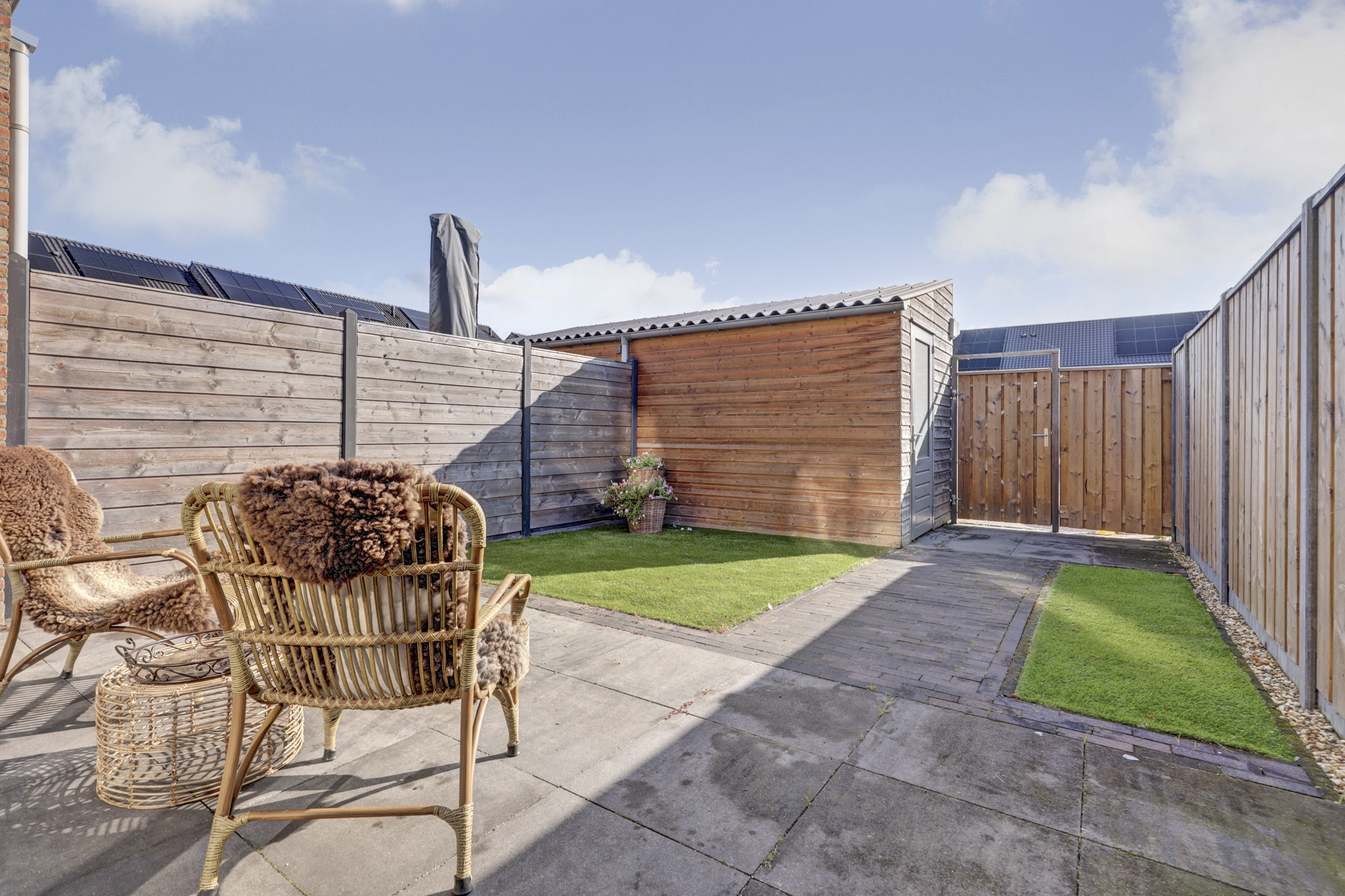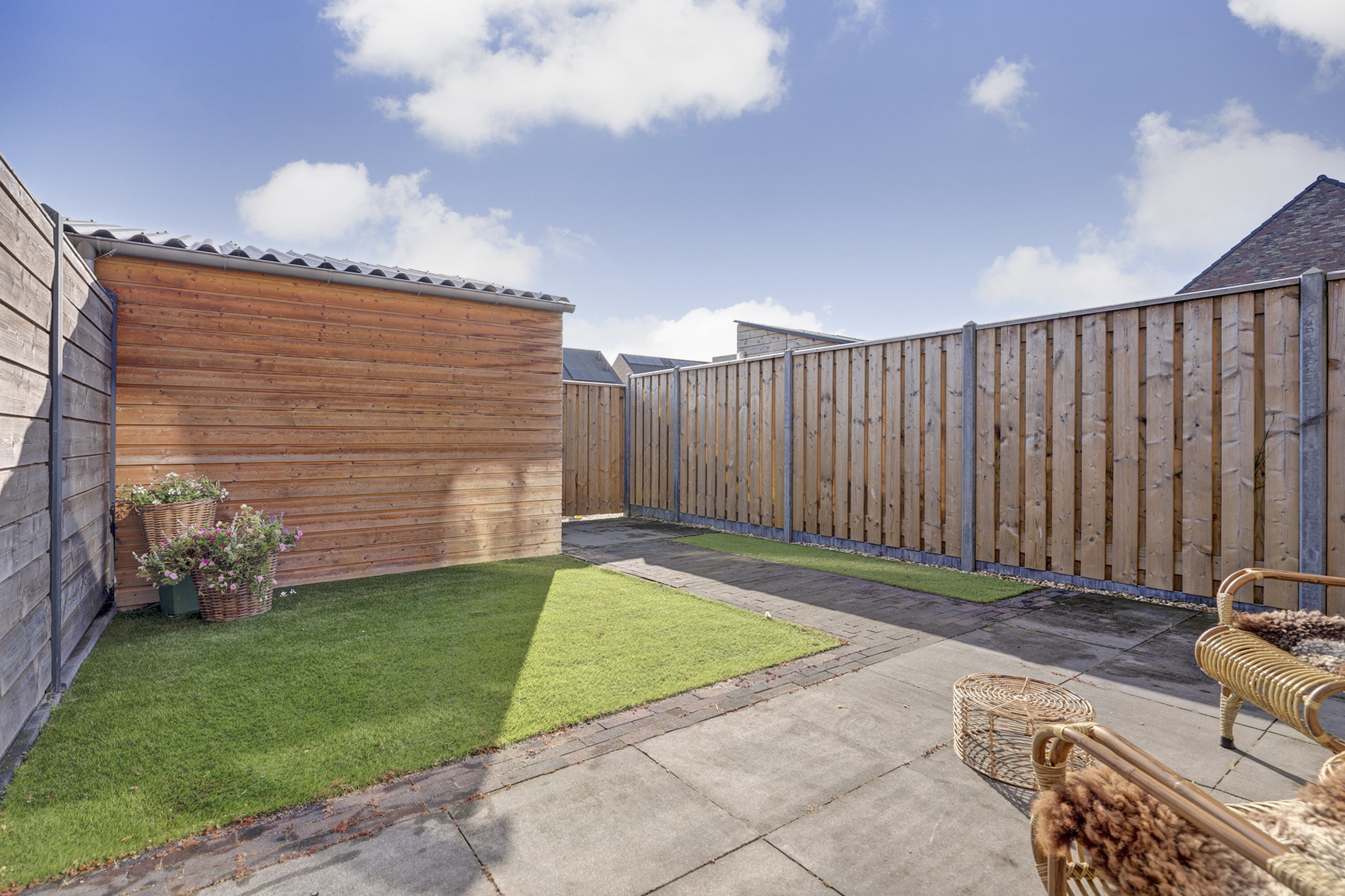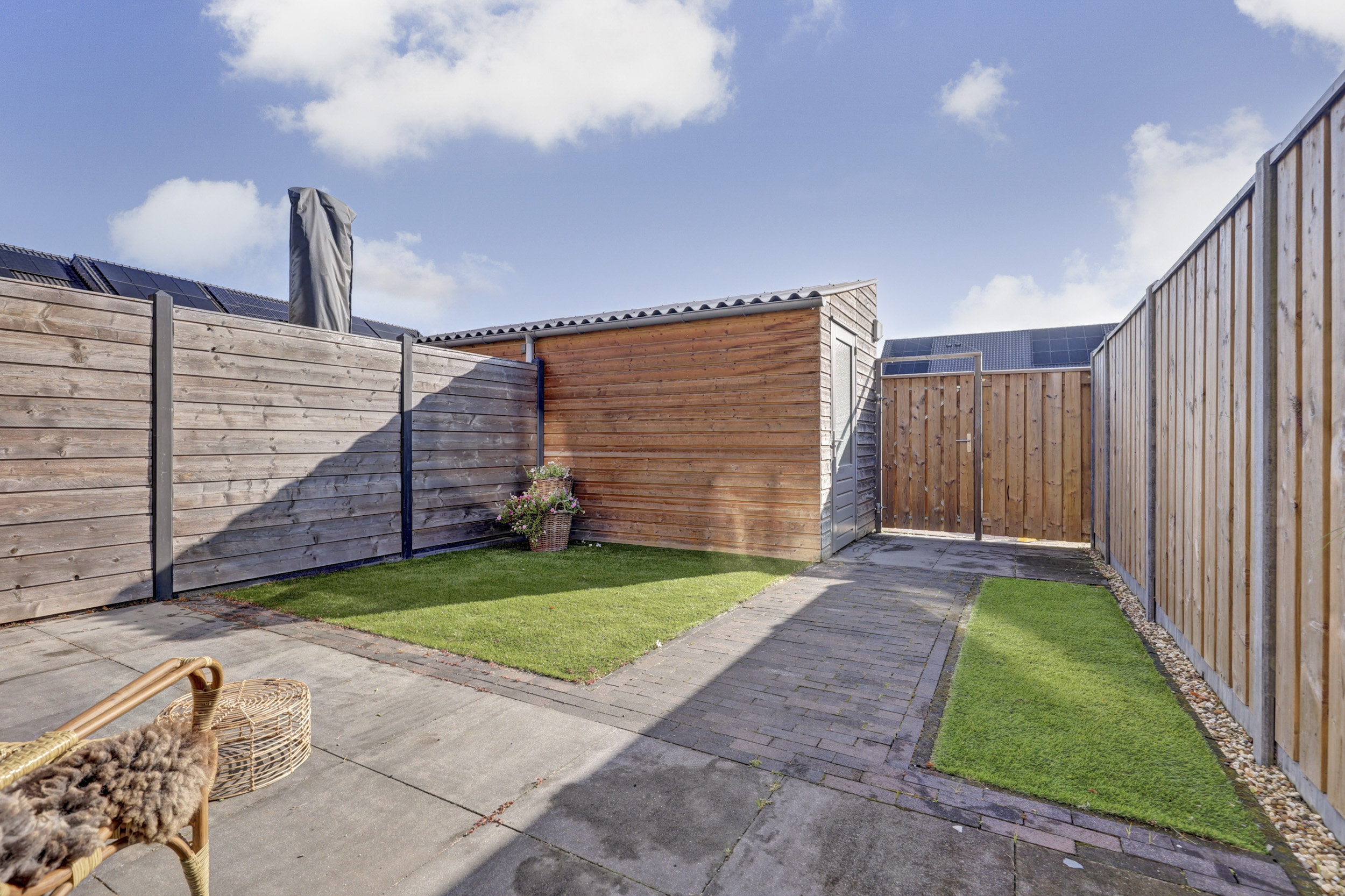 De achtertuin van circa 40 m² ligt op het oosten en is een heerlijke plek om ’s ochtends van de zon te genieten. De tuin is voorzien van een betegeld terras, een vrijstaande houten berging met elektra en een praktische achterom. Deze achterom leidt direct naar het gezamenlijke binnenterrein, waar je beschikt over een eigen privé-parkeerplaats. Op dit binnenterrein zijn daarnaast ook enkele gezamenlijke parkeerplaatsen beschikbaar. Dit terrein is in mandelig eigendom van de omwonenden; voor het gezamenlijk onderhoud wordt per 2025 een jaarlijkse bijdrage van € 150,- gevraagd.