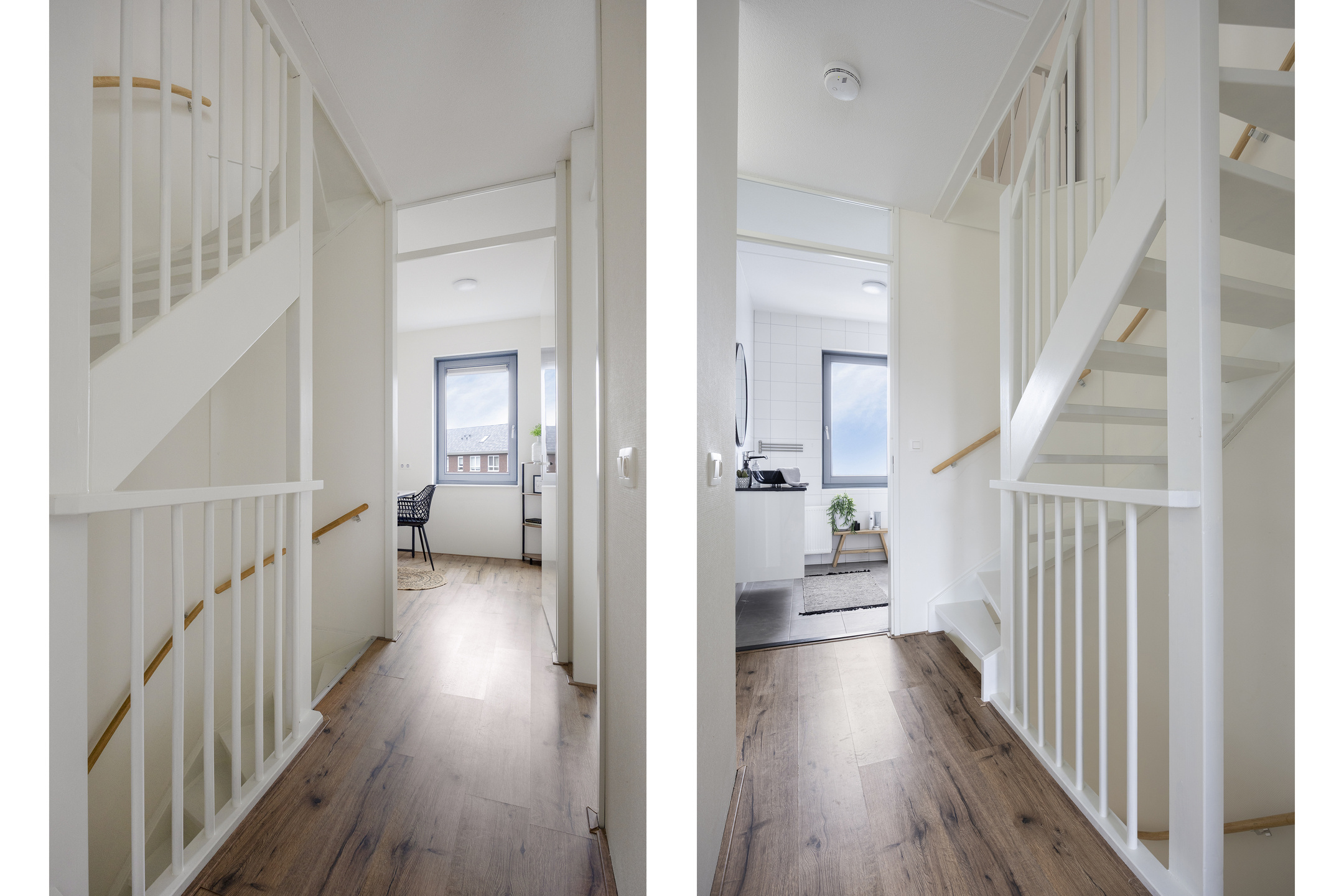 We komen binnen in de hal met trapopgang naar de eerste verdieping, toegang tot de meterkast, de nette toiletruimte en uiteraard de woonkamer.