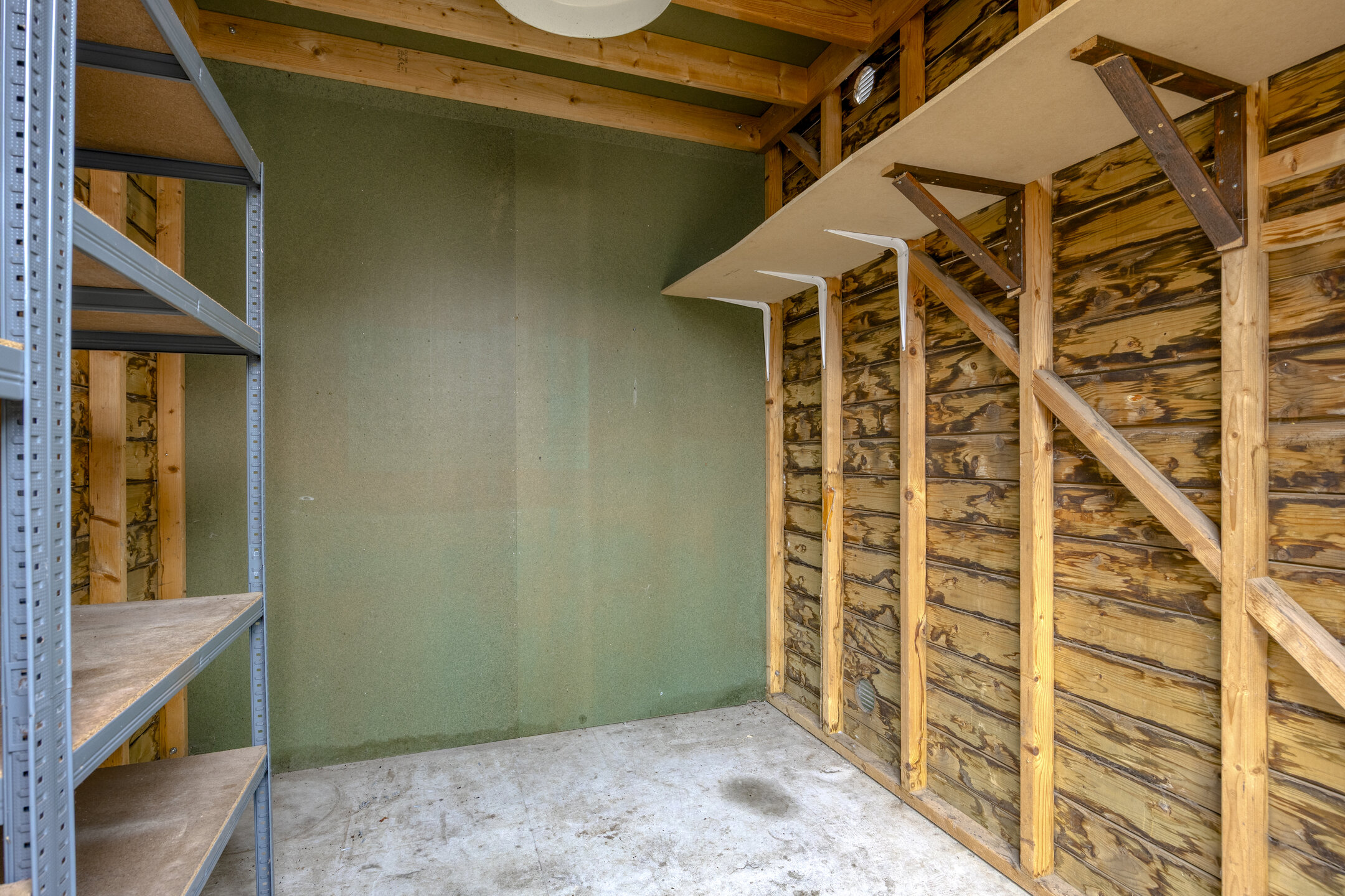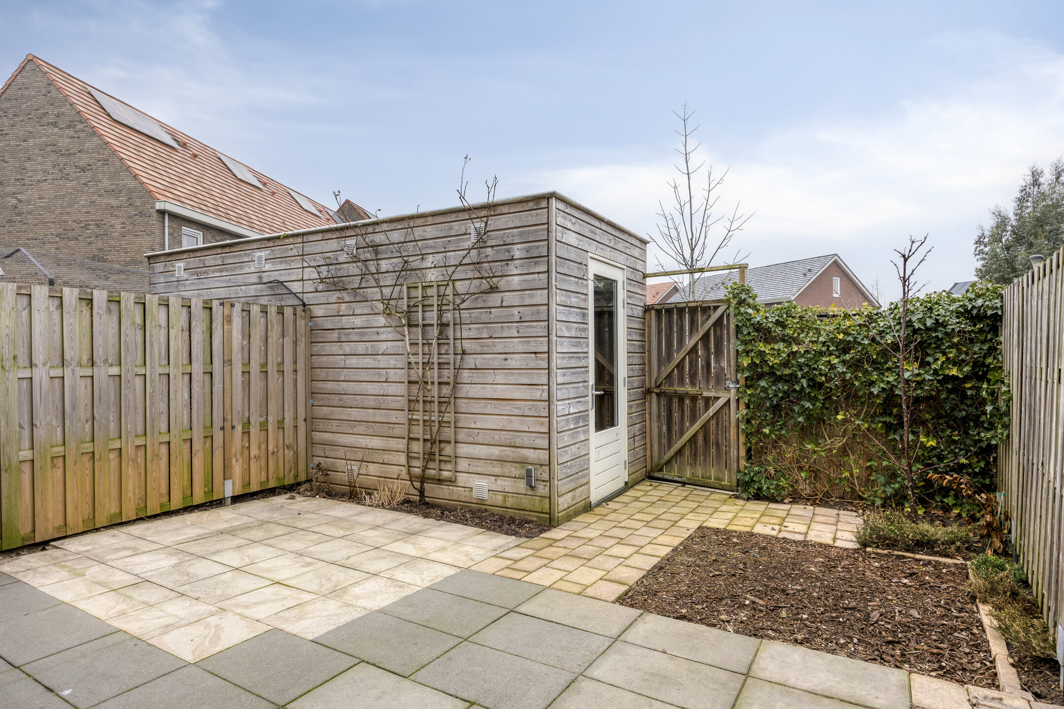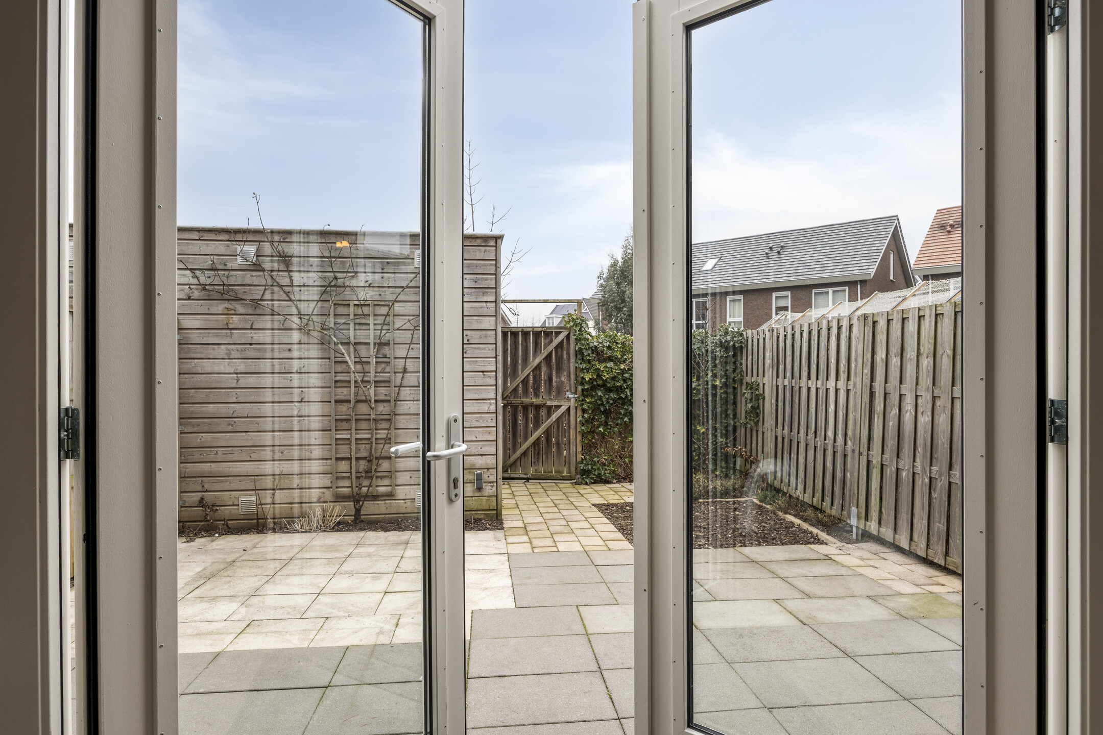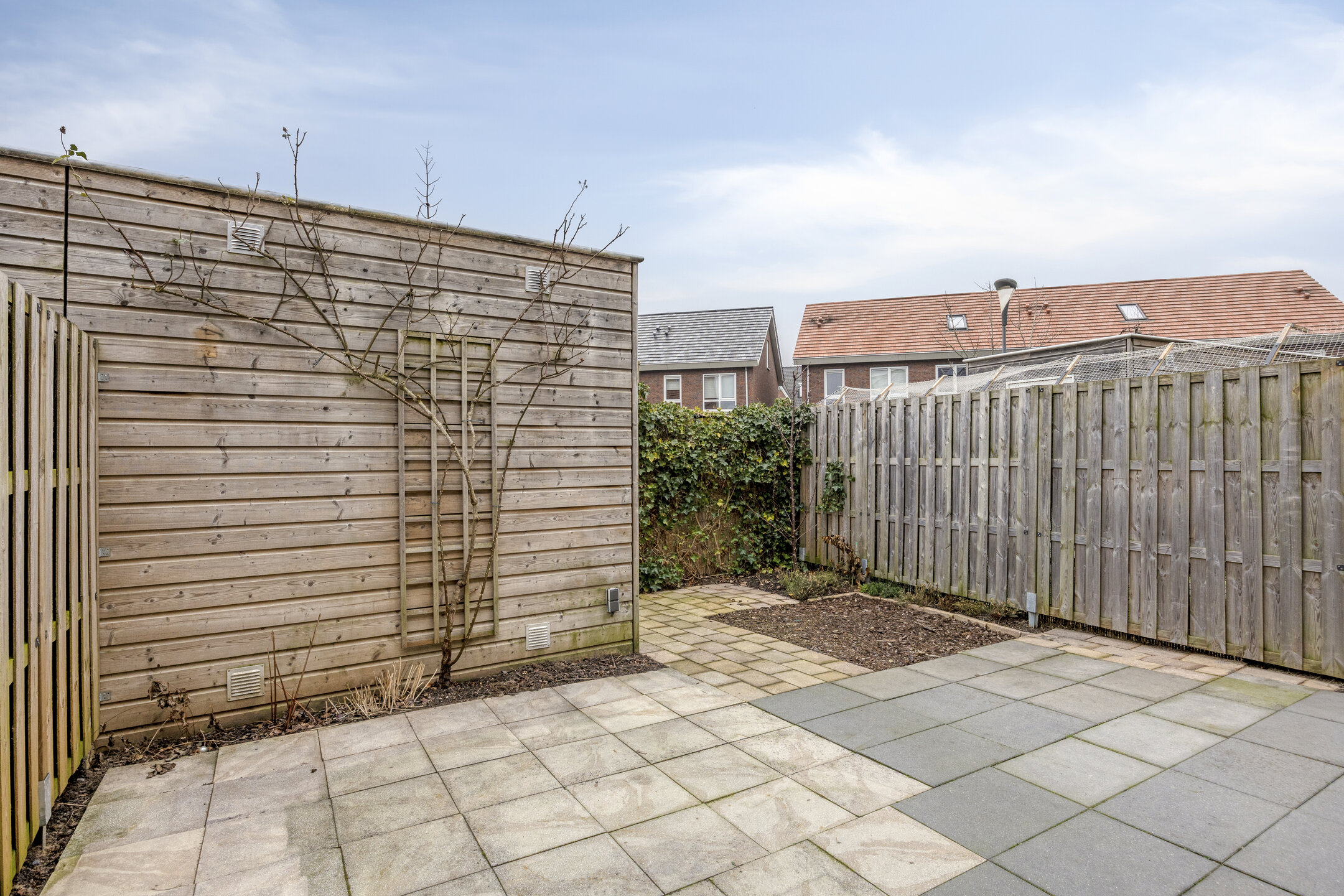 Aan de achterzijde van de woonkamer is plek voor een fijne zithoek met zicht op de tuin. De openslaande deuren kun je op een mooie dag lekker open zetten. De tuin is gelegen op het zuidwesten waardoor je de hele middag en avond in het zonnetje kunt zitten. De afstand tot de achterburen is groot door de aanwezigheid van een parkeerplein. Hierdoor heb je geen directe inkijk; wel zo fijn als je in de tuin zit. Dit parkeerplein biedt een eigen parkeerplek. De houten berging is handig voor de fietsen en tuinspullen.