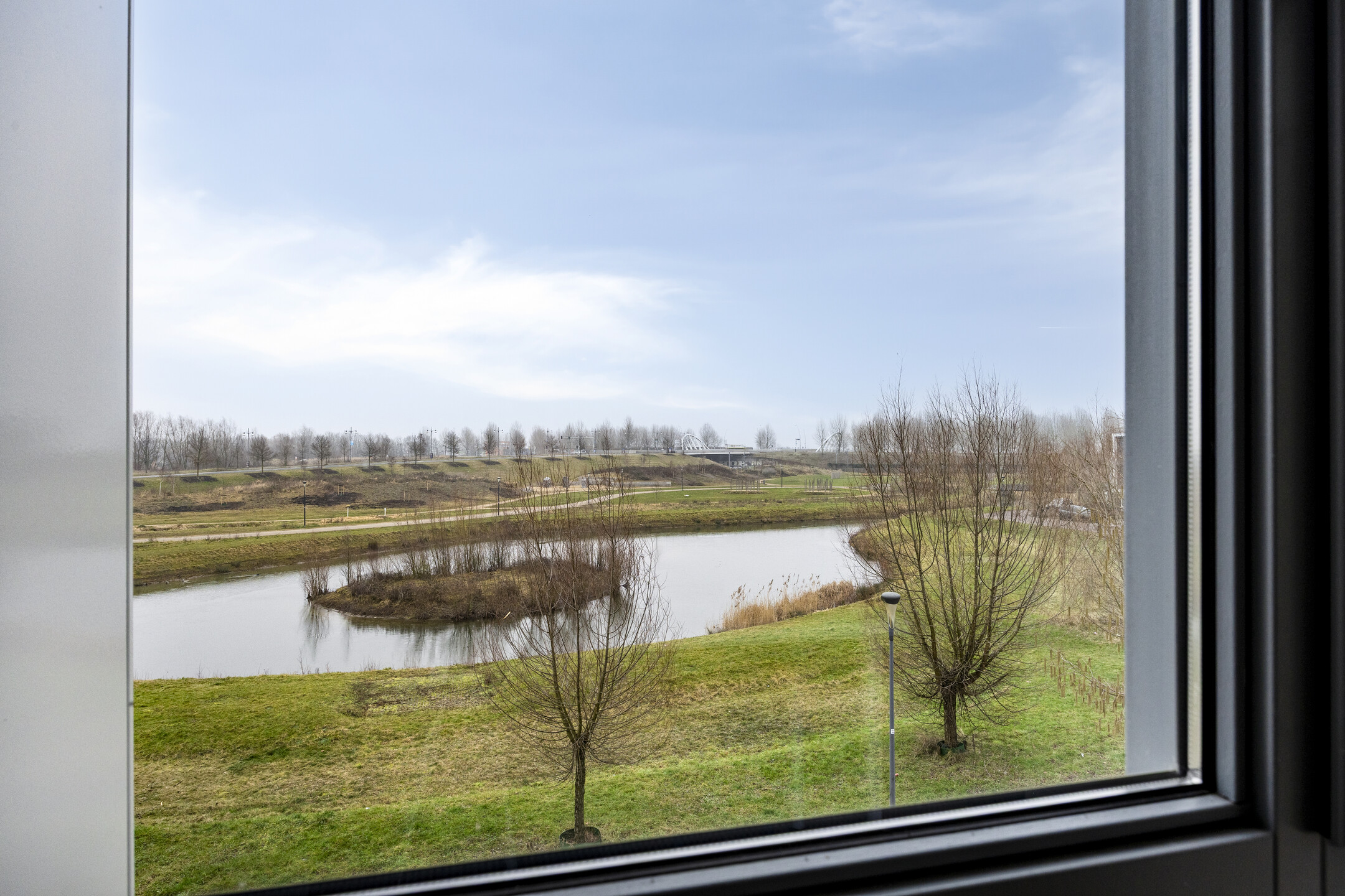 Aan de voorzijde van de woonkamer is de open keuken gesitueerd. De grote raampartijen zorgen niet alleen voor veel daglichttoetreding, maar ook voor een prettige kijk op het park tegenover de woning.