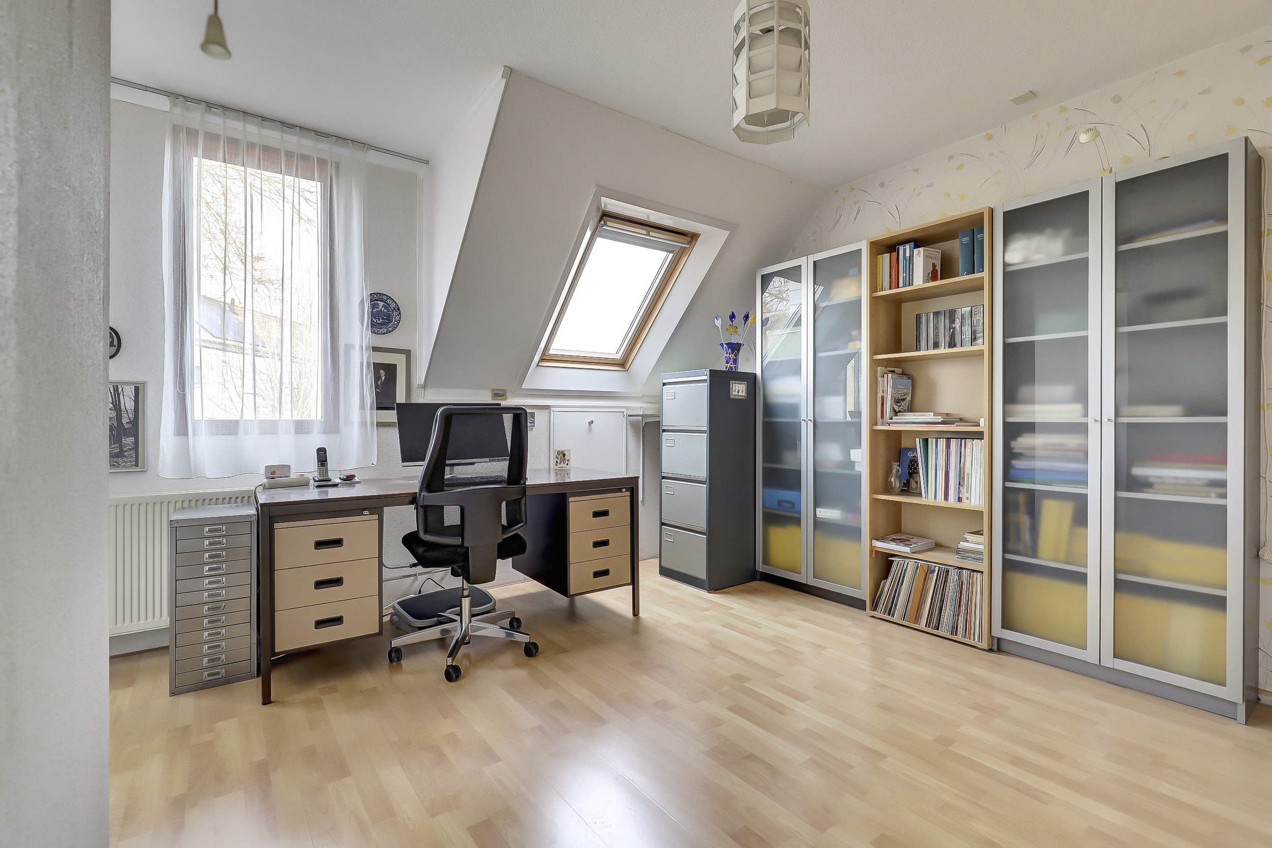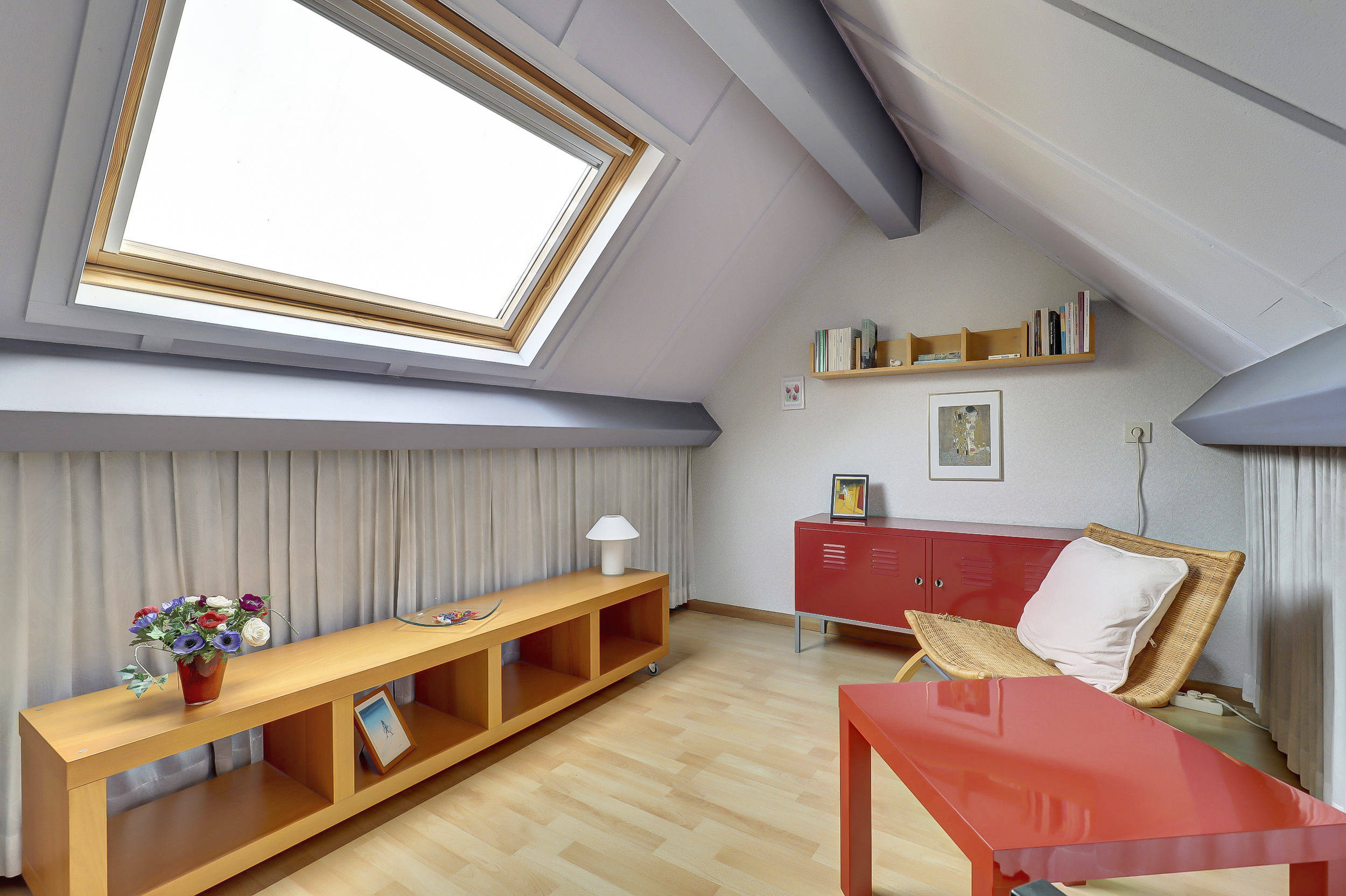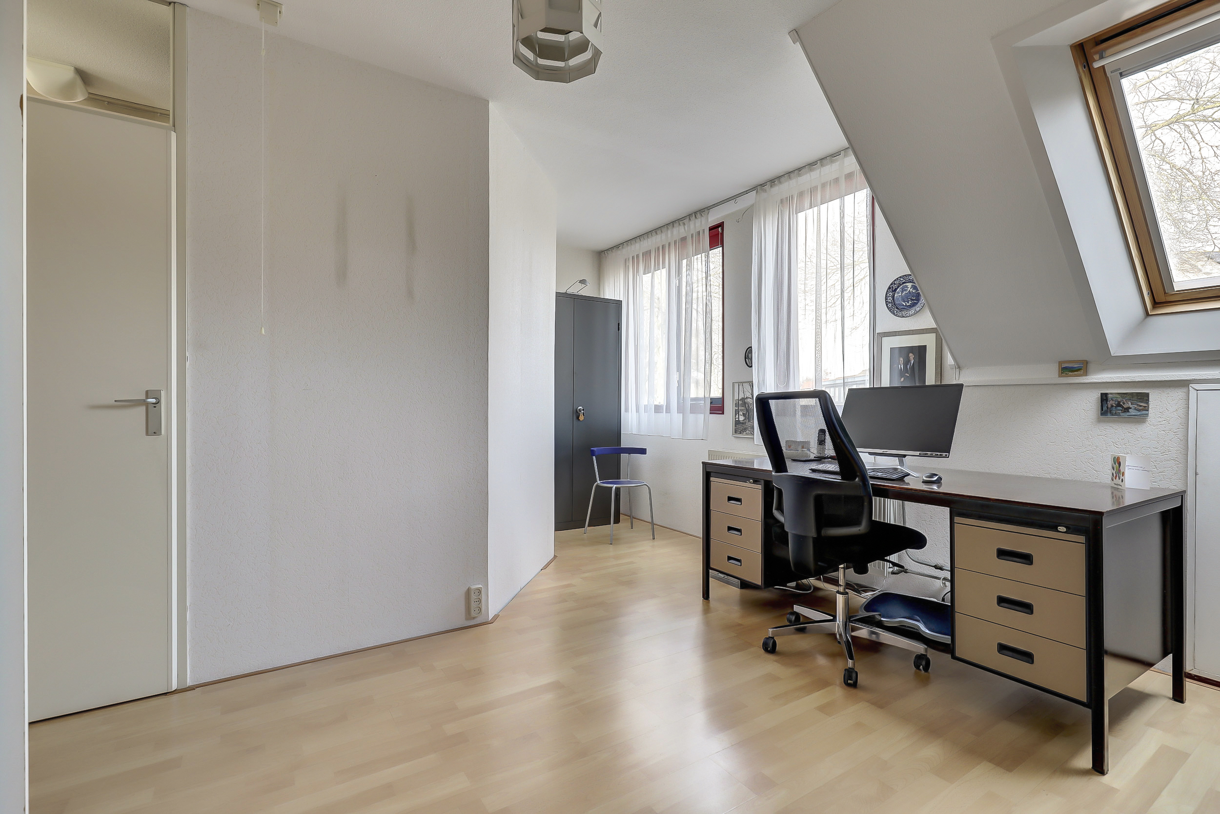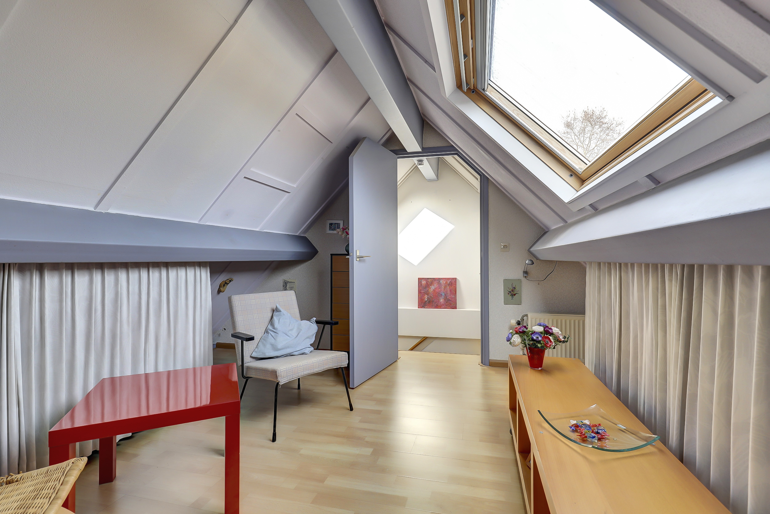 Op de tweede verdieping vind je nog extra kastruimte en een derde slaapkamer. Dankzij het grote dakraam valt er hier heerlijk veel daglicht naar binnen, wat de ruimte een lichte en prettige sfeer geeft. Ideaal als extra slaapkamer, werkplek of hobbyruimte.