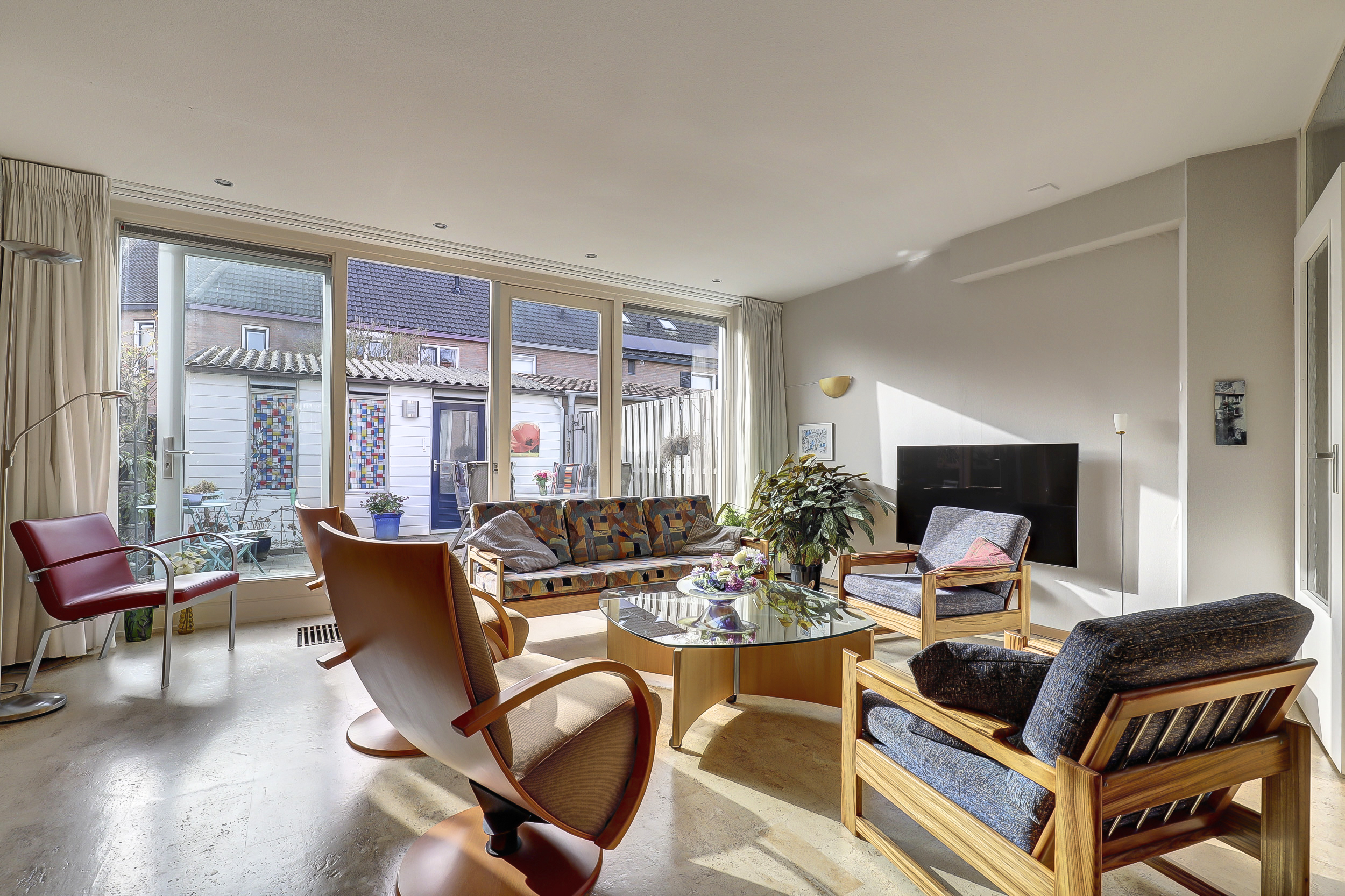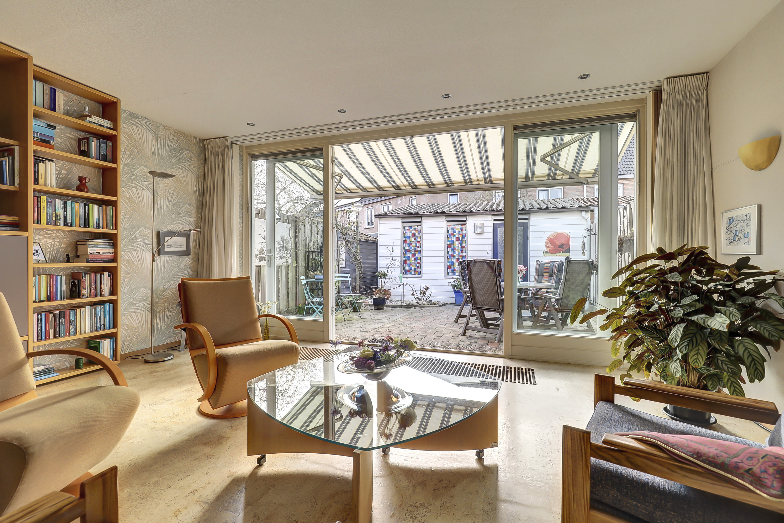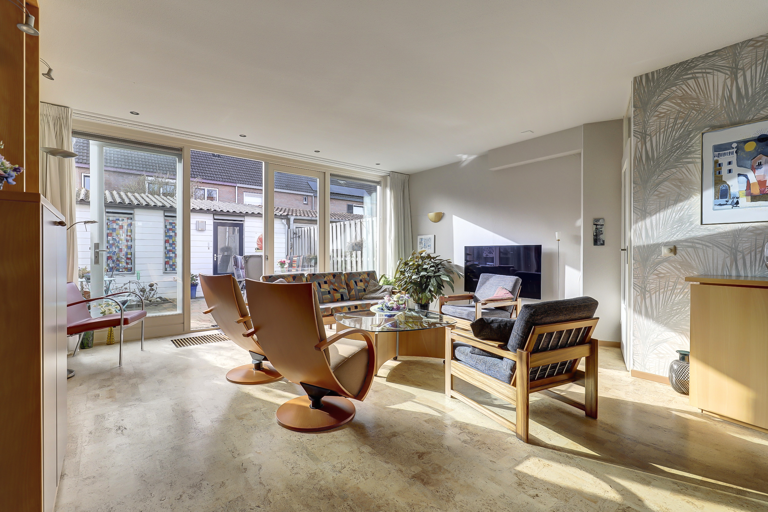 Je stapt binnen in een ruime hal waar het toilet met fontein, de meterkast en een royale berging zijn gesitueerd. Vanuit de hal loop je de lichte woonkamer in, waar het daglicht royaal binnenvalt door de grote raampartijen en waar je eenvoudig een gezellige zithoek en een royale eettafel kunt plaatsen. In 2005 is aan de achterzijde een aanbouw gerealiseerd met openslaande deuren, waardoor je een fijn binnen-buitengevoel ervaart.
