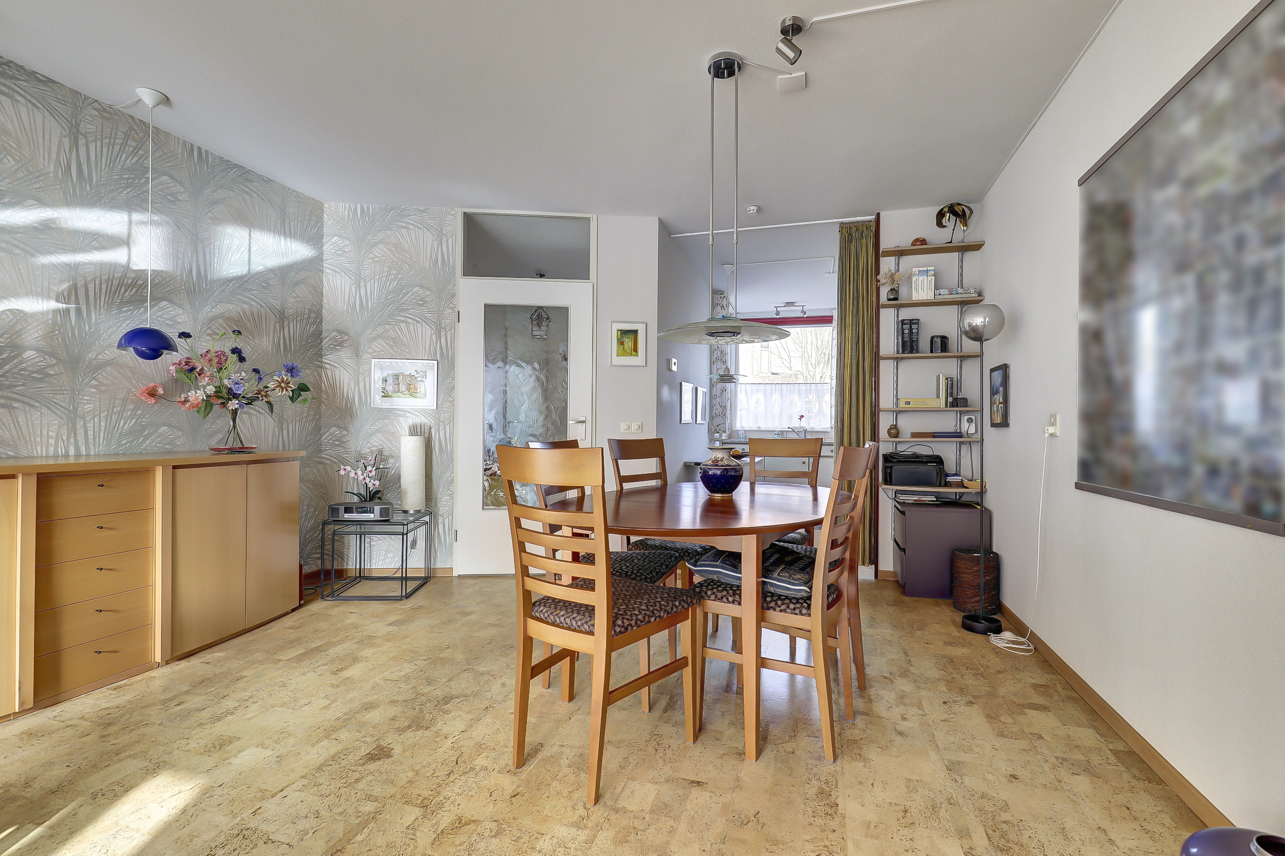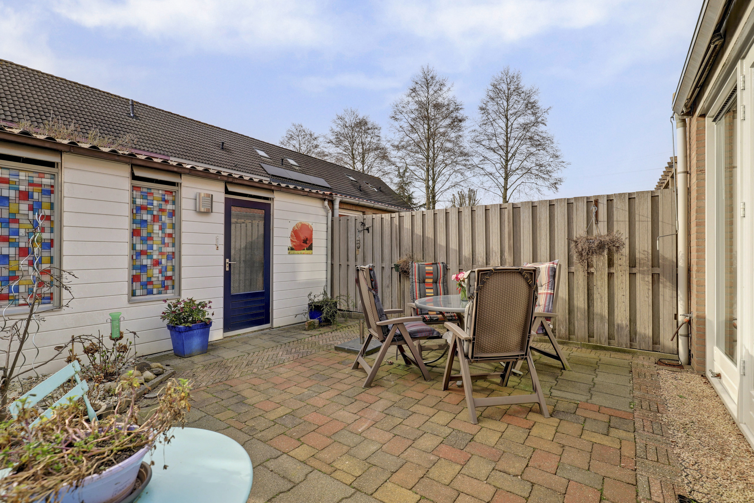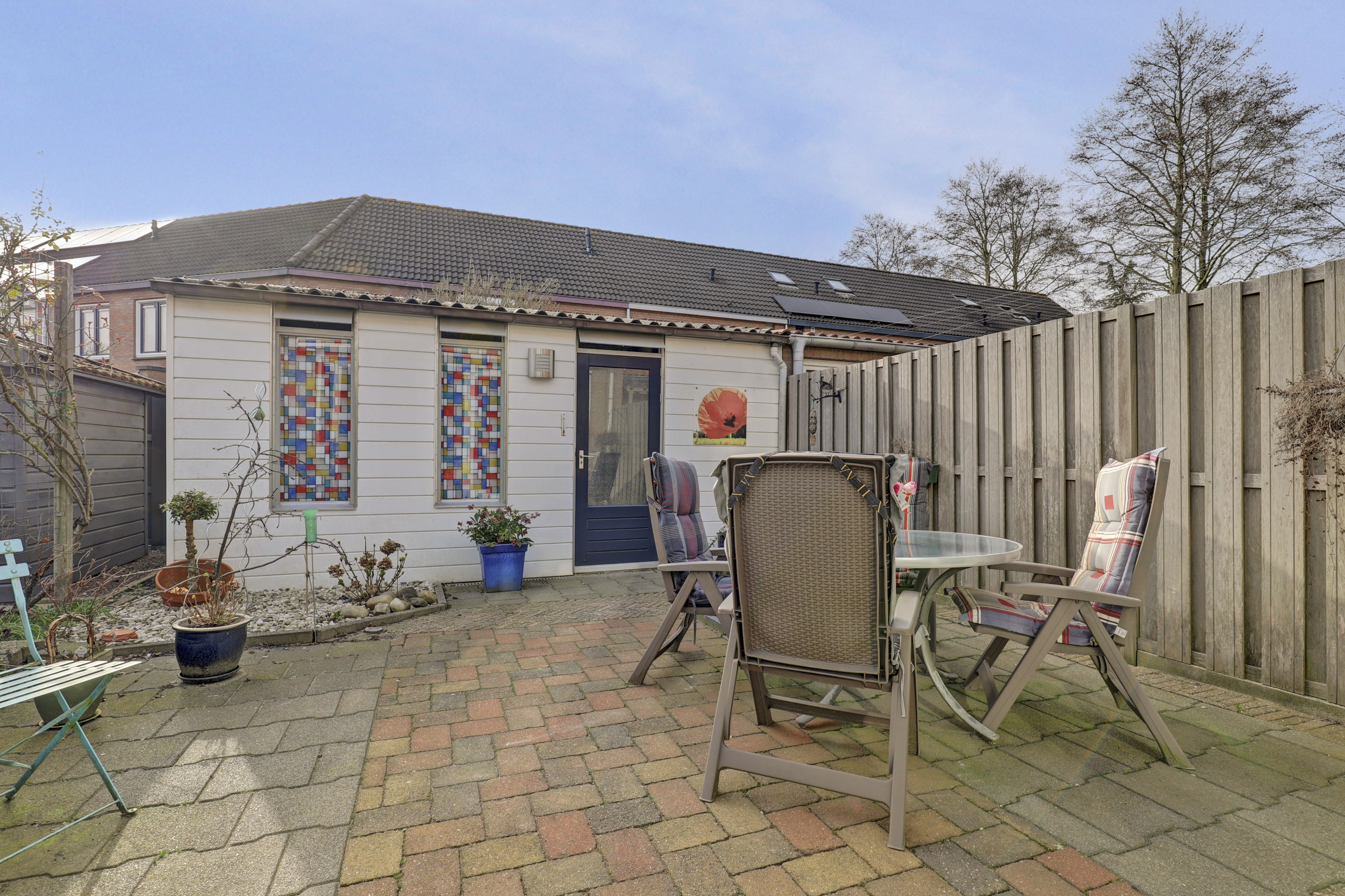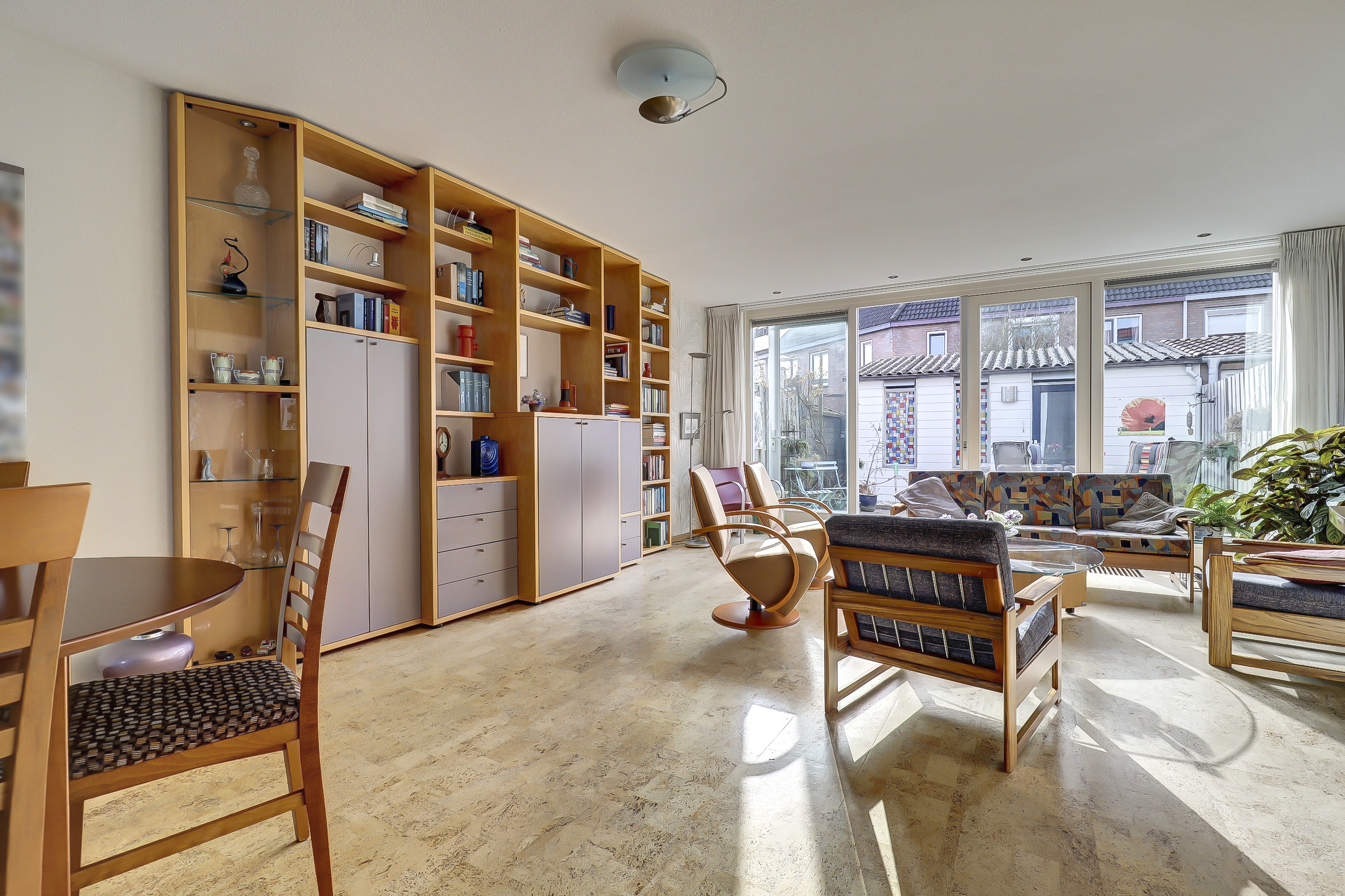 Je stapt binnen in een ruime hal waar het toilet met fontein, de meterkast en een royale berging zijn gesitueerd. Vanuit de hal loop je de lichte woonkamer in, waar het daglicht royaal binnenvalt door de grote raampartijen en waar je eenvoudig een gezellige zithoek en een royale eettafel kunt plaatsen. In 2005 is aan de achterzijde een aanbouw gerealiseerd met openslaande deuren, waardoor je een fijn binnen-buitengevoel ervaart.
