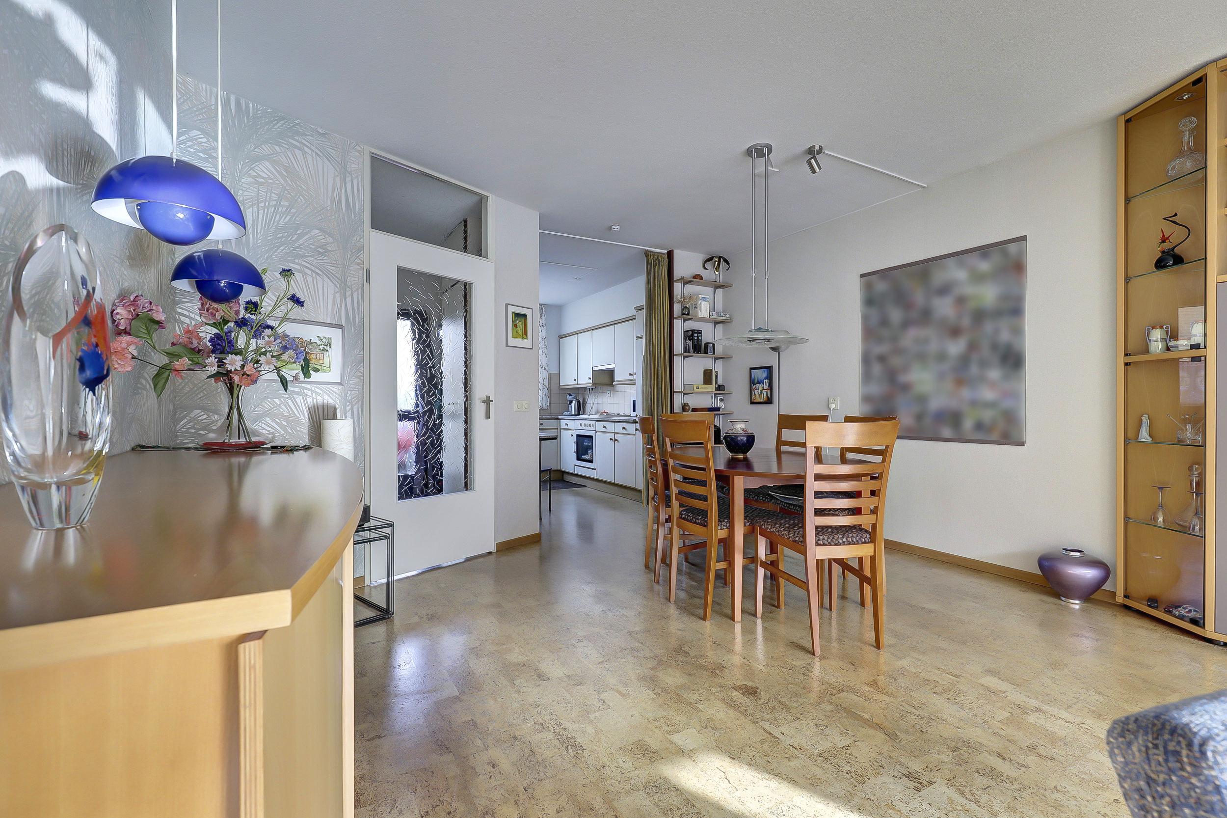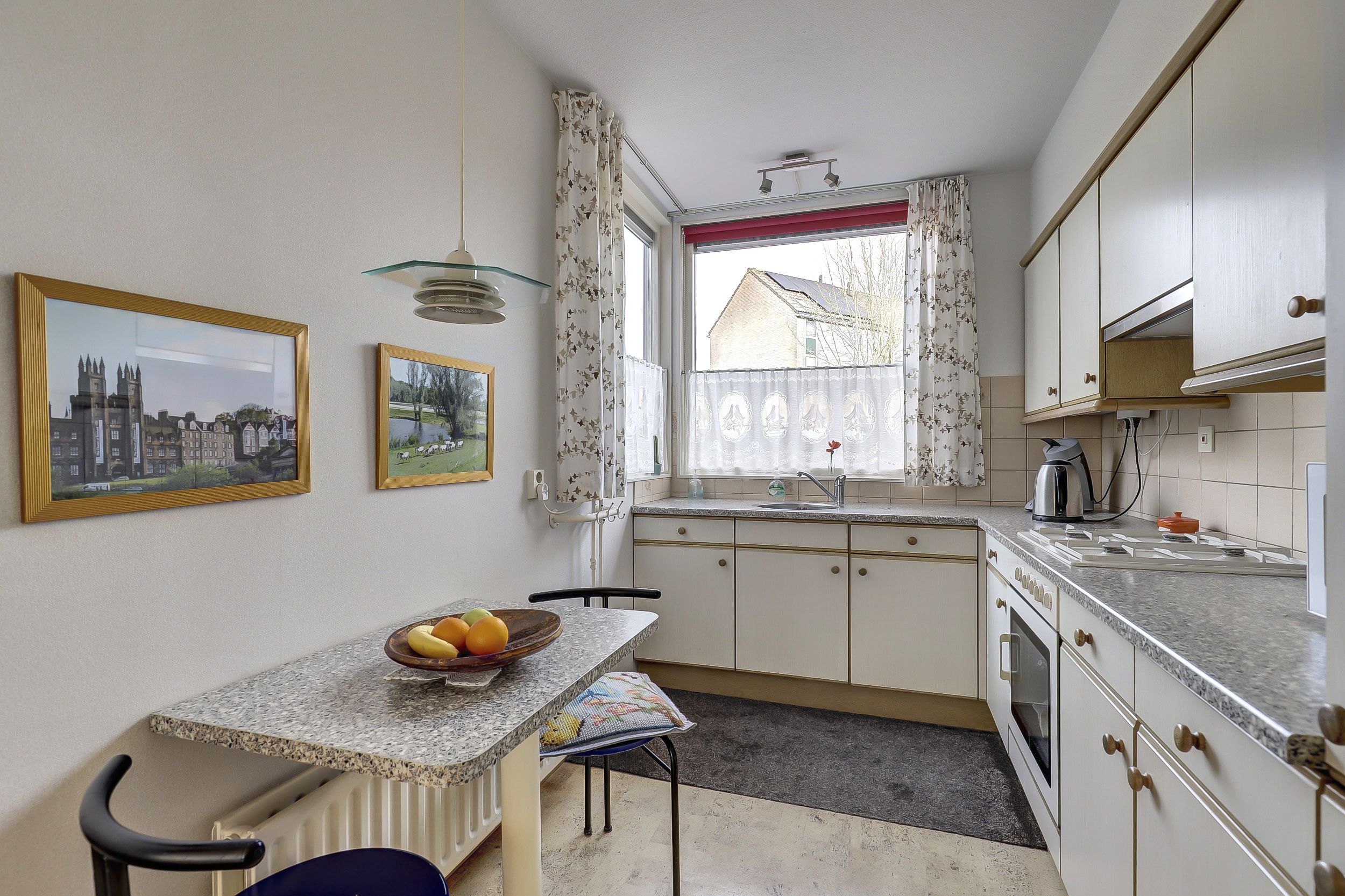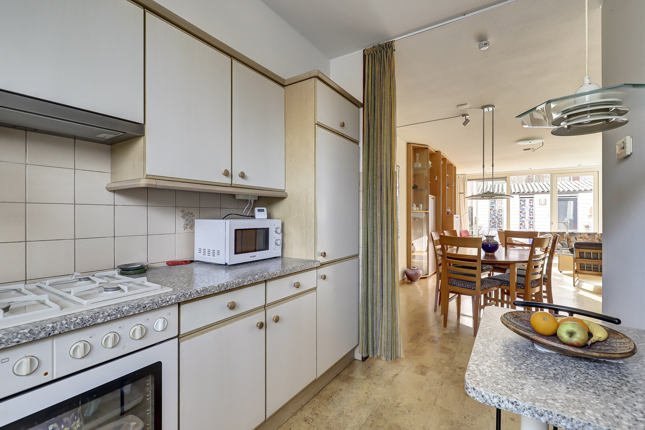 Aan de voorzijde bevindt zich de open L-vormige keuken (1992), een praktische plek om te koken terwijl je contact houdt met de rest van het huis.