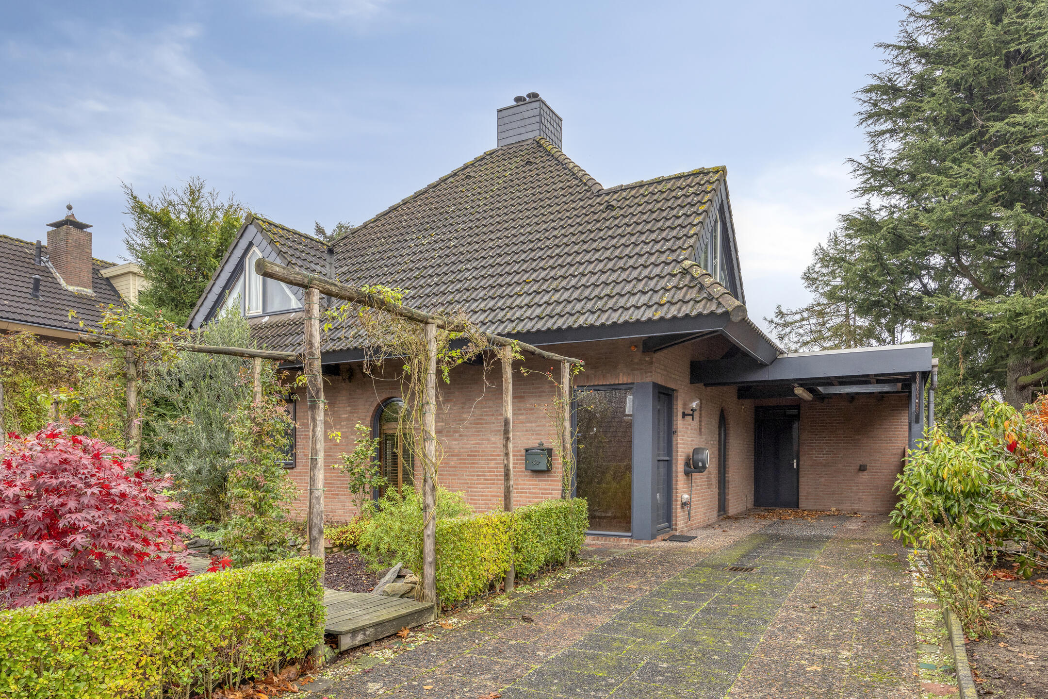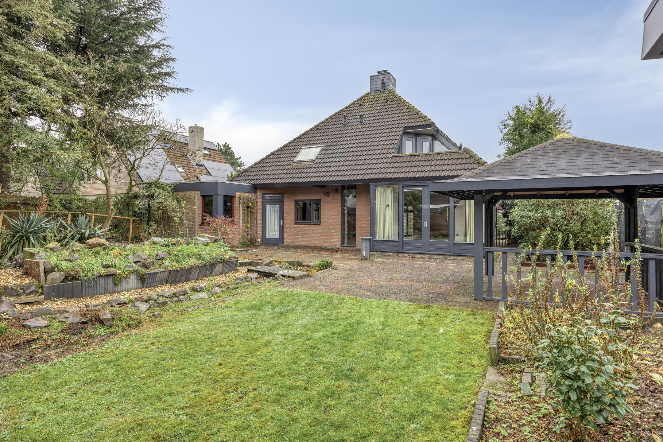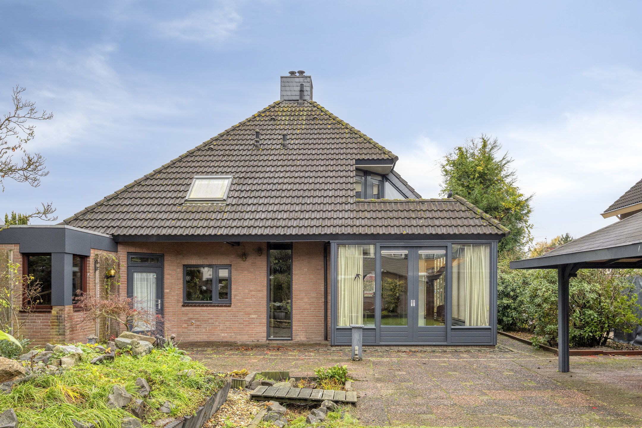 De tuin rondom is fraai aangelegd en biedt diverse plekken om van de zon of schaduw te genieten. Dankzij de ligging van de woning en het volwassen groen geniet je van optimale privacy. De carport met lichtkoepel bevindt zich aan de voorzijde en biedt ruimte om op eigen terrein te parkeren.