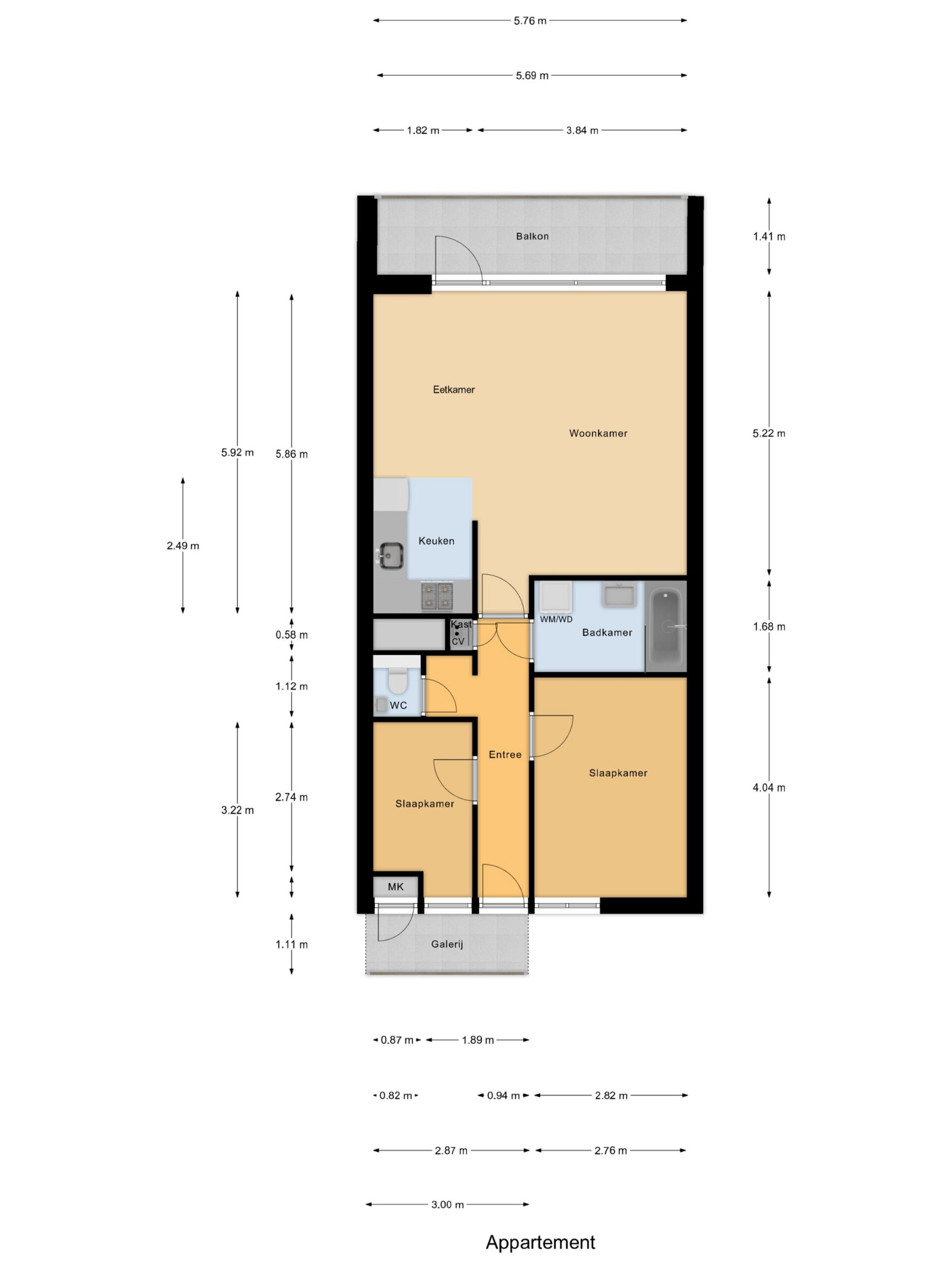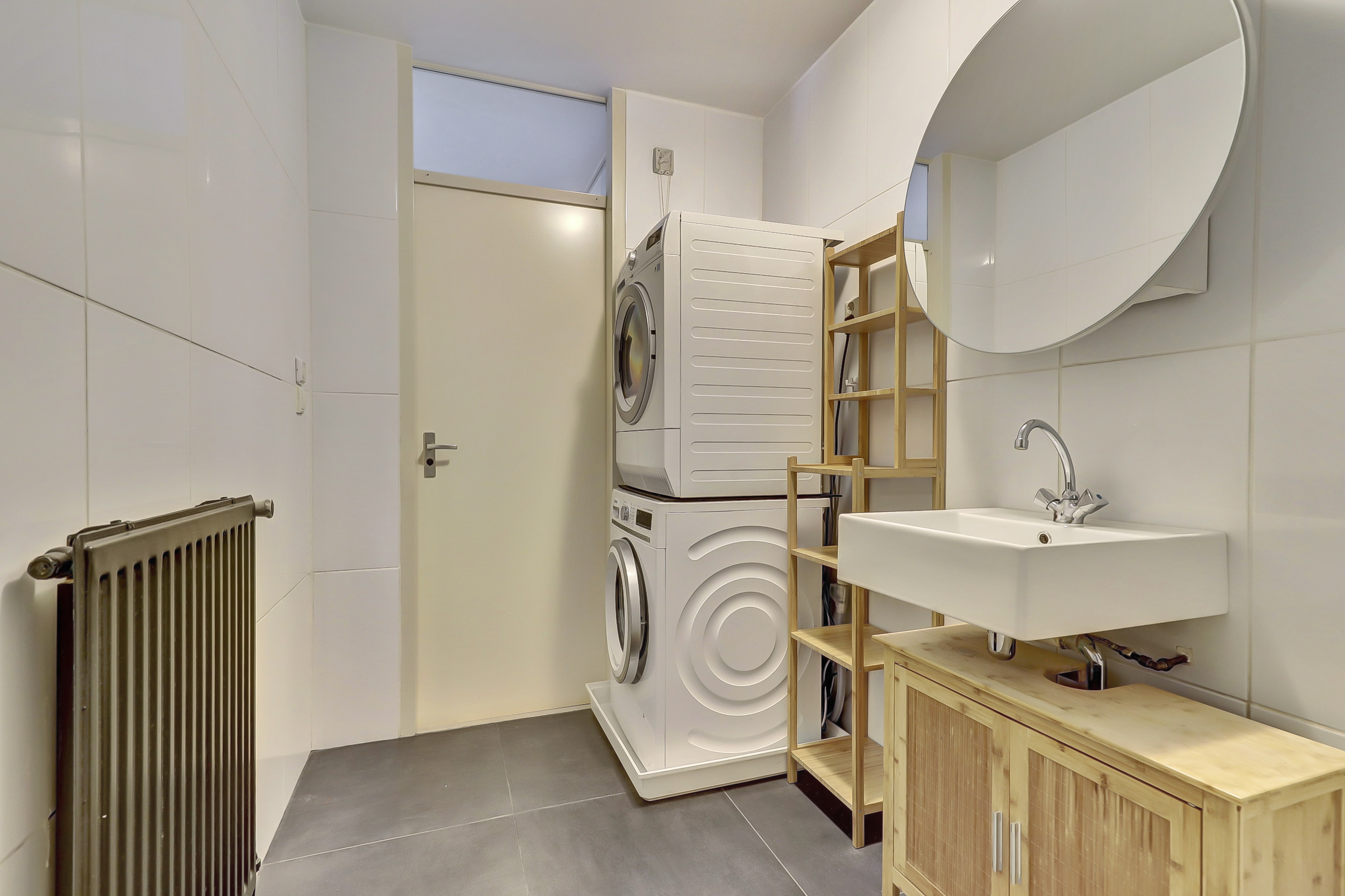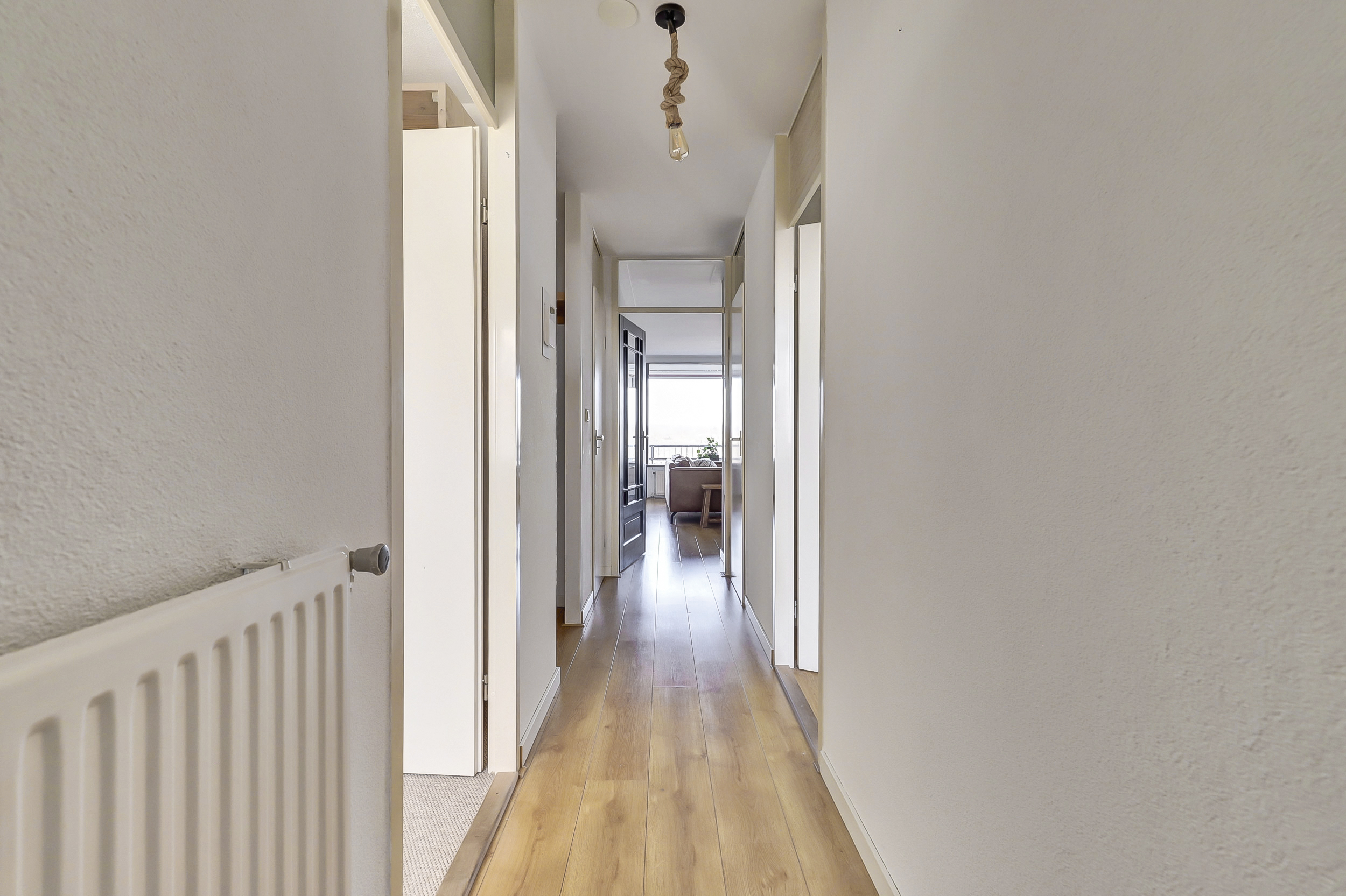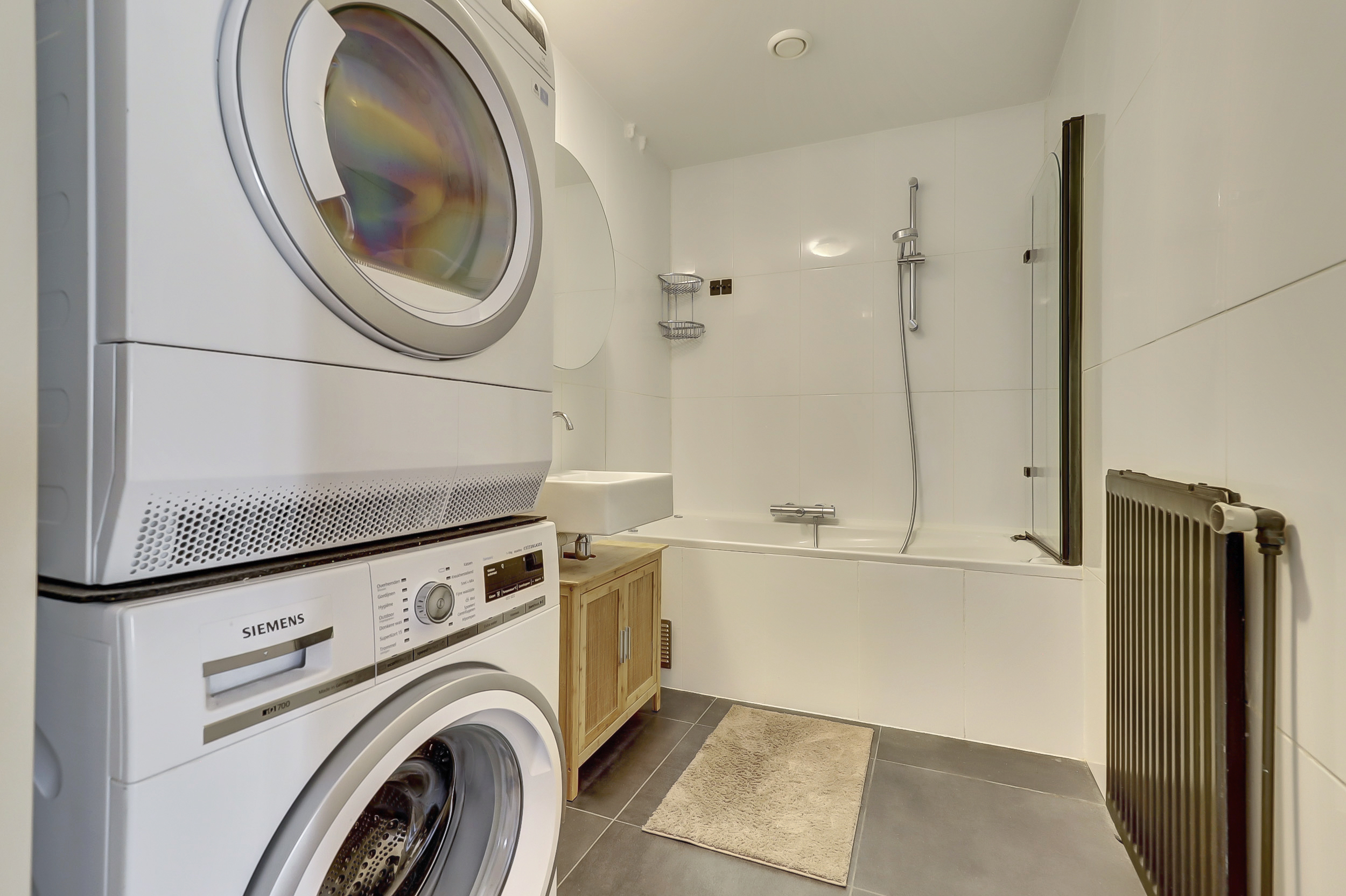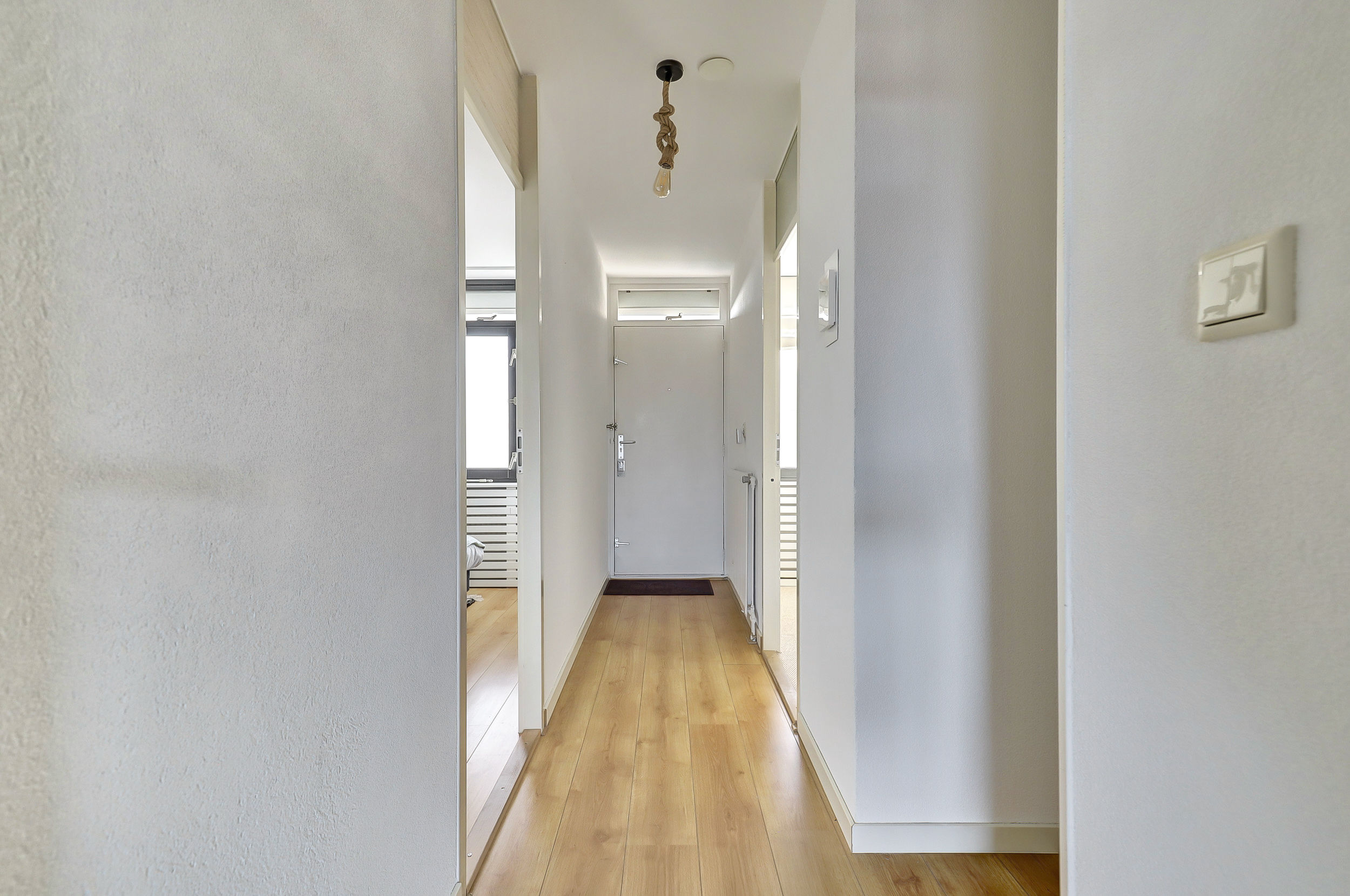 Bij binnenkomst in het complex kom je aan in een trap of via de lift, waarna je de ruime hal betreedt die leidt naar de verschillende vertrekken. Je hebt hier twee comfortabele slaapkamers, een stijlvolle badkamer voorzien met ligbad, vaste wastafel en aansluitingen voor de wasmachine, en een moderne, royale woonkamer met een halfopen keuken. De keuken is volledig uitgerust met diverse inbouwapparaten en een hardstenen werkblad, waardoor jij direct aan de slag kunt met het bereiden van jouw favoriete gerechten. Het zwevende toilet met fonteintje zorgt voor extra een gevoel van luxe en gemak.
