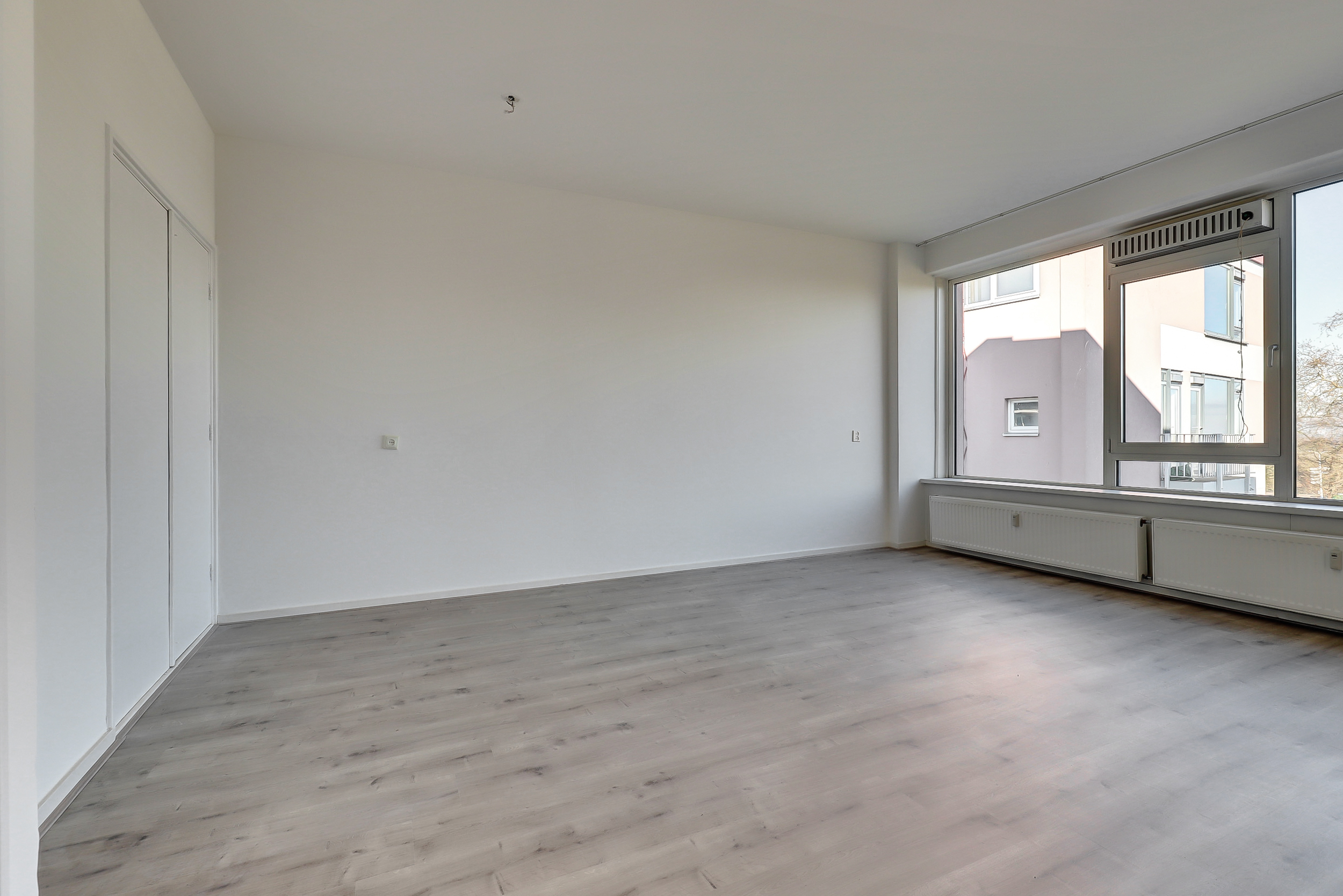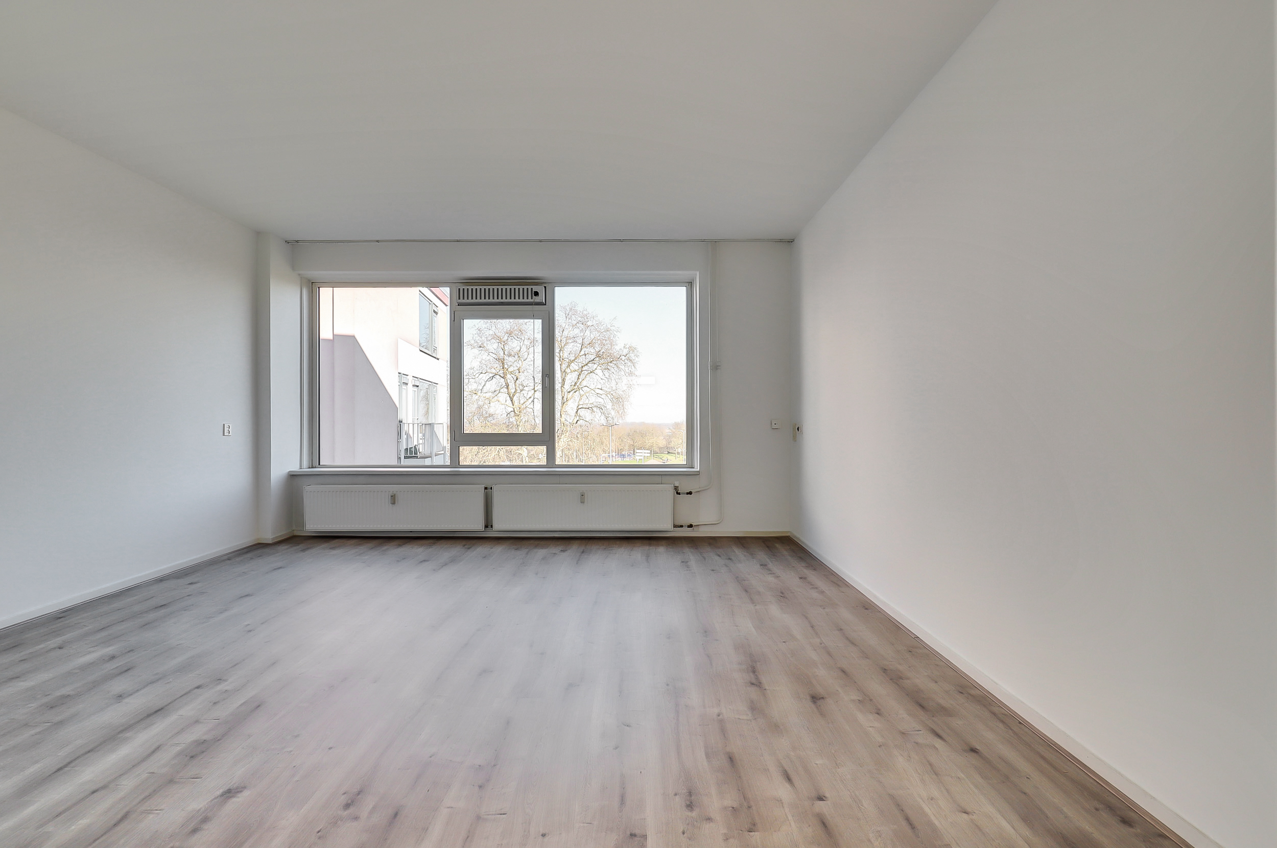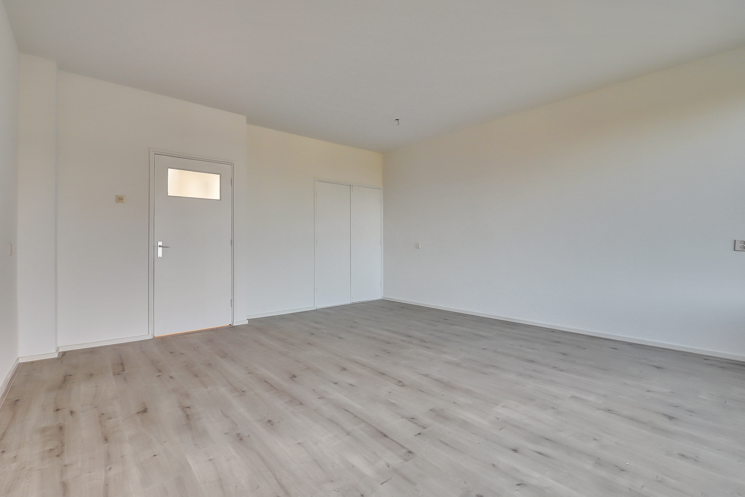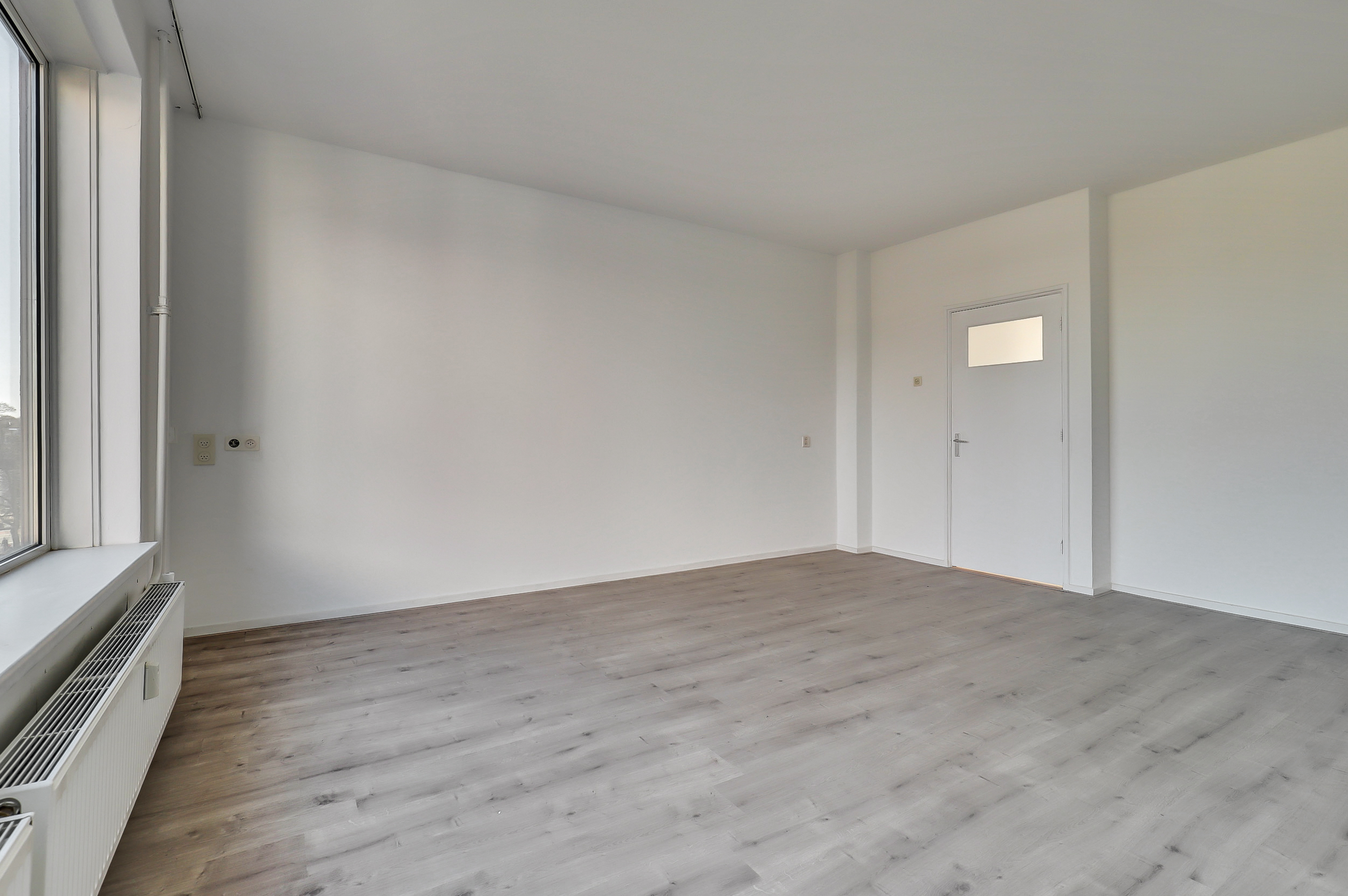 Hal met trapkast en toegang tot de woonkamer aan de voorzijde. De woonkamer (ca. 24 m²) is voorzien van een laminaatvloer en biedt prettig lichtinval en uitzicht richting het Hunnerpark. Vanuit de hal bereik je eveneens het separate toilet met fontein en de ruimte waar de keuken door koper nog naar eigen wens geplaatst kan worden. Hier bevindt zich tevens een bergkast met elektrische boiler (Tesy) voor het warme water. Aan de voorzijde is er via een deur toegang tot de galerij aan de buitenzijde.
