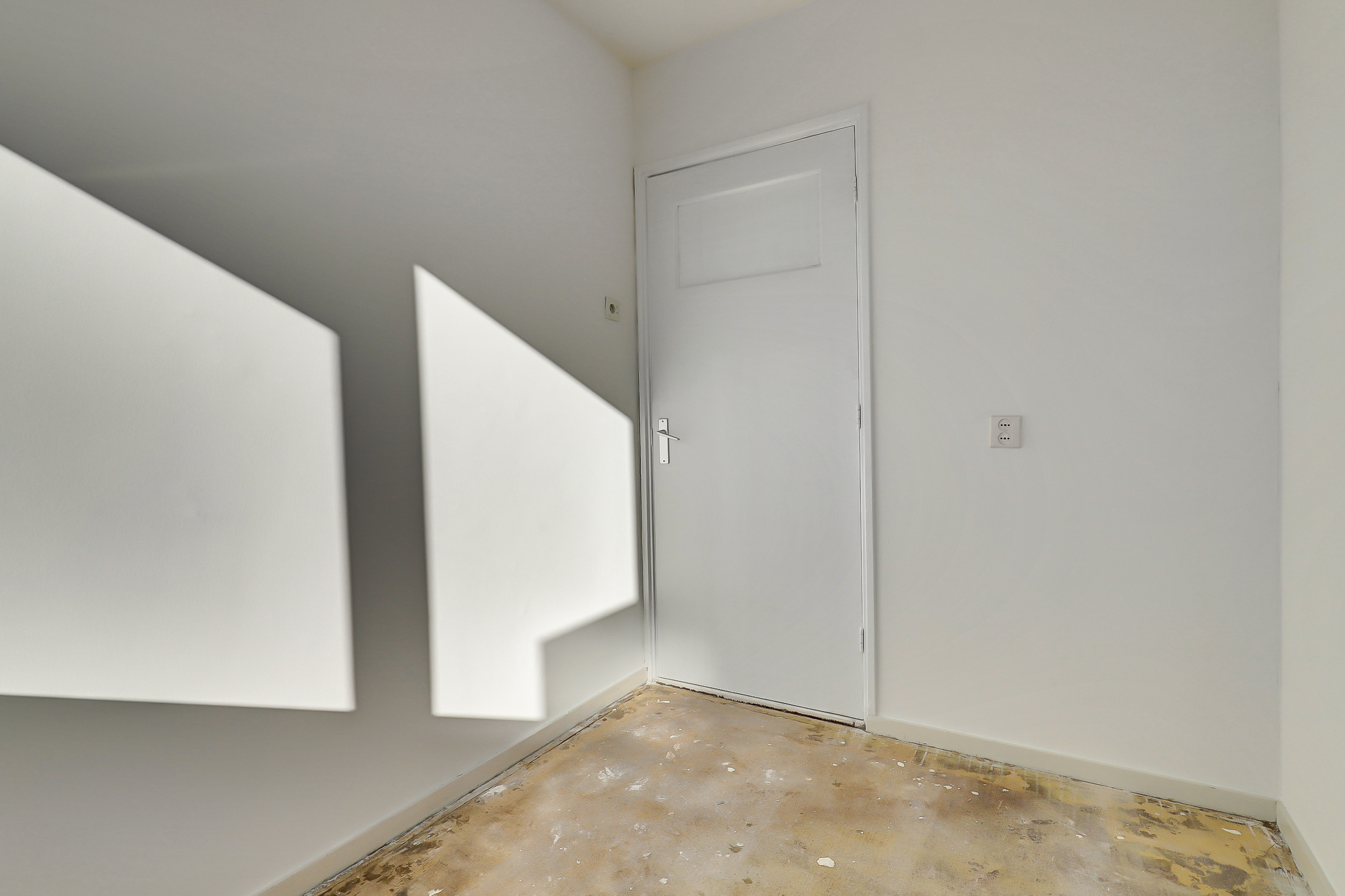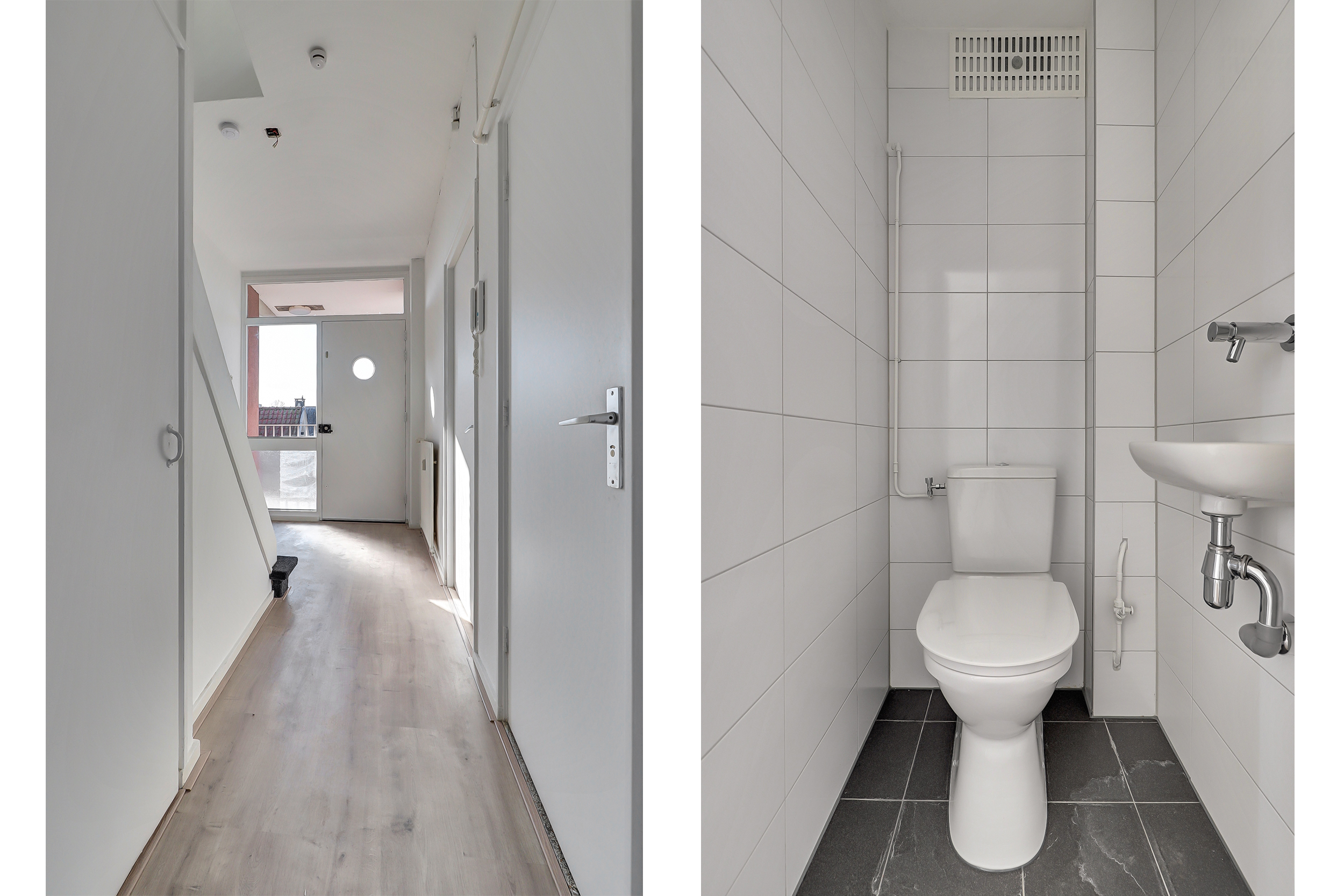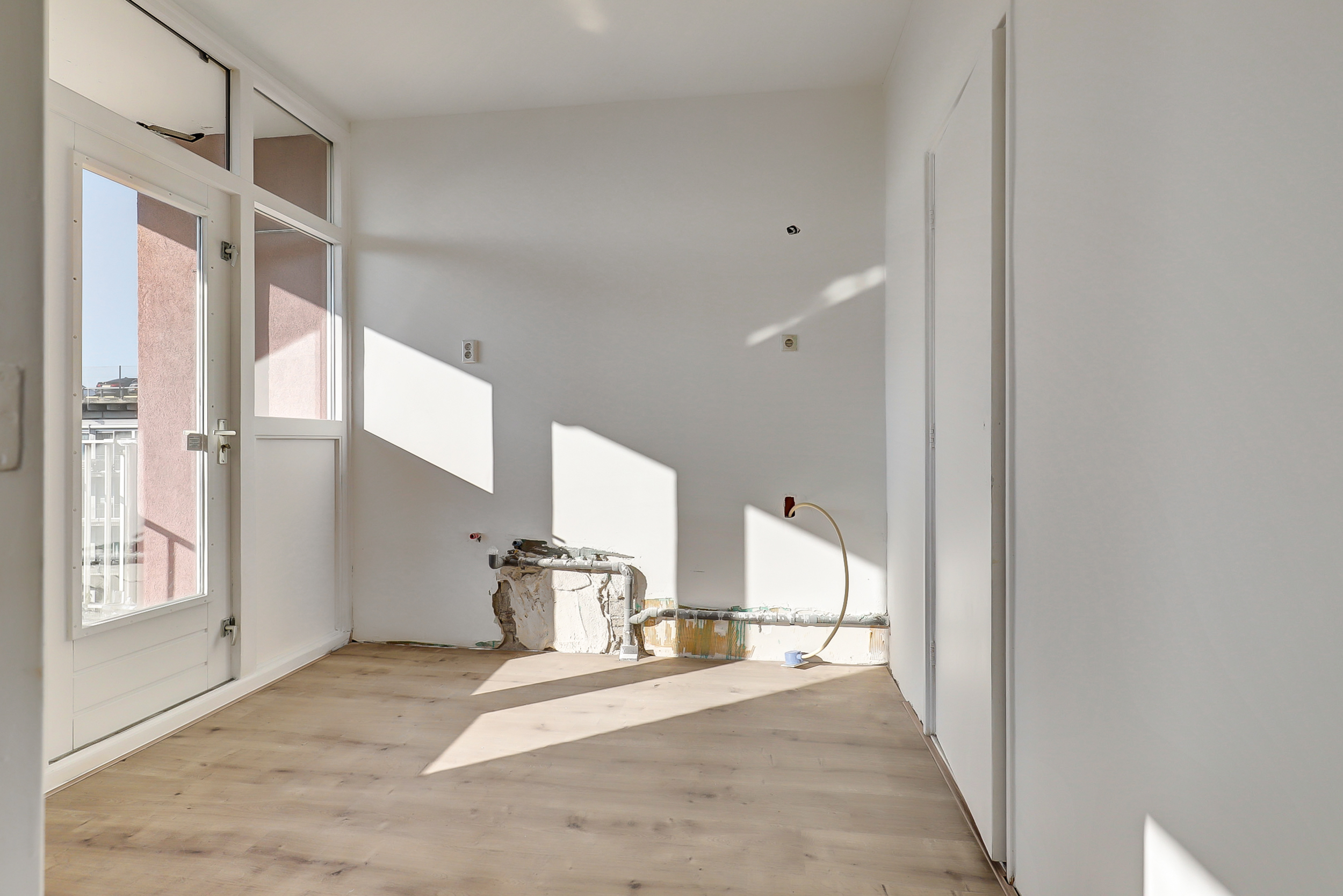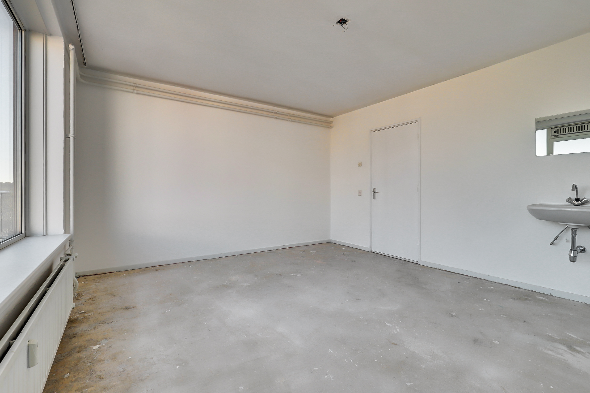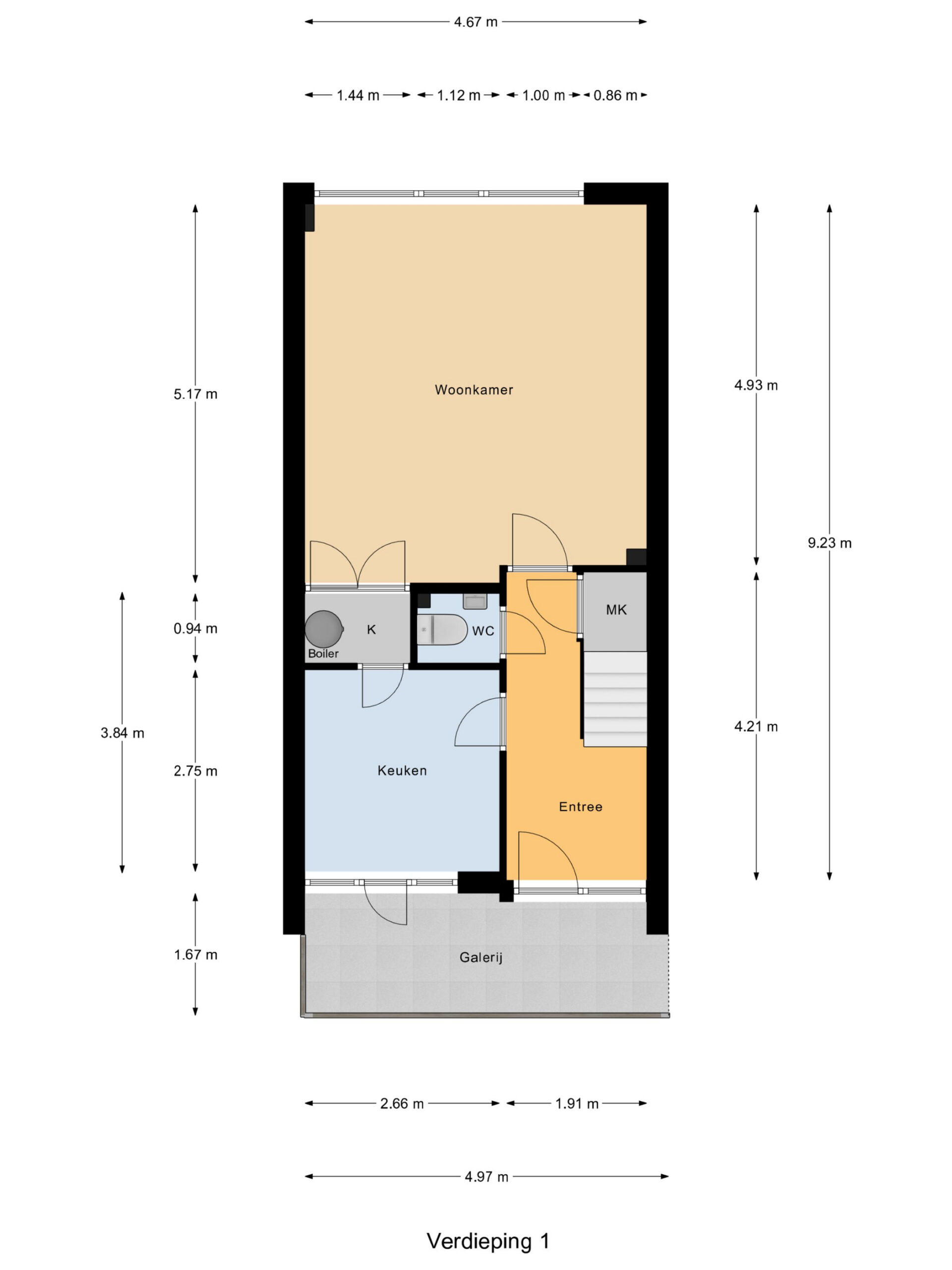 Hal met trapkast en toegang tot de woonkamer aan de voorzijde. De woonkamer (ca. 24 m²) is voorzien van een laminaatvloer en biedt prettig lichtinval en uitzicht richting het Hunnerpark. Vanuit de hal bereik je eveneens het separate toilet met fontein en de ruimte waar de keuken door koper nog naar eigen wens geplaatst kan worden. Hier bevindt zich tevens een bergkast met elektrische boiler (Tesy) voor het warme water. Aan de voorzijde is er via een deur toegang tot de galerij aan de buitenzijde.