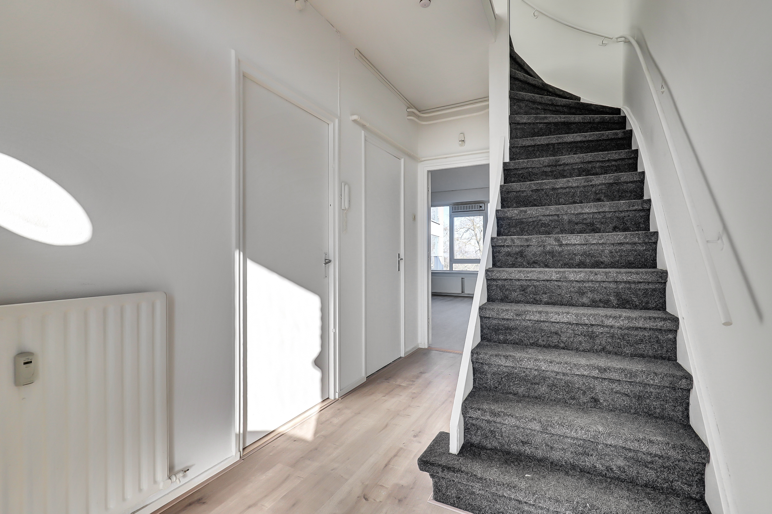 Centrale entree met brievenbussen, bellentableau en trapopgang naar de verdiepingen. Tevens toegang tot de bergingen in de kelder.