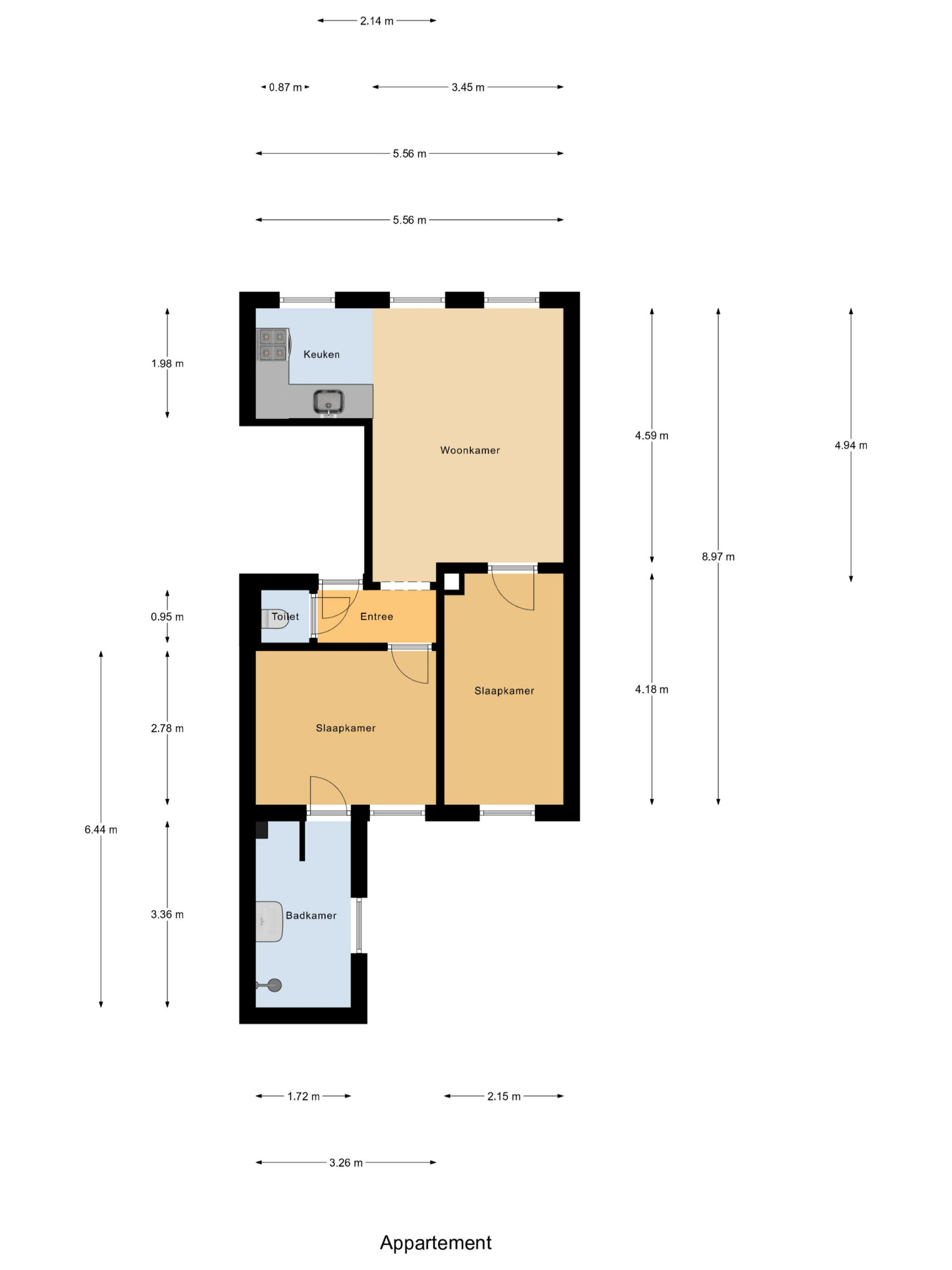 Je komt binnen via de entree, van waaruit alle vertrekken toegankelijk zijn. De woonkamer is licht en efficiënt ingedeeld met een open keuken, uitgerust met een 4-pits gaskookplaat, spoelbak, vaatwasser, combimagnetron en afzuigkap. Er zijn twee slaapkamers, waarvan één slaapkamer grenst aan de badkamer met douche, wastafel en aansluiting voor wasmachine. Het separate toilet is bereikbaar vanuit de entree, waar zich tevens de cv-ketel bevindt (Remeha, 2012).