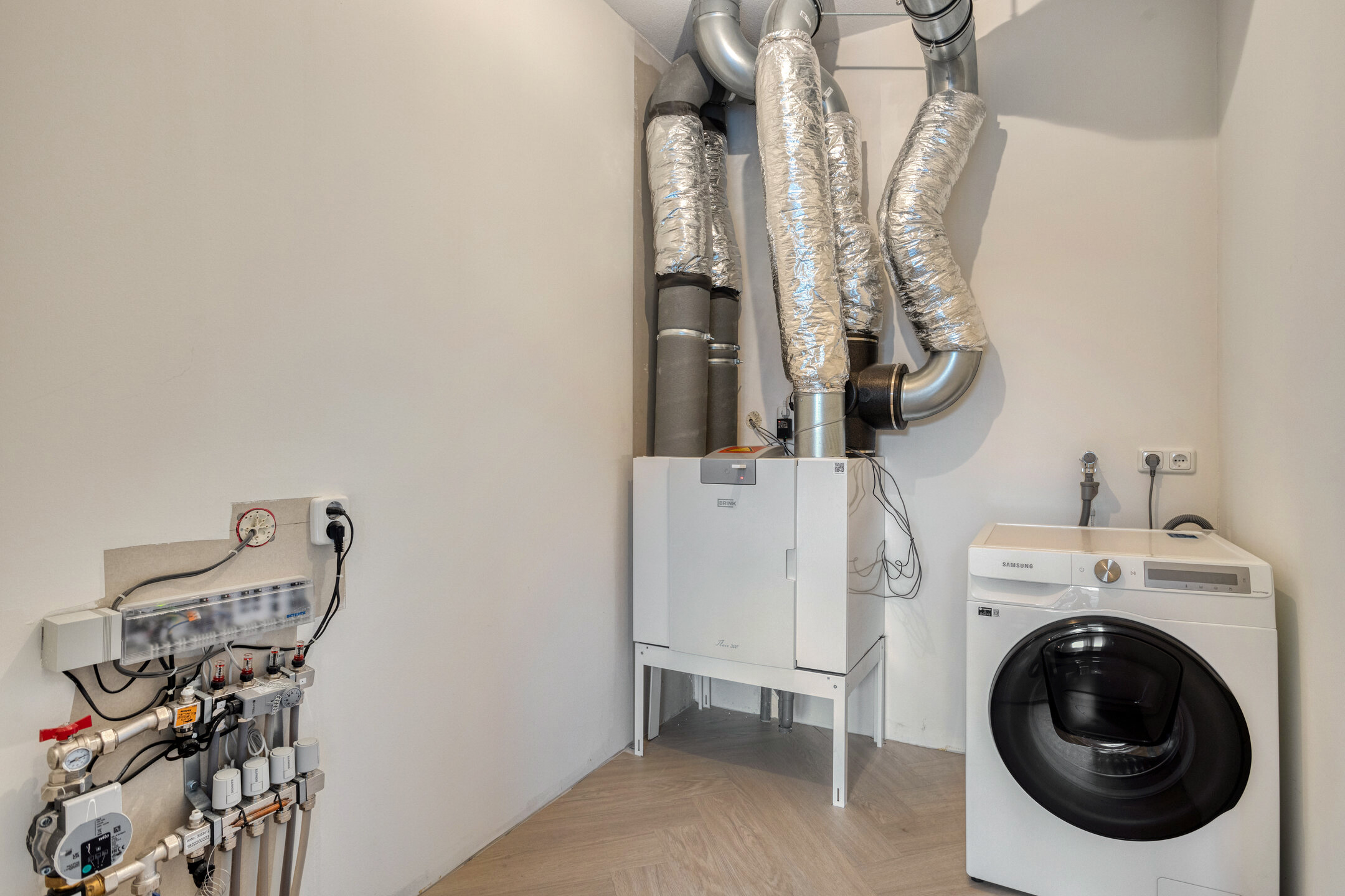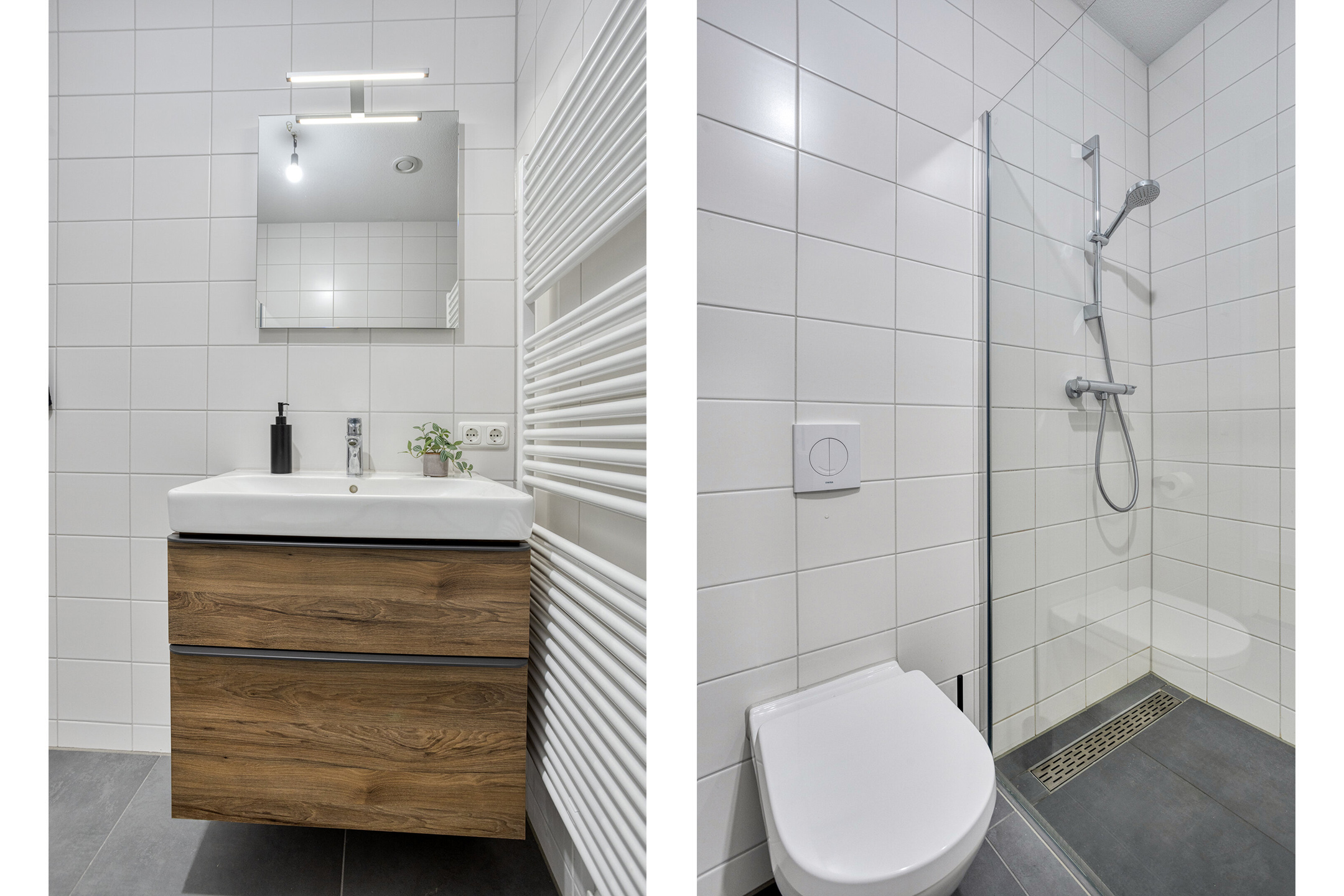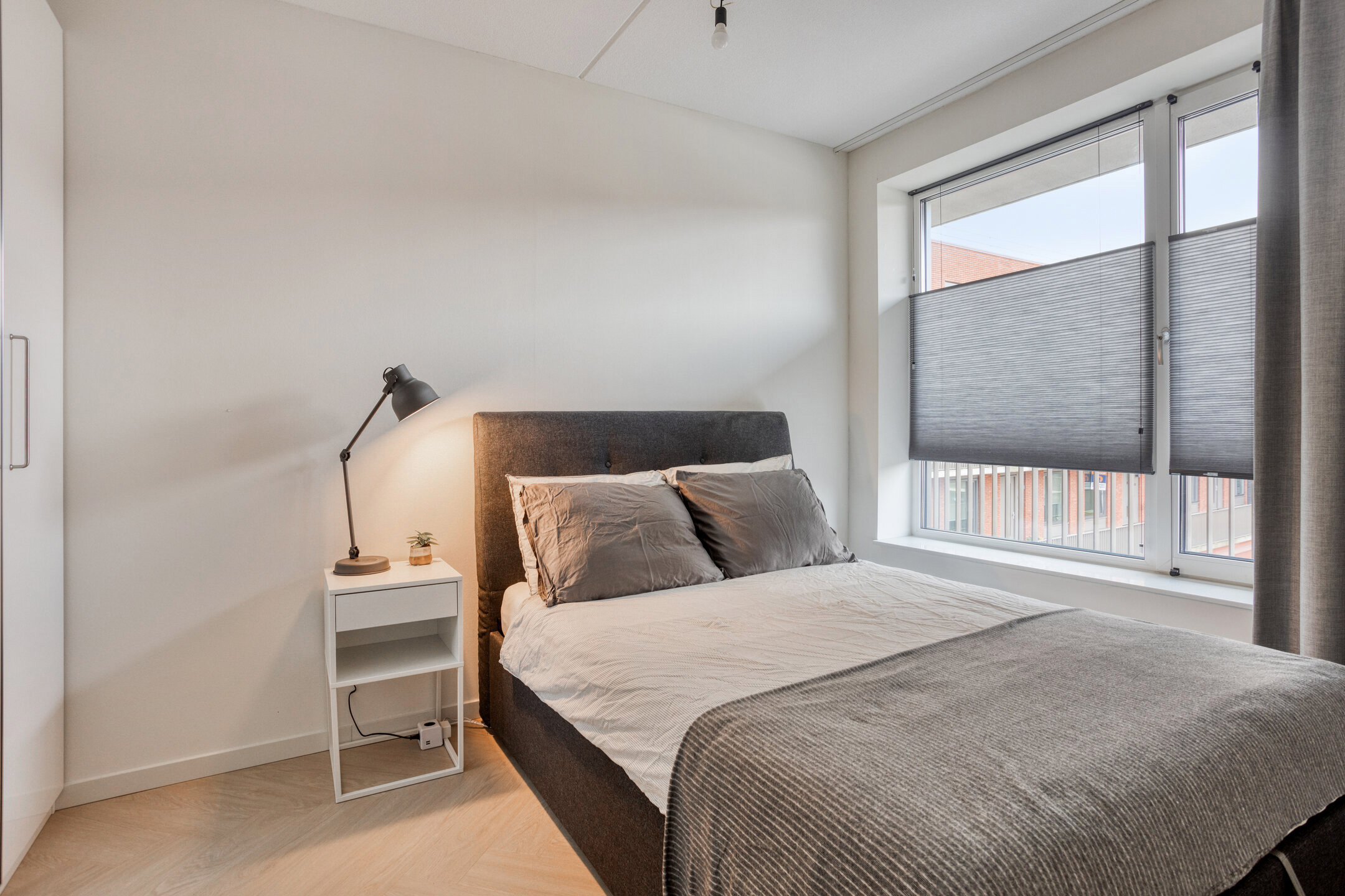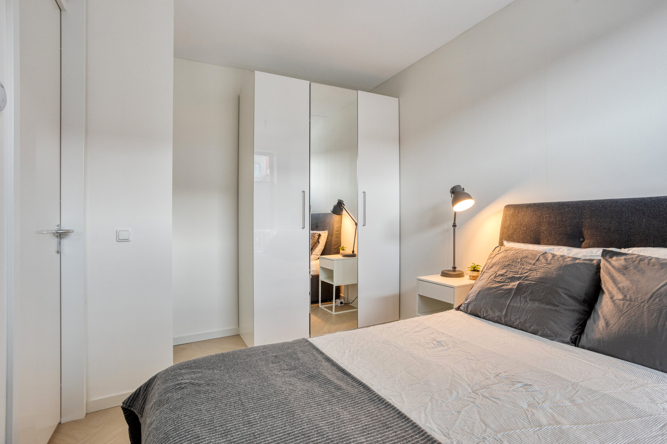 De slaapkamer ligt rustig aan de binnenzijde van het appartement. De moderne badkamer (2023) beschikt over een toilet, inloopdouche en wastafelmeubel. Daarnaast is er een inpandige berging met de verdeler van de vloerverwarming, witgoedaansluiting en de WTW-installatie. De doorlopende pvc-vloer met vloerverwarming versterkt het wooncomfort en zorgt voor een rustige, moderne uitstraling.