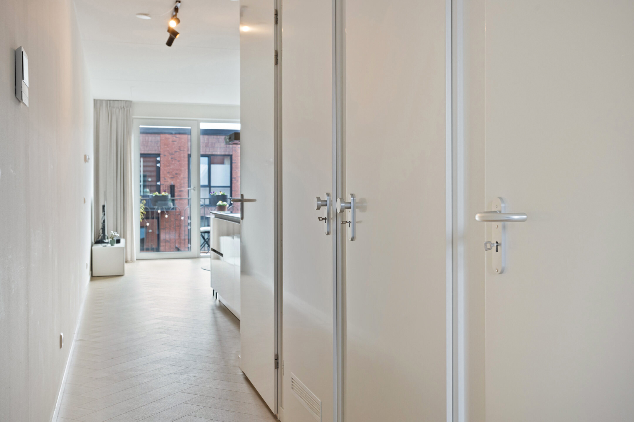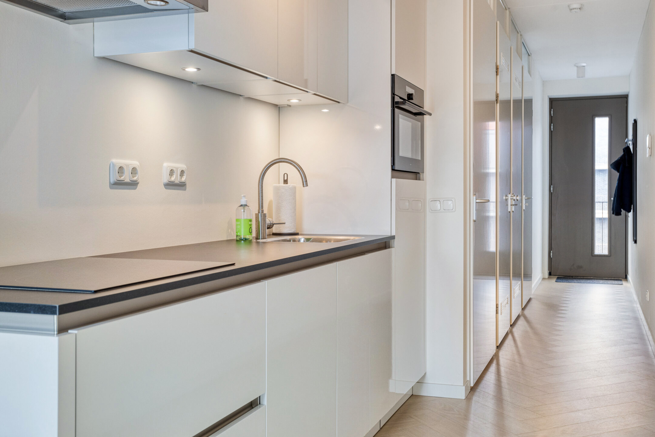 Via de centrale entree met lift bereik je de derde verdieping en tevens bovenste verdieping, waar het appartement is gelegen. Je komt binnen in de hal, die toegang geeft tot alle ruimtes. De woonkamer is licht en praktisch ingedeeld, met een draaikiepkozijn naar het balkon. De open keuken in wandopstelling is geplaatst in 2023 en voorzien van onder andere een koelkast met vriesvak, combi-oven, spoelbak, vaatwasser, 4-pits inductiekookplaat en afzuigkap – compleet en strak afgewerkt.