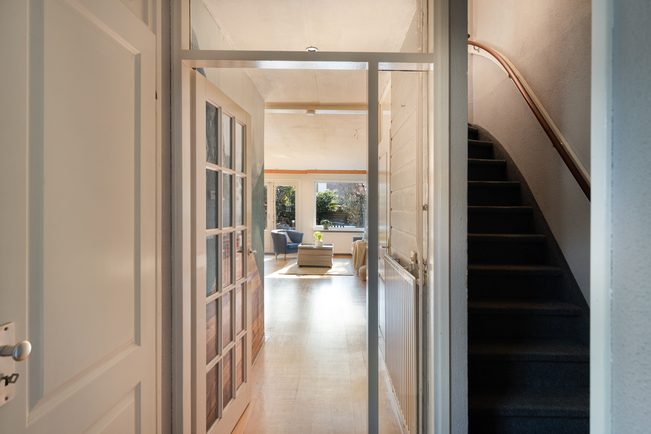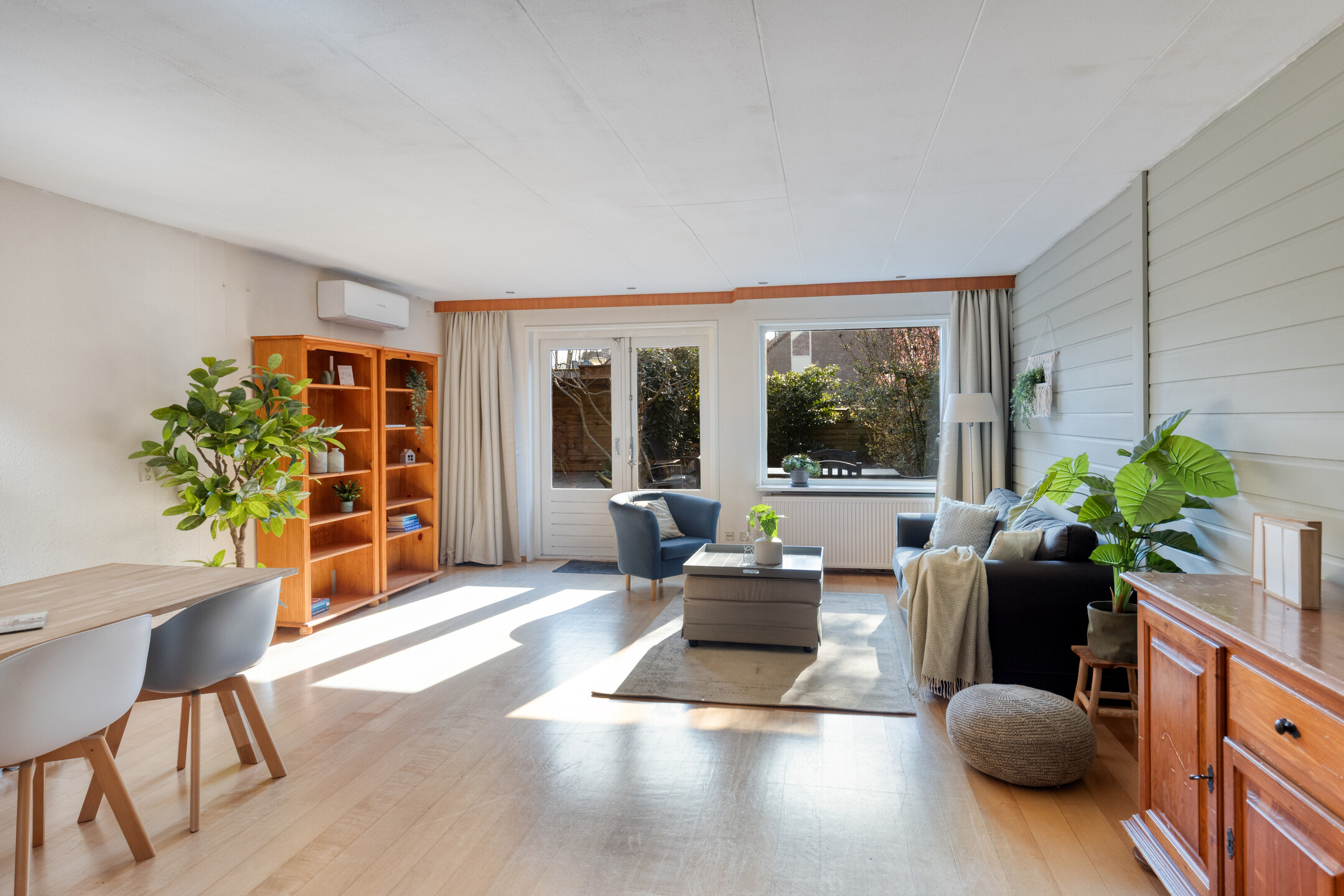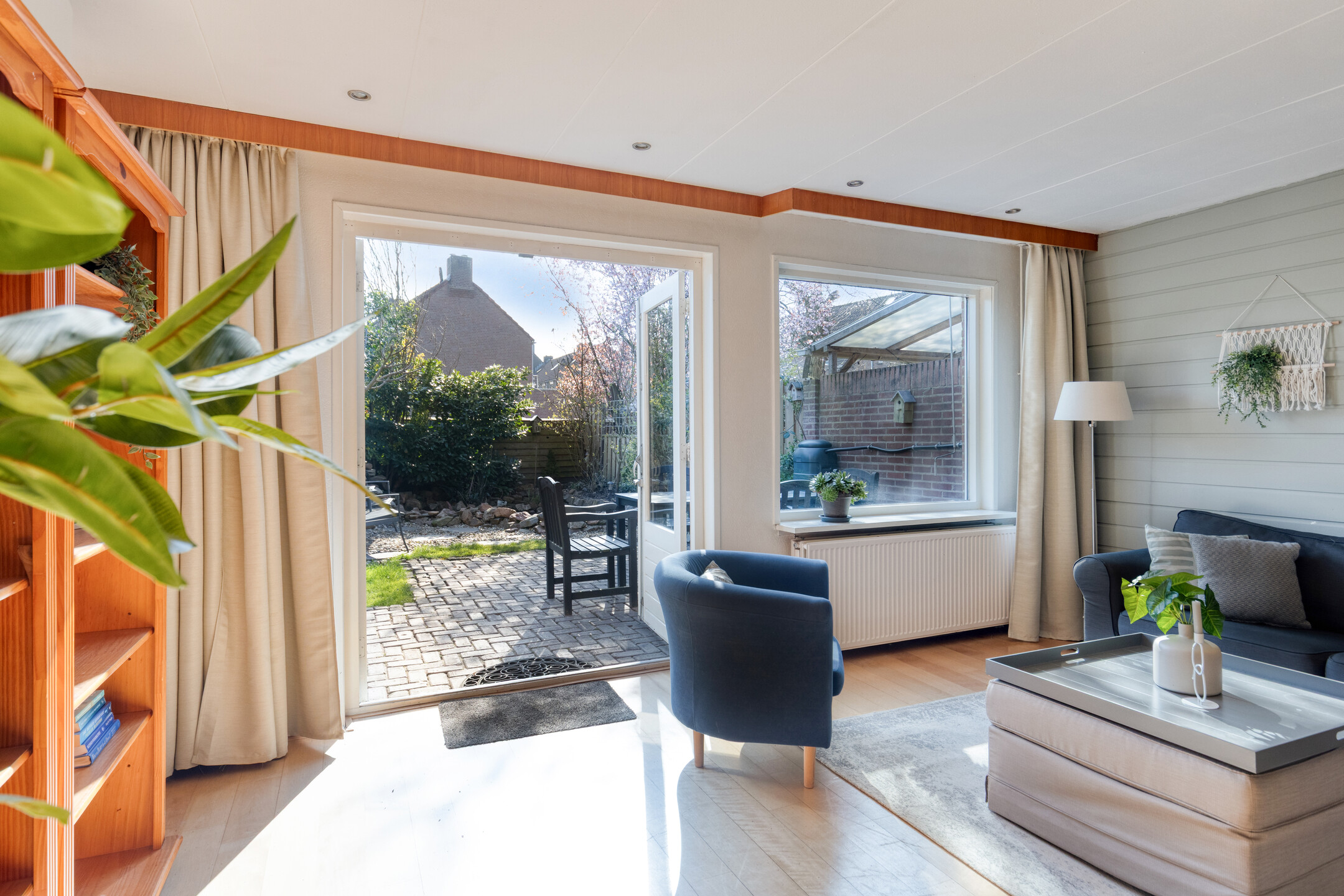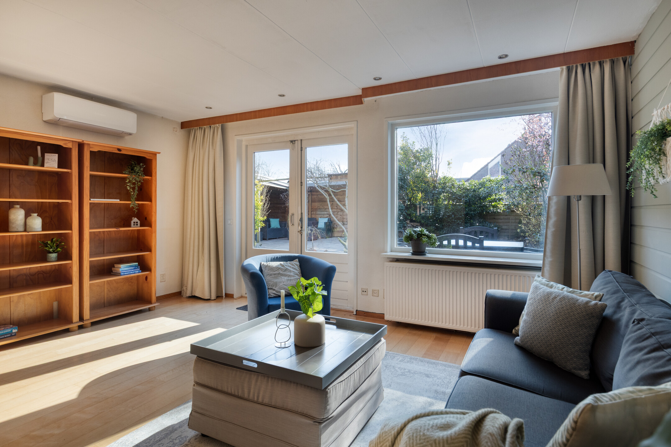 Bij binnenkomst kom je in de ruime hal met toegang tot de meterkast, toilet en gang. Vanuit hier bereik je de woonkamer, die heerlijk licht is dankzij de openslaande tuindeuren naar de verzorgde achtertuin. De woonkamer heeft een praktische indeling en is voorzien van een nette afwerking, airconditioning en houten vloer. De open keuken is voorzien van de benodigde inbouwapparatuur, zoals o.a. een gaskookplaat, oven, magnetron, vaatwasser (2020) en biedt volop opbergruimte. Verder is er een provisieruimte voor extra opslag.