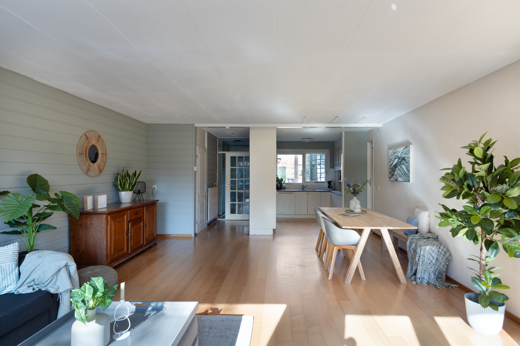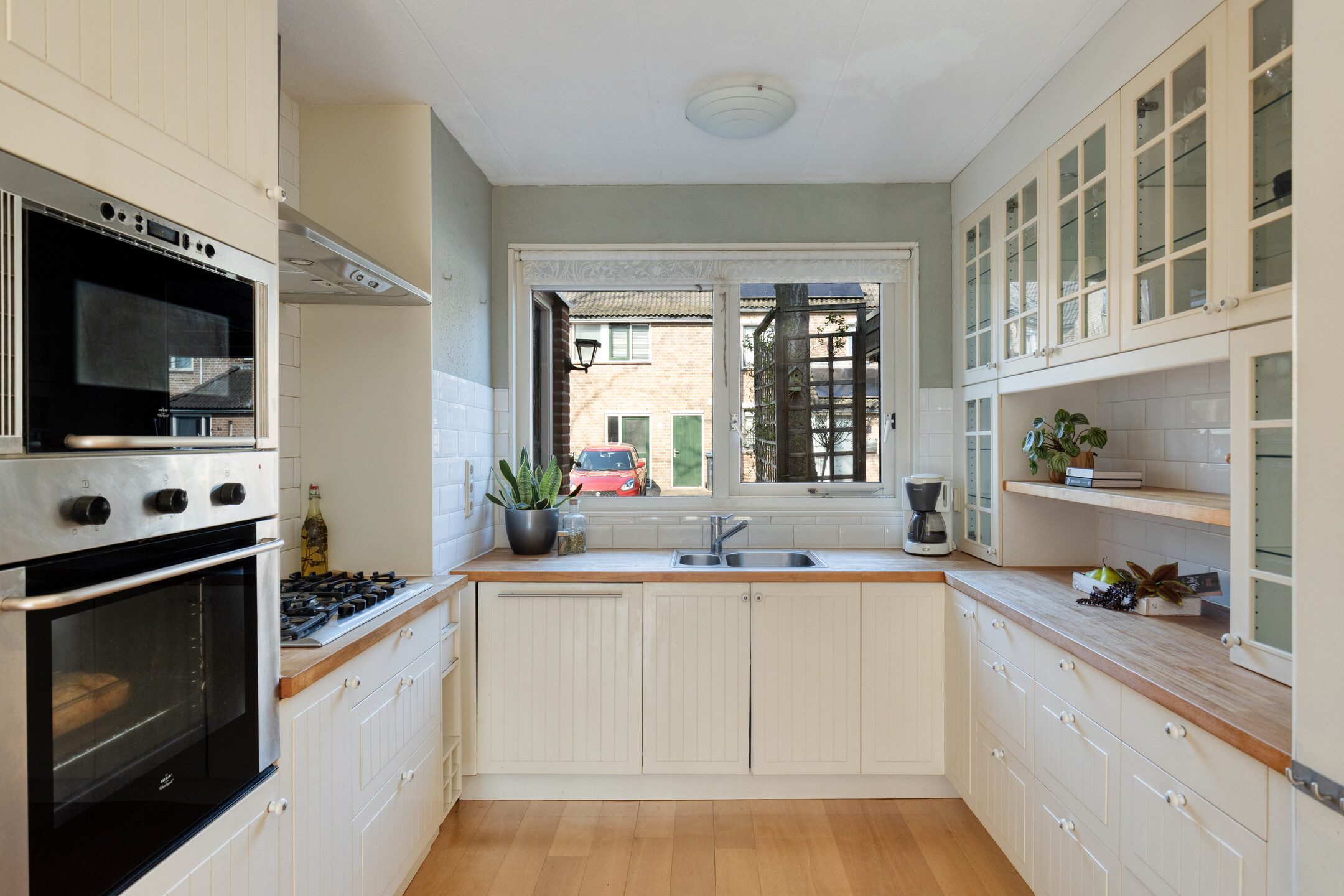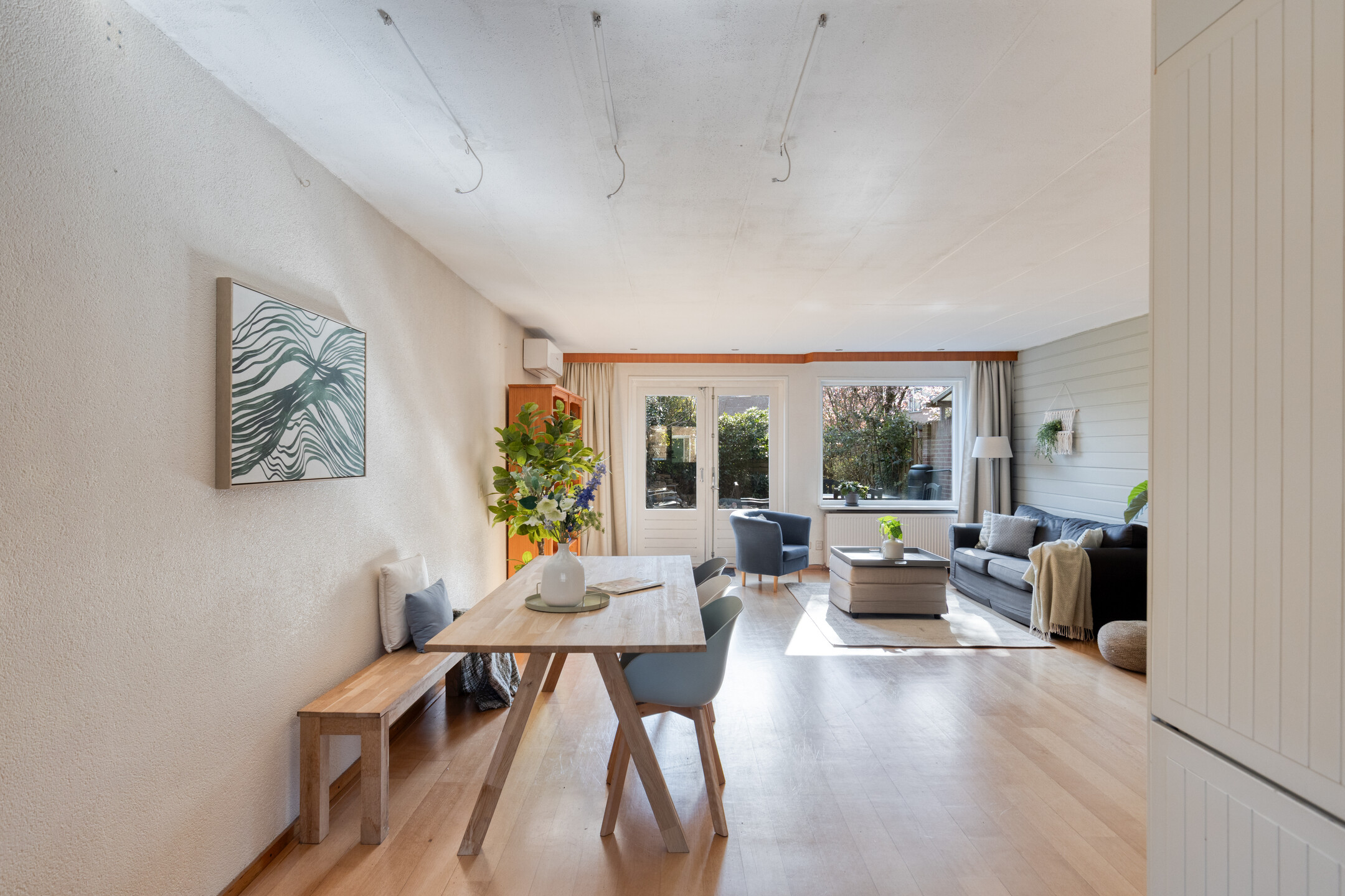 Bij binnenkomst kom je in de ruime hal met toegang tot de meterkast, toilet en gang. Vanuit hier bereik je de woonkamer, die heerlijk licht is dankzij de openslaande tuindeuren naar de verzorgde achtertuin. De woonkamer heeft een praktische indeling en is voorzien van een nette afwerking, airconditioning en houten vloer. De open keuken is voorzien van de benodigde inbouwapparatuur, zoals o.a. een gaskookplaat, oven, magnetron, vaatwasser (2020) en biedt volop opbergruimte. Verder is er een provisieruimte voor extra opslag.