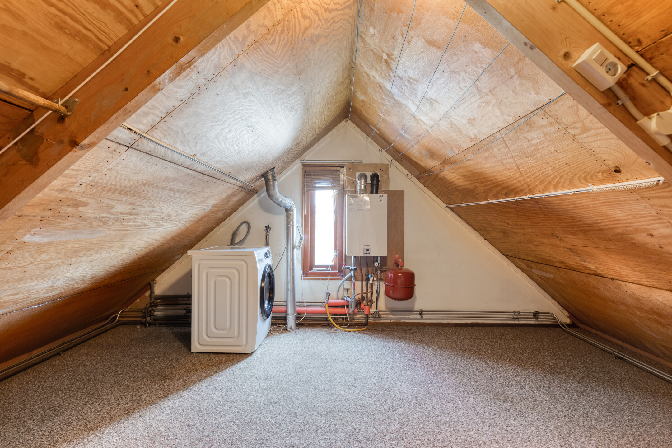 Op de tweede verdieping bevindt zich de bergzolder, waar je de wasmachineaansluiting en C.V.-ketel (Remeha, 2007) vindt. Deze ruimte biedt veel opbergmogelijkheden.