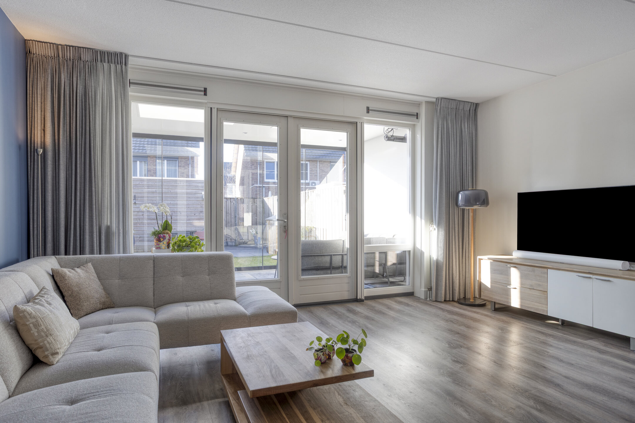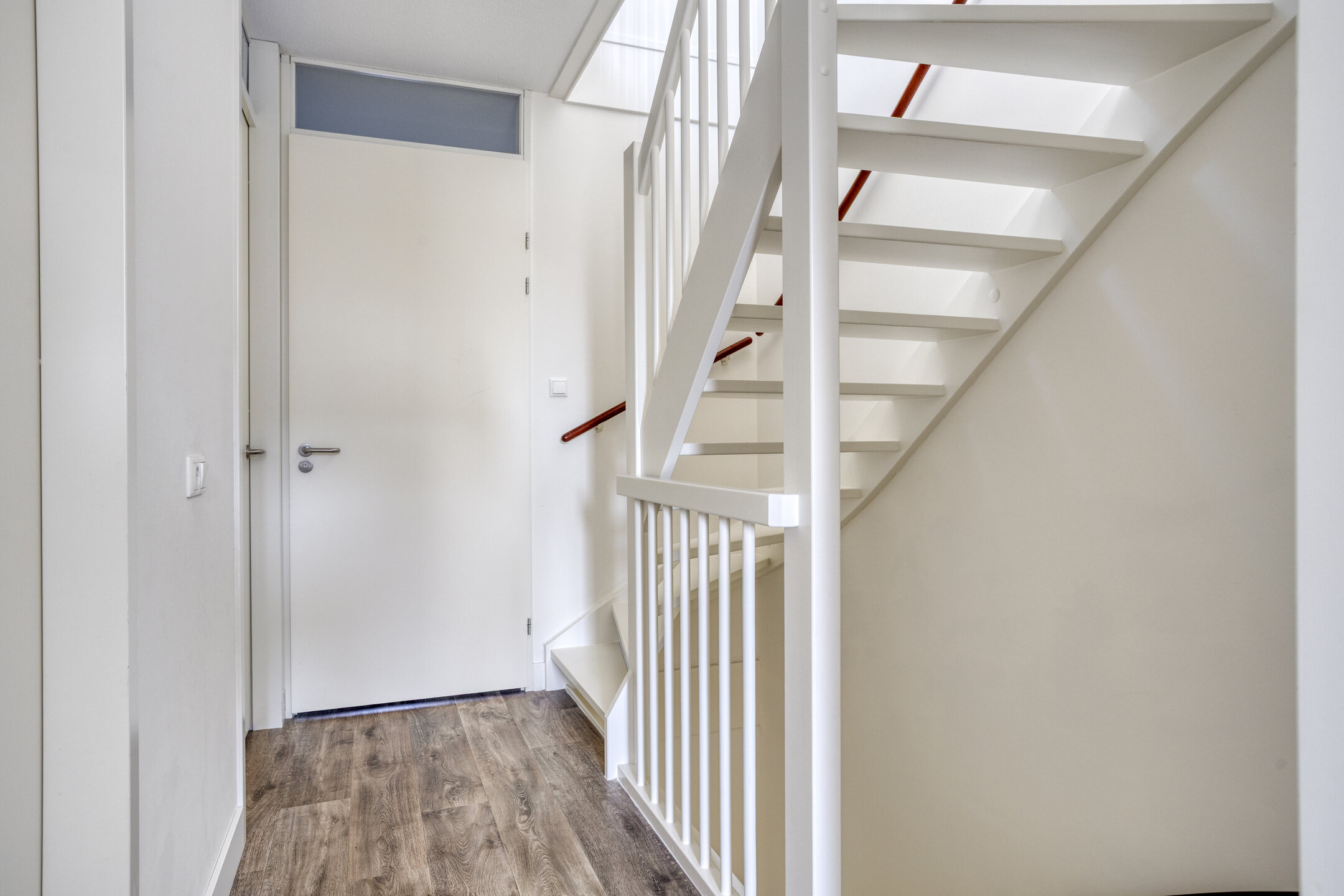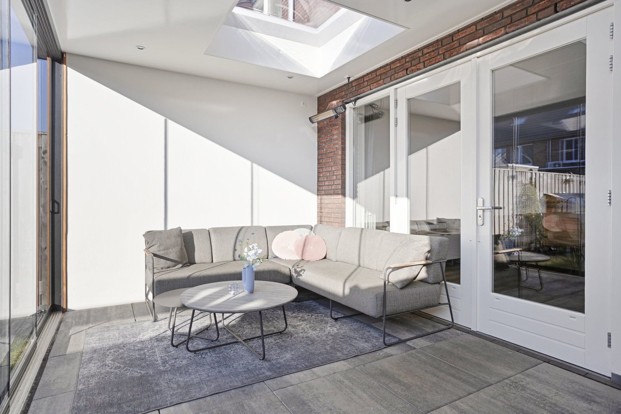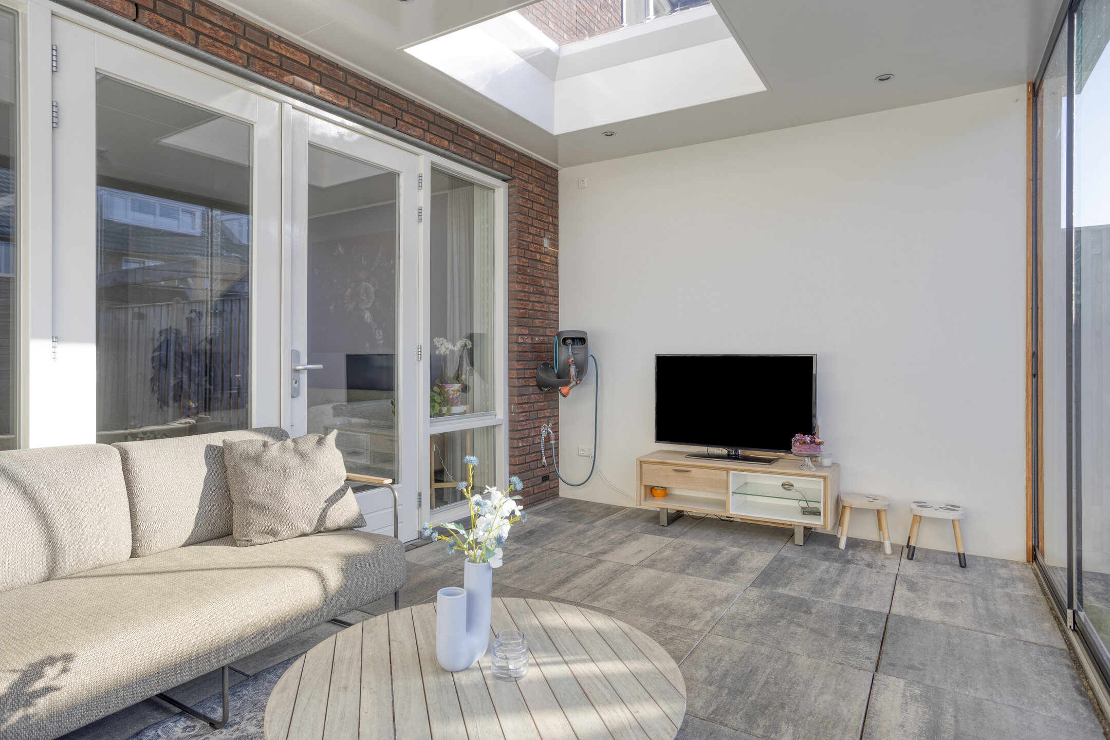 De voordeur opent zich naar een strak afgewerkte hal met modern toilet en trapopgang. Meteen valt de verzorgde sfeer op: lichte wanden, mooie vloeren en alles goed onderhouden. De woonkamer is tuingericht en de aangebouwde serre biedt een groot deel van het jaar een verlengde van de woonkamer. Door de grote glazen pui is deze in zonnige tijden ook eenvoudig bij de tuin te betrekken.