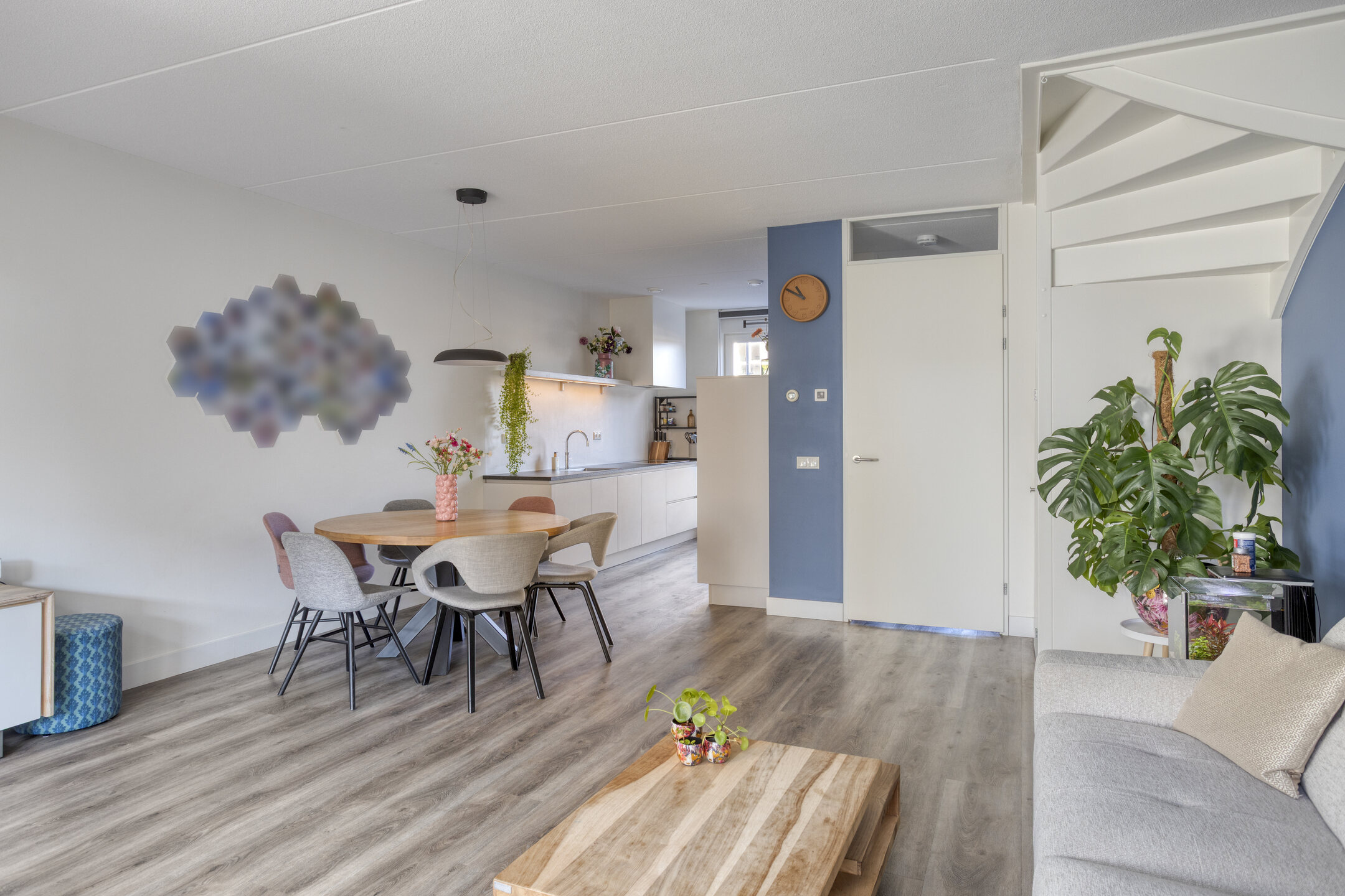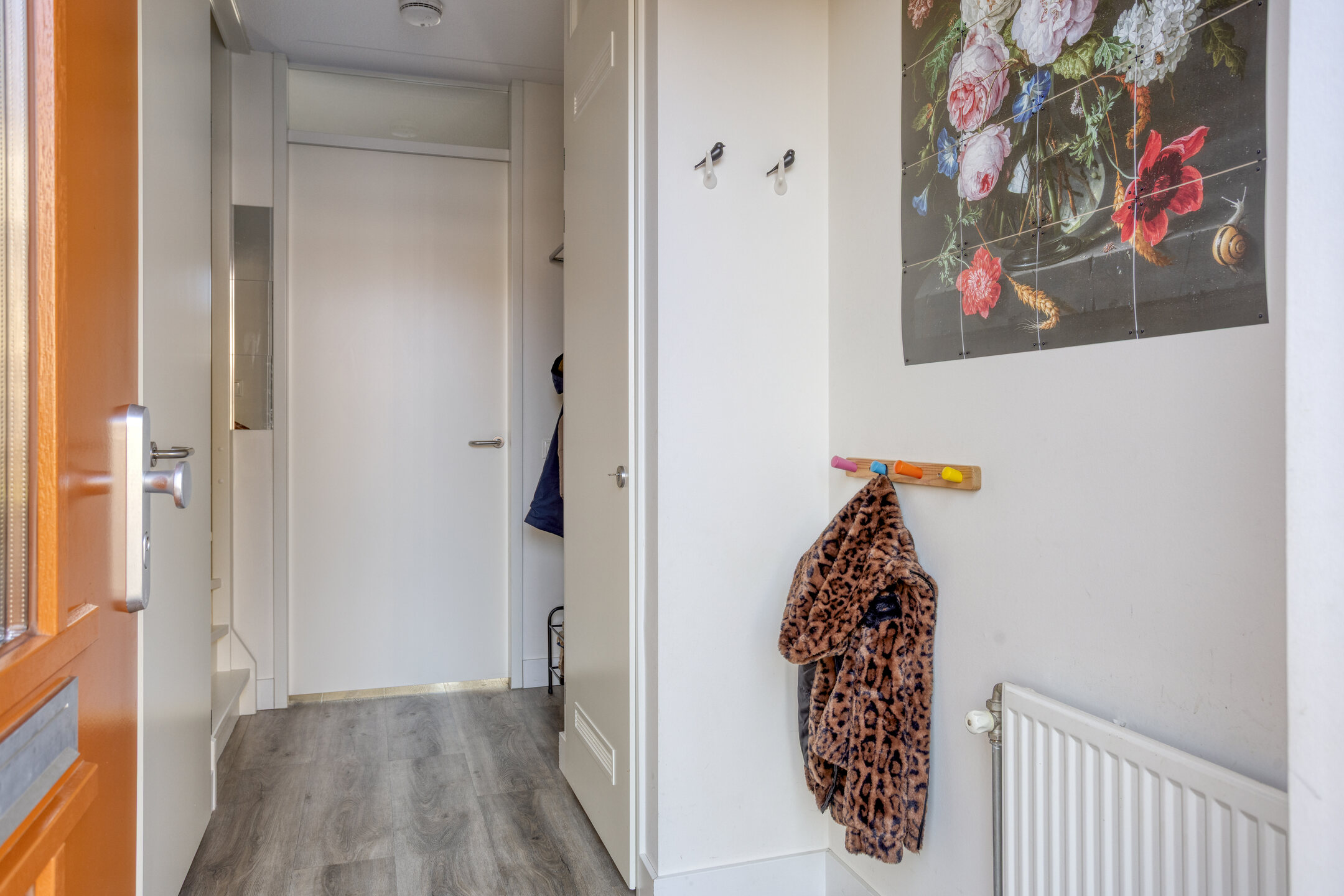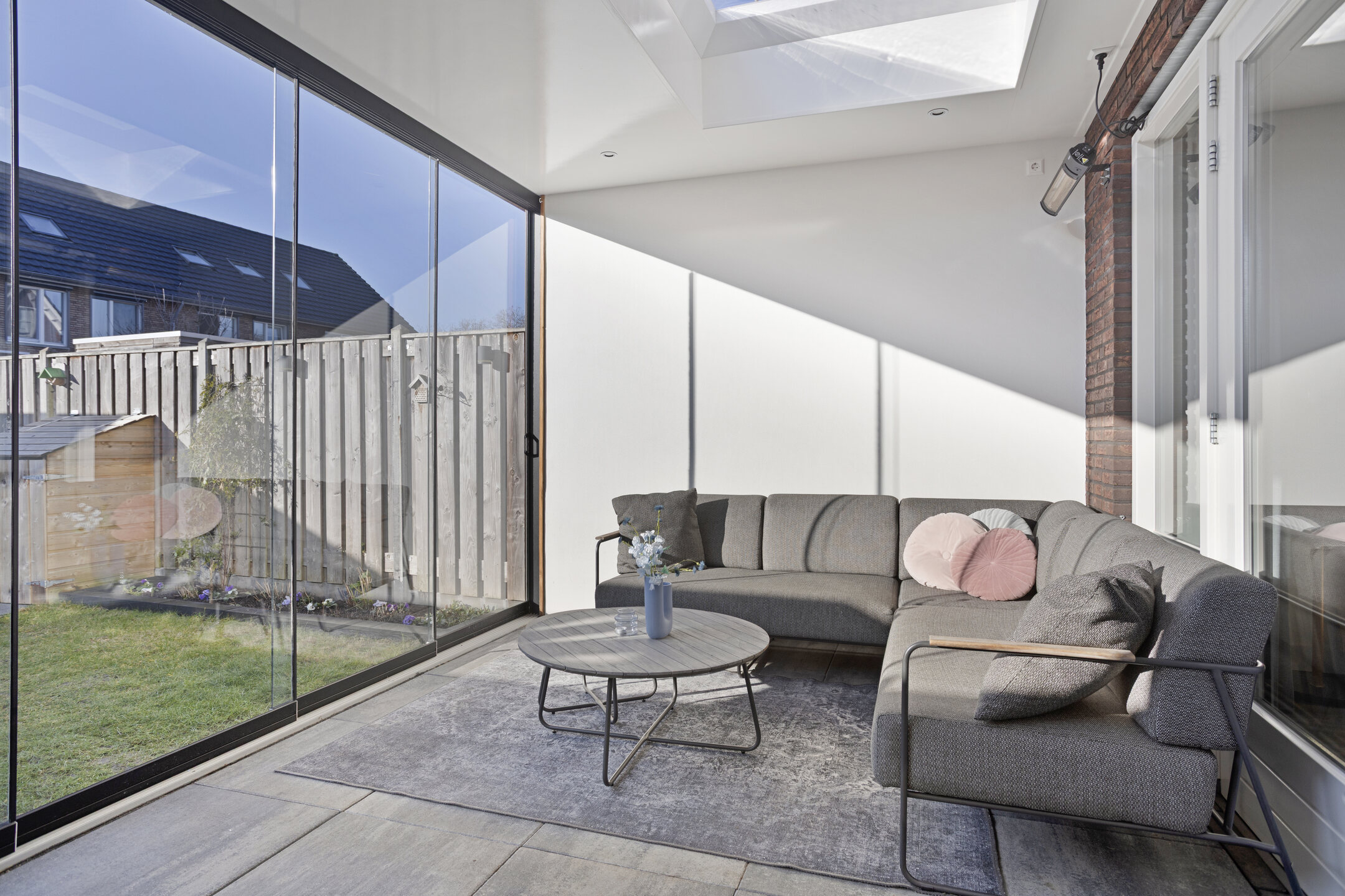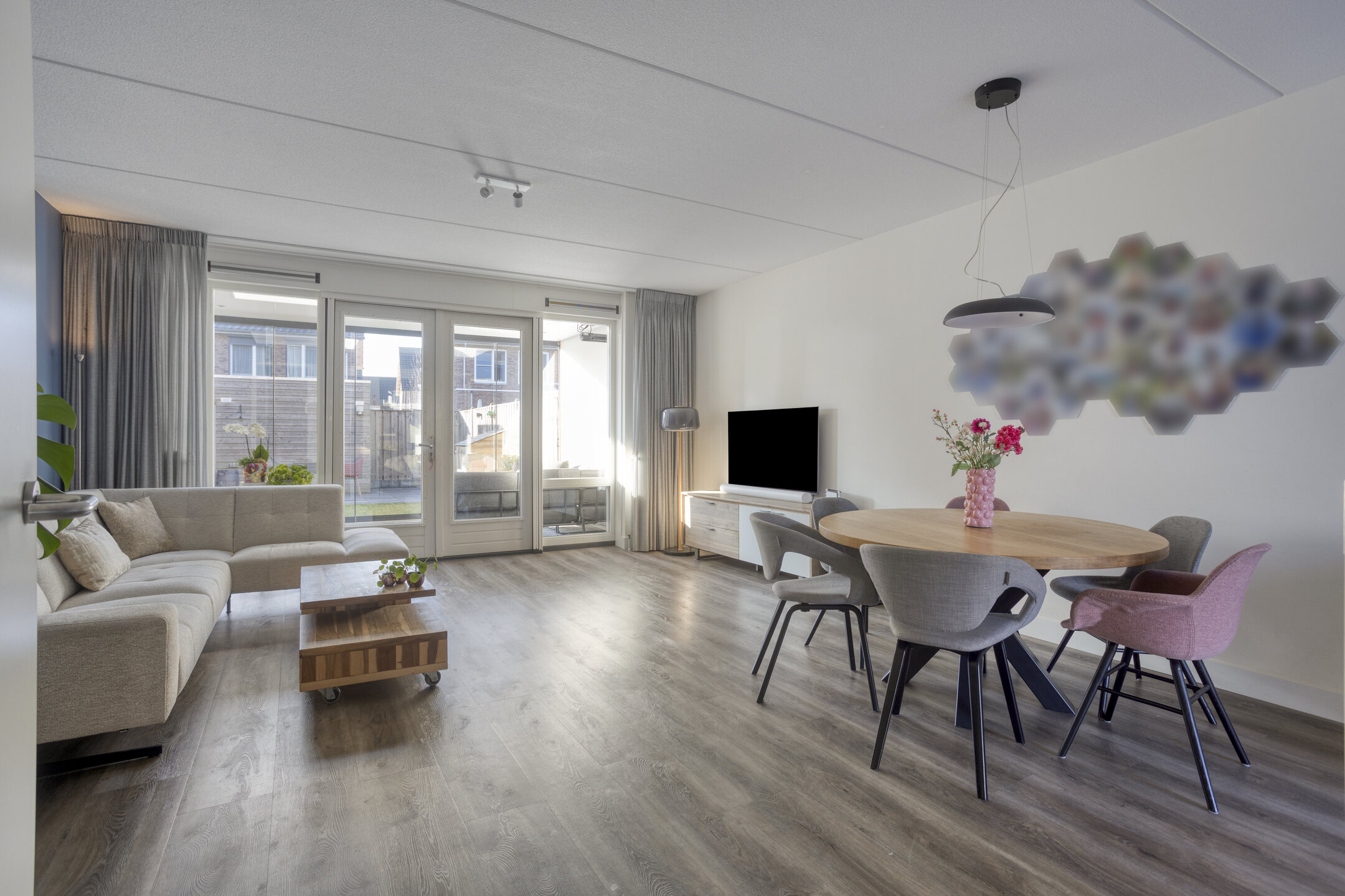 De voordeur opent zich naar een strak afgewerkte hal met modern toilet en trapopgang. Meteen valt de verzorgde sfeer op: lichte wanden, mooie vloeren en alles goed onderhouden. De woonkamer is tuingericht en de aangebouwde serre biedt een groot deel van het jaar een verlengde van de woonkamer. Door de grote glazen pui is deze in zonnige tijden ook eenvoudig bij de tuin te betrekken.