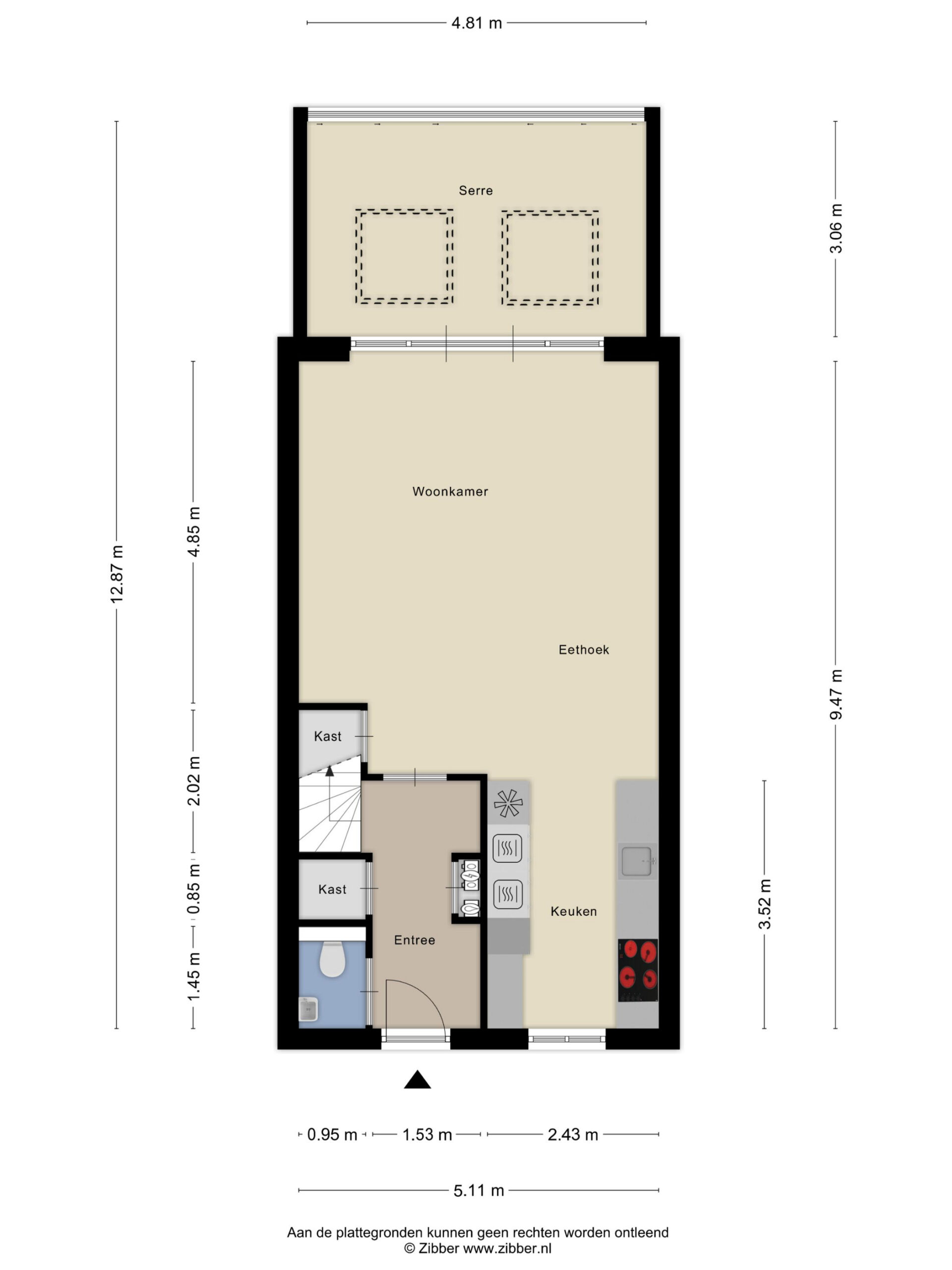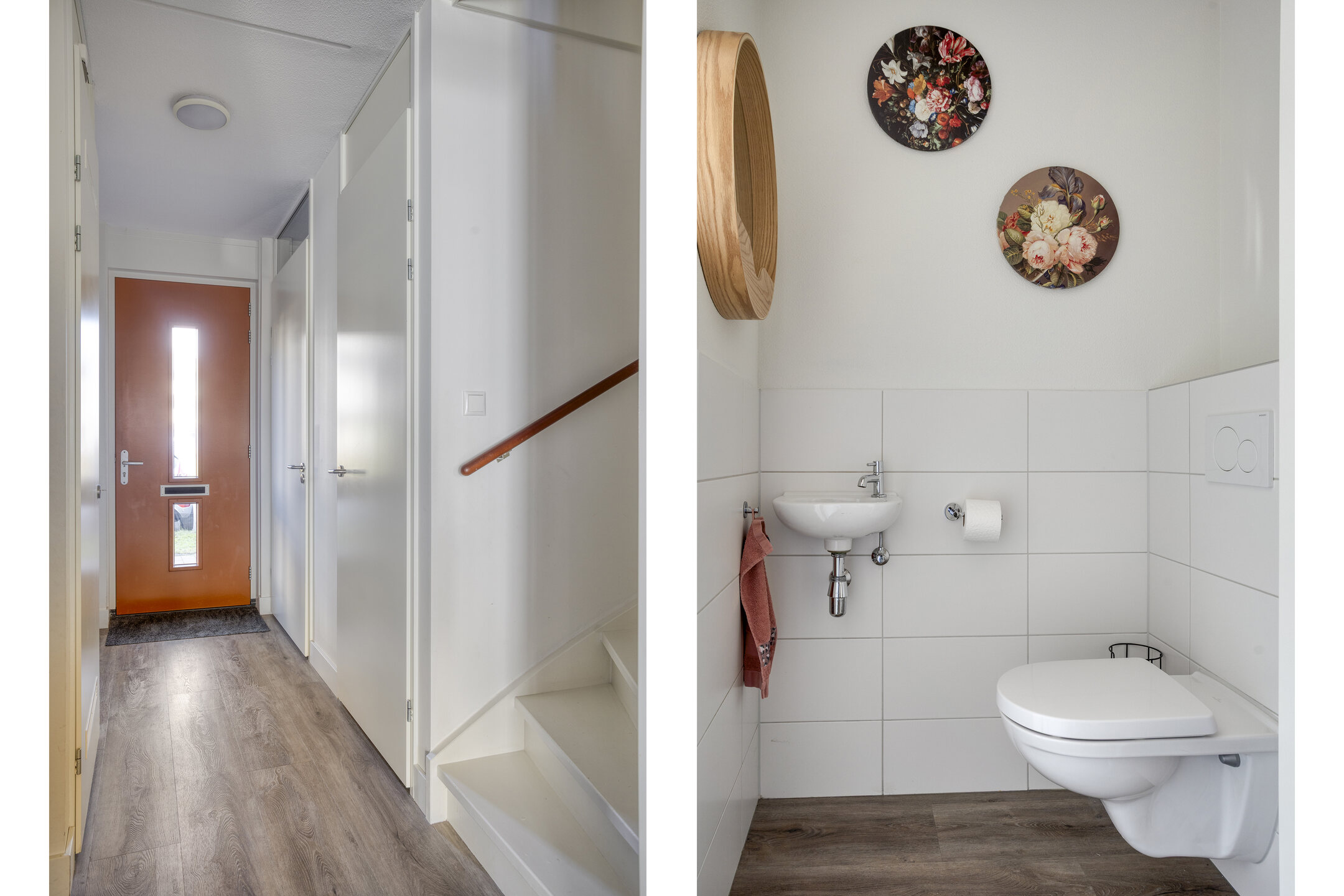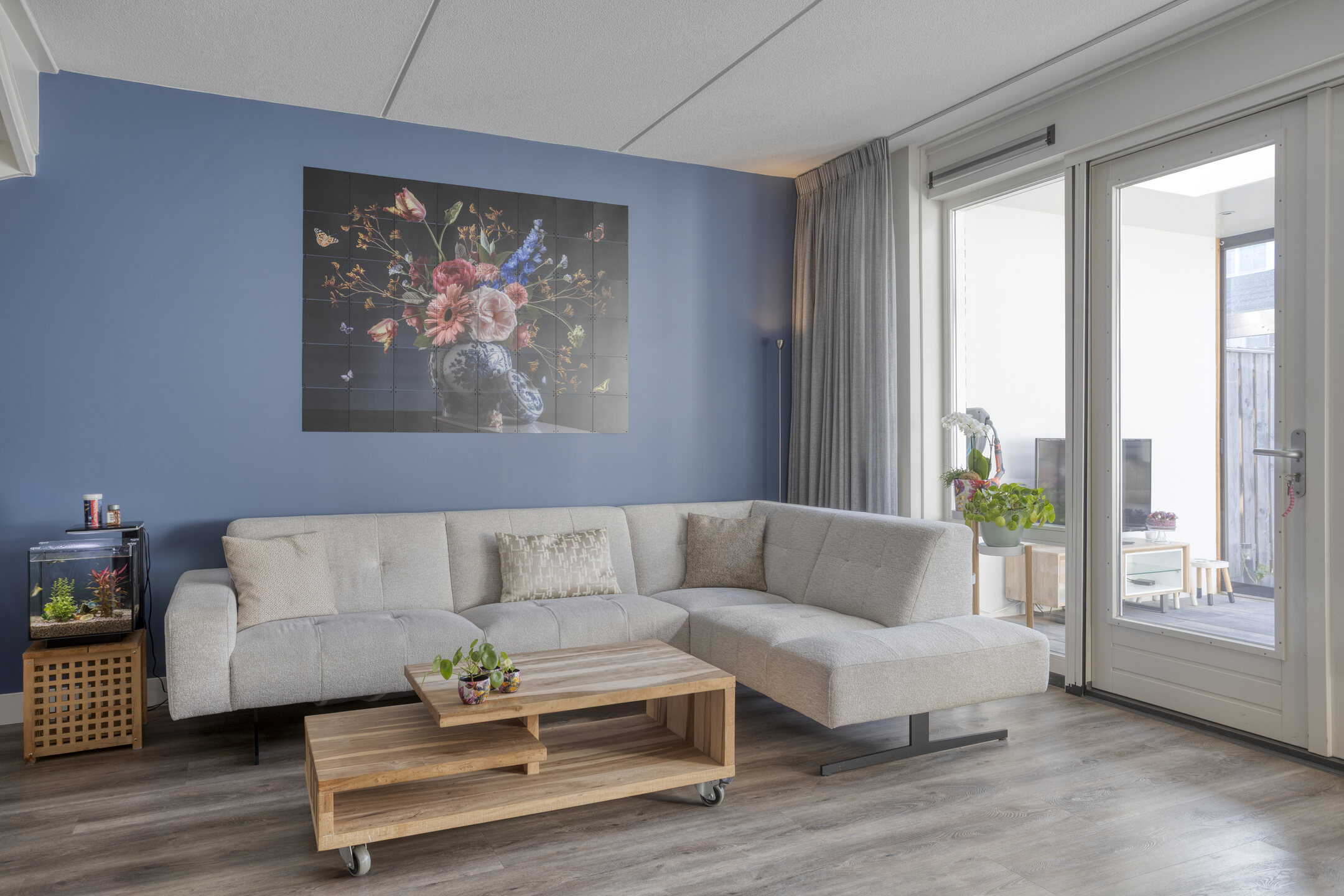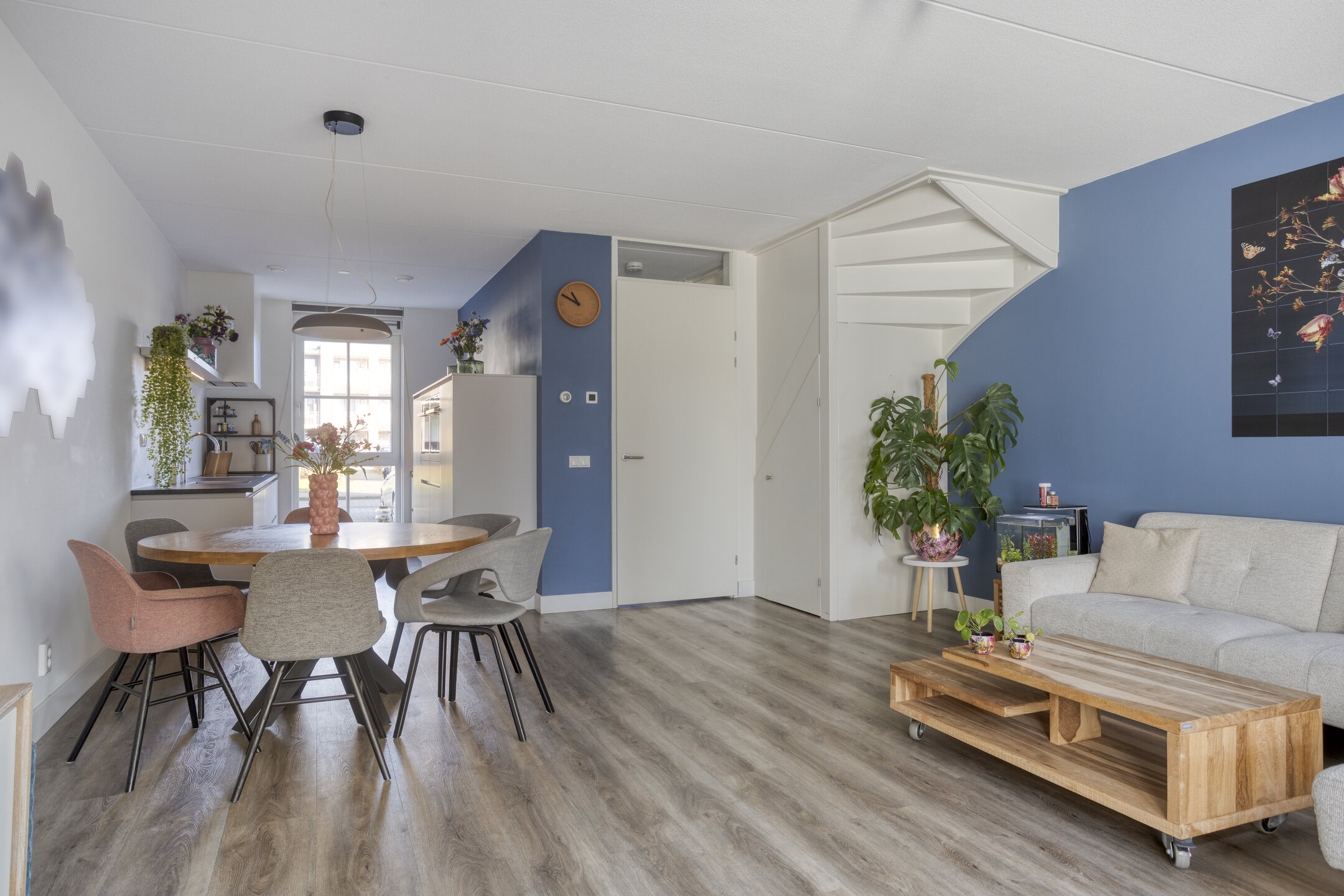 De voordeur opent zich naar een strak afgewerkte hal met modern toilet en trapopgang. Meteen valt de verzorgde sfeer op: lichte wanden, mooie vloeren en alles goed onderhouden. De woonkamer is tuingericht en de aangebouwde serre biedt een groot deel van het jaar een verlengde van de woonkamer. Door de grote glazen pui is deze in zonnige tijden ook eenvoudig bij de tuin te betrekken.
