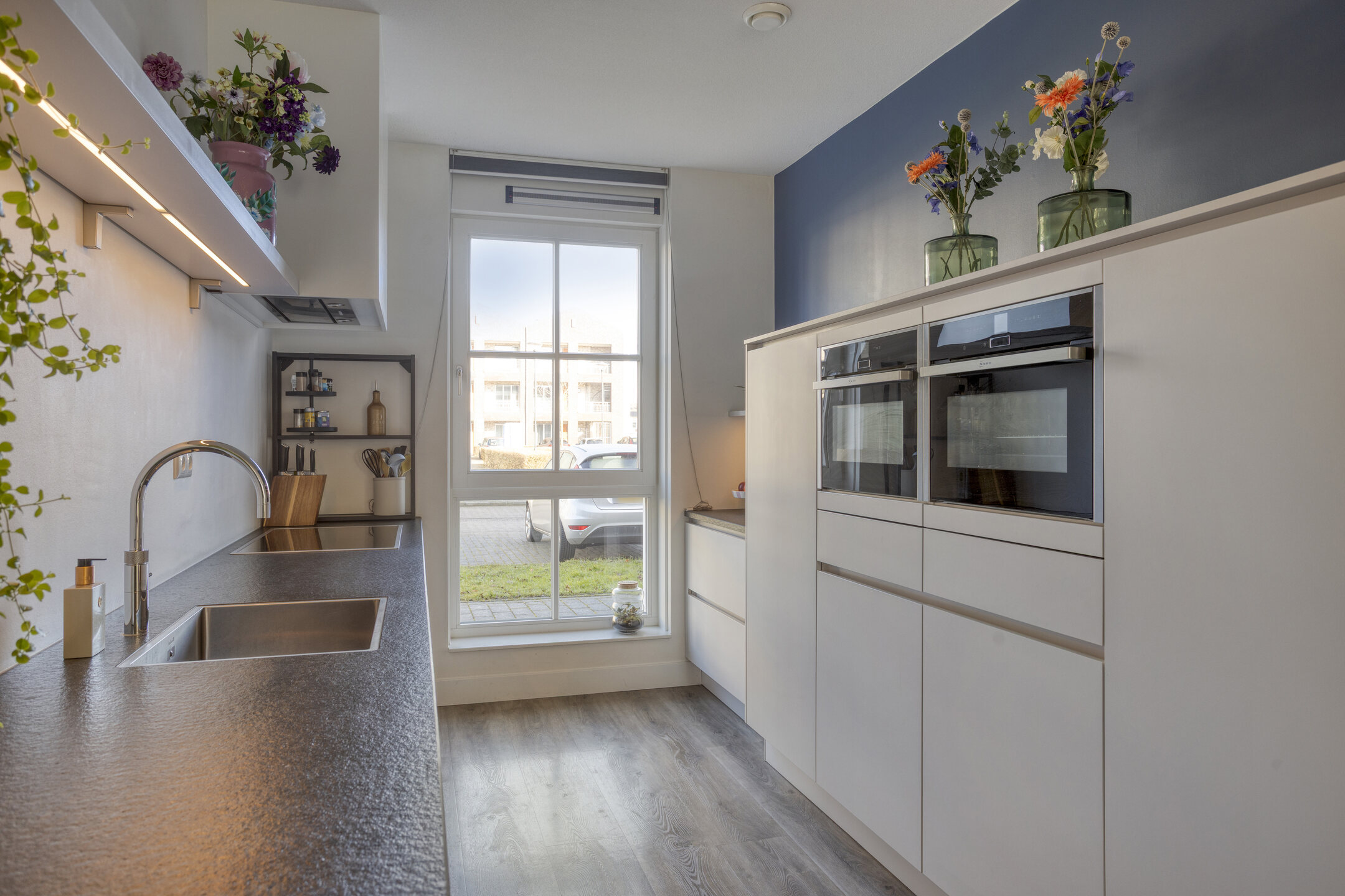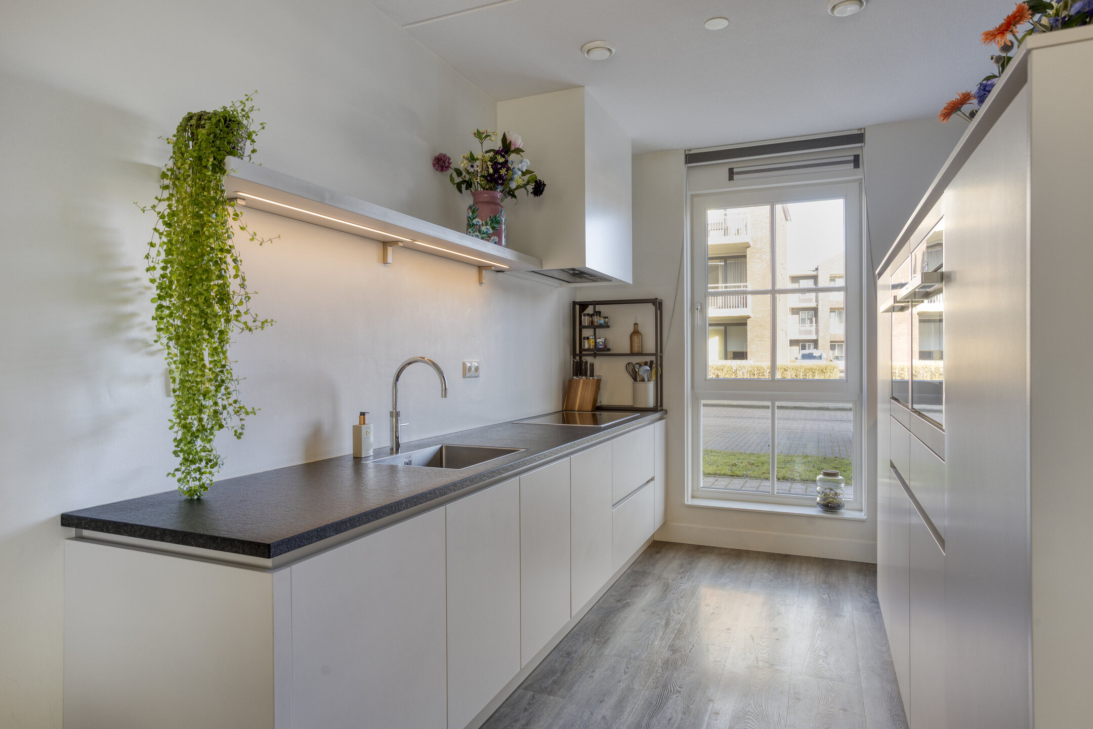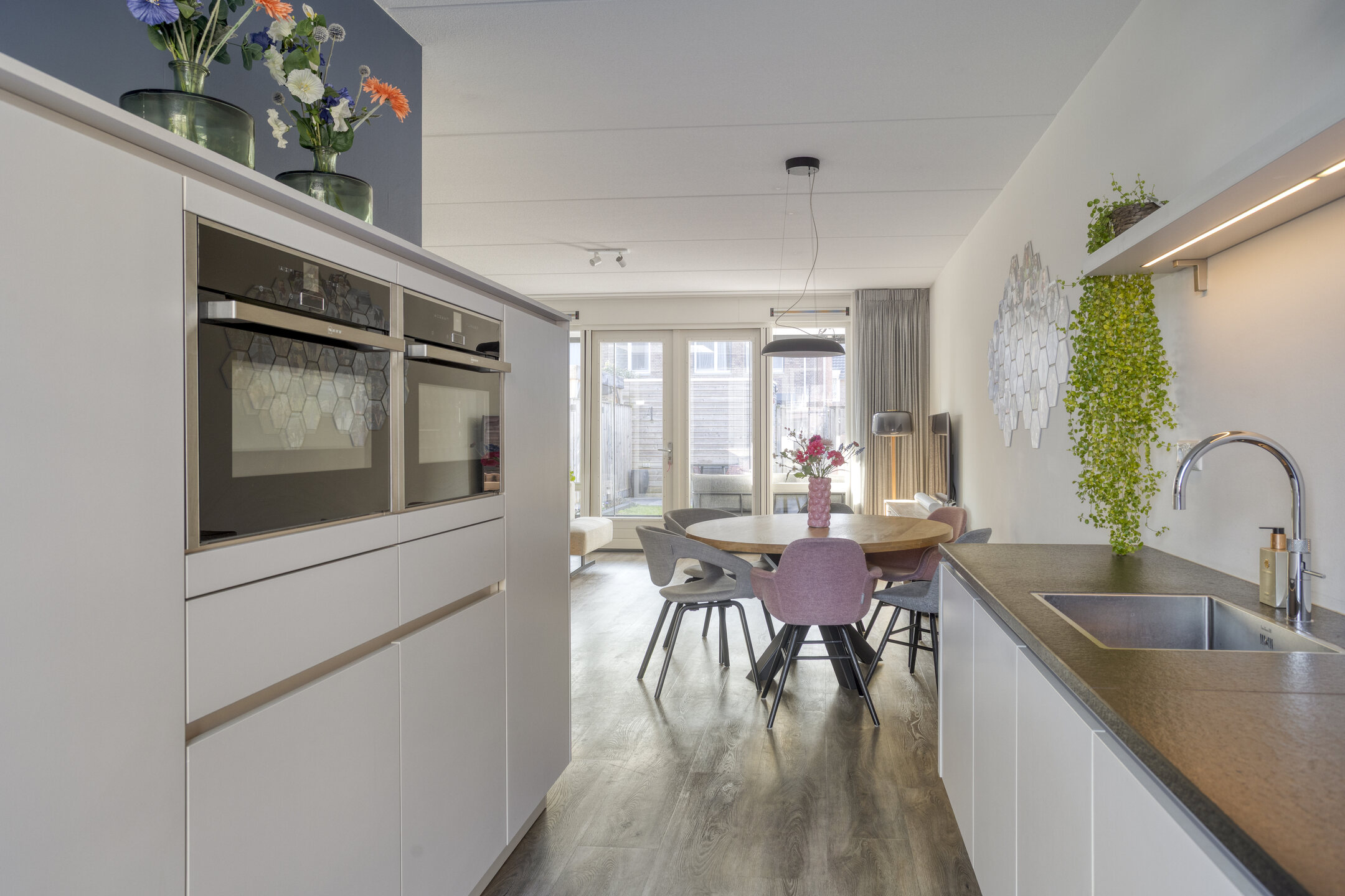 Aan de voorzijde ligt de open keuken met moderne inbouwapparatuur (brede inductiekookplaat, Quooker, vaatwasser (2025), oven, combi oven, koelkast, vriezer) en veel werkruimte.