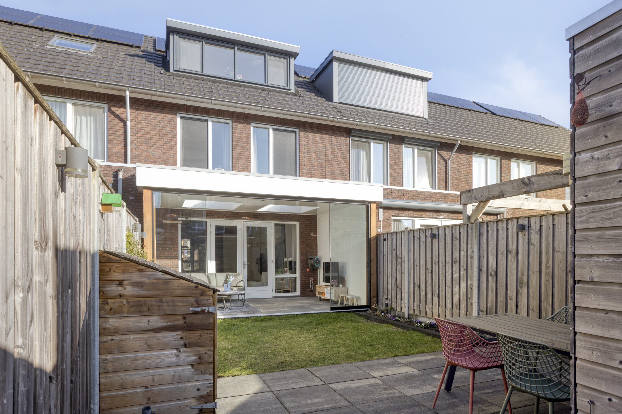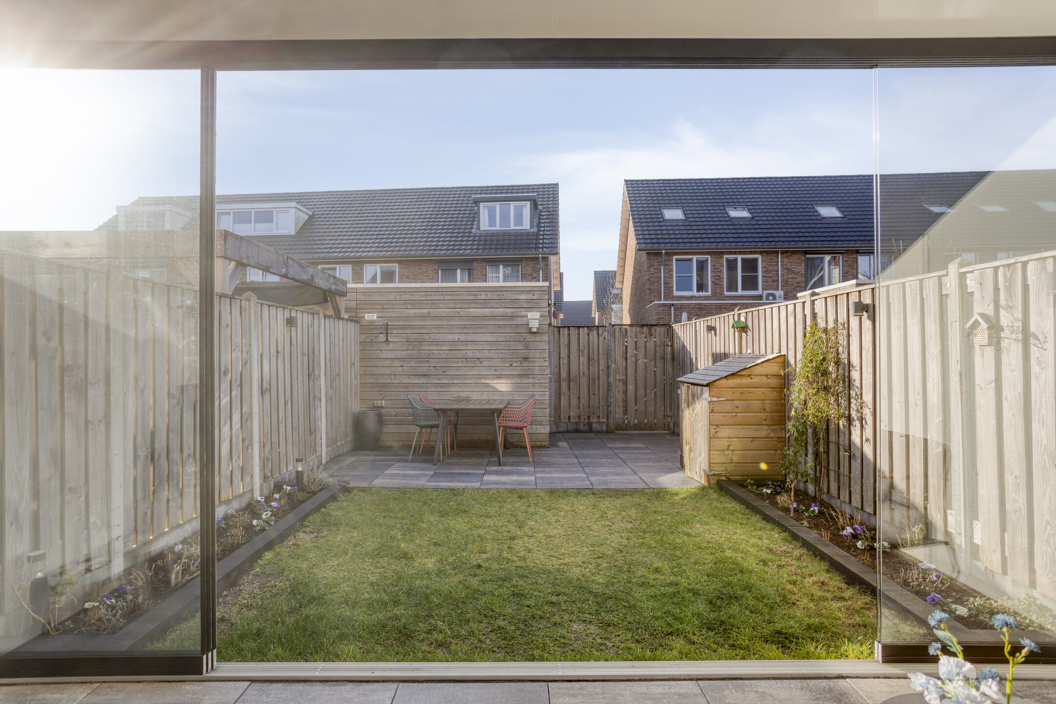 Buiten ligt de zonnige achtertuin van ca. 60 m² met achterom. De tuin is verzorgd aangelegd, onderhoudsvriendelijk én praktisch: met een houten berging voorzien van elektra en een overkapping aan het huis creëert een fijne tuinkamer/serre. Hier zit je beschut en privé, van vroege lente tot late nazomer.