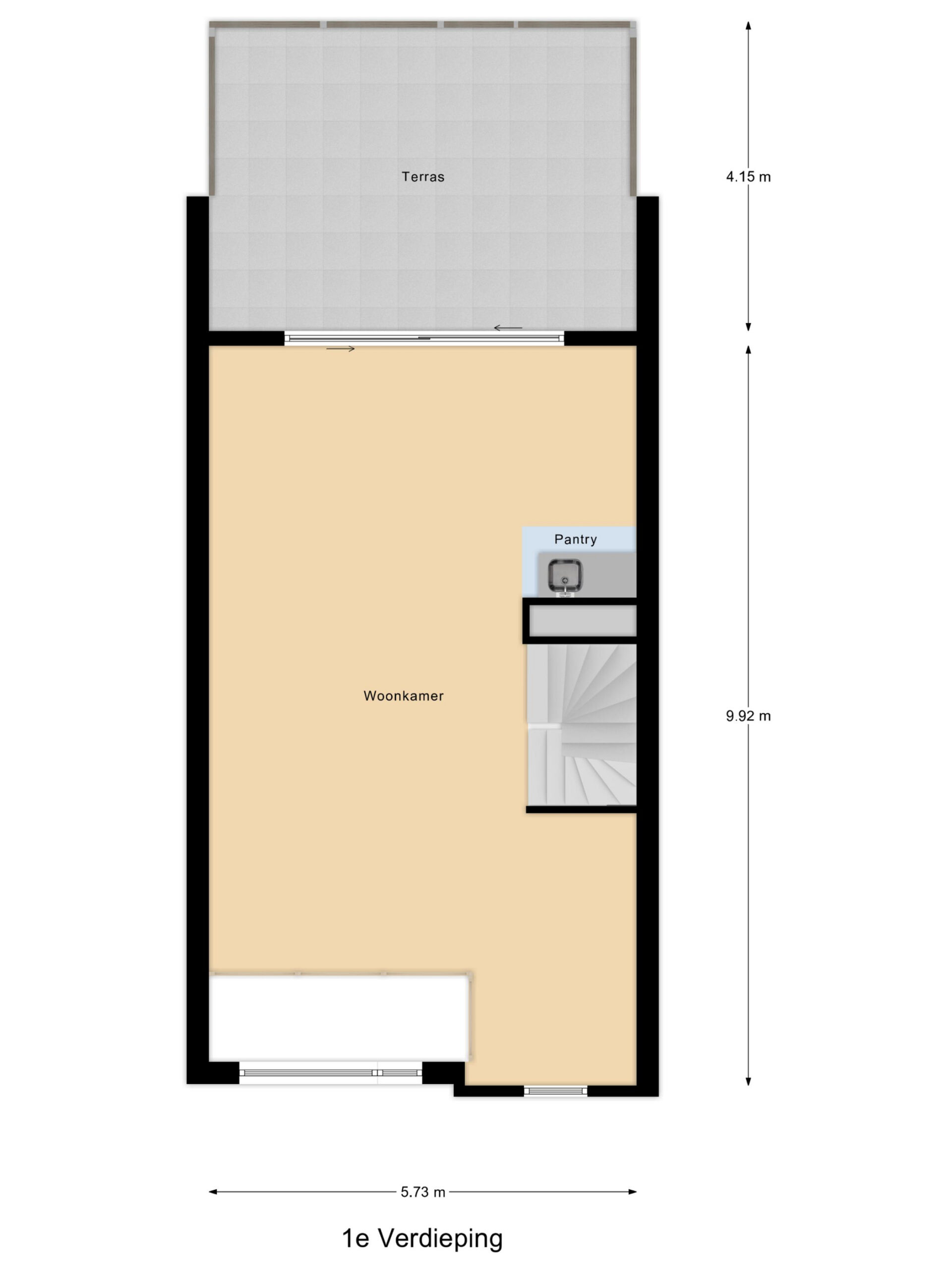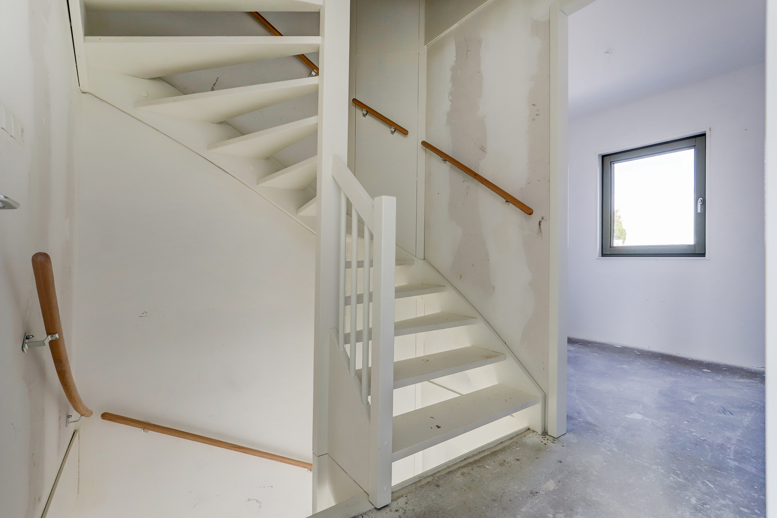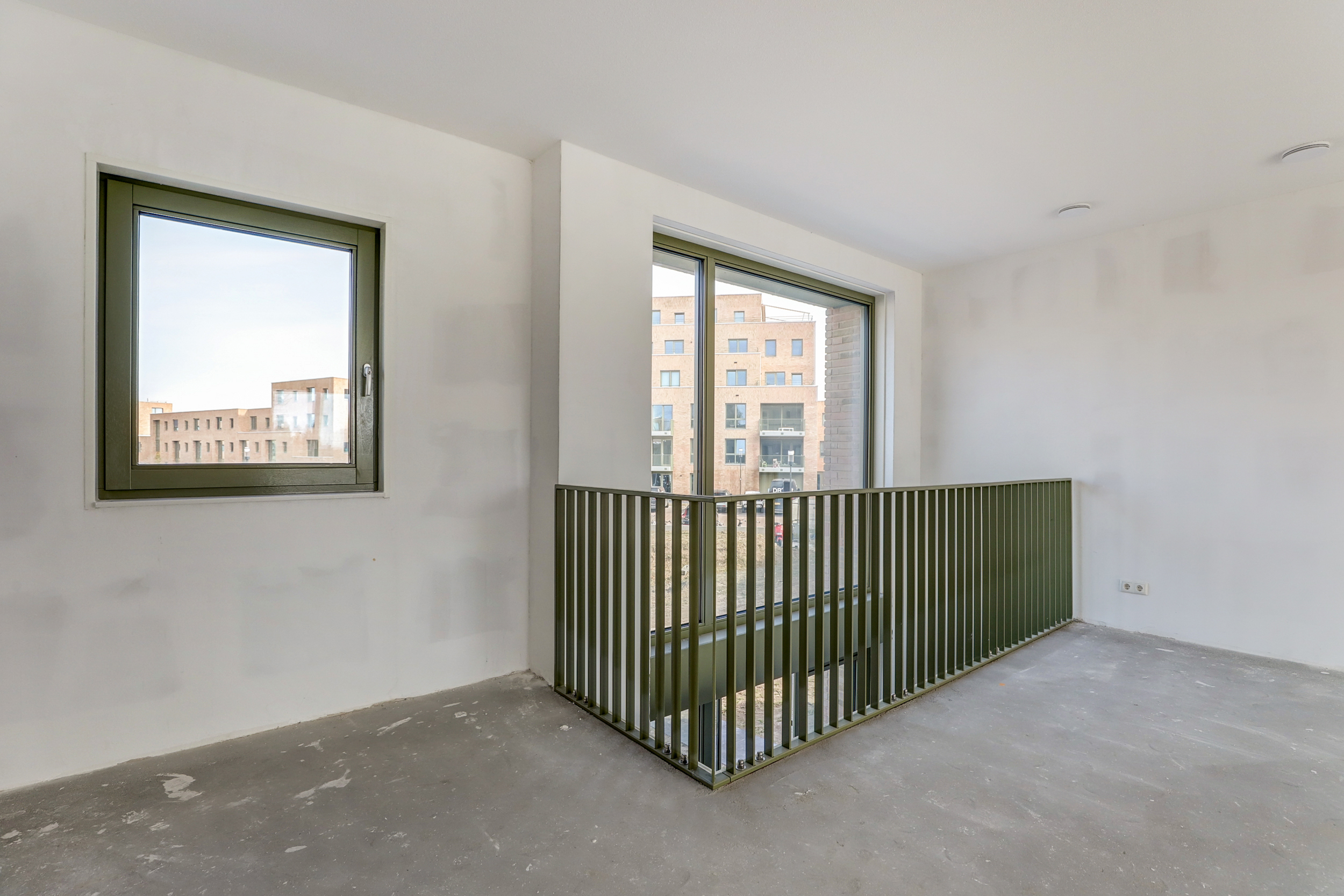 Een bijzonder element van deze woning is de vide, die de woonkeuken op de begane grond in directe verbinding brengt met de woonkamer op de eerste verdieping. De woonkamer is royaal van opzet en biedt via openslaande deuren toegang tot het zonnige terras op het zuidwesten. Hier geniet je van weids uitzicht over het groen van de uiterwaarden, een unieke plek om in alle rust van buiten te genieten. In de woonkamer bevindt zich bovendien een praktische pantry met koelkast en spoelbak, zodat je niet naar de keuken op de begane grond hoeft voor drankjes of een hapje.