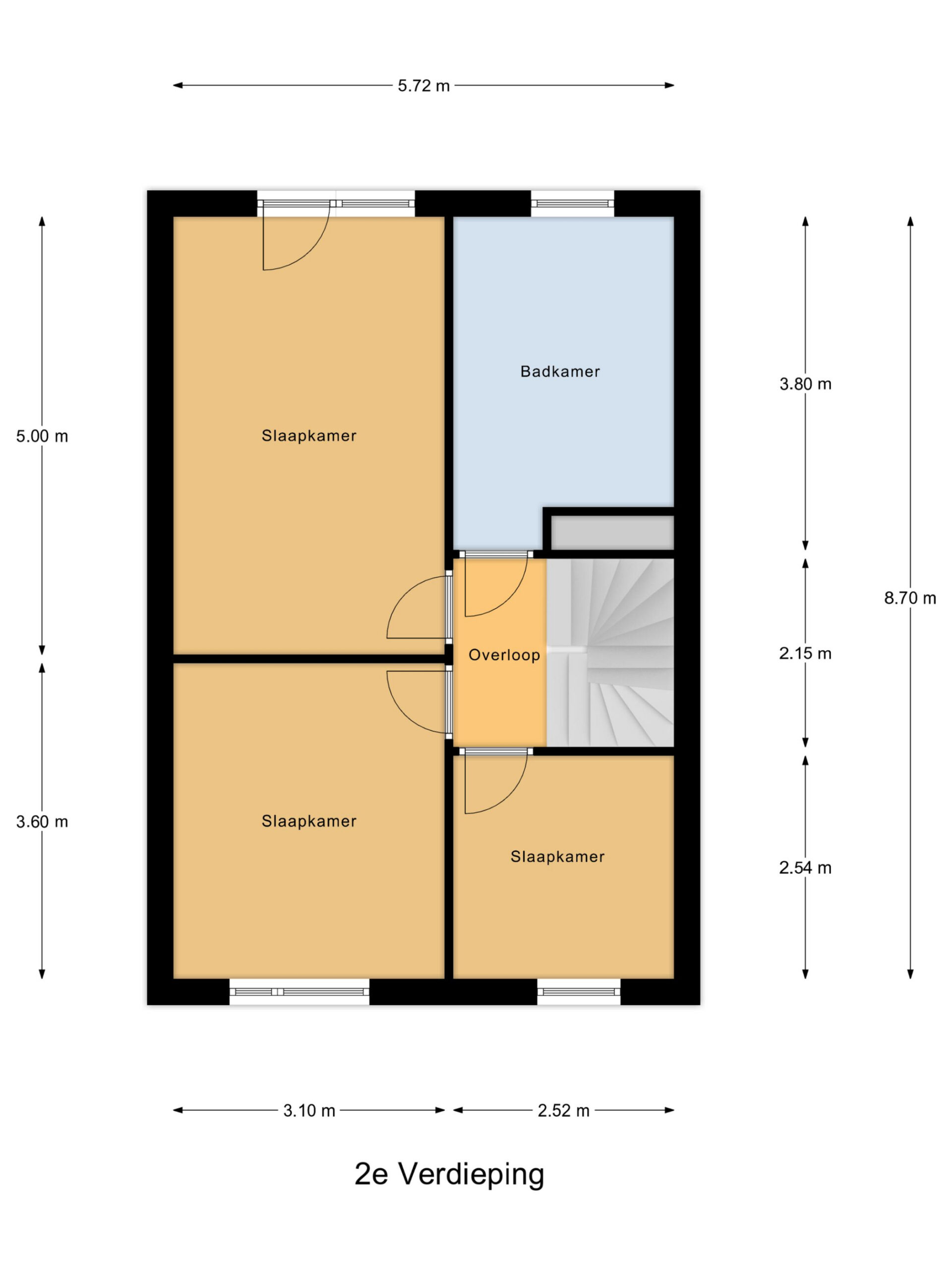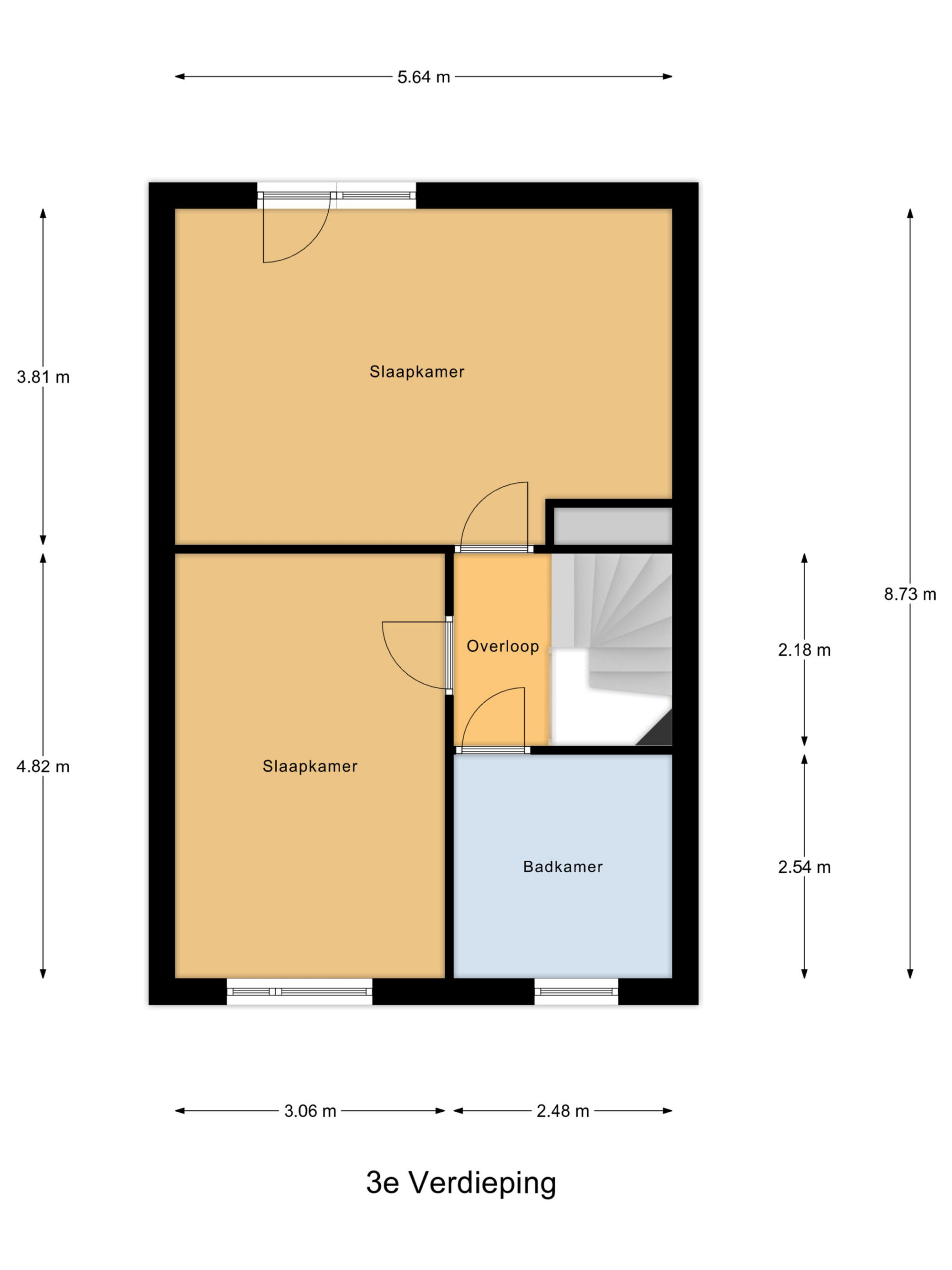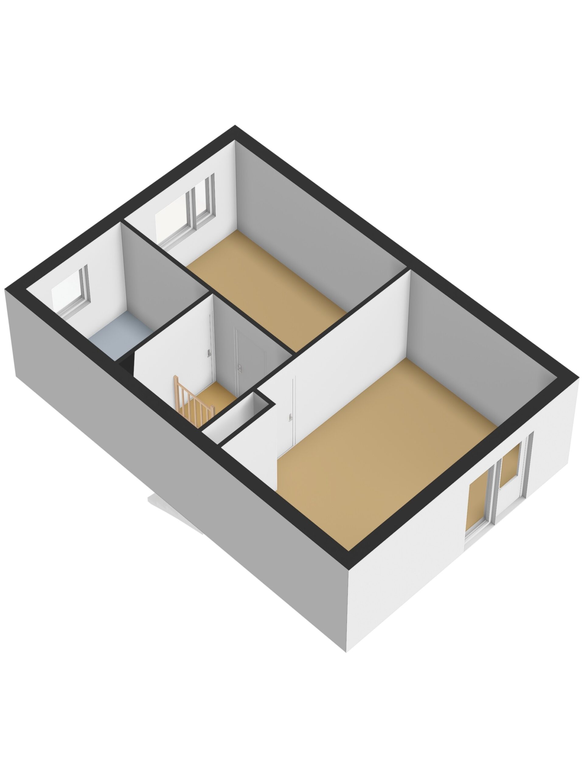 Op deze verdieping bevinden zich drie slaapkamers van goed formaat en de badkamer (ca. 9 m²). De badkamer is nog geheel naar eigen wens in te richten maar er is voldoende ruimte voor een ligbad, douche, toilet en wastafelmeubel. De indeling is praktisch en ideaal voor een gezin.