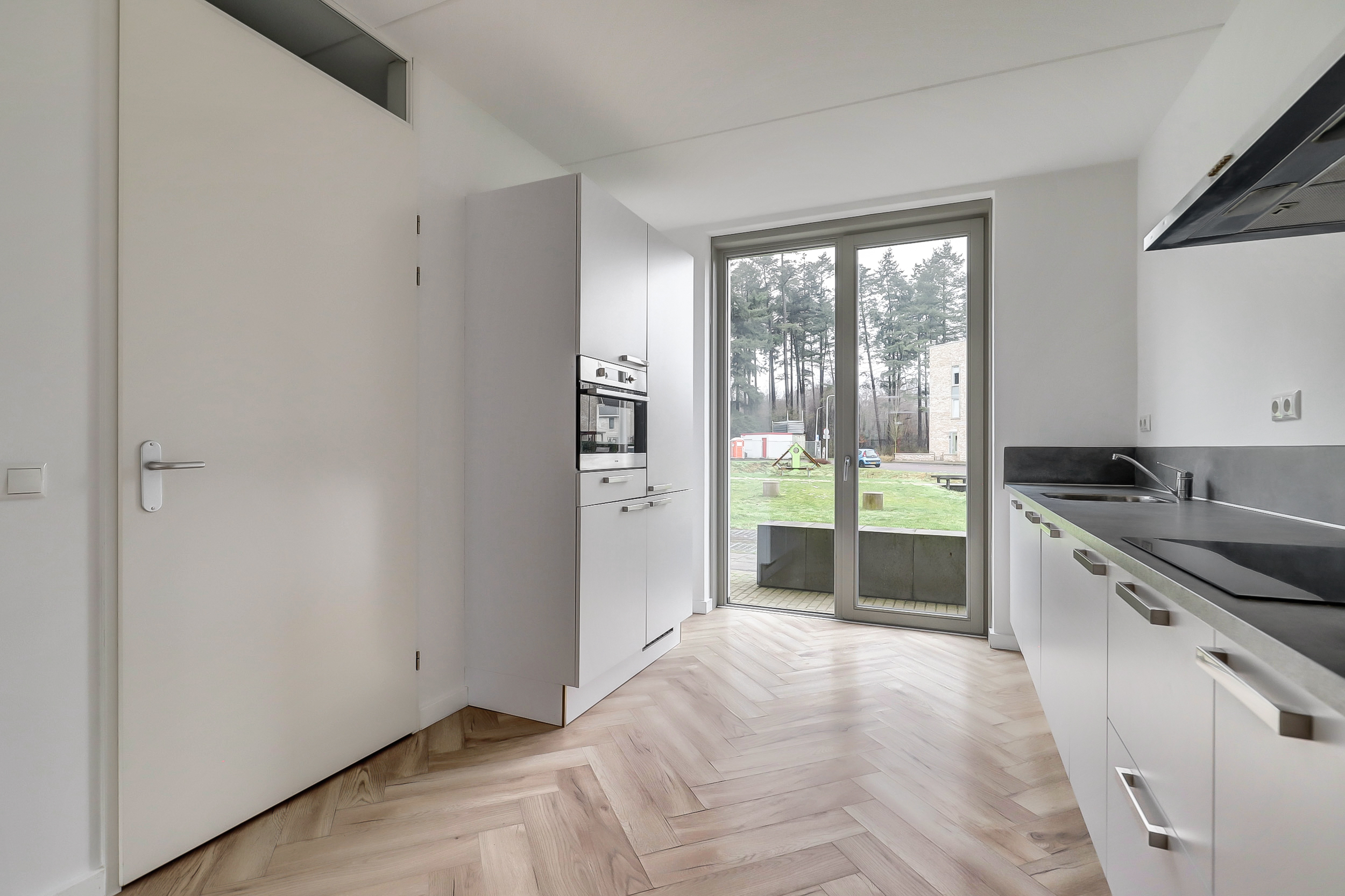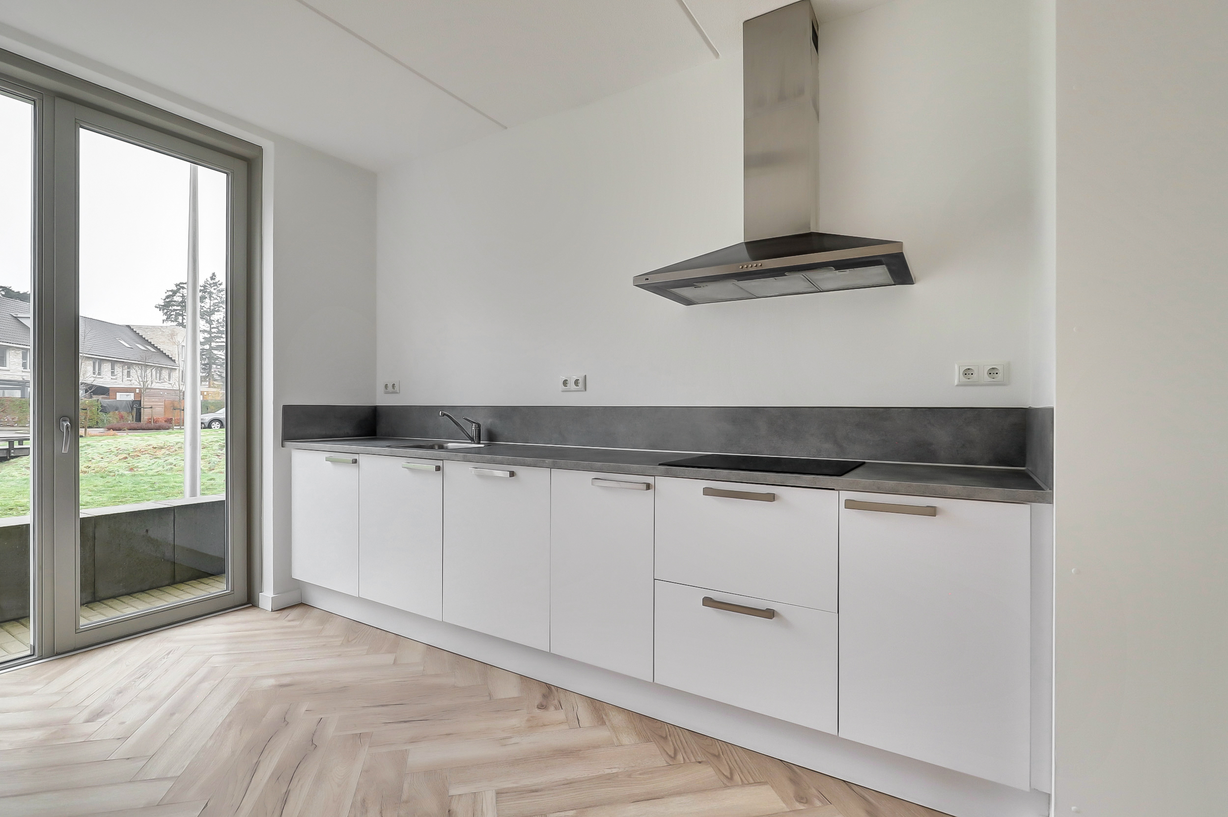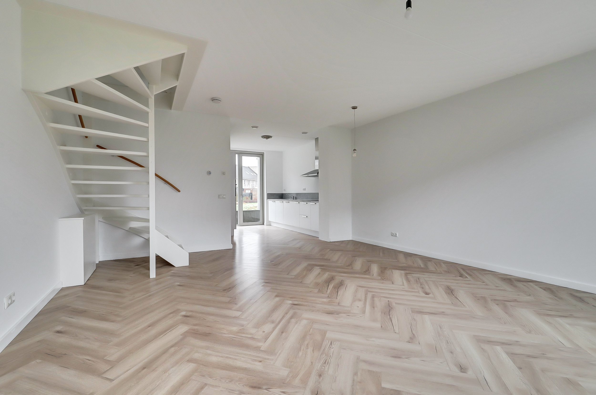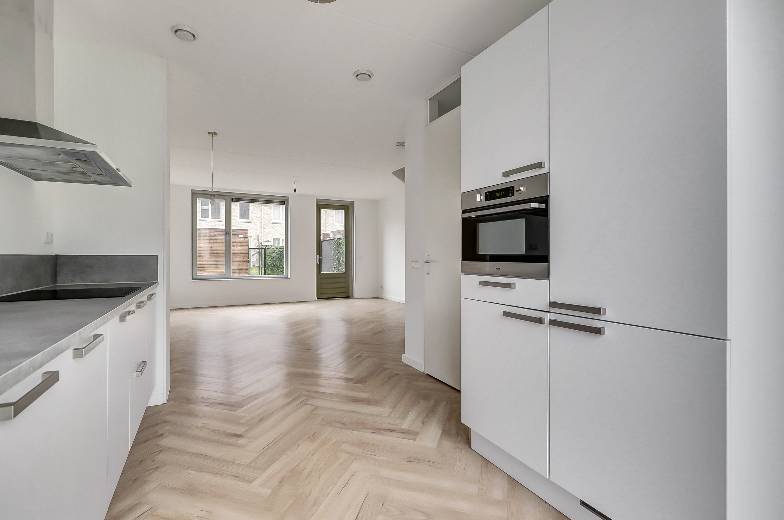 Je stapt binnen in een verzorgde hal met toilet en fontein, en toegang tot de meterkast. Vanuit hier loop je door naar de woonkamer aan de tuinzijde. Het vele daglicht dat de woning binnenvalt zorgt voor een open en sfeervolle ambiance, terwijl de deur naar de tuin een prettige verbinding met de buitenruimte biedt. De woonkamer is afgewerkt met een stijlvolle visgraadvloer en de begane grond is bovendien voorzien van comfortabele vloerverwarming. De open trap naar de eerste verdieping is praktisch geplaatst om de ruimte optimaal te benutten. De keuken aan de voorzijde biedt volop werkruimte en is voorzien van een raam dat volledig geopend kan worden, wat zorgt voor extra licht en ventilatie. De combi-oven, inductiekookplaat, vaatwasser en koel-vriescombinatie geven je alle vrijheid om dagelijks heerlijke maaltijden te bereiden.Â