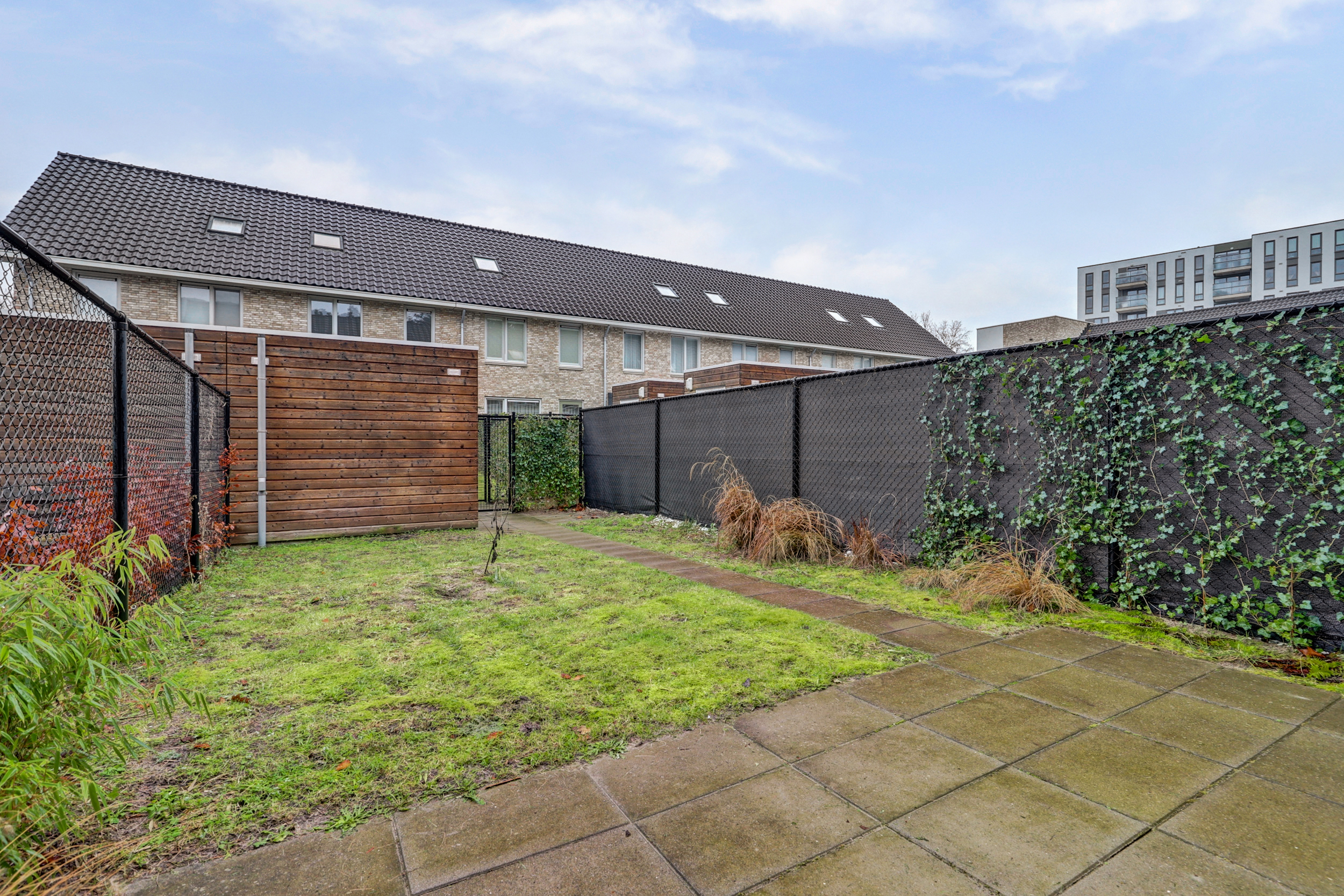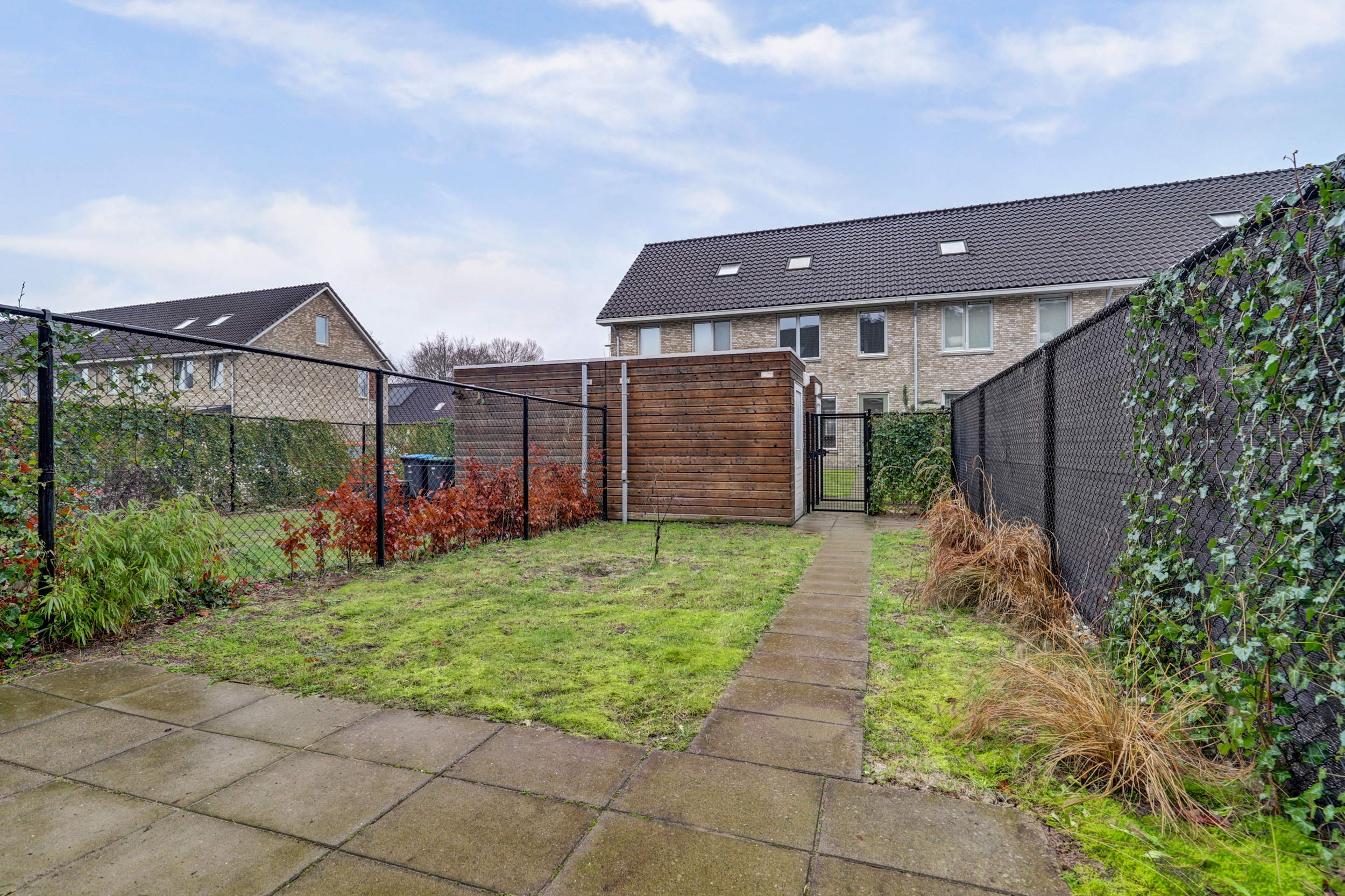 De achtertuin ligt op het noord-oosten. Het terras en het gras nodigen uit om te ontspannen, te spelen of te tuinieren.Â