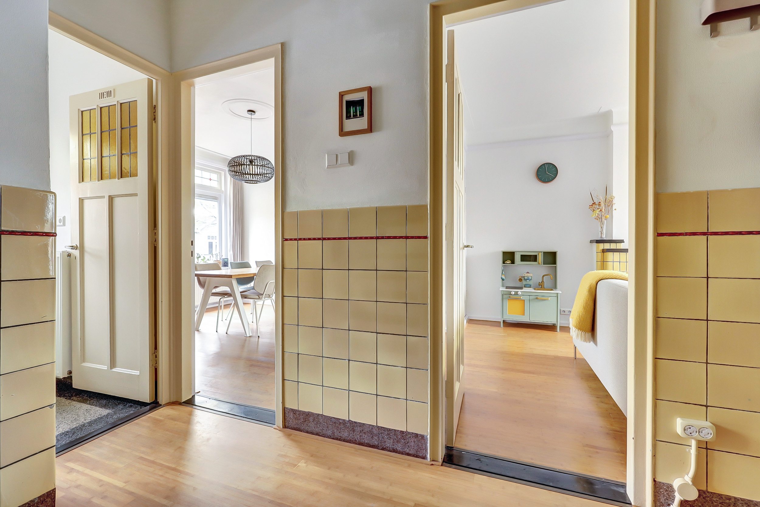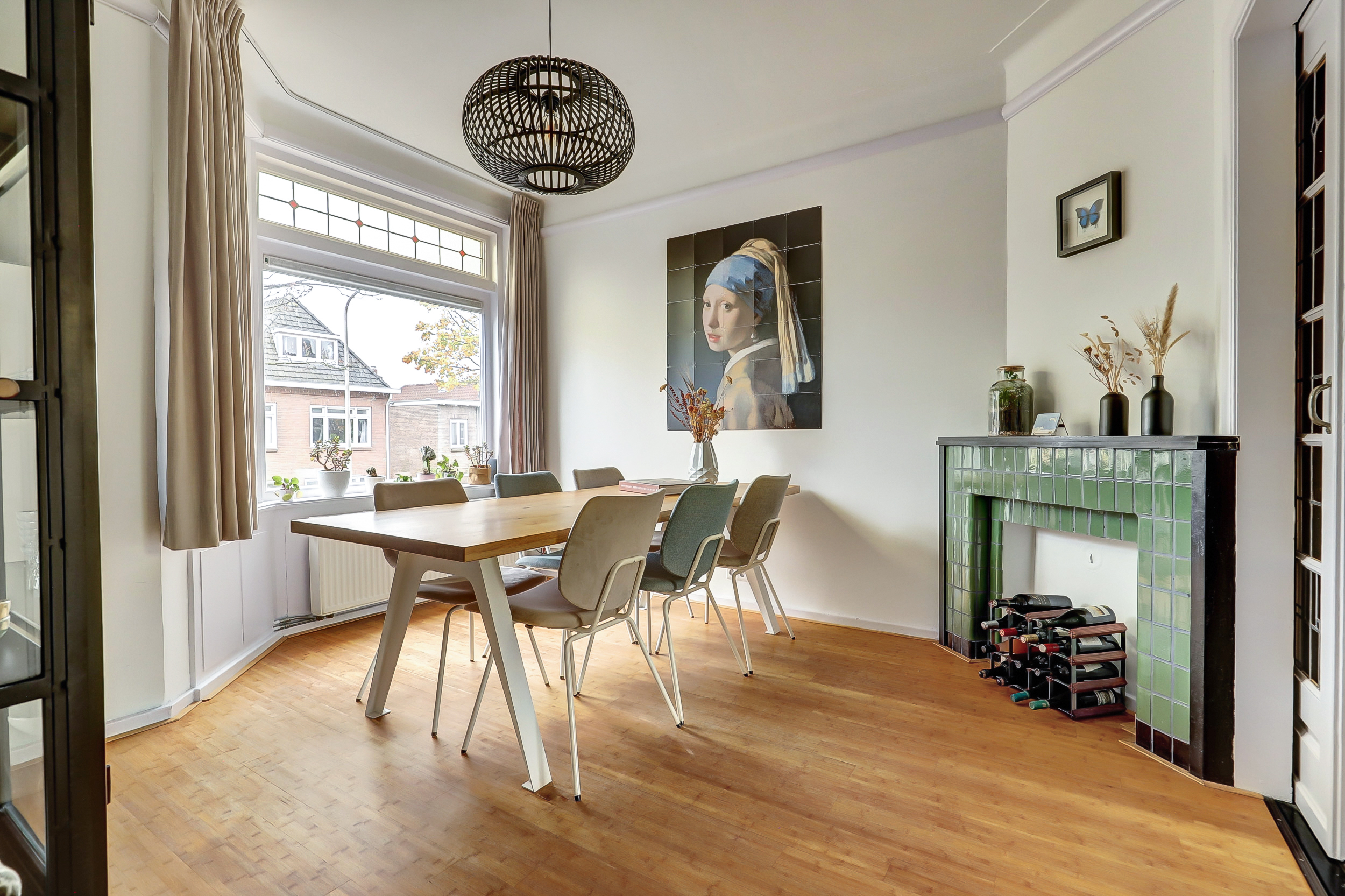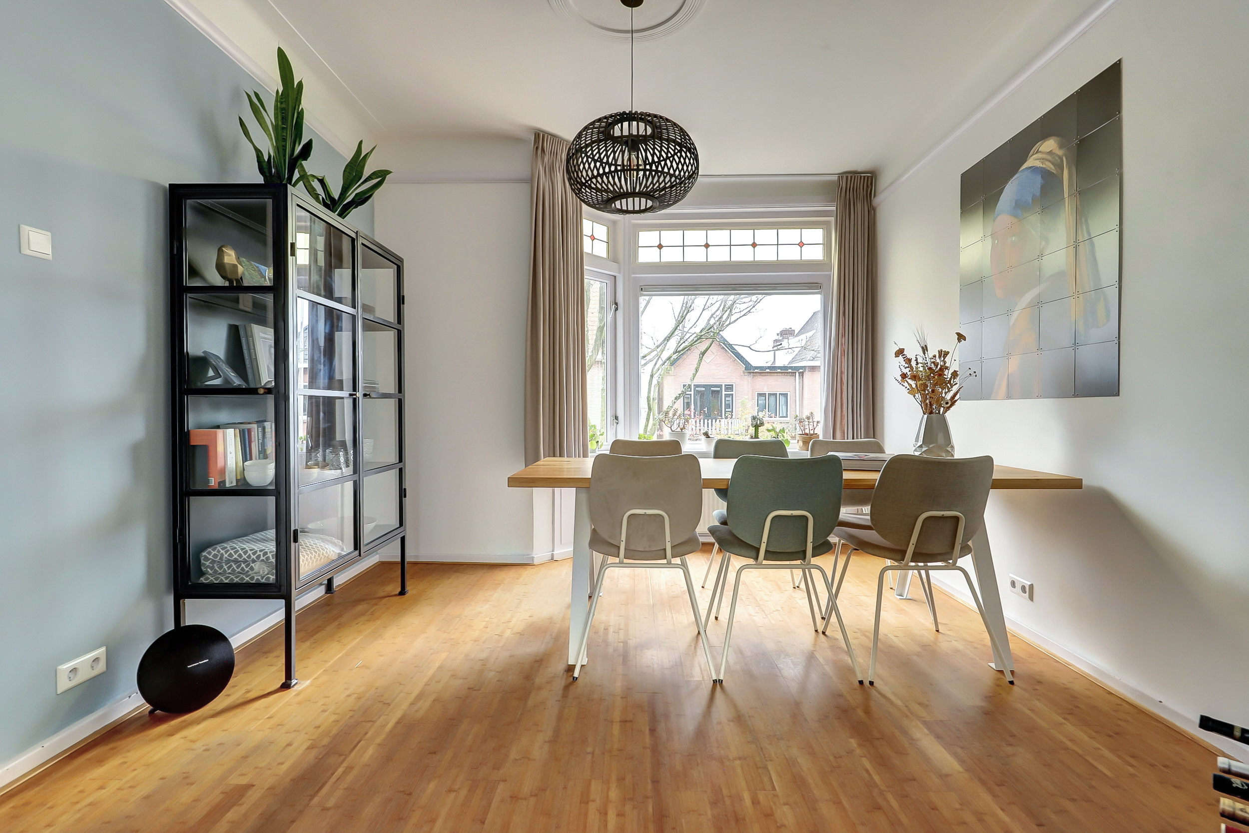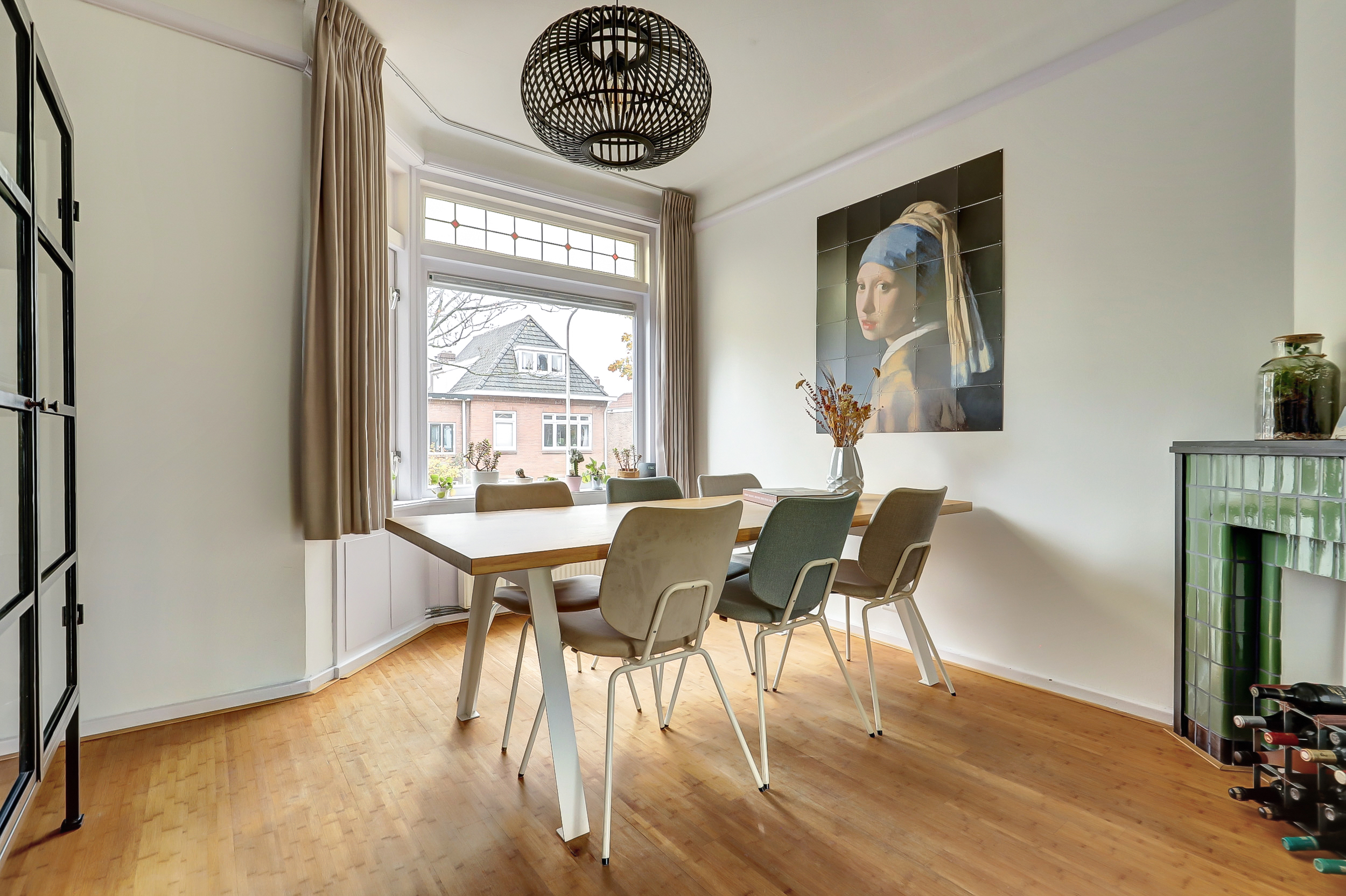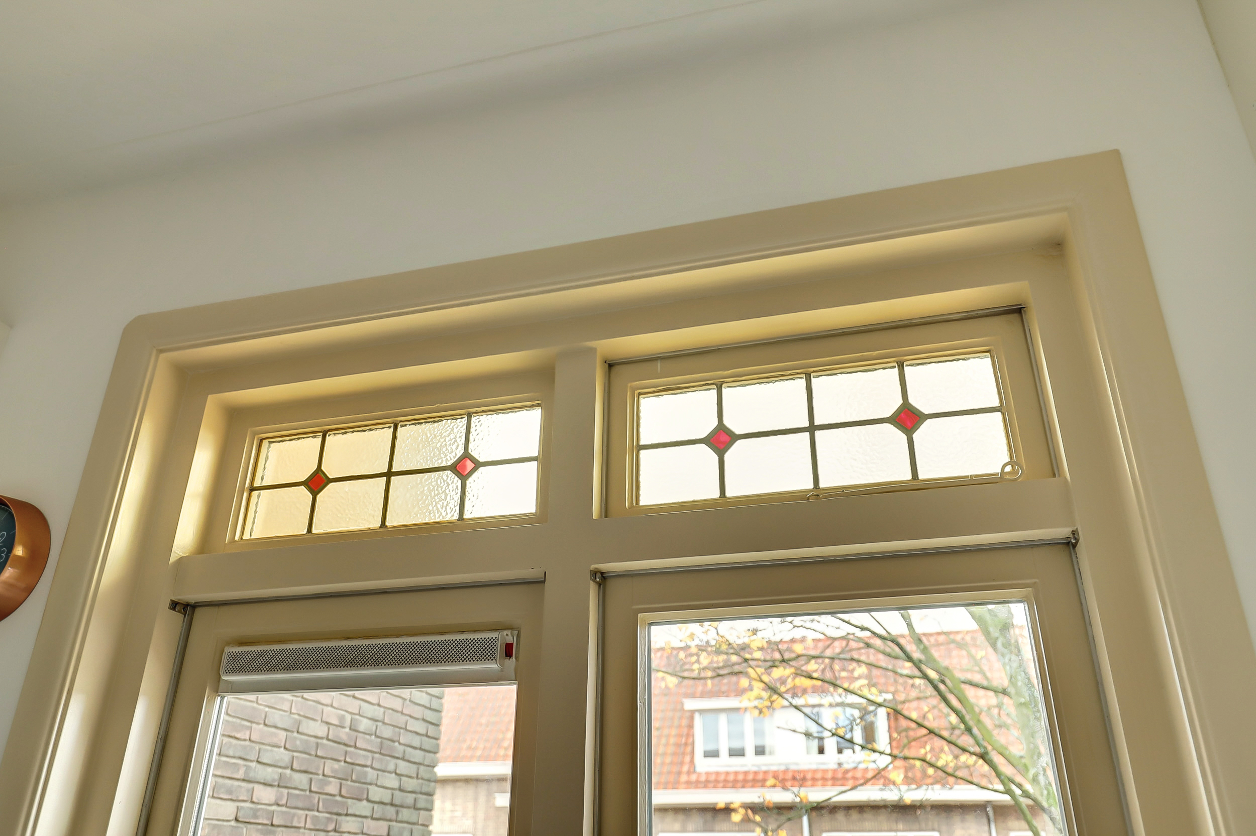 Vanuit de overloop zijn alle vertrekken op deze verdieping bereikbaar. De woon-/eetkamer is licht en ruim, met een erker die veel daglicht binnenlaat, ensuite glas-in-lood deuren, inbouwkasten en een balkon aan de achterzijde met vrij uitzicht. De openslaande deuren zorgen voor een fijne verbinding met buiten. De keuken (2009) heeft een prachtige granitovloer. Verder is de keuken voorzien van een koelvriescombinatie, een grote oven, een 5-pitsgasfornuis en een vaatwasser (2019). Vanuit de keuken heb je een leuk uitzicht op de straat. Op deze verdieping bevindt zich verder een toiletruimte en er zijn diverse karakteristieke details aanwezig, zoals glas-in-loodramen met voorzetramen en twee mooie betegelde schouwen, die het geheel extra sfeer geven.